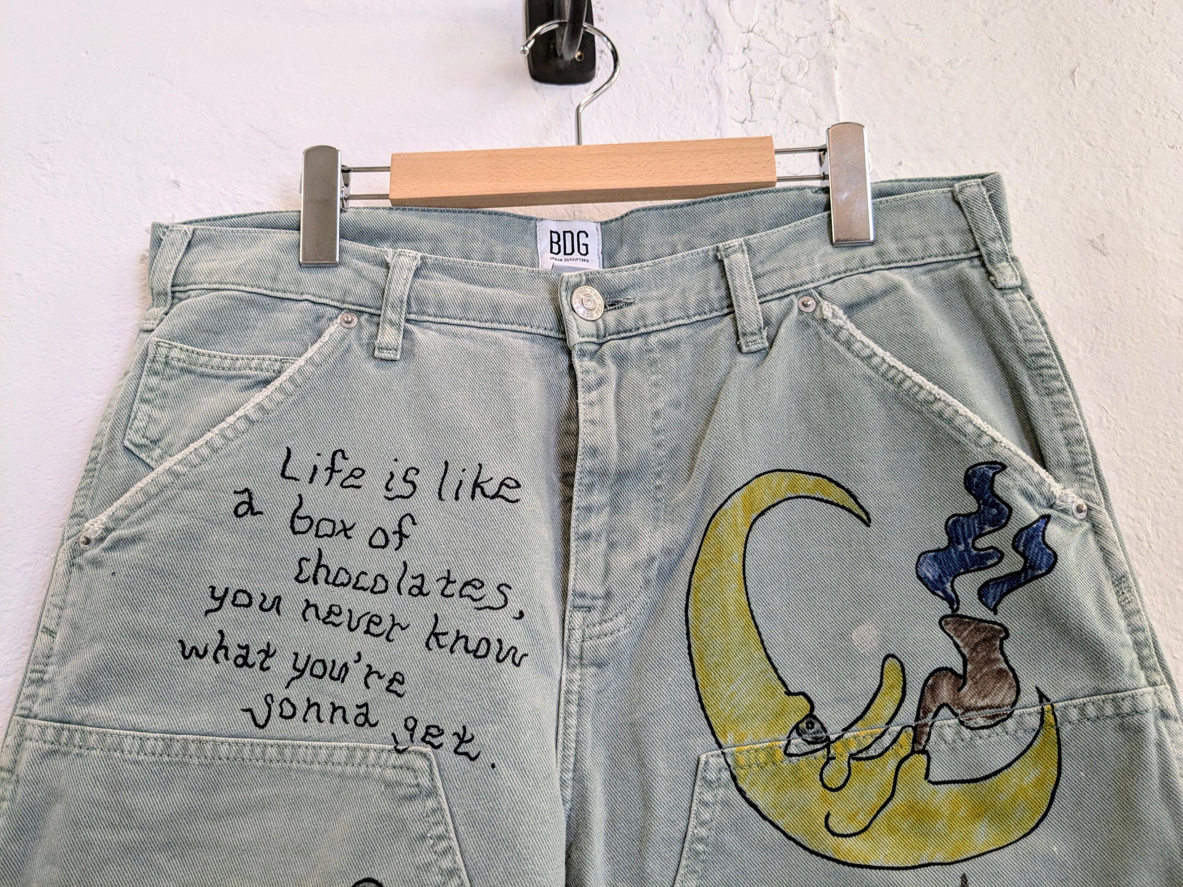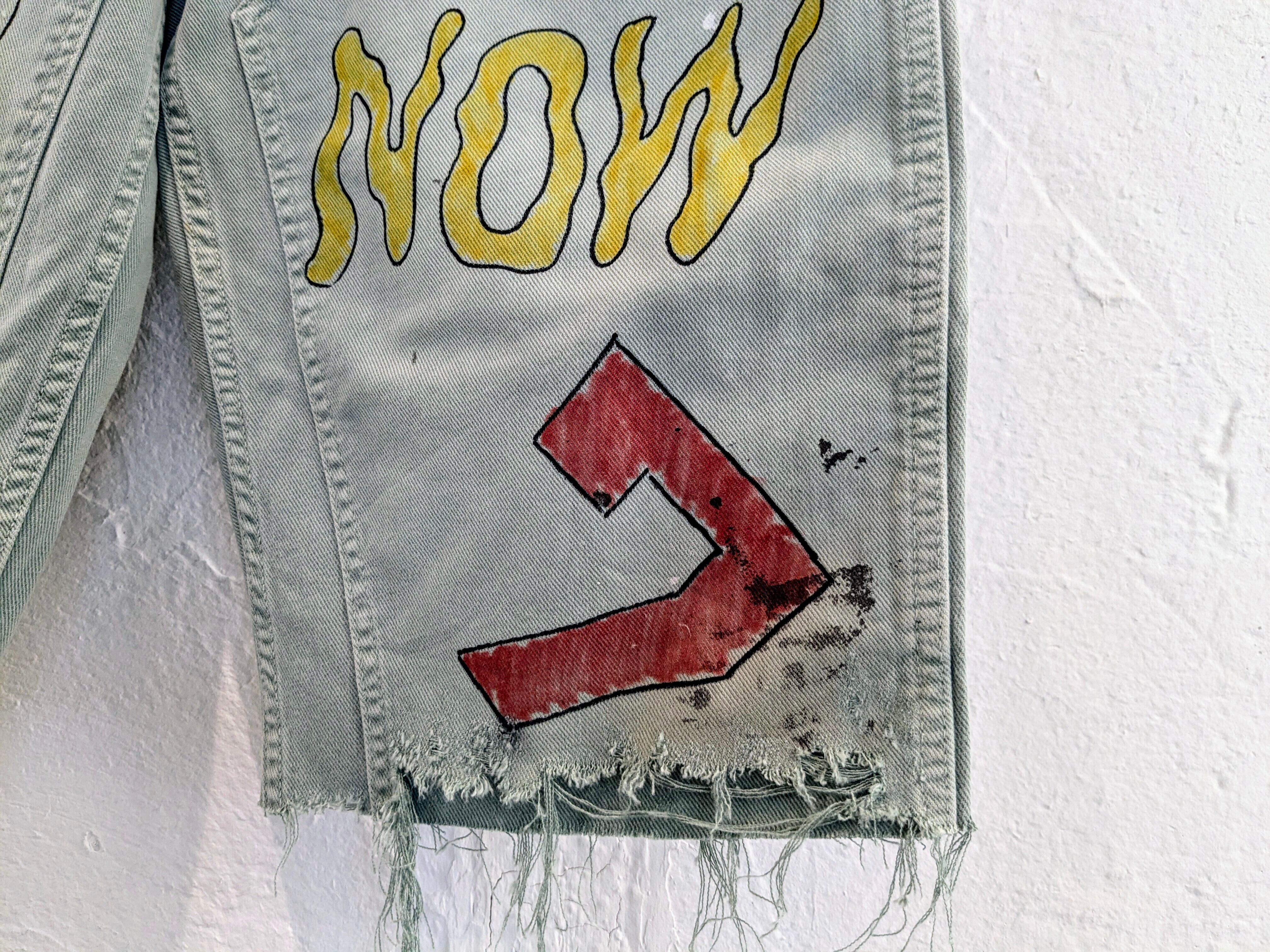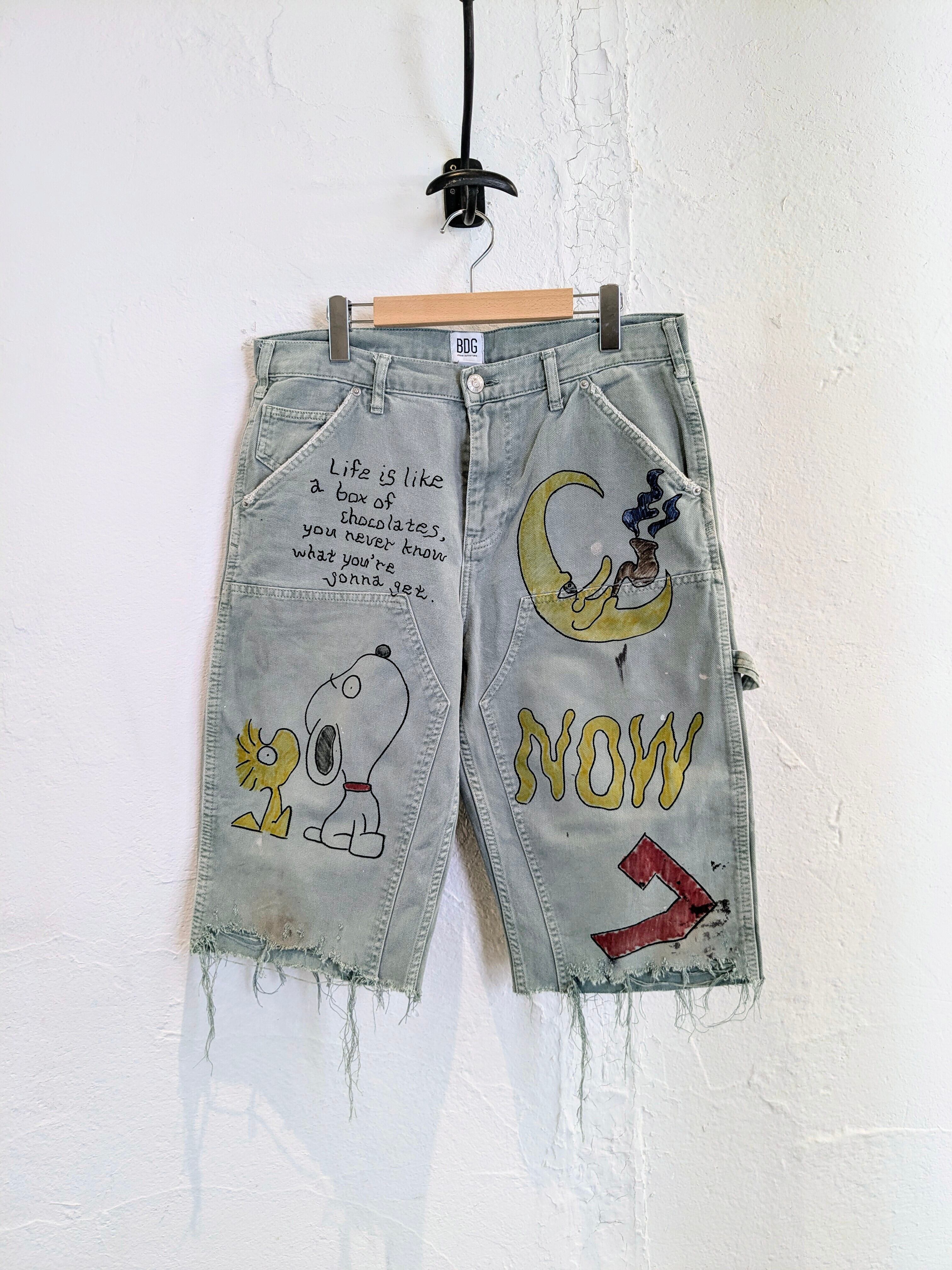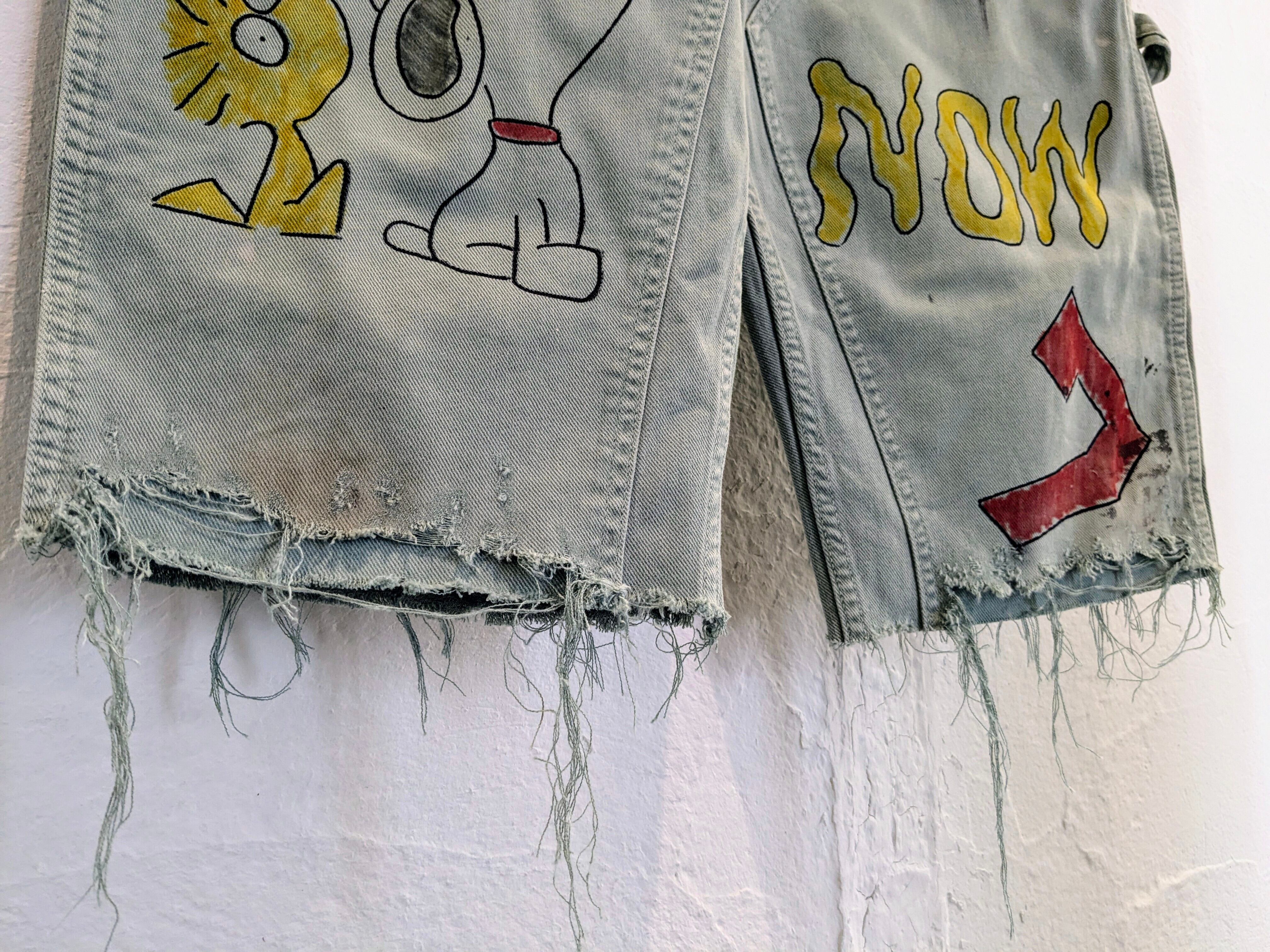 ダブルニーのショートパンツにイラストを加えております。メモリアルの要素を含み、またどこか見たことあるようなキャラクターがいたりととても可愛いアイテム。同じモノは2つと存在しない唯一無二のアイテム。元々の汚れ、ダメージあり。裾はカットオフされています。