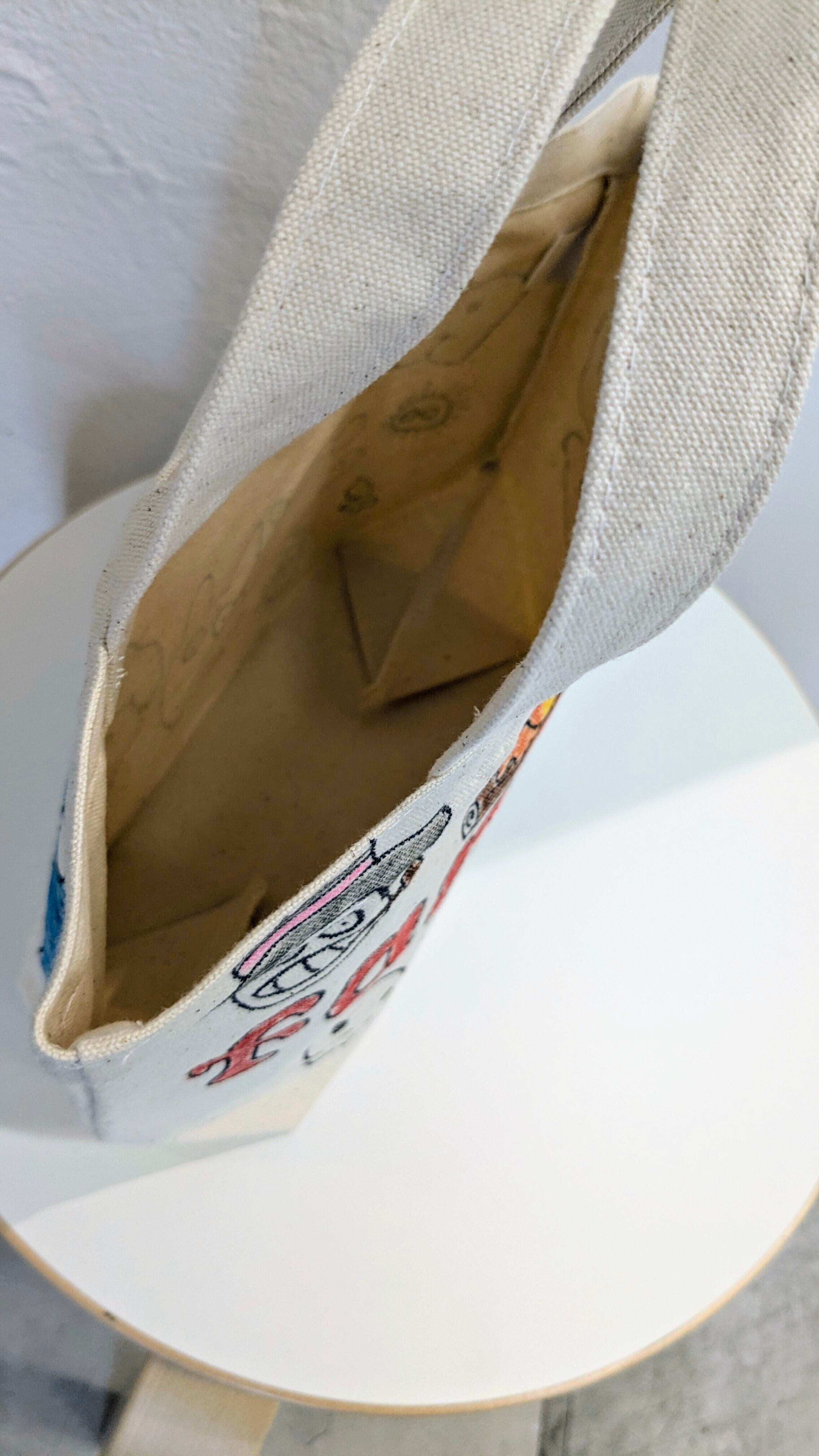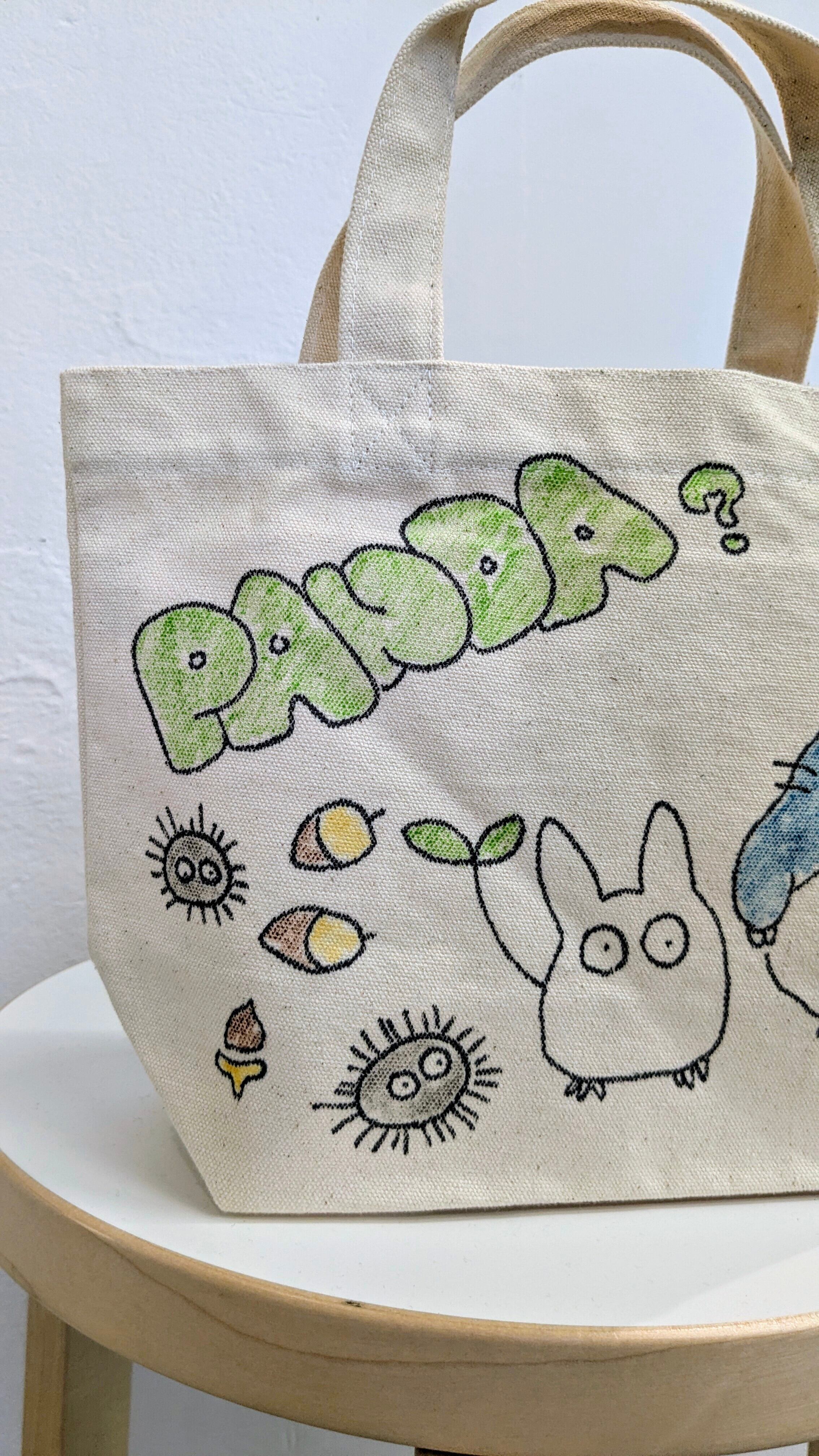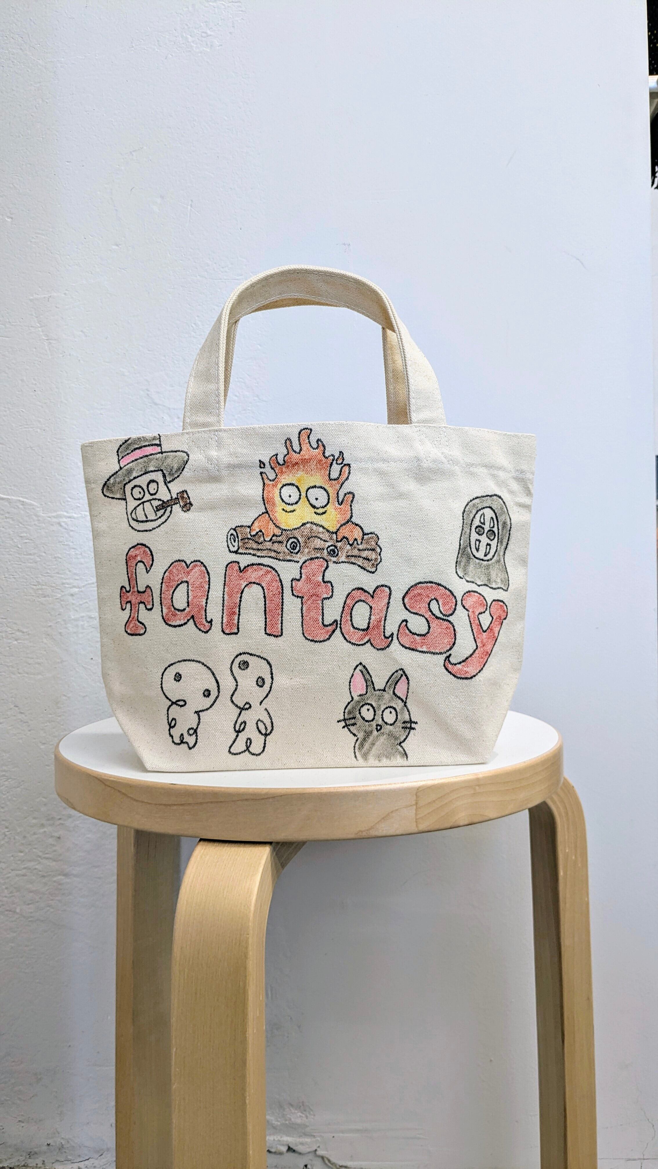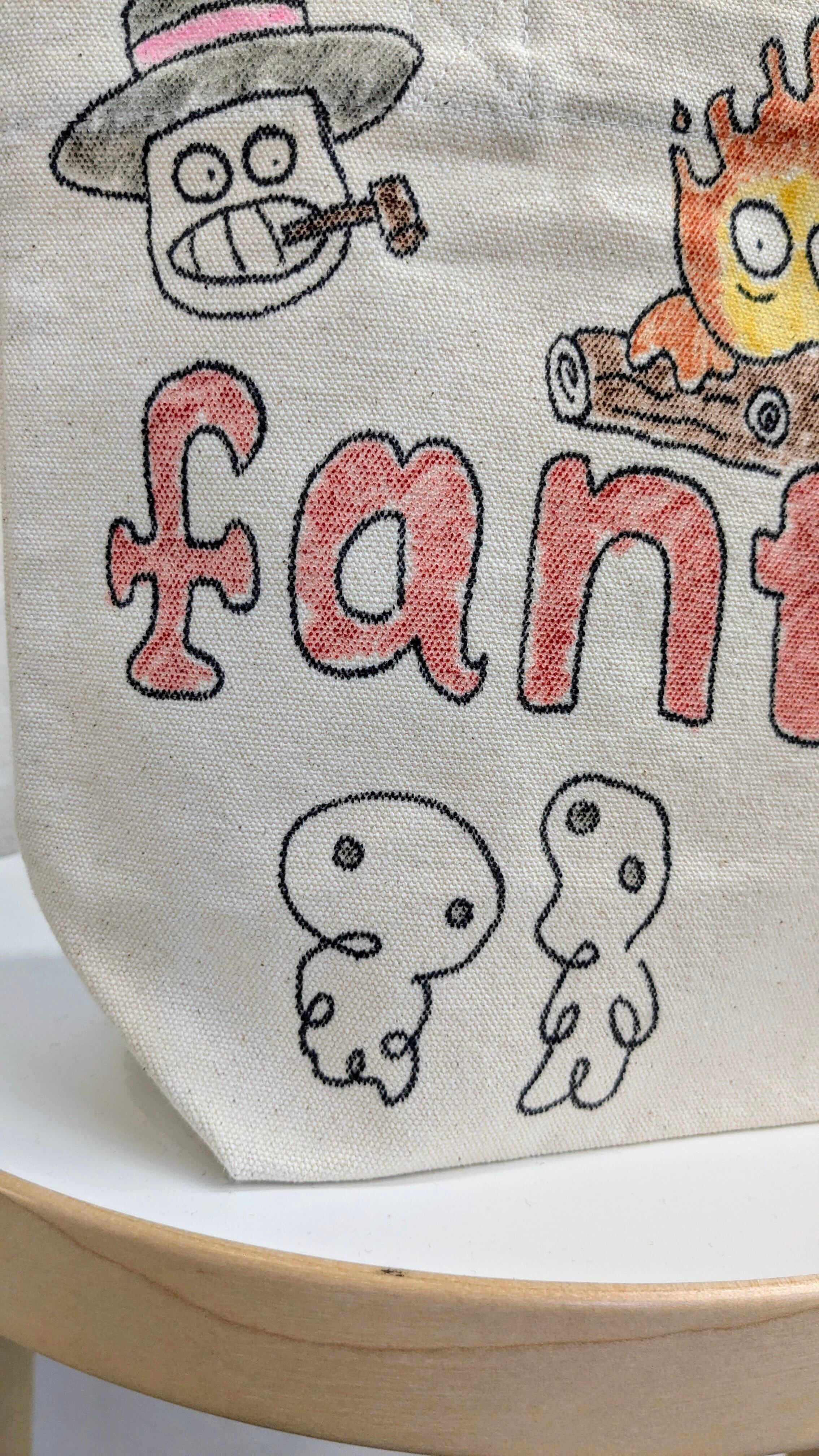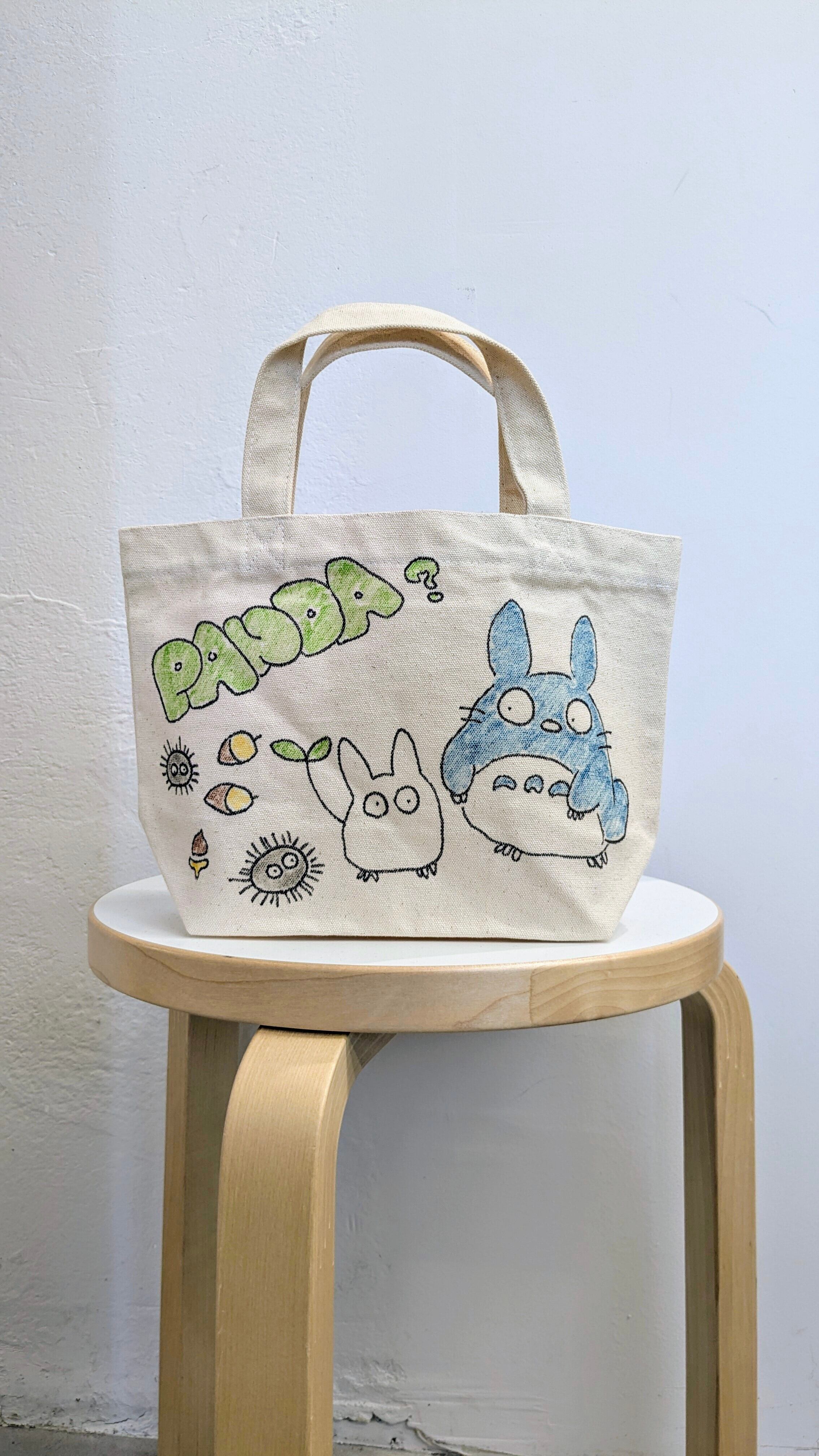 キャンバスのトートバッグにイラストを加えています。メモリアルの要素があり、どこか見たことあるキャラクターがいたりと、とにかく可愛いアイテム。全て手作業になるので、唯一無二の一点物となります。