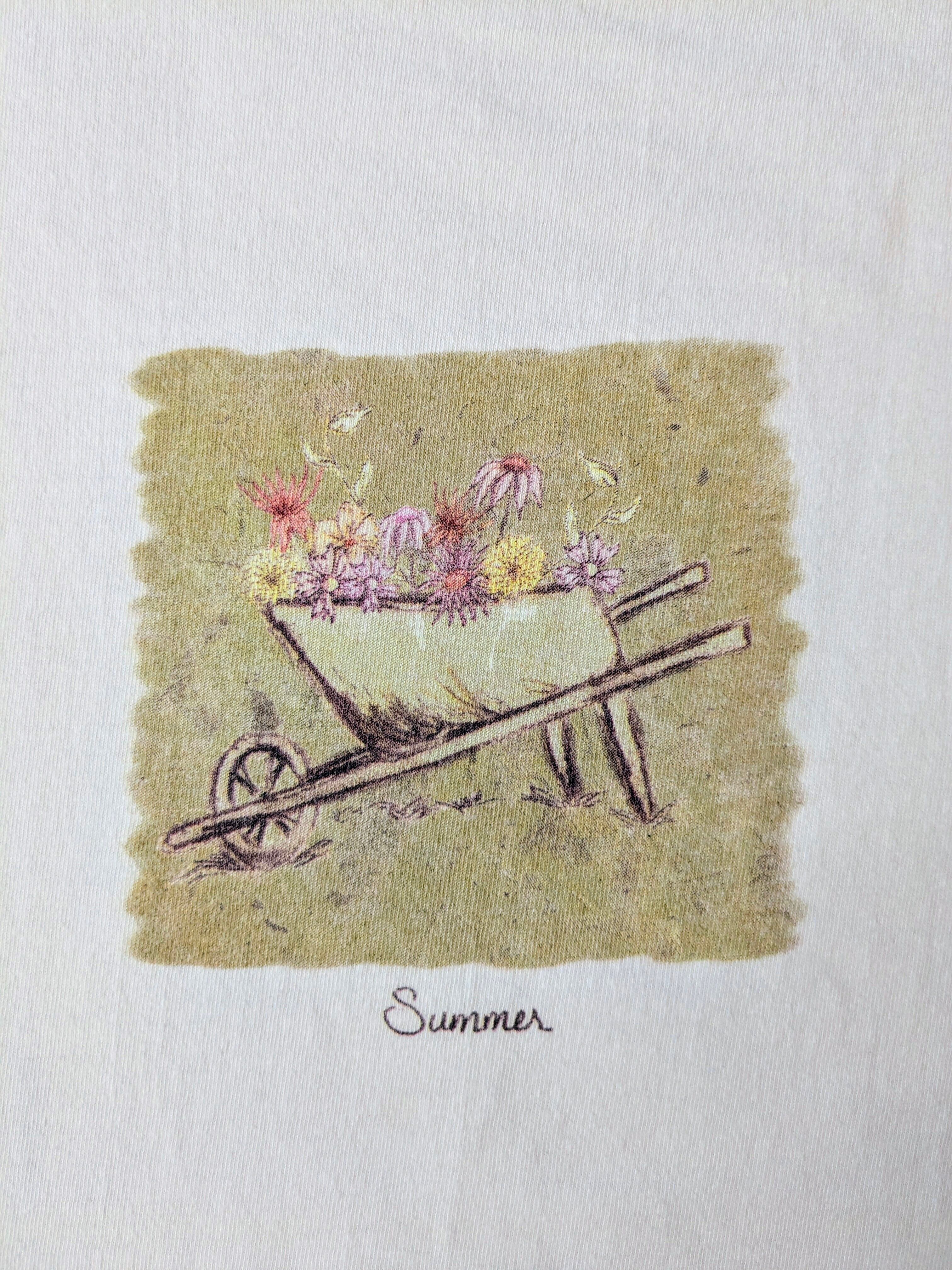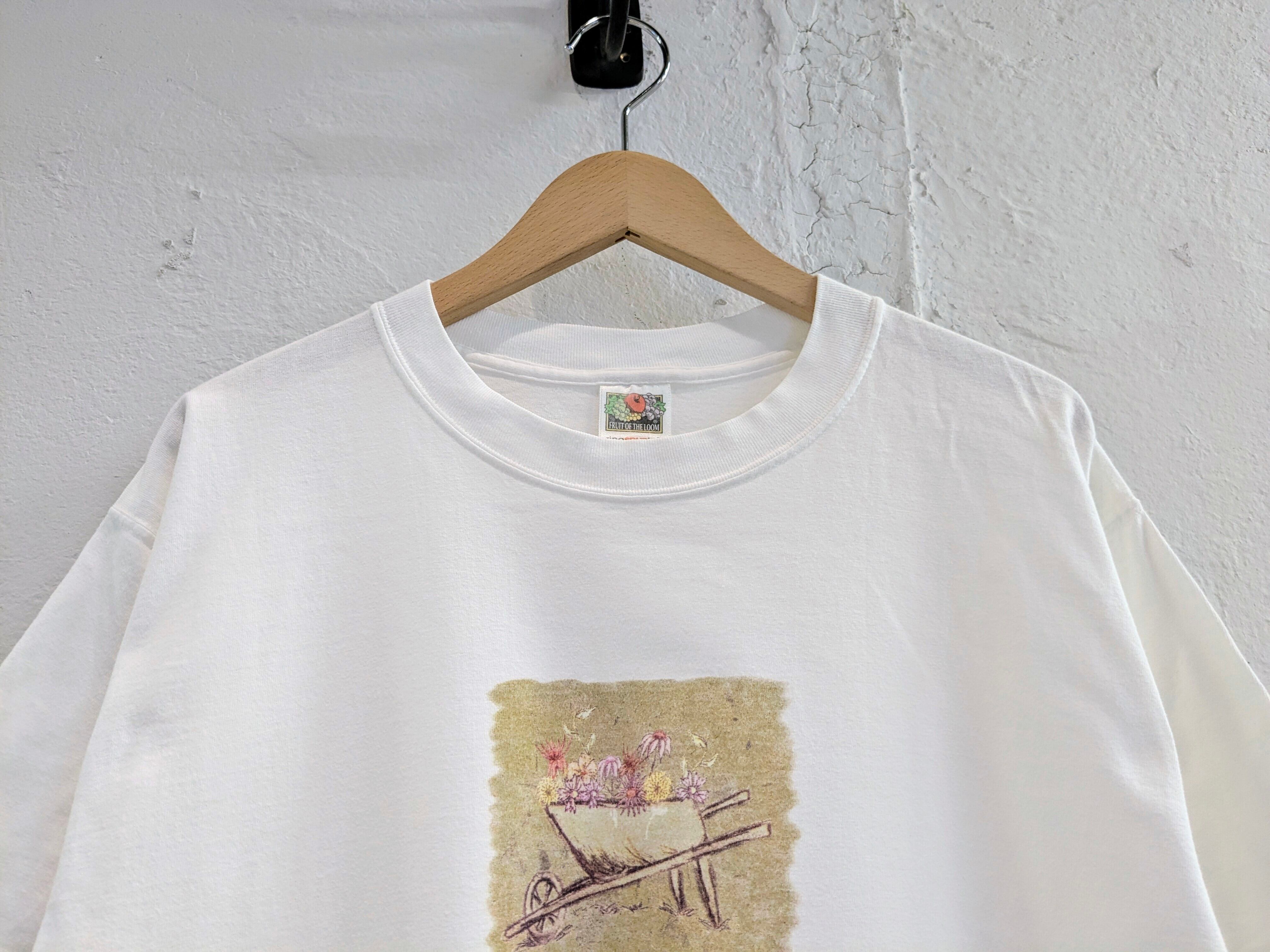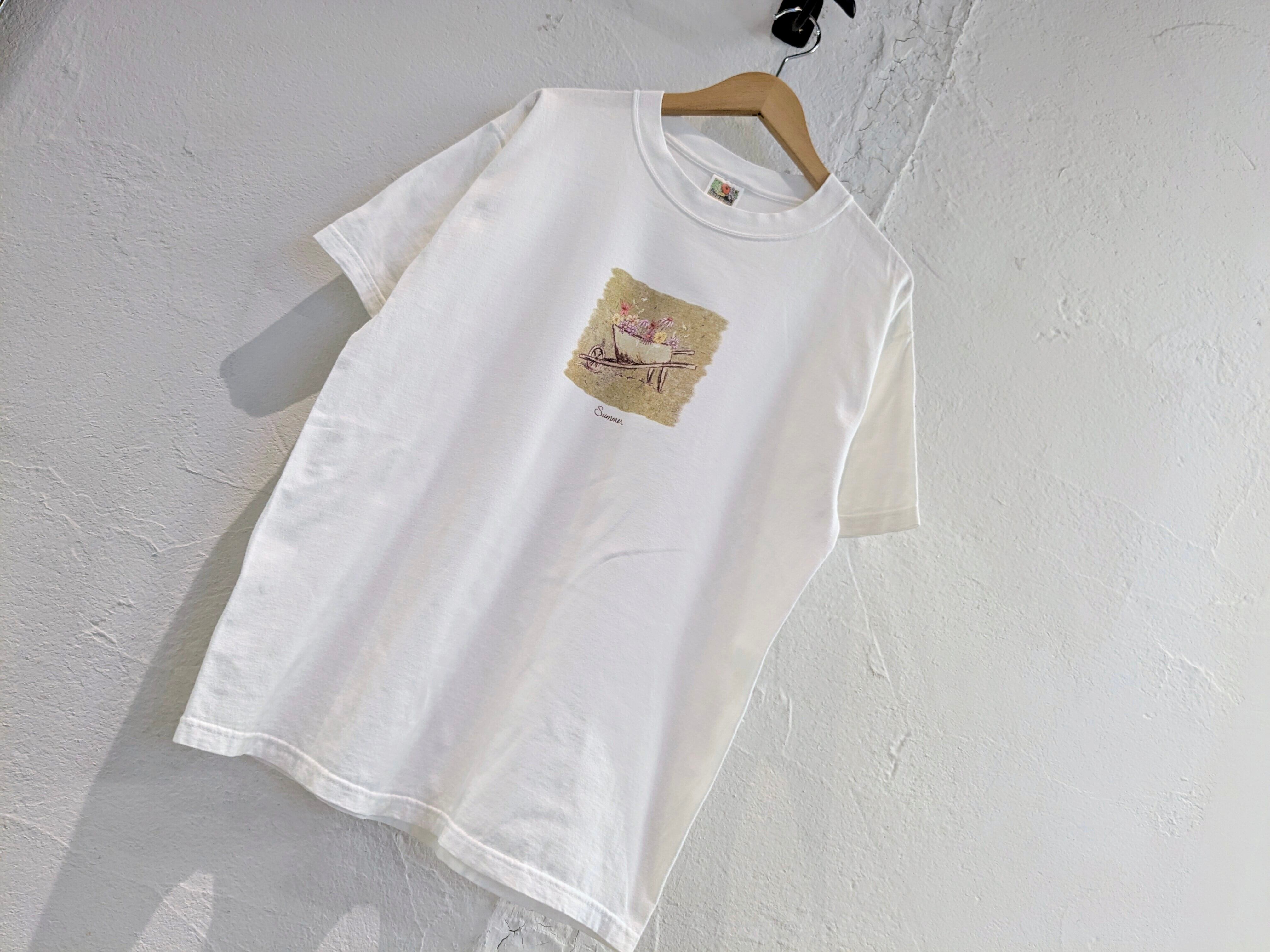 その中に色々な花がプリントされており、色の使い方なども綺麗で、上品なデザインのTシャツ。絵画のような見え方で、アートTシャツ、作品にも見えるそんなアイテム。