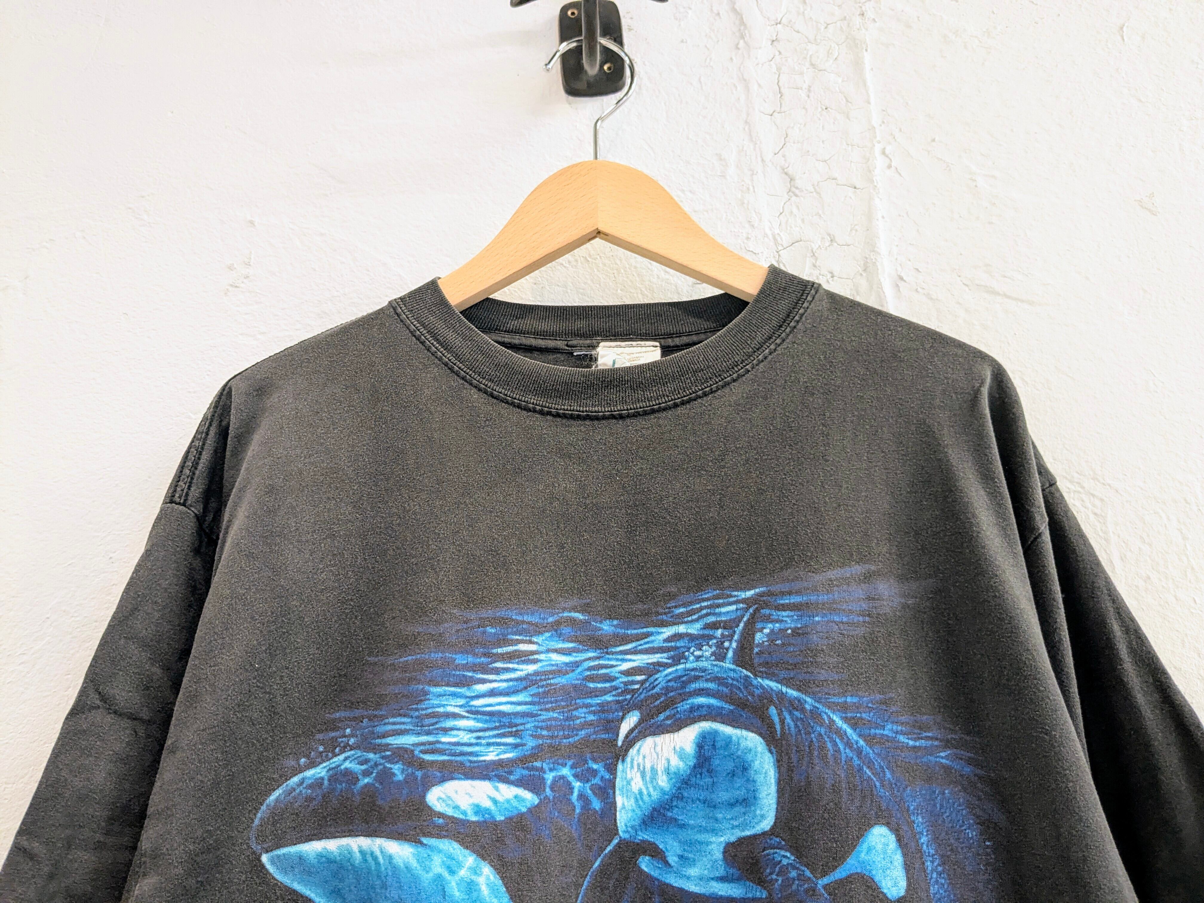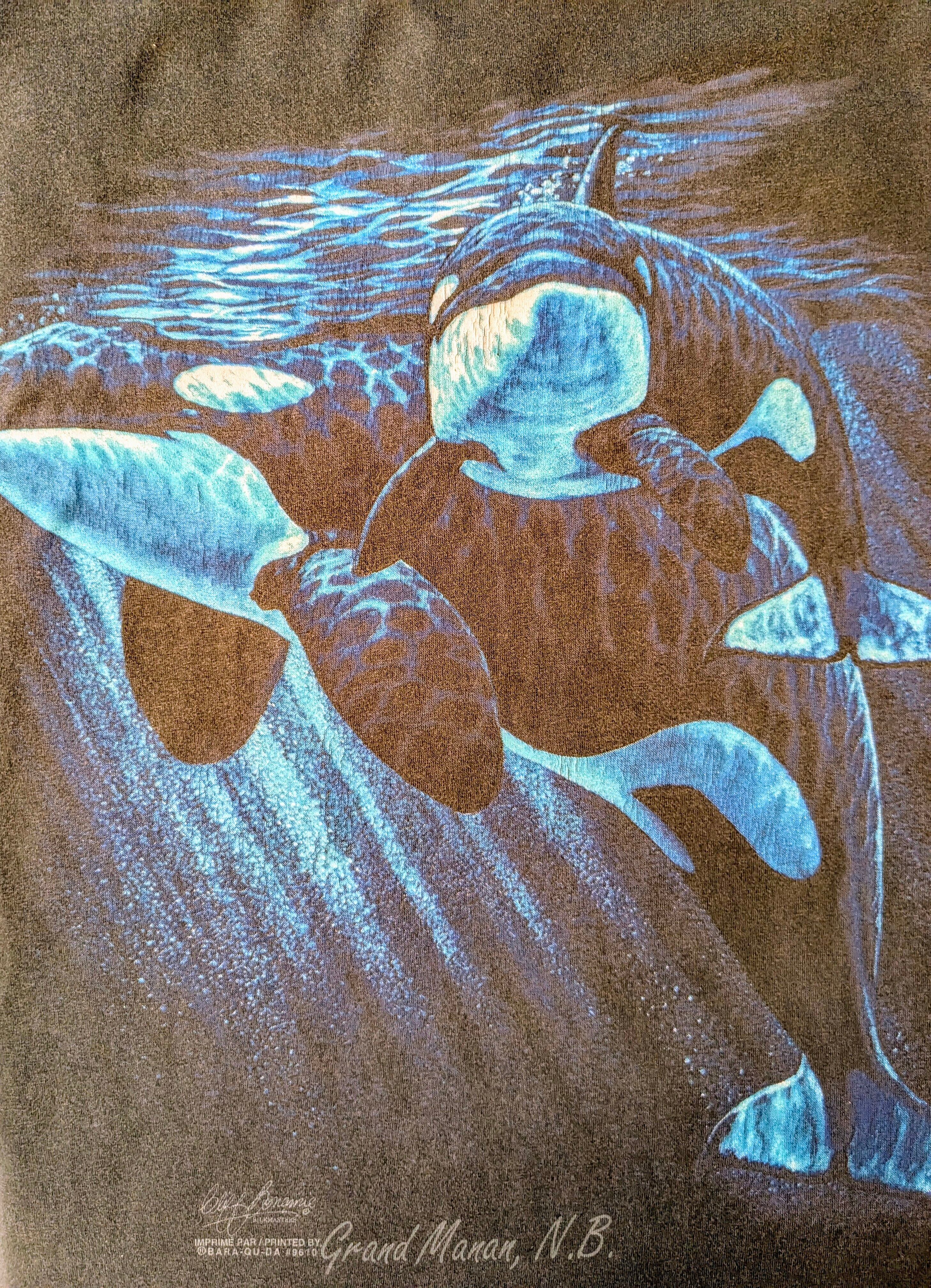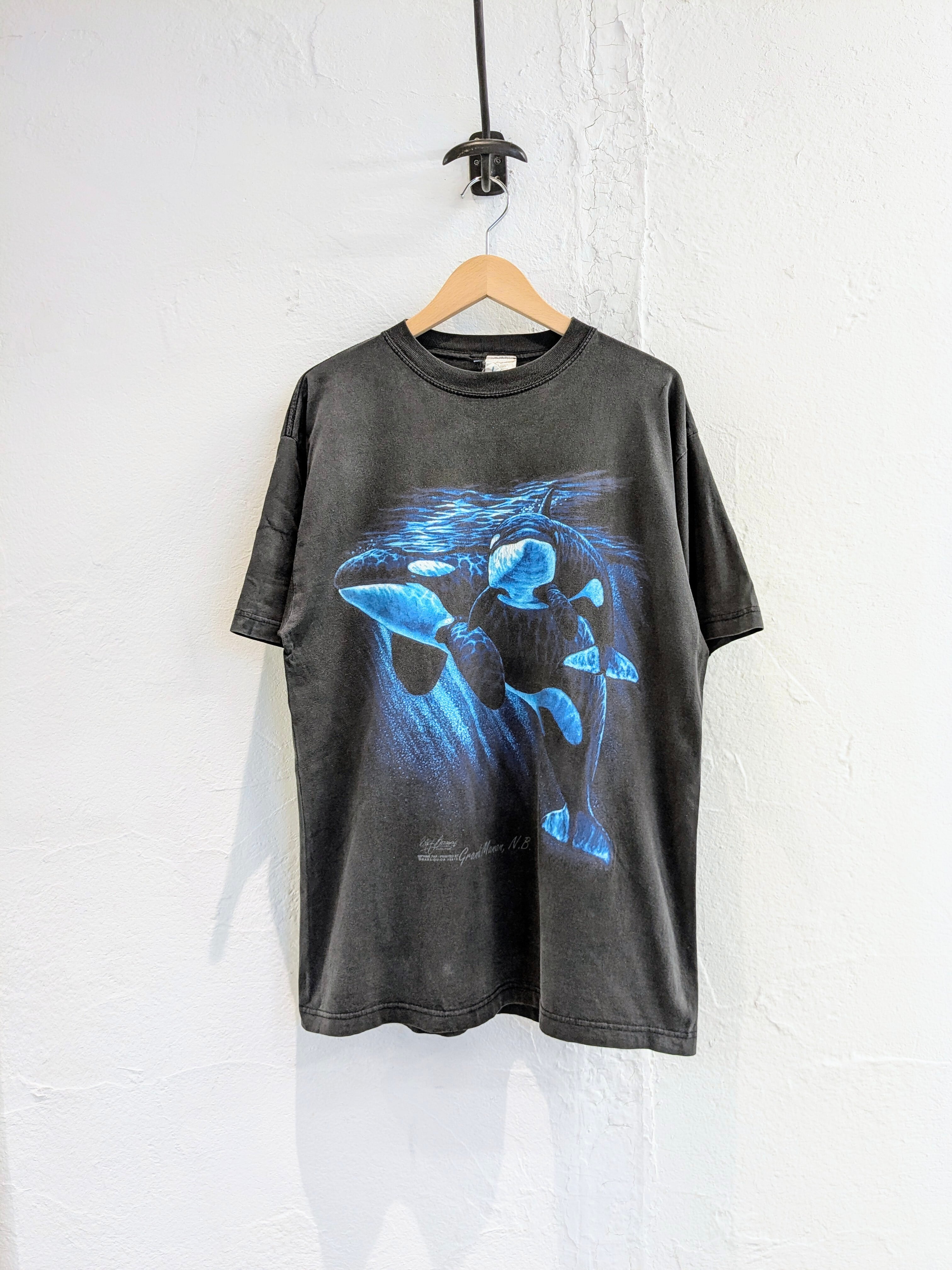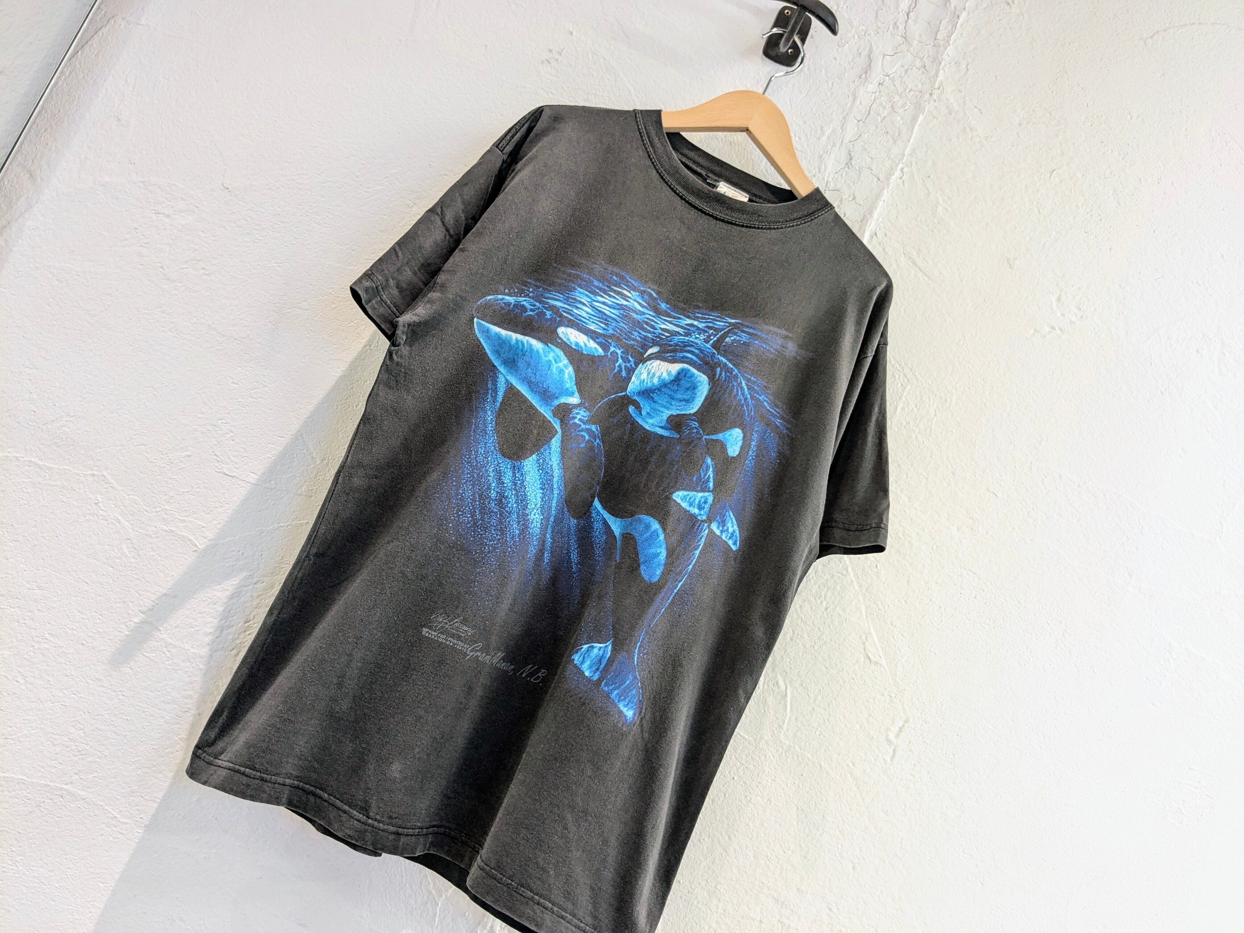 イルカ?シャチ?のプリントがとても綺麗な一着。Tシャツの全体的なフェード感も雰囲気がよく、カッコいいアイテム。キズあり。