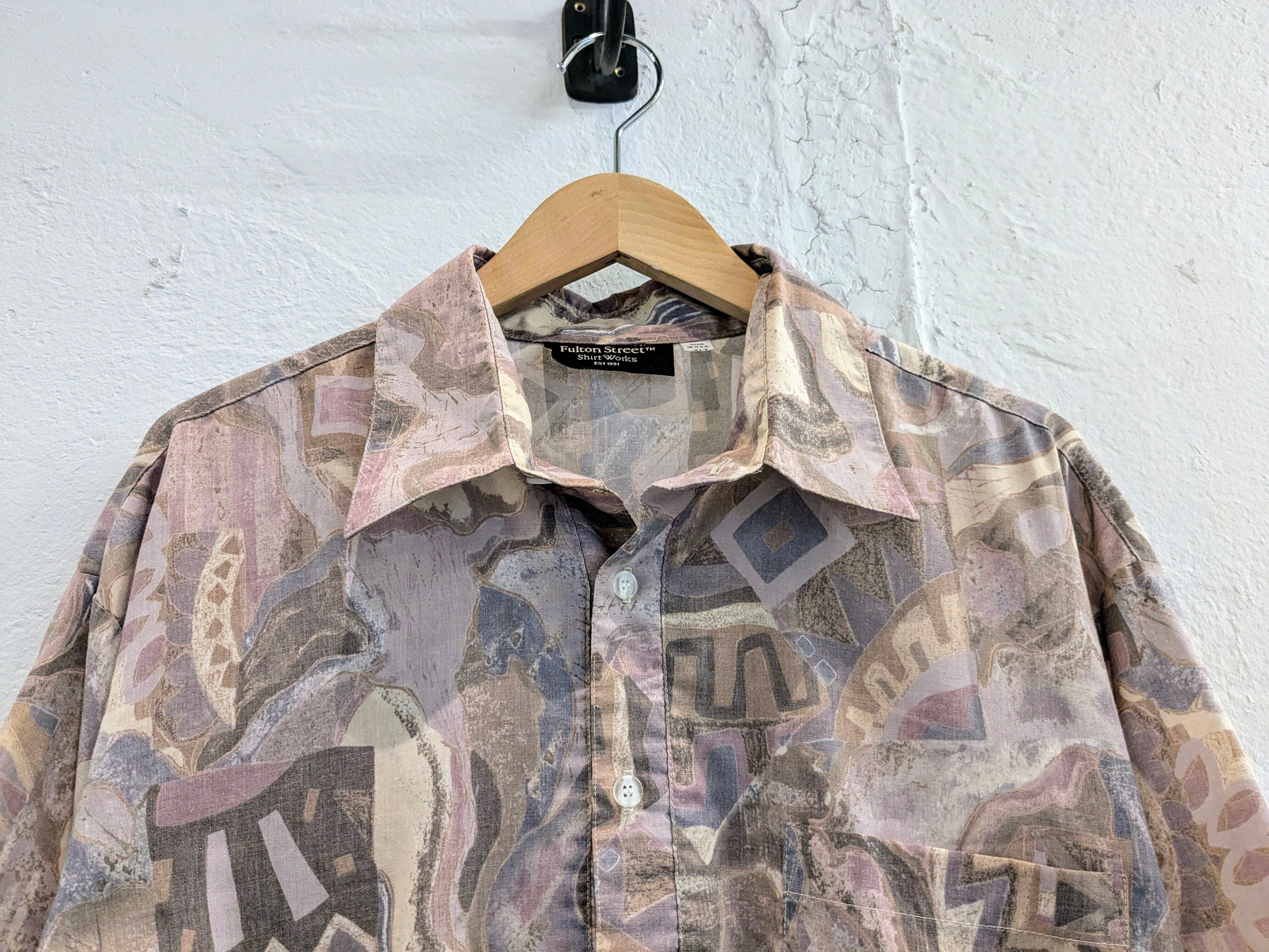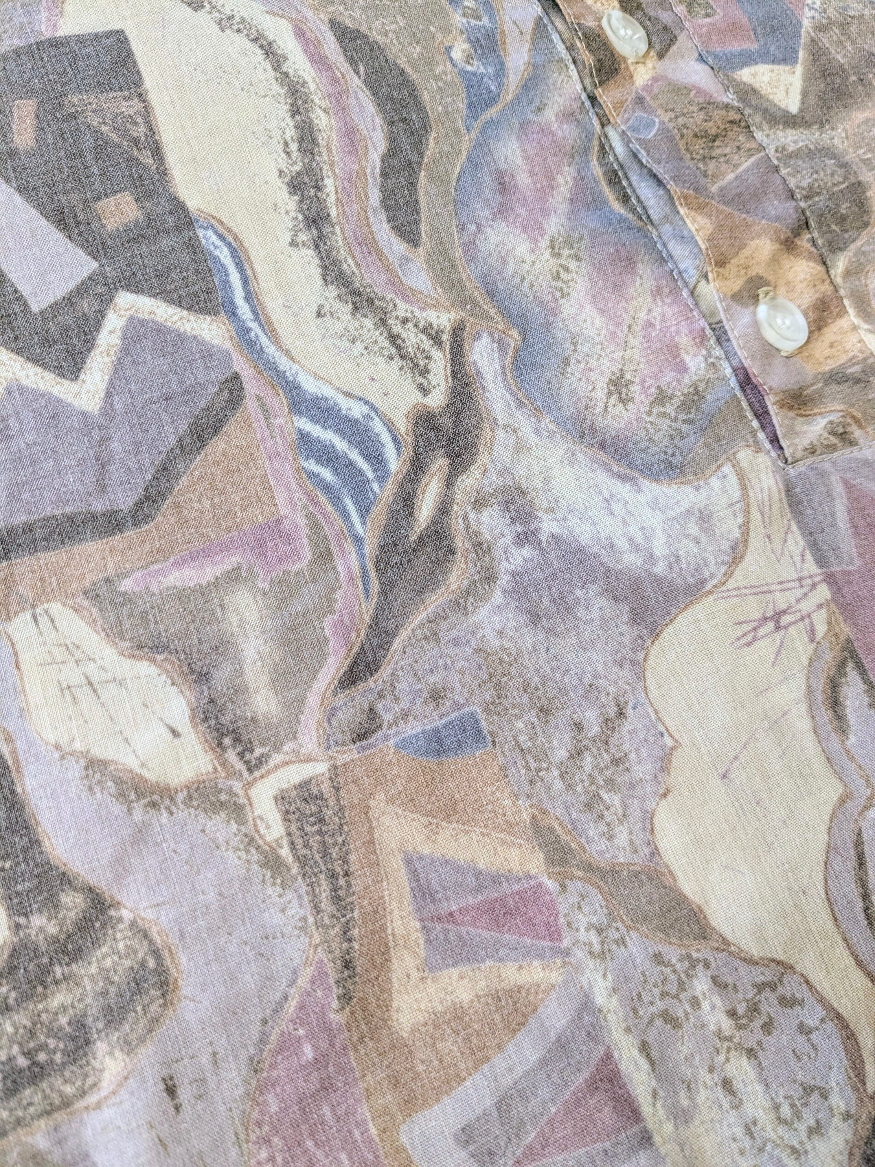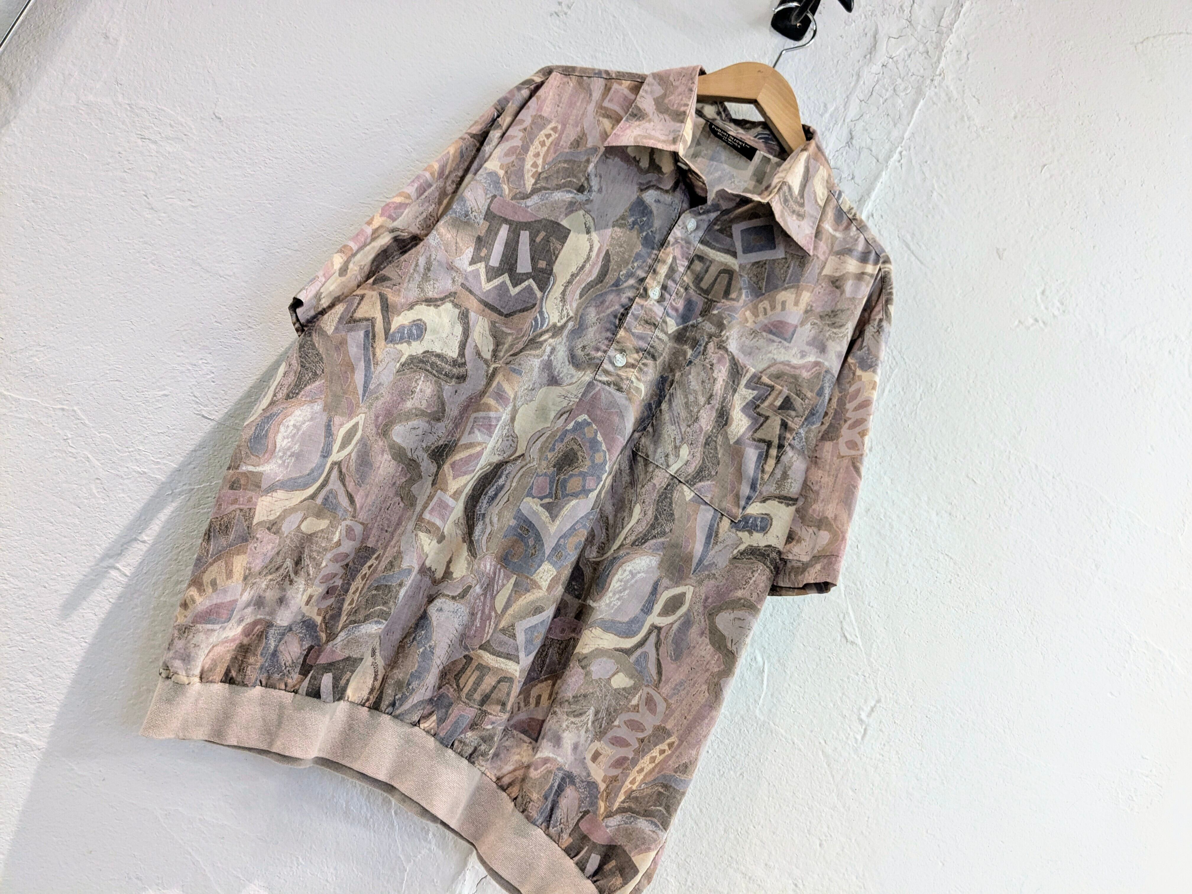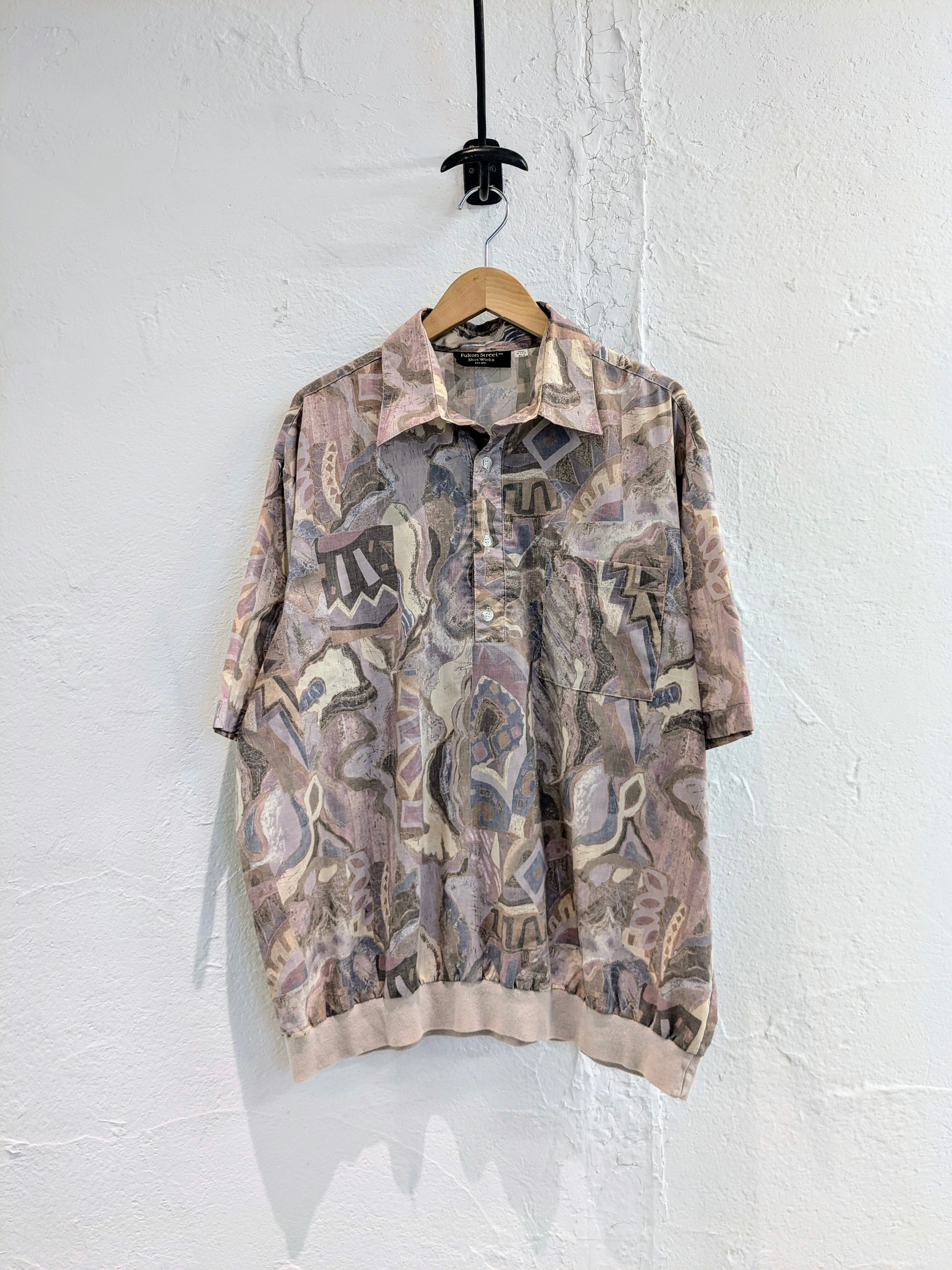 アーティスティックな柄、配色のデザインシャツ。薄手のシャツ生地となり、とても涼しく着ていただけます。プルオーバー、ポロシャツのデザインとなっているのが珍しいかと。裾がリブになっているので、丈の長さが調整も可能。