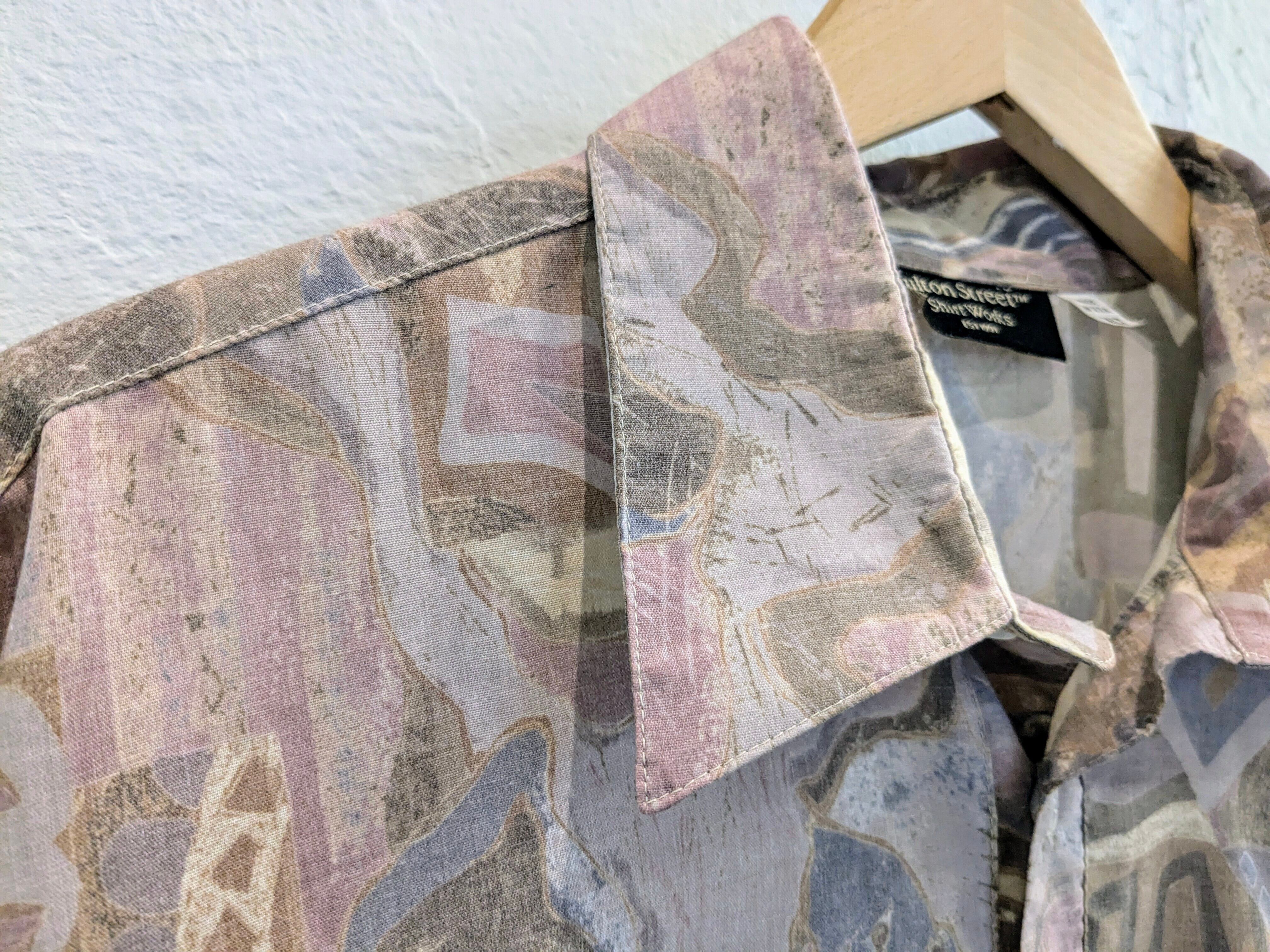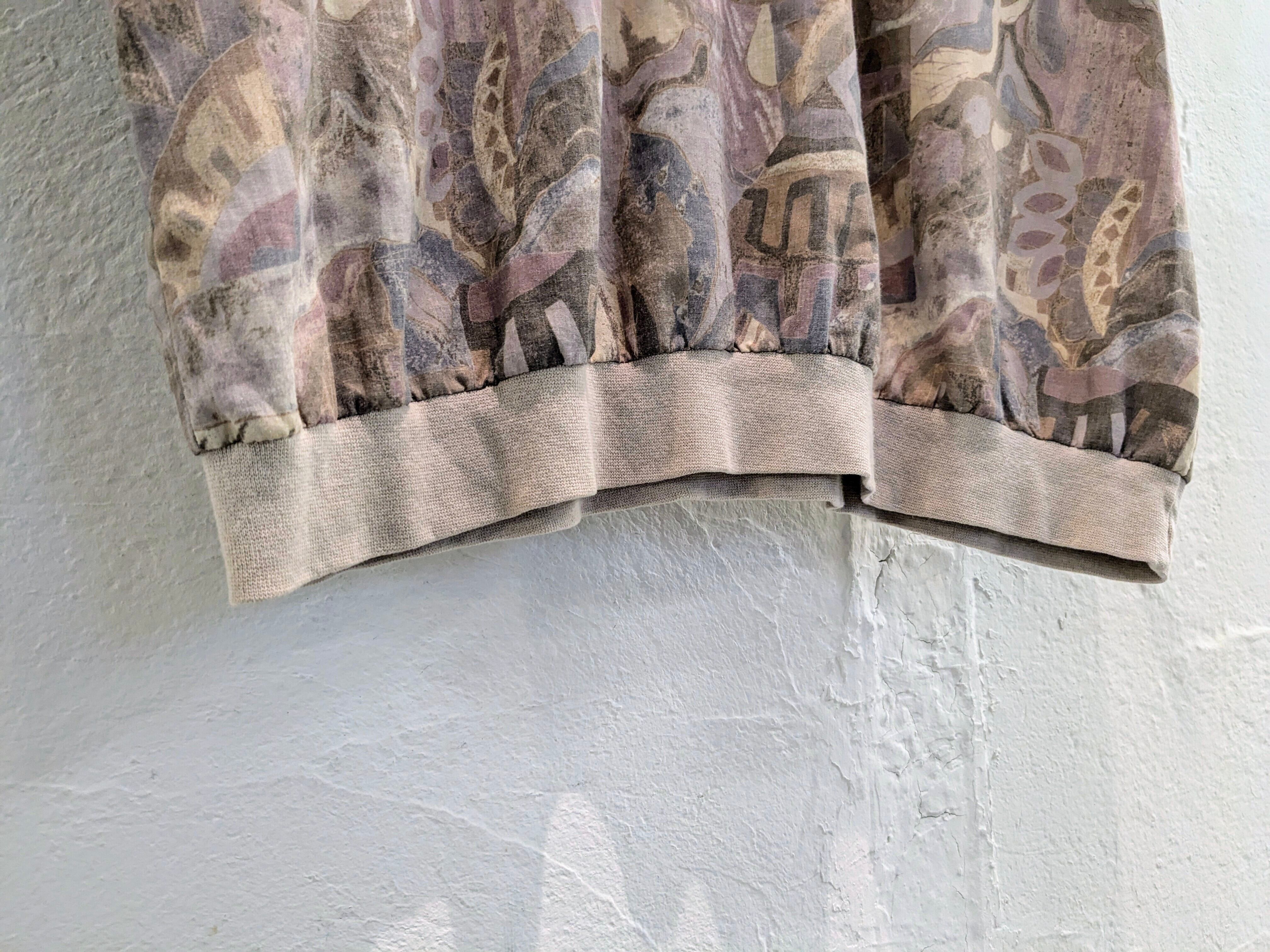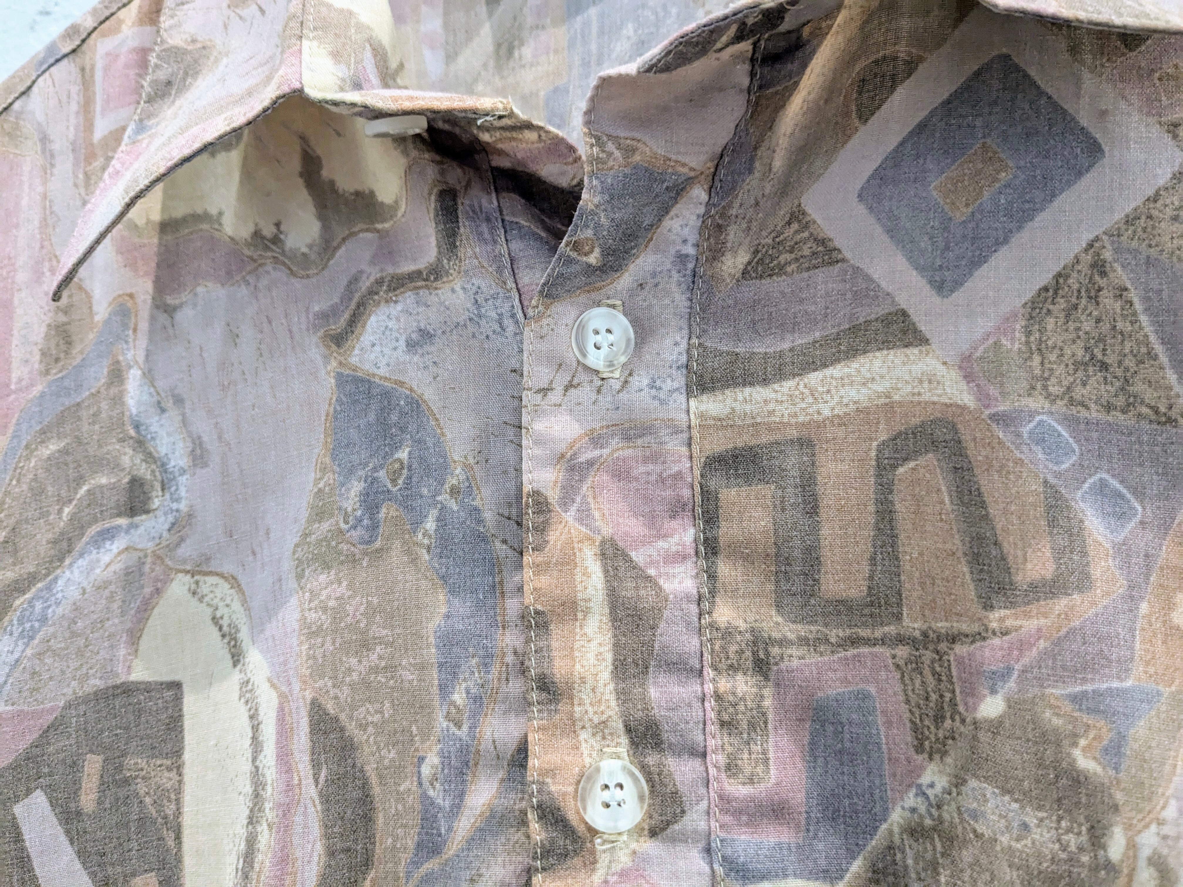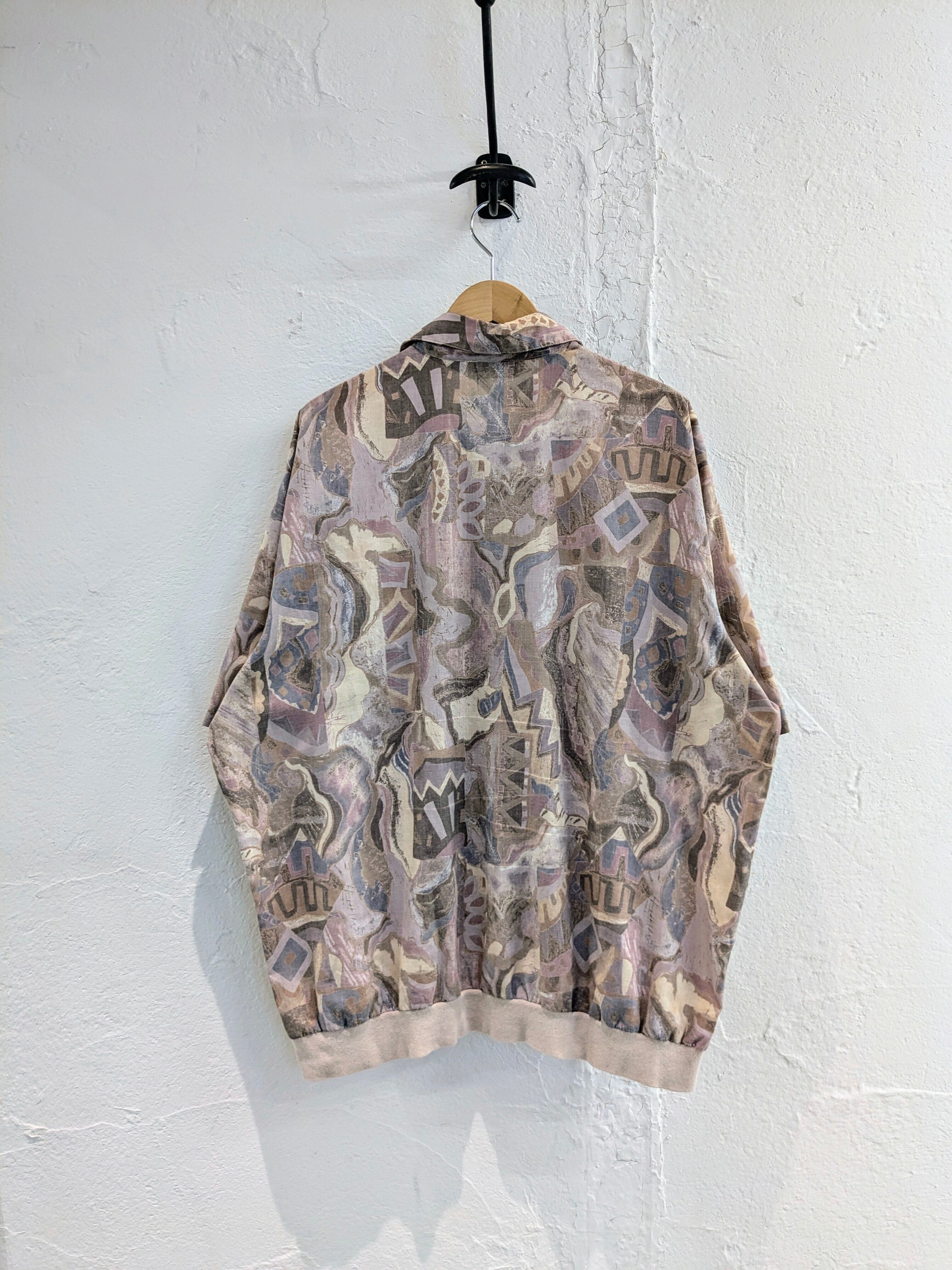 アーティスティックな柄、配色のデザインシャツ。薄手のシャツ生地となり、とても涼しく着ていただけます。プルオーバー、ポロシャツのデザインとなっているのが珍しいかと。裾がリブになっているので、丈の長さが調整も可能。