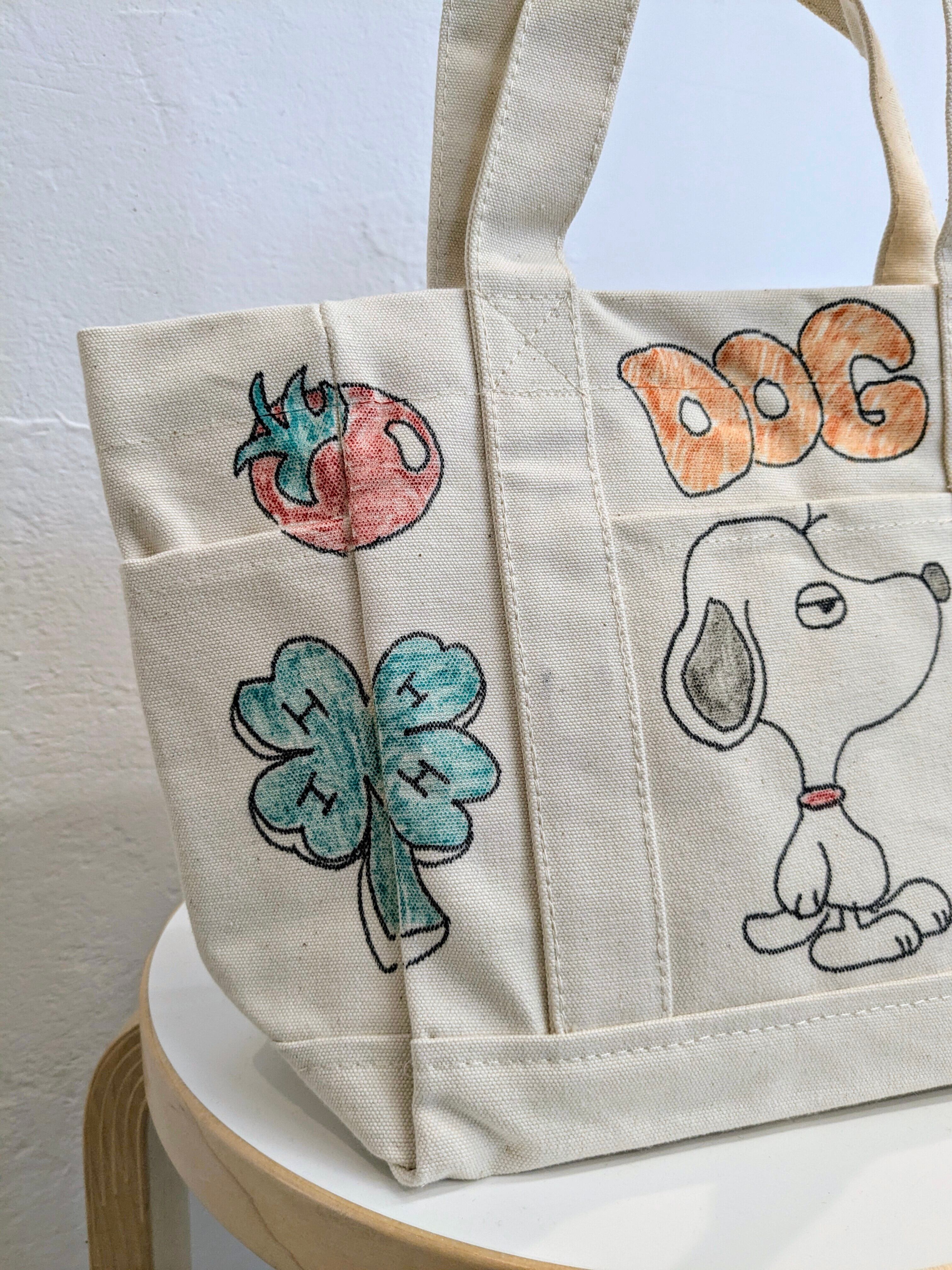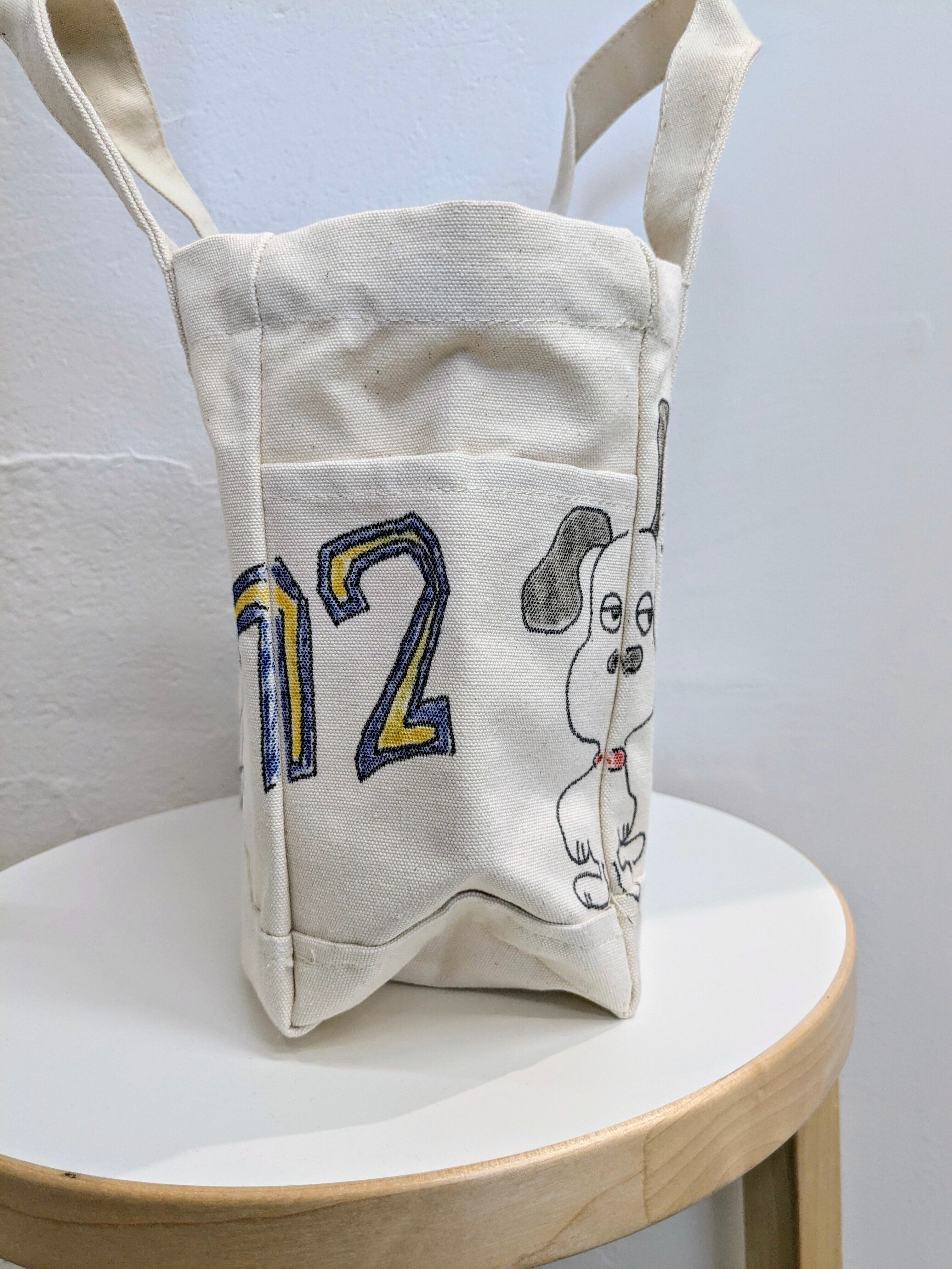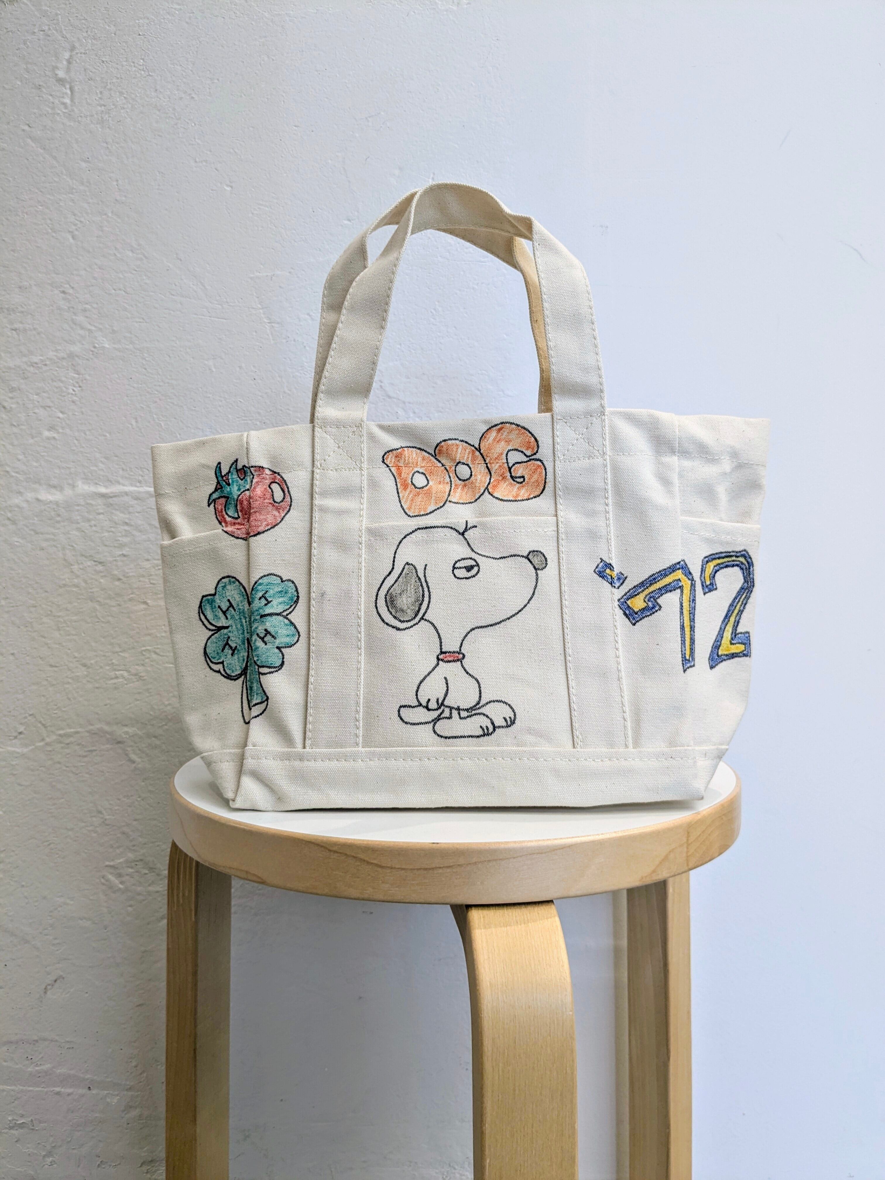 キャンバスのトートバッグにイラストを加えています。メモリアルの要素があり、どこか見たことあるキャラクターがいたりと、とにかく可愛いアイテム。スナップボタンが付いており、しっかり閉まるようになっています。左右、外にも一つポケットがあり収納も豊富。全て手作業になるので、唯一無二の一点物となります。