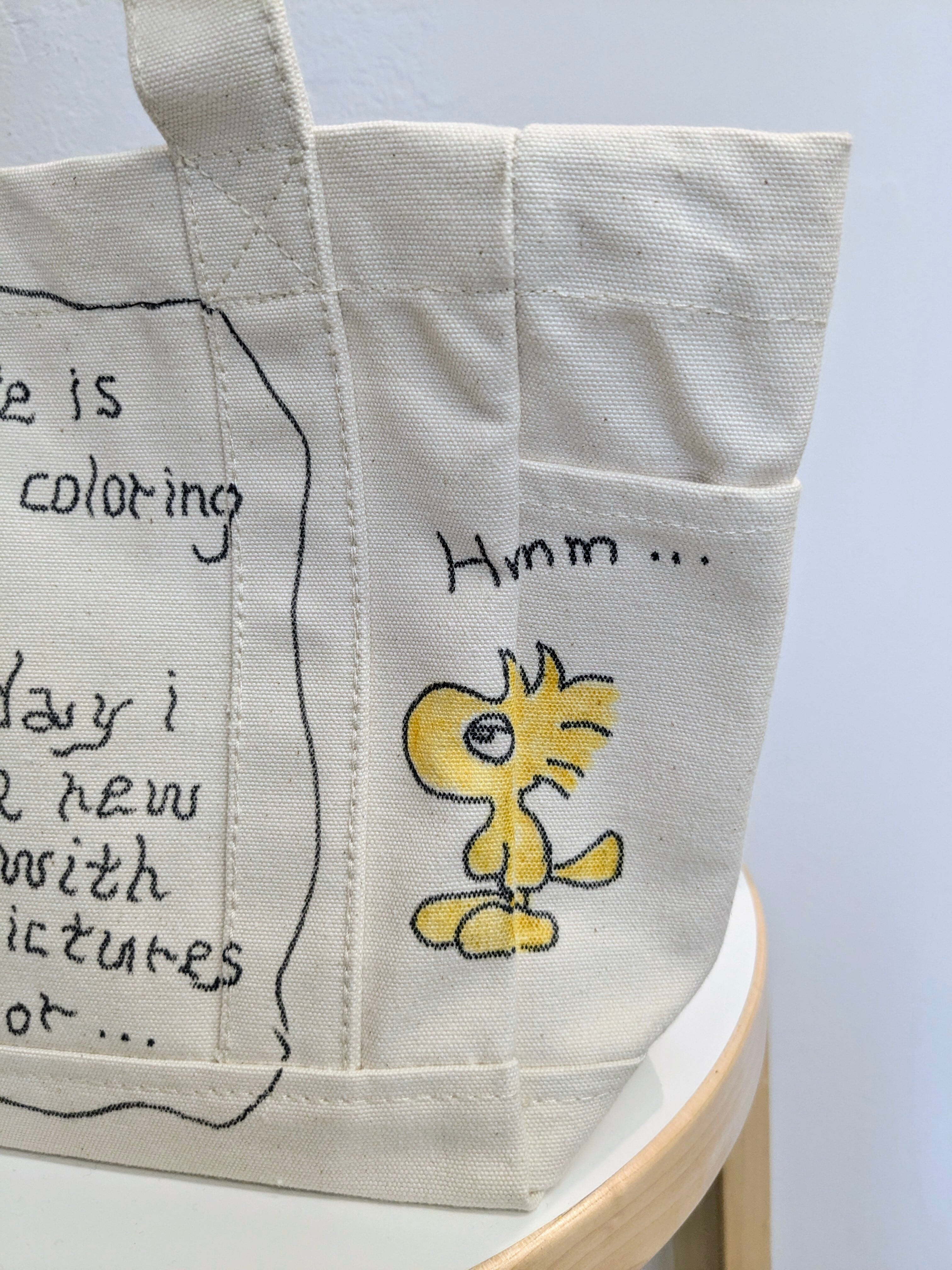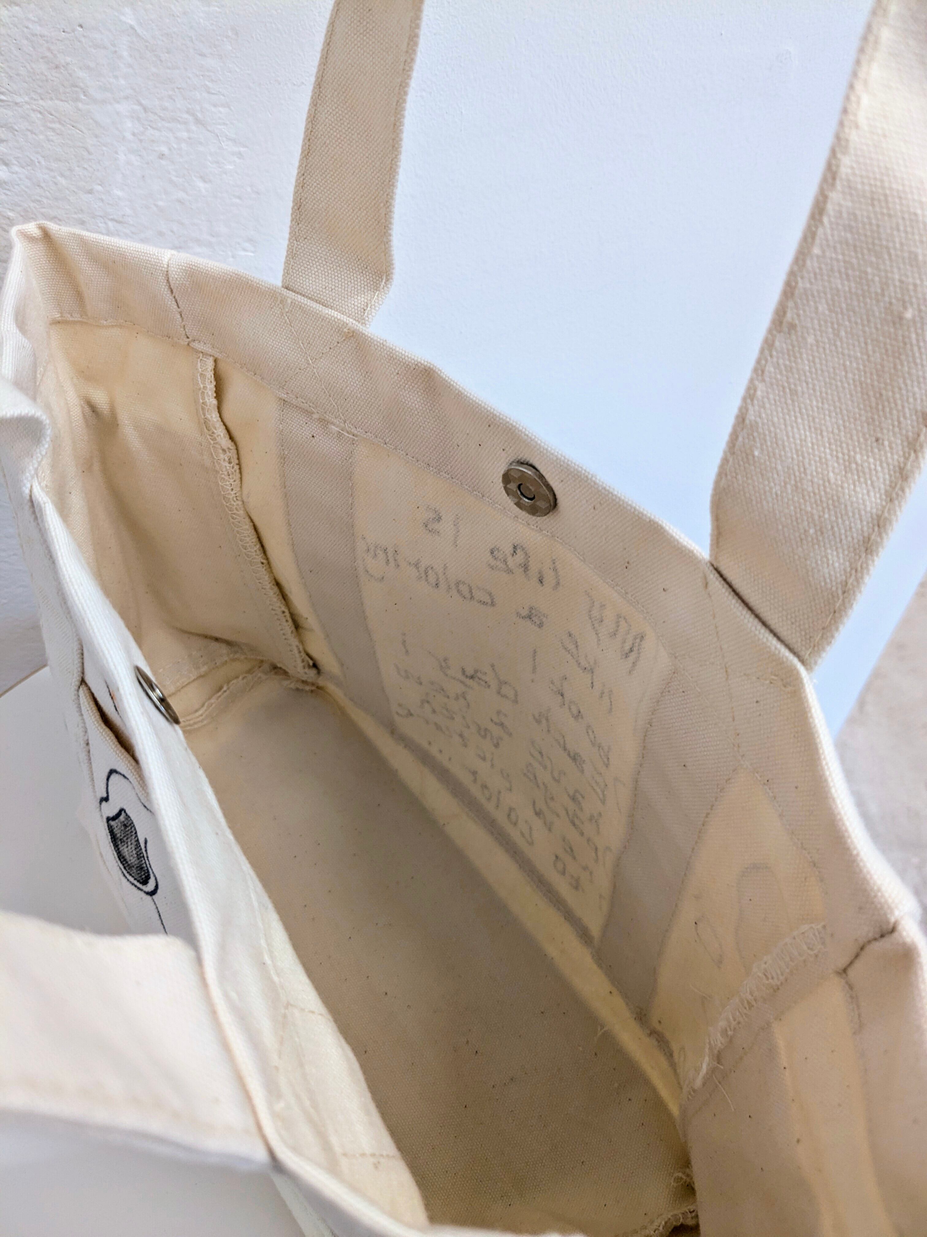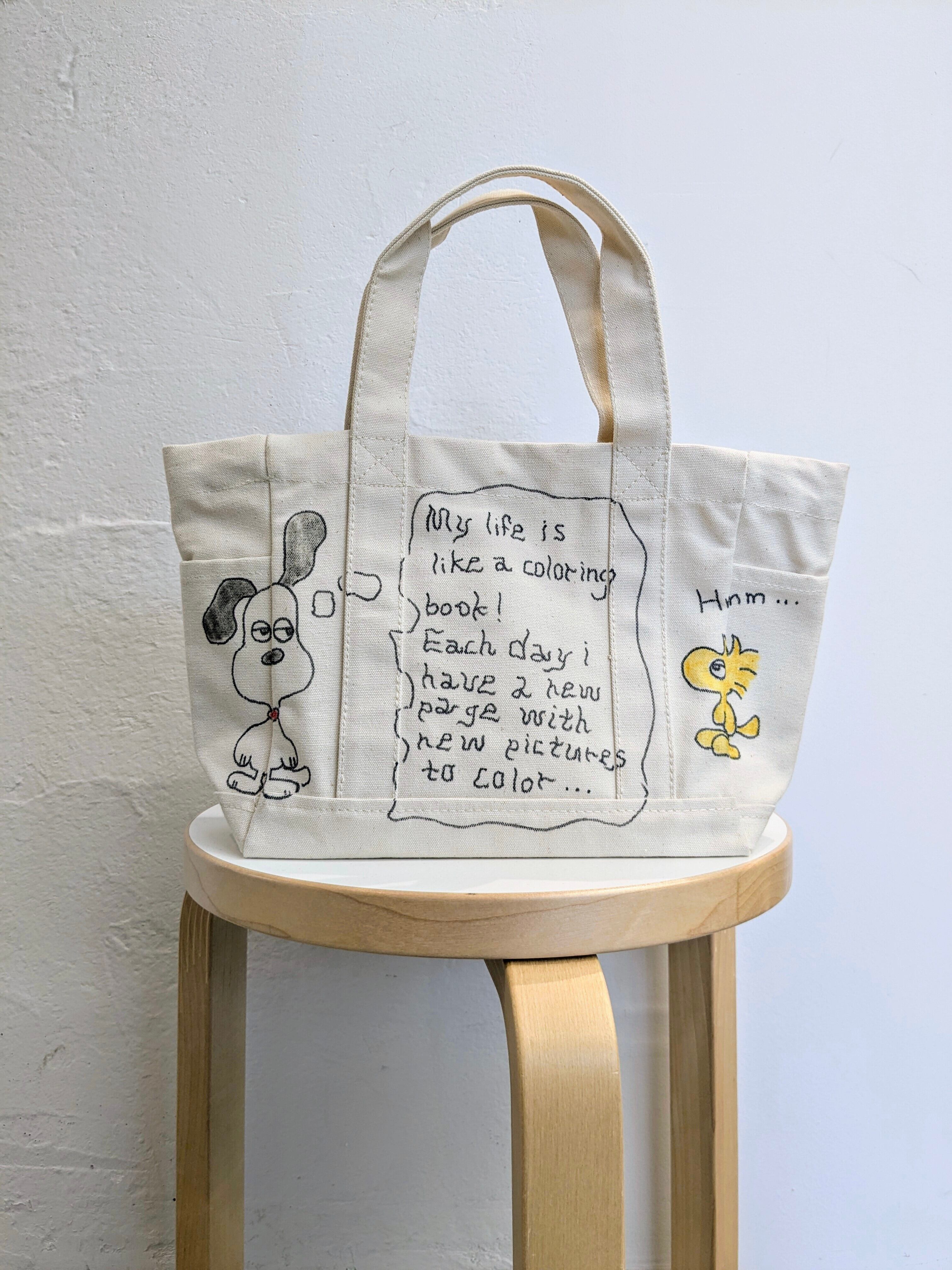 キャンバスのトートバッグにイラストを加えています。メモリアルの要素があり、どこか見たことあるキャラクターがいたりと、とにかく可愛いアイテム。スナップボタンが付いており、しっかり閉まるようになっています。左右、外にも一つポケットがあり収納も豊富。全て手作業になるので、唯一無二の一点物となります。