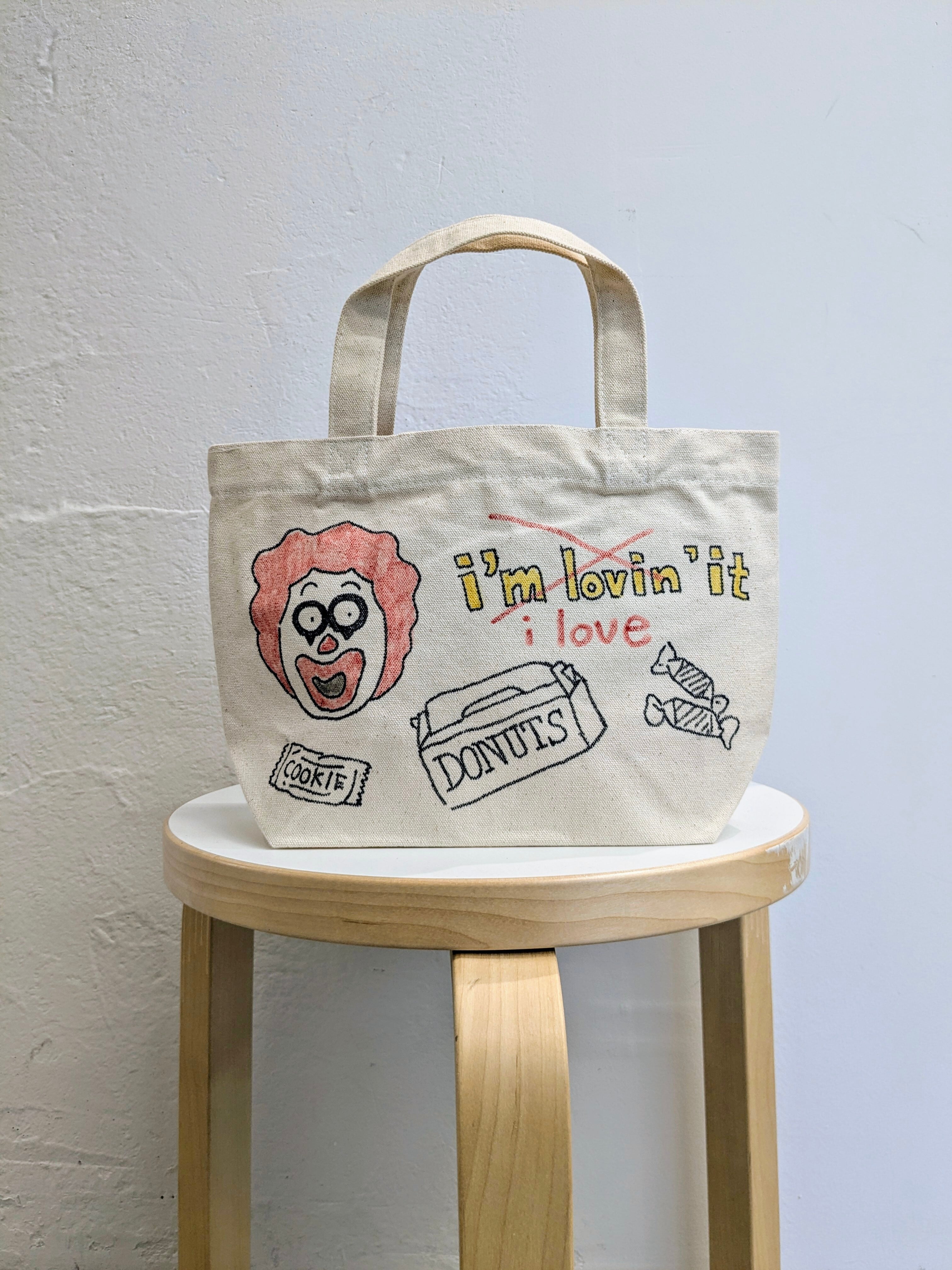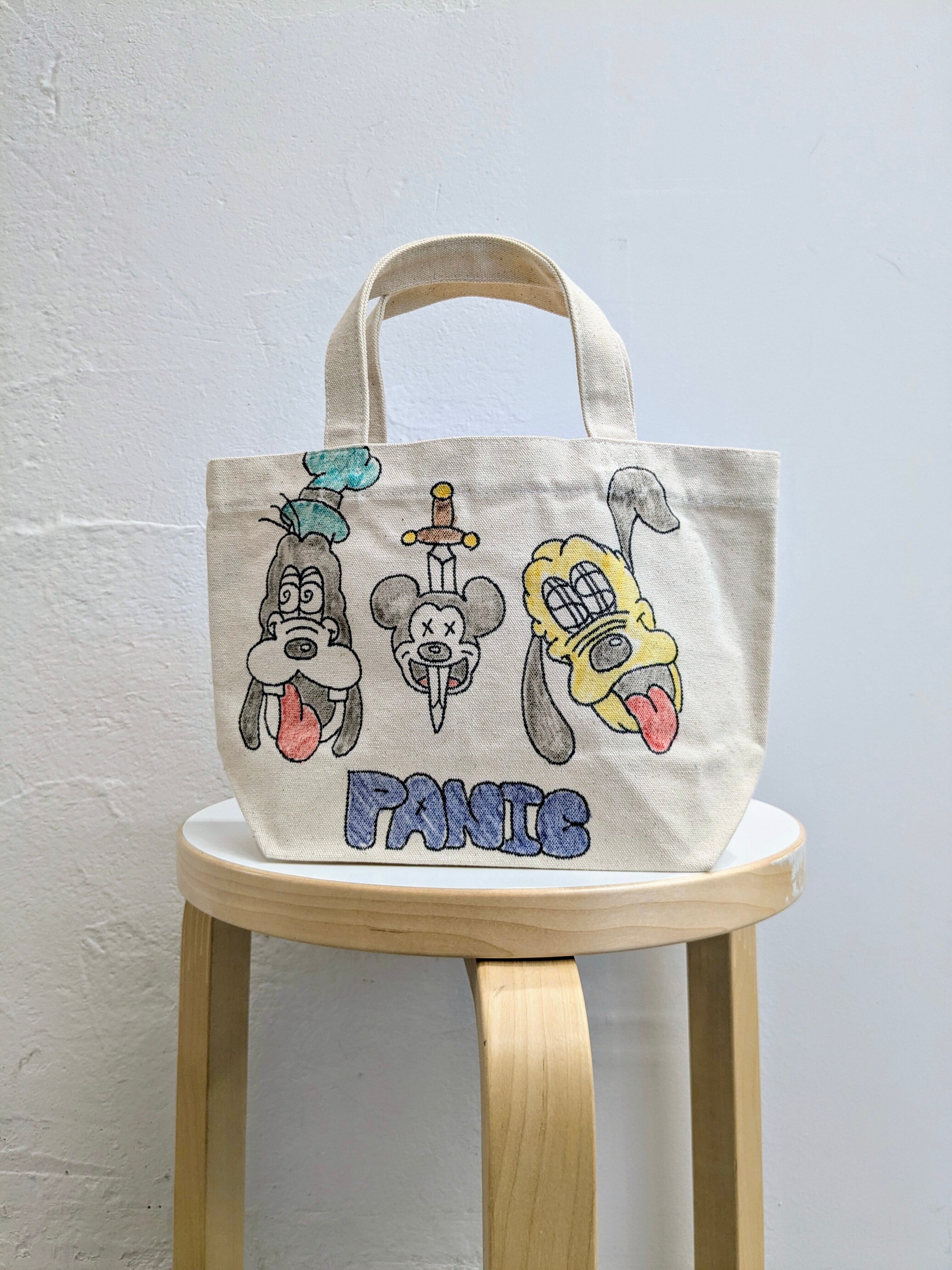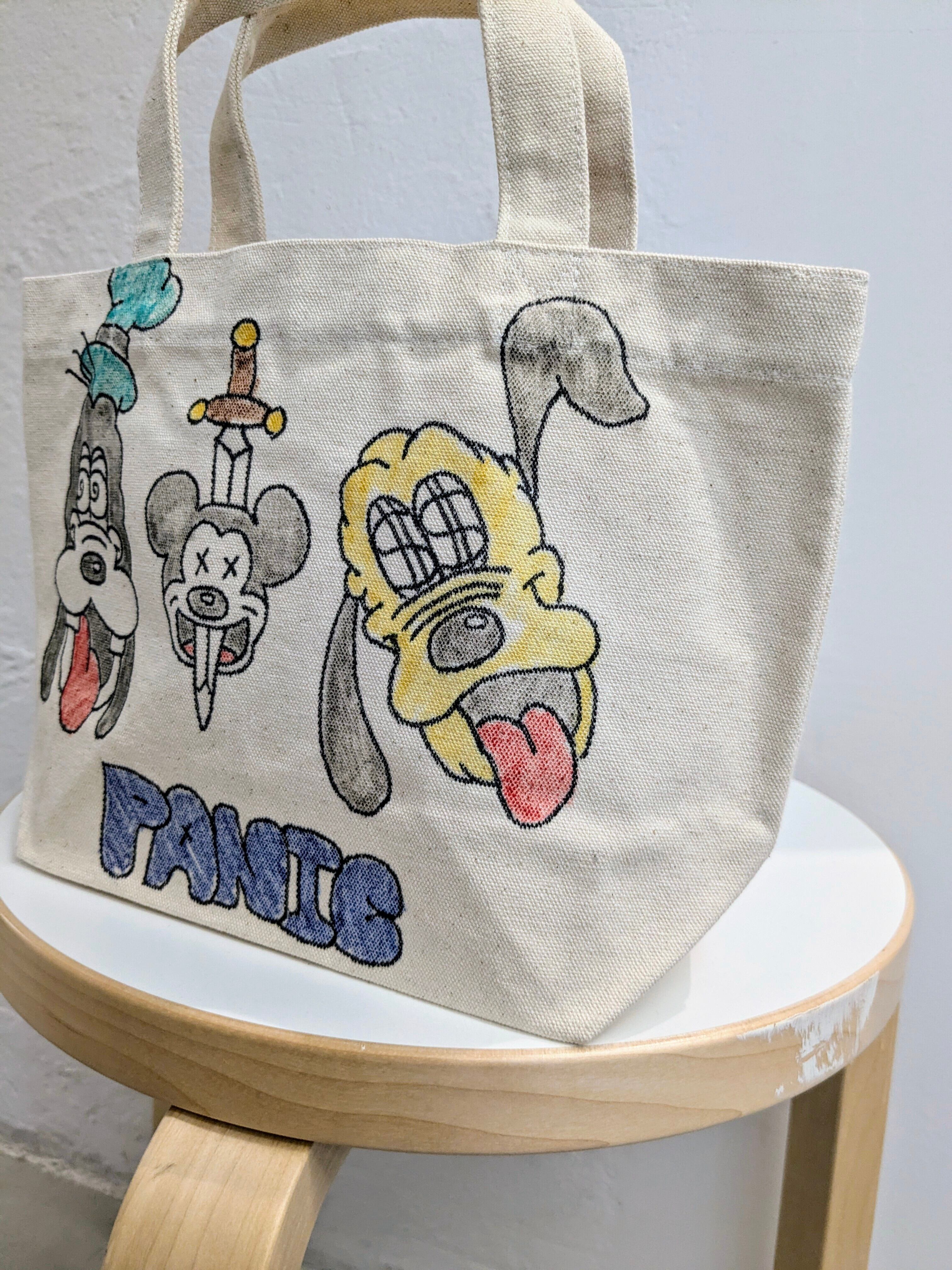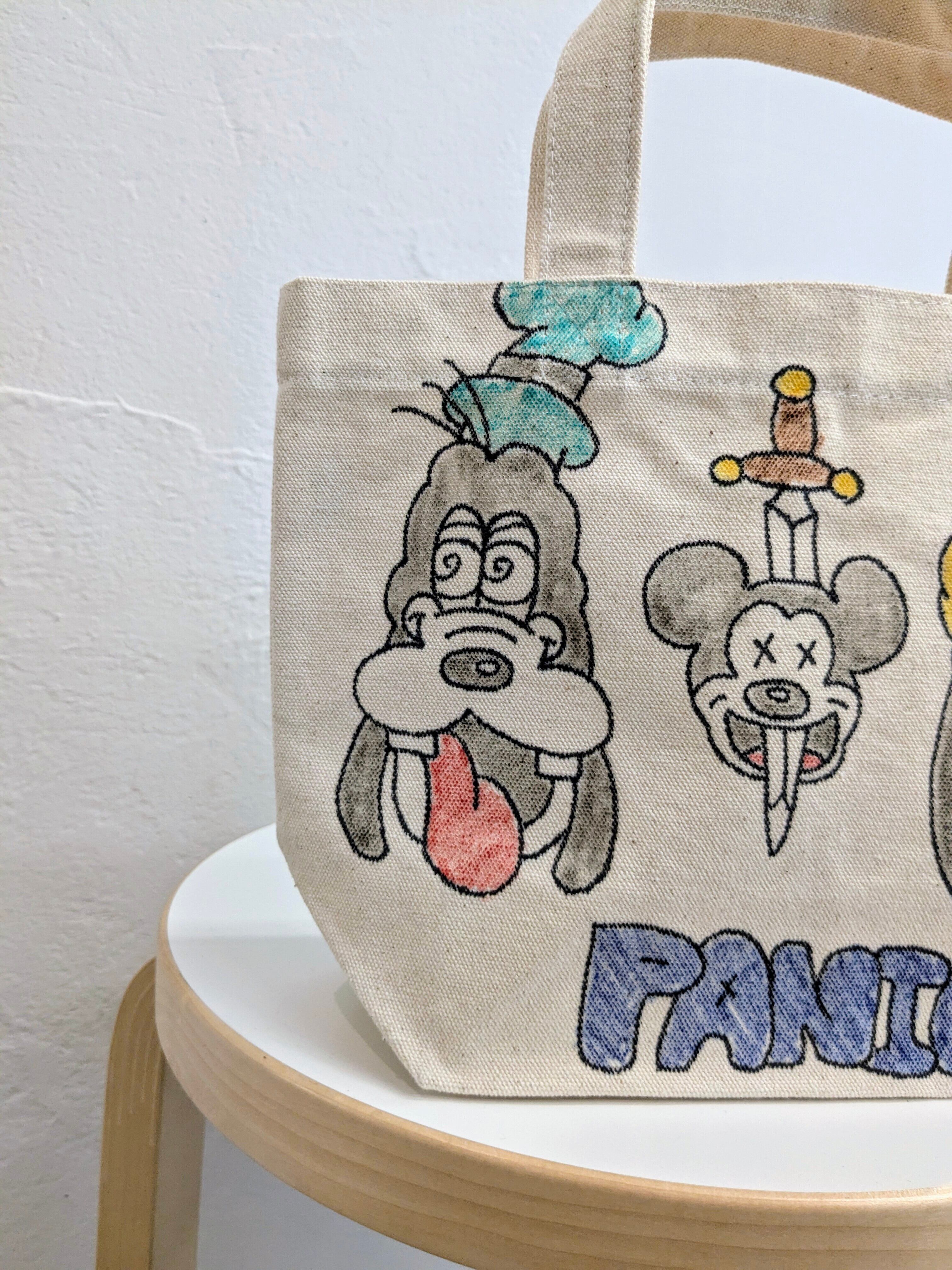 キャンバスのトートバッグにイラストを加えています。メモリアルの要素があり、どこか見たことあるキャラクターがいたりと、とにかく可愛いアイテム。全て手作業になるので、唯一無二の一点物となります。