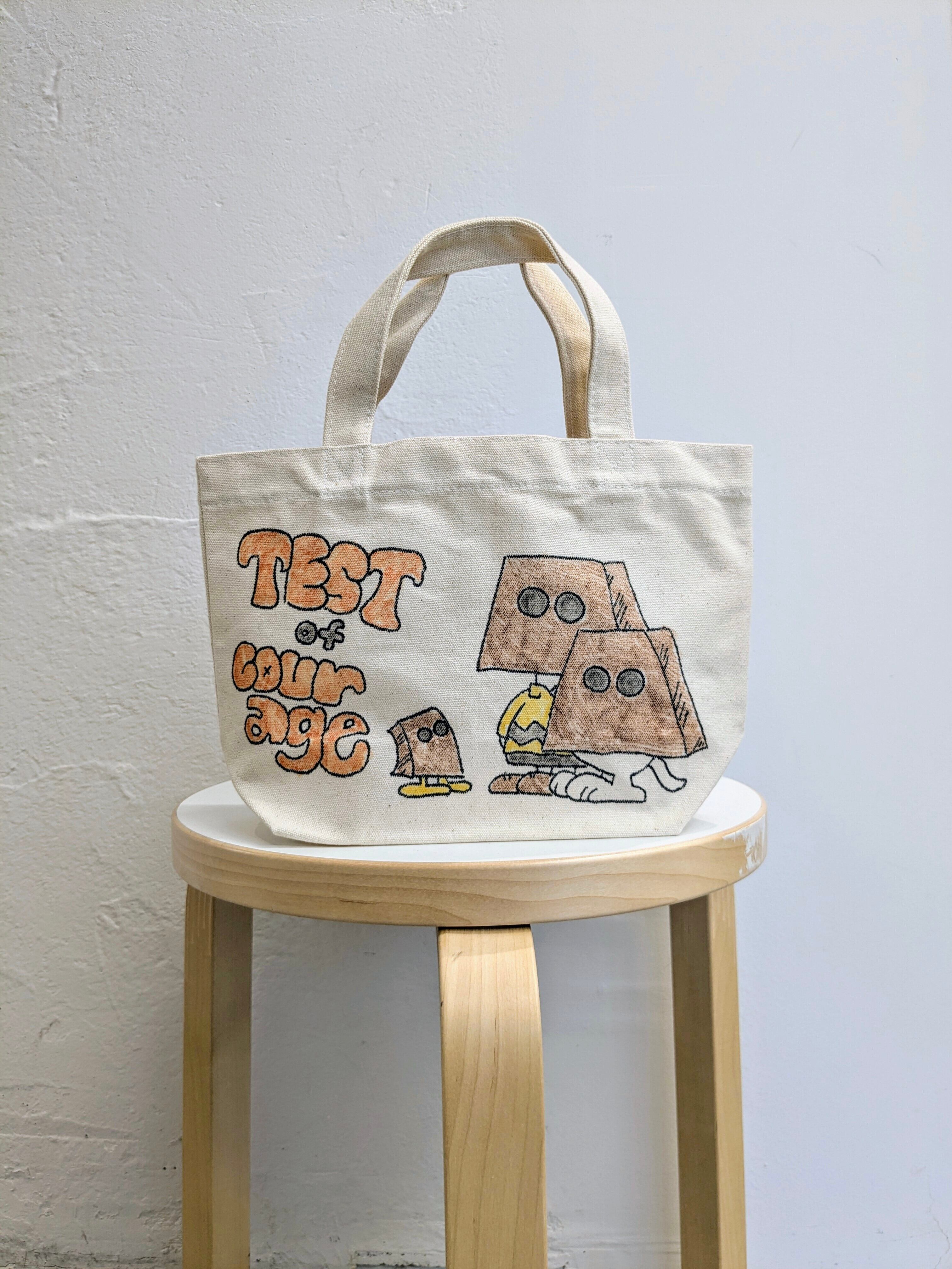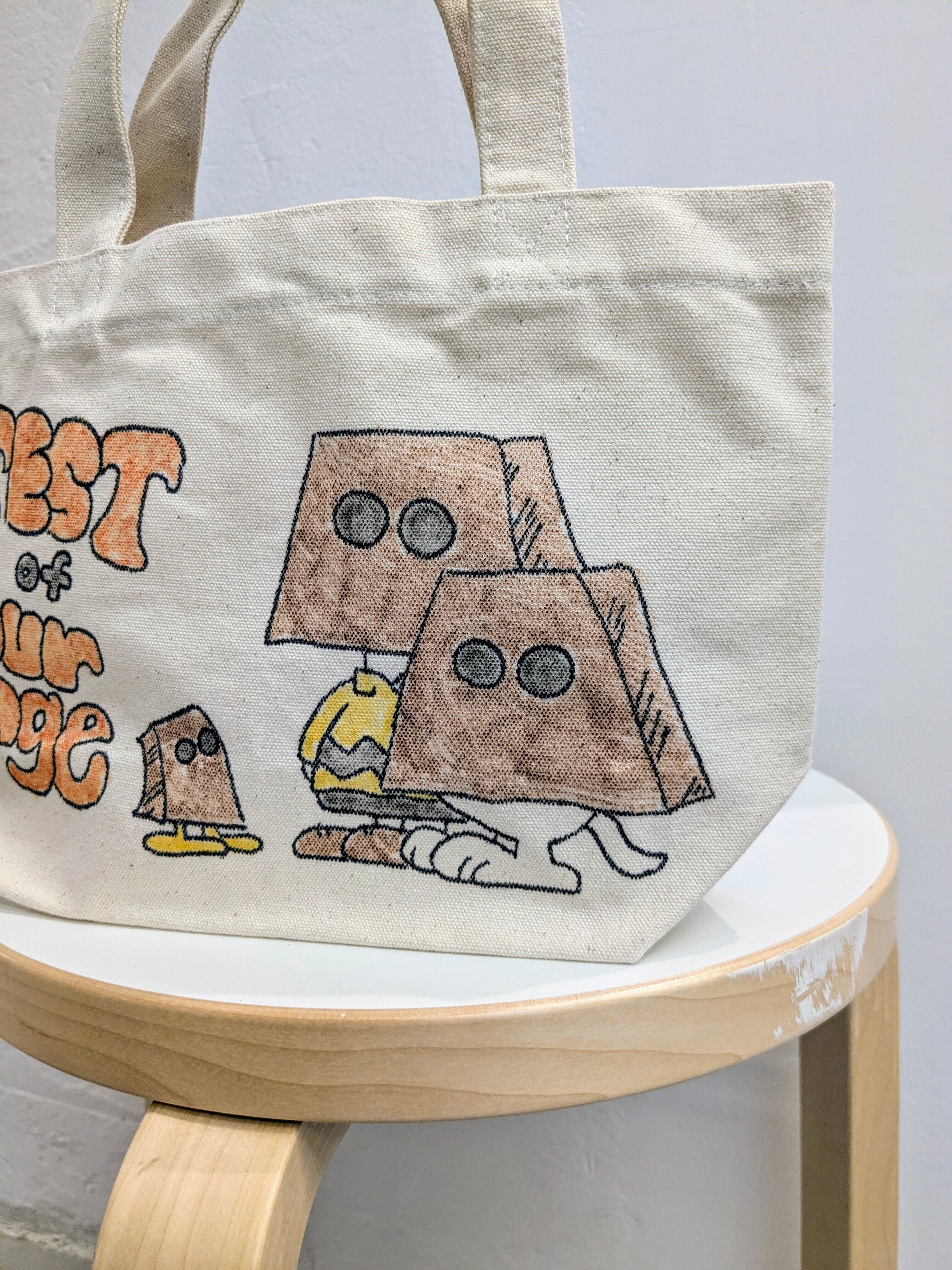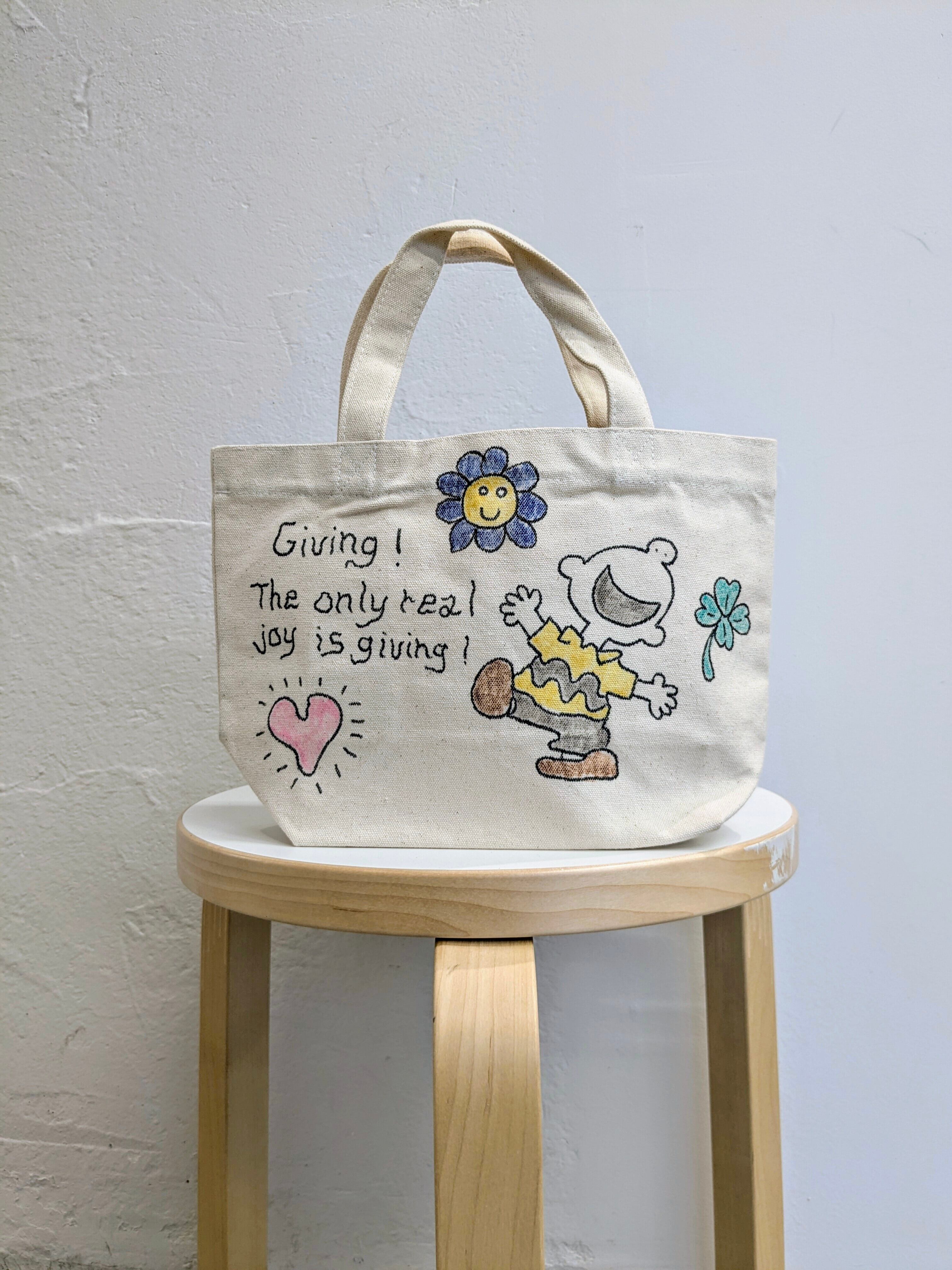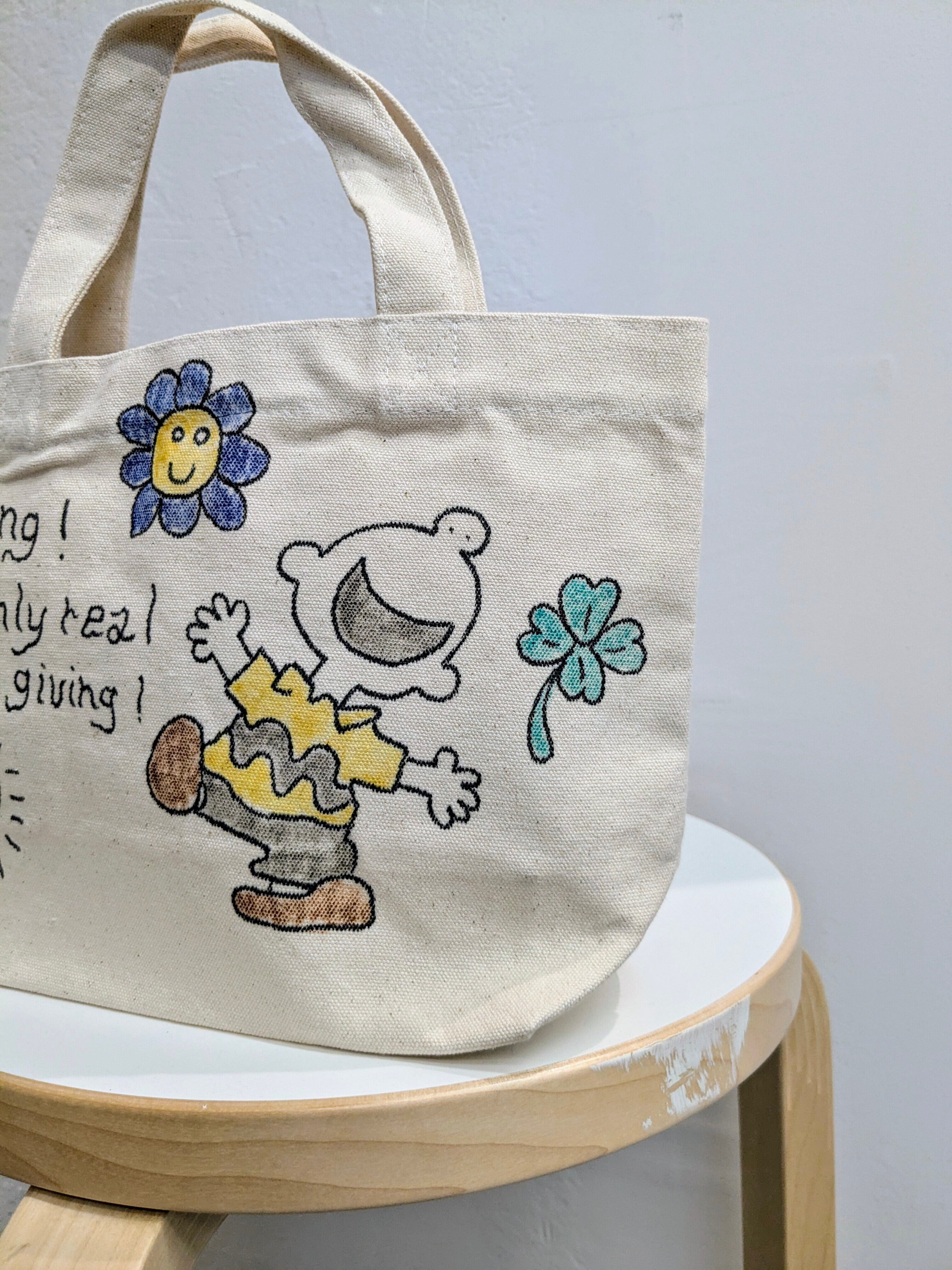 キャンバスのトートバッグにイラストを加えています。メモリアルの要素があり、どこか見たことあるキャラクターがいたりと、とにかく可愛いアイテム。全て手作業になるので、唯一無二の一点物となります。