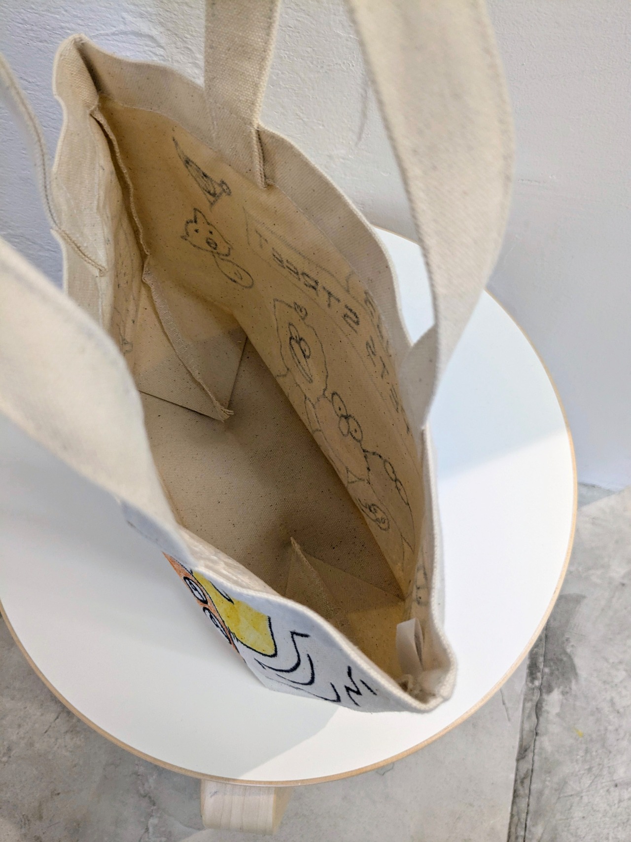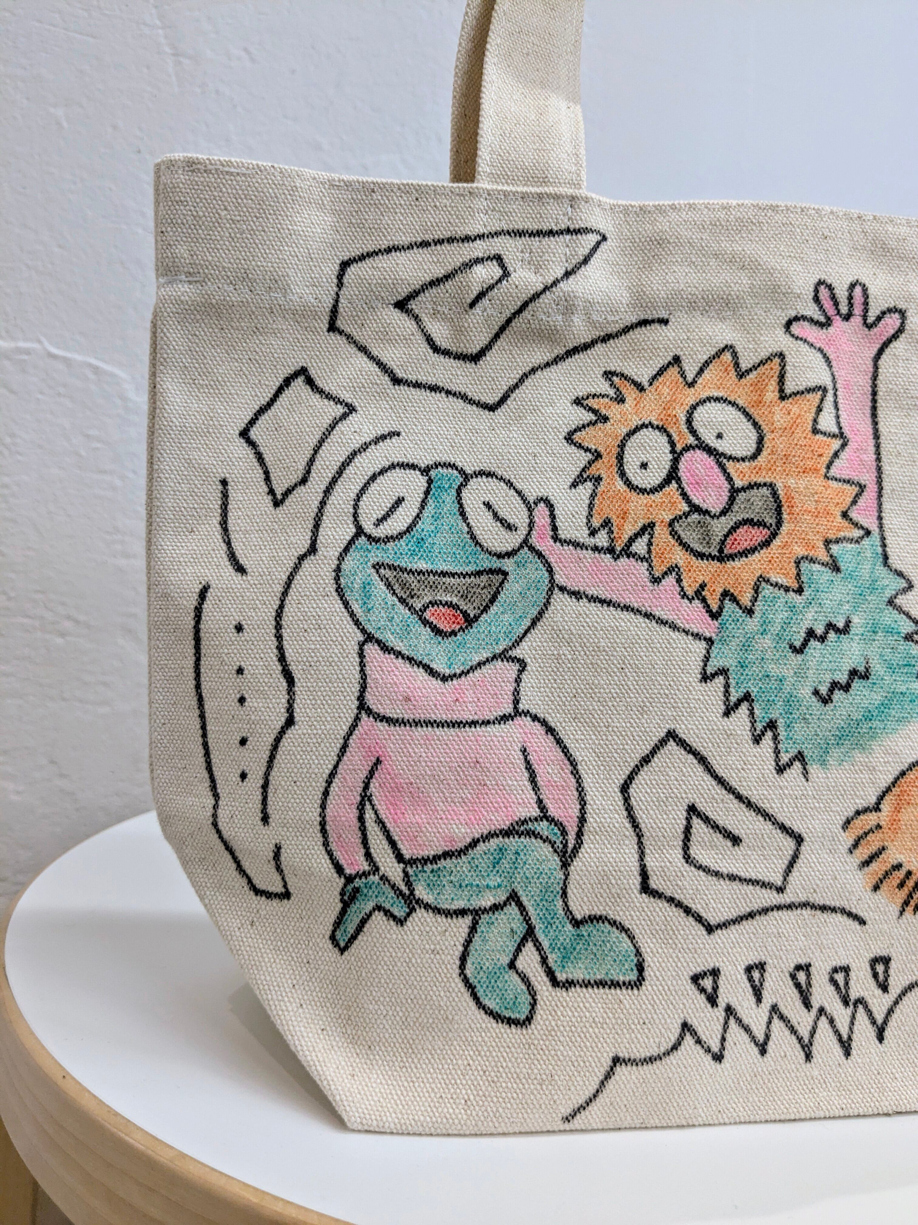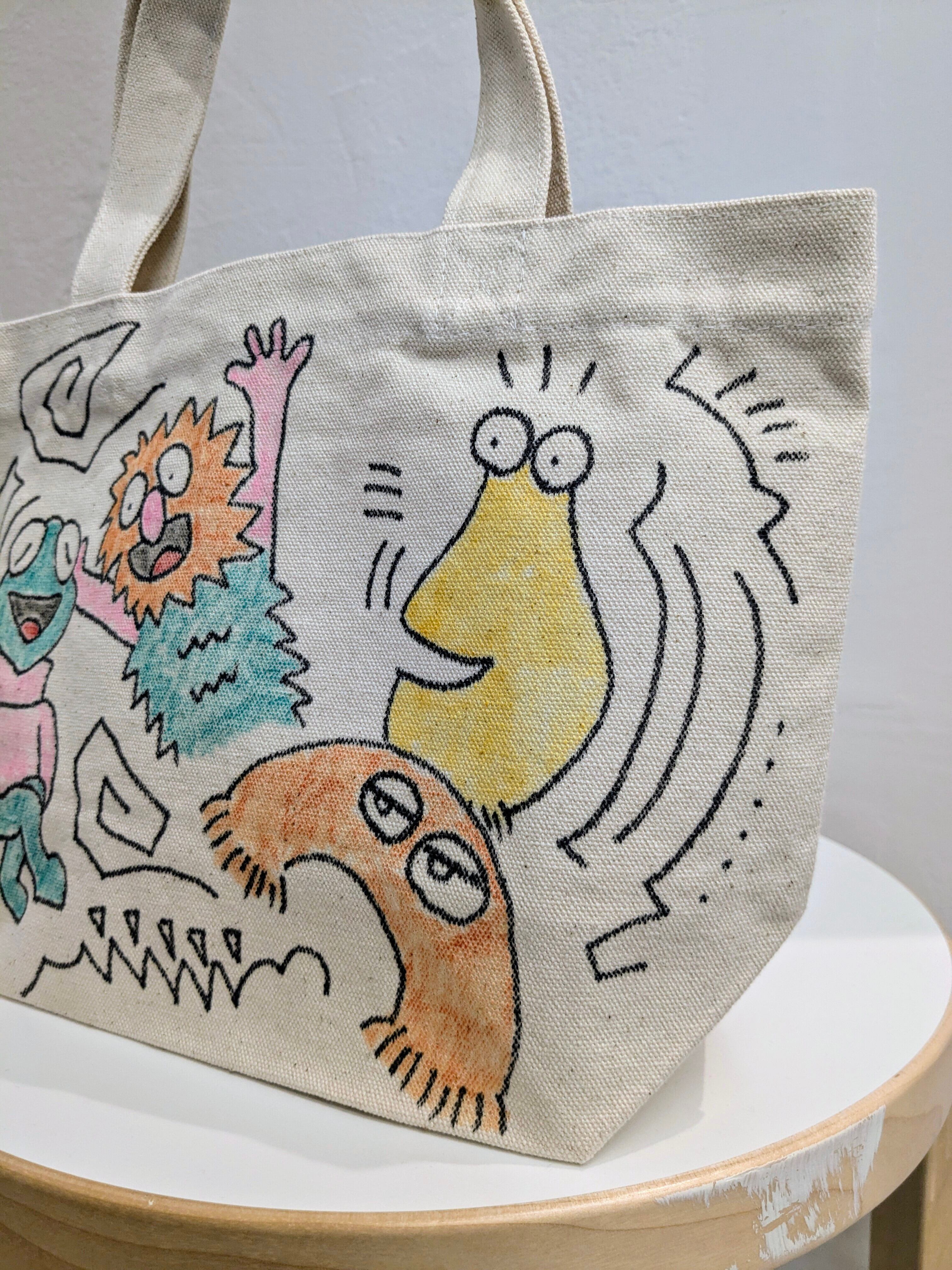 キャンバスのトートバッグにイラストを加えています。メモリアルの要素があり、どこか見たことあるキャラクターがいたりと、とにかく可愛いアイテム。全て手作業になるので、唯一無二の一点物となります。