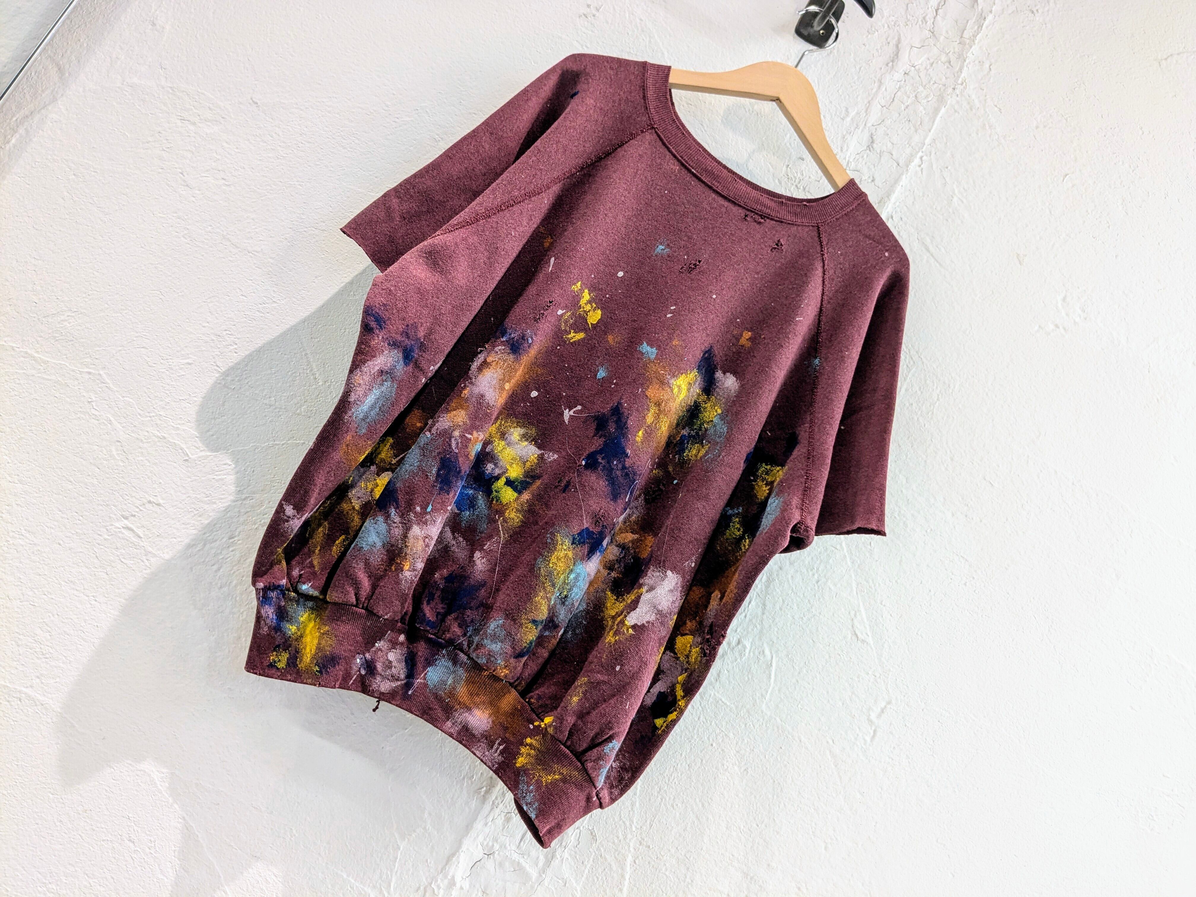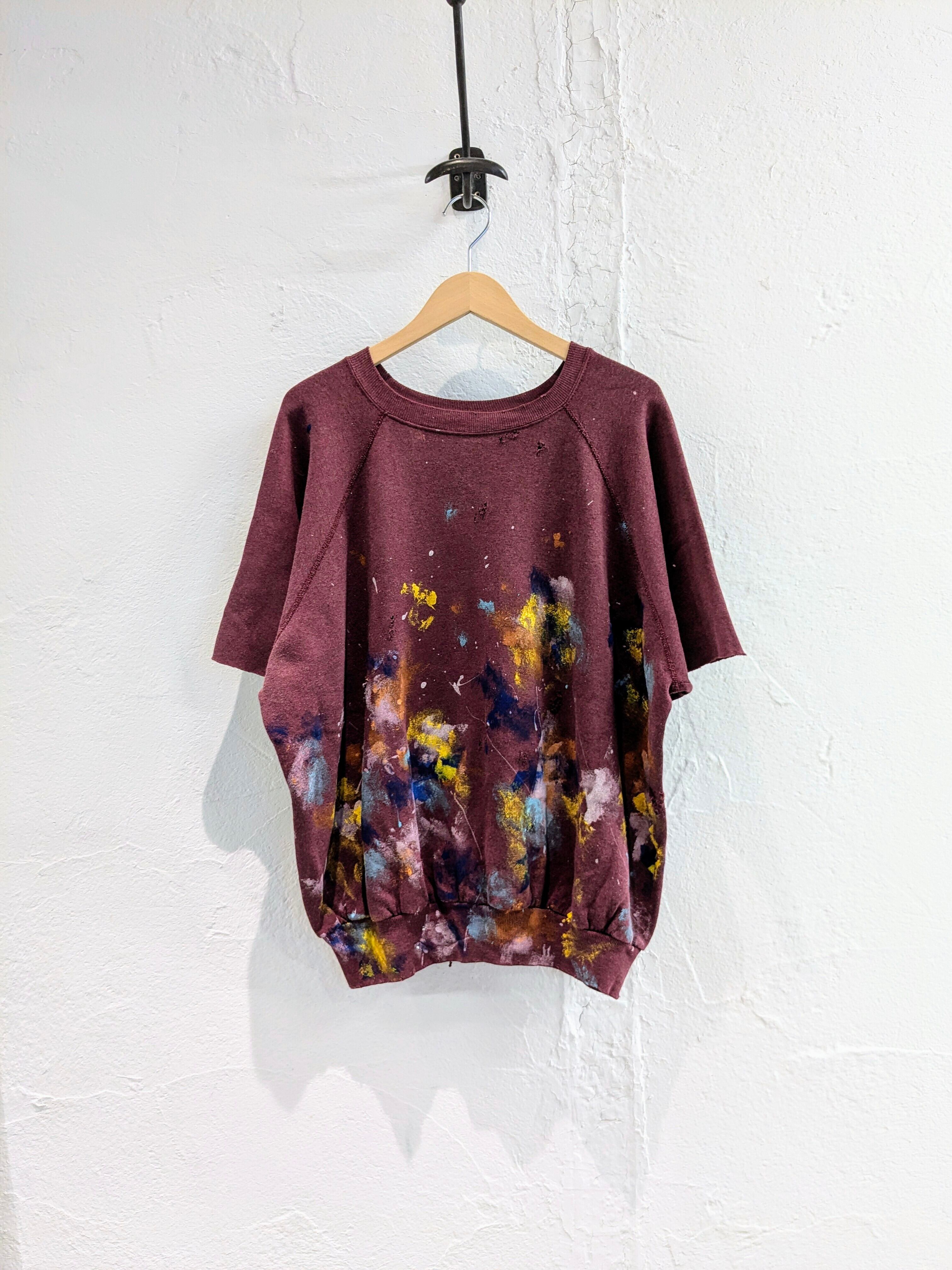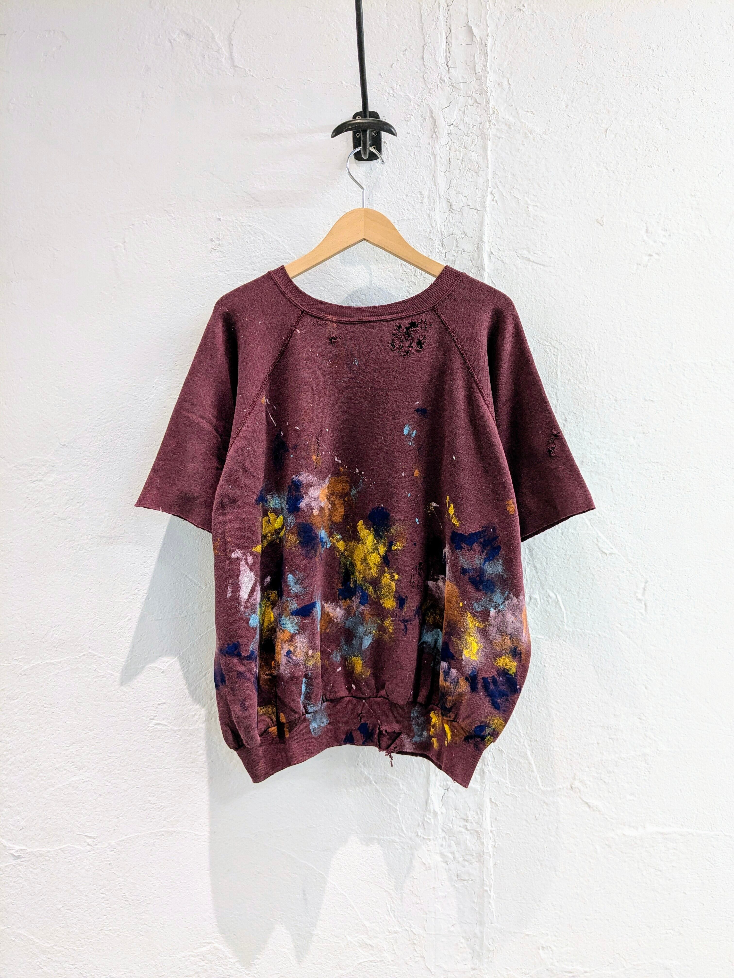 袖をカットオフし半袖にし、ペイント、ダメージ、フェードと諸々加工した贅沢な一枚。要所にダメージ、全体的に退色しており、色が薄くなっています。何より目を引くのがペイントデザイン。色鮮やかになっています。アームは太めなので、涼しくなった時はインナーに長袖を着てレイヤードするのもあり。