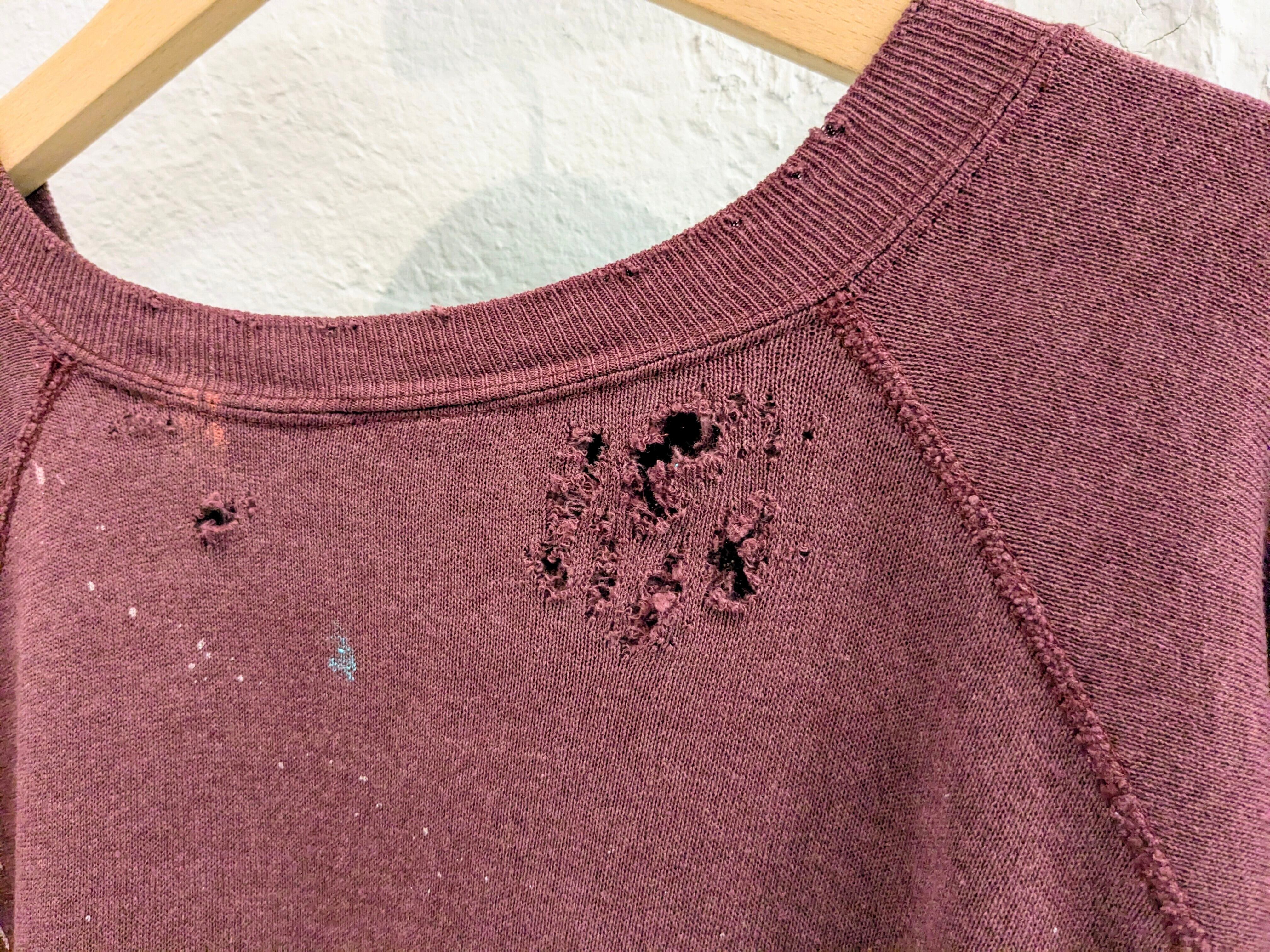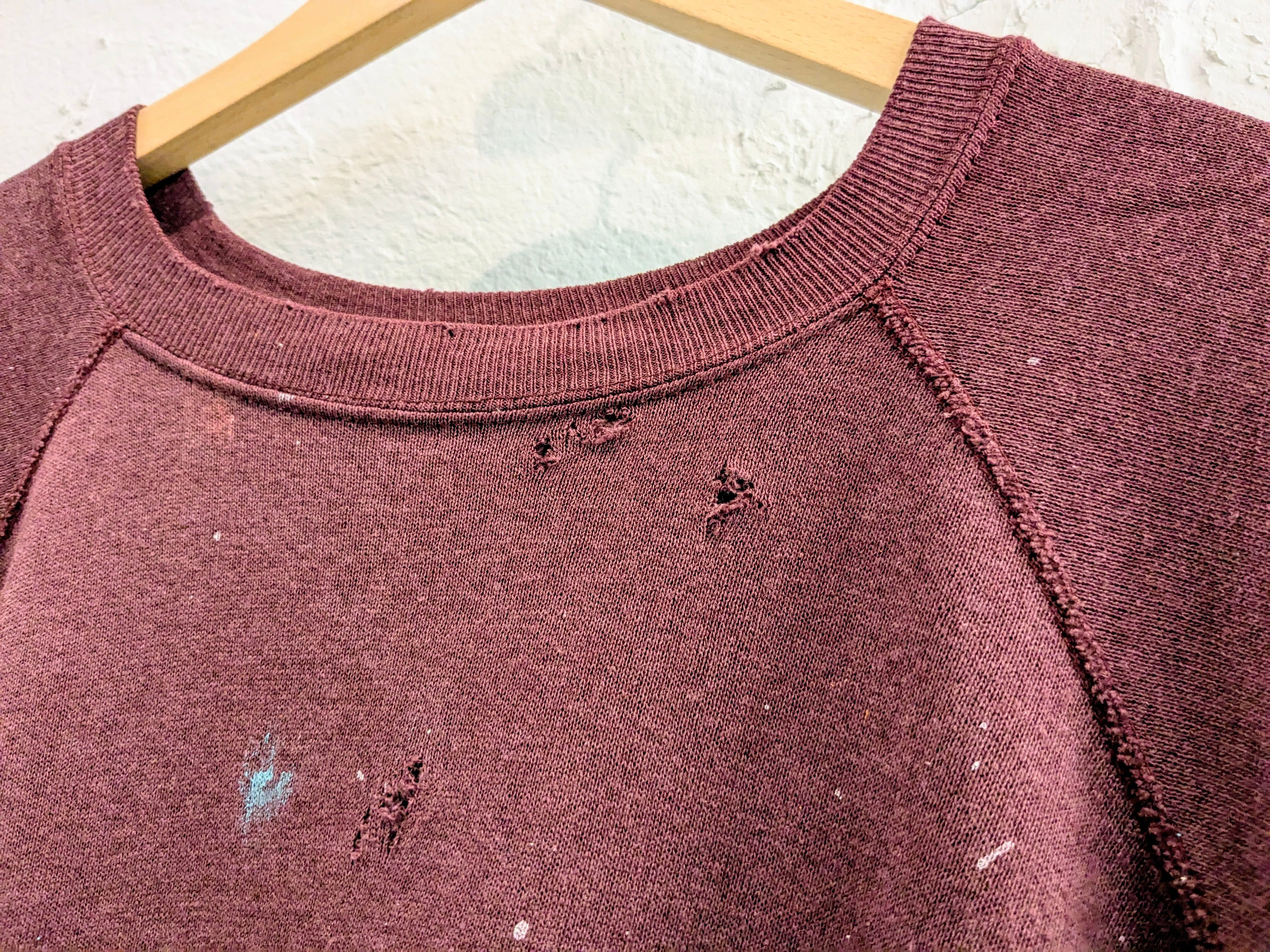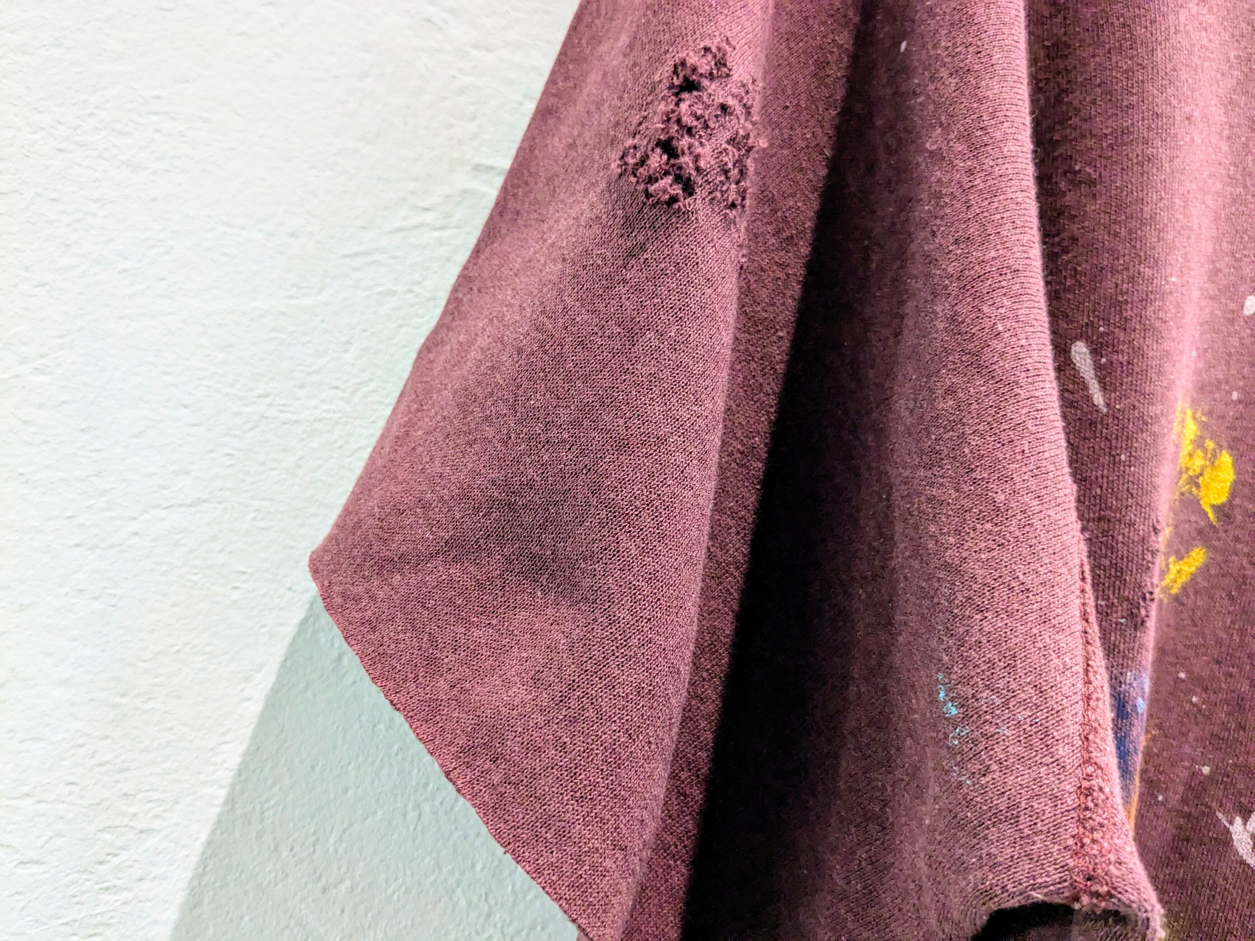 袖をカットオフし半袖にし、ペイント、ダメージ、フェードと諸々加工した贅沢な一枚。要所にダメージ、全体的に退色しており、色が薄くなっています。何より目を引くのがペイントデザイン。色鮮やかになっています。アームは太めなので、涼しくなった時はインナーに長袖を着てレイヤードするのもあり。