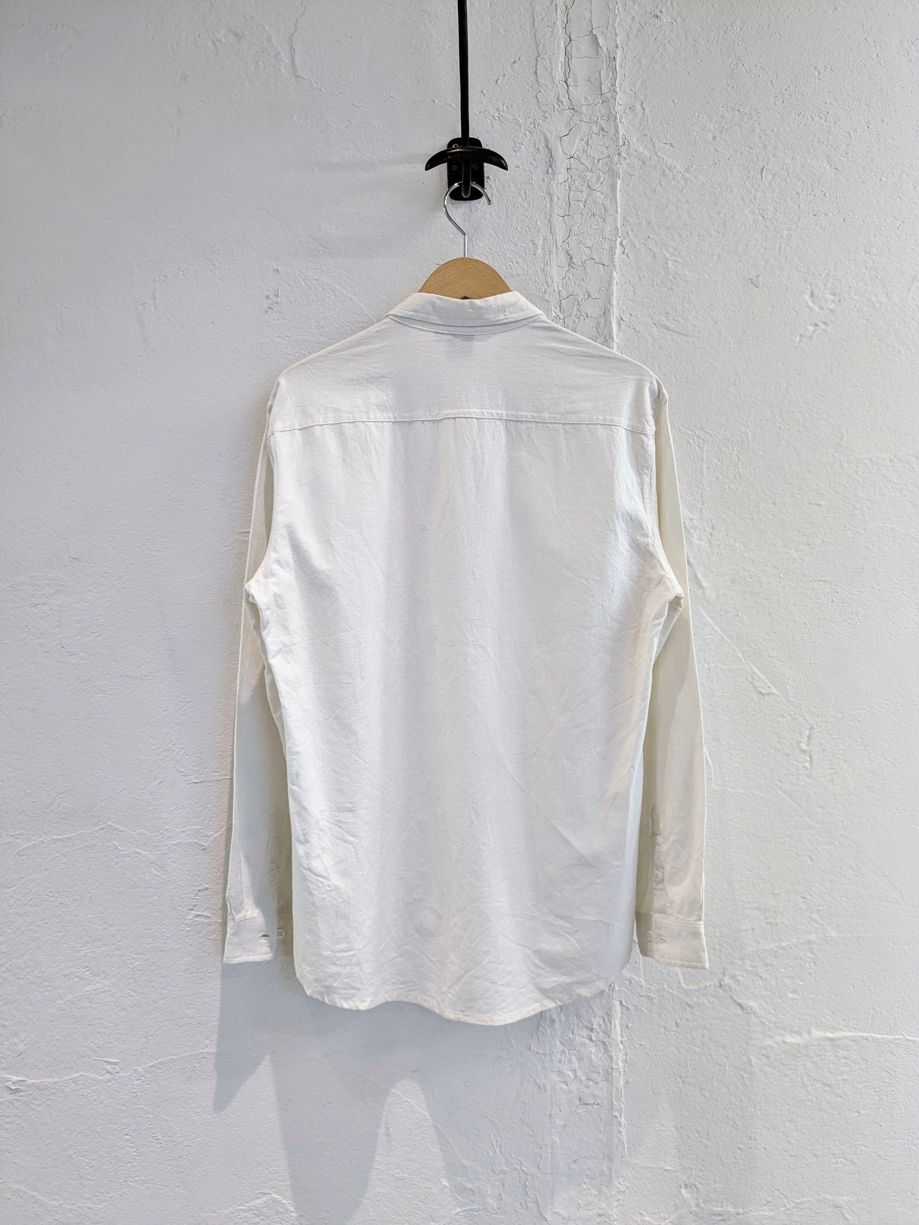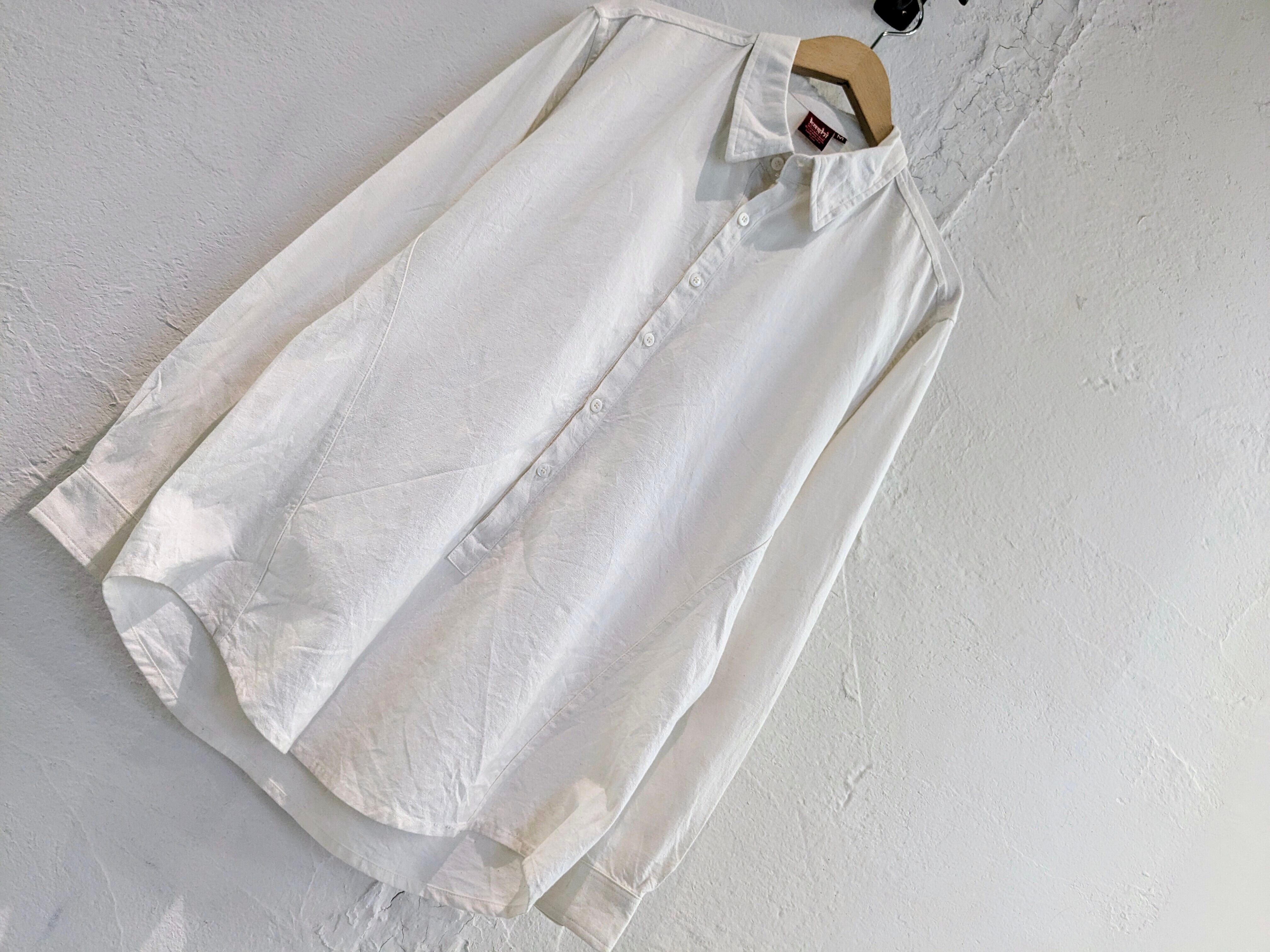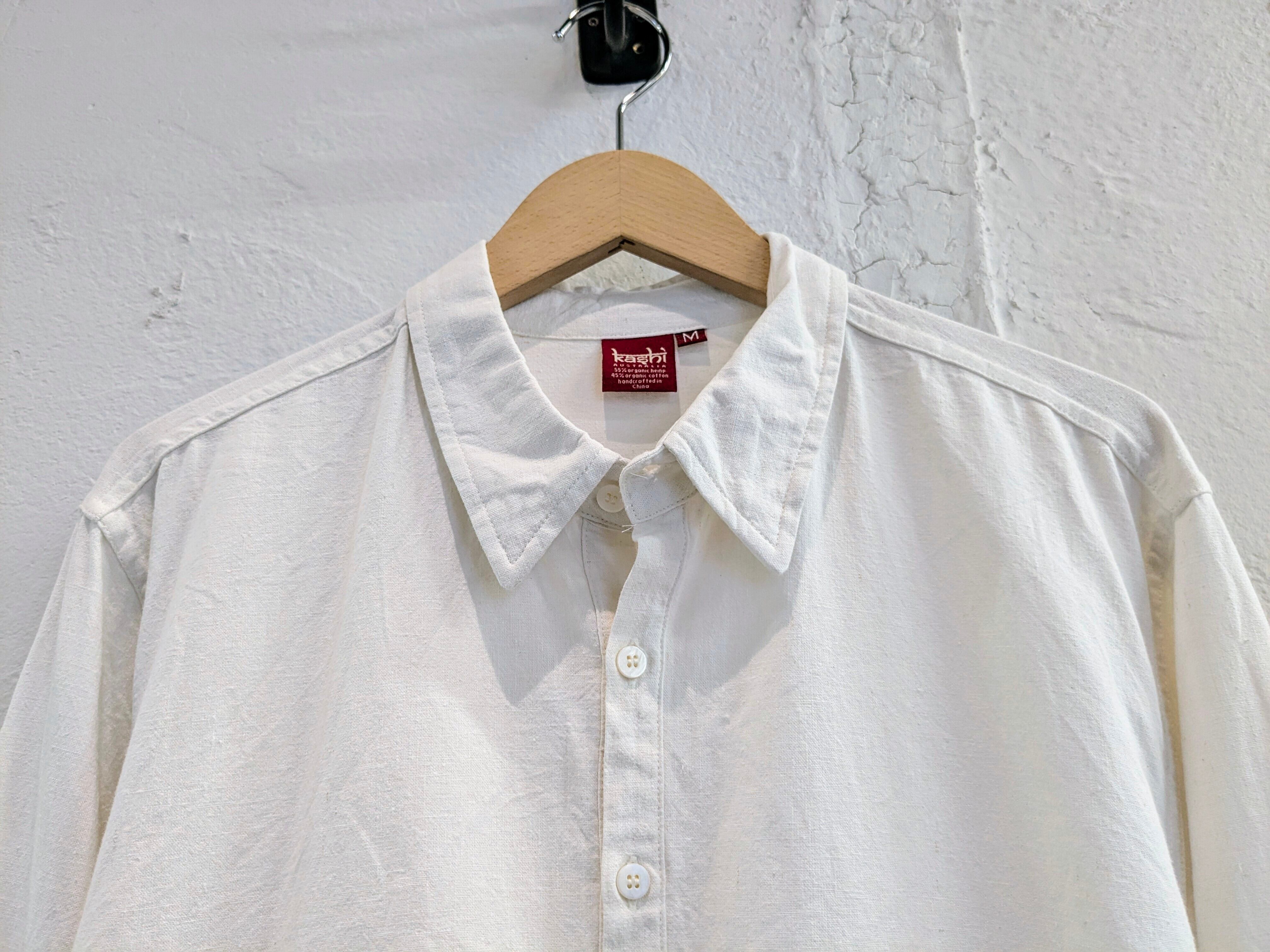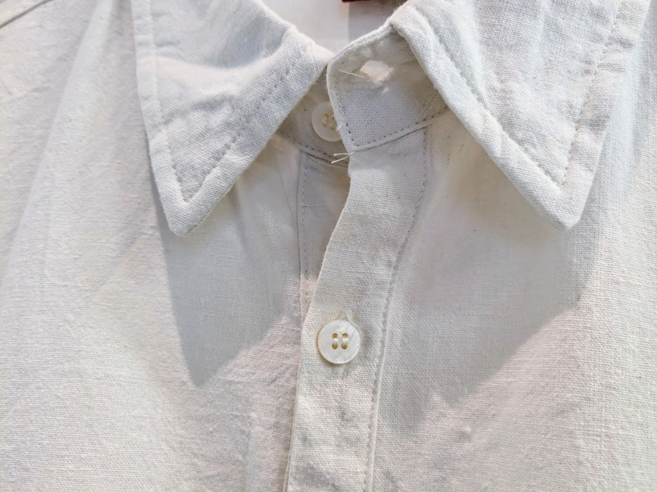 タグには"Handcrafted"の記載あり。素材もオーガニックヘンプ、コットンを使用。脇下は、まっすぐでなく、立体的になるような作りとなっていたり、よく見ると色々ディテール、素材などが見えてくる一着。汚れではないですが、糸が時折混ざっていたりします。