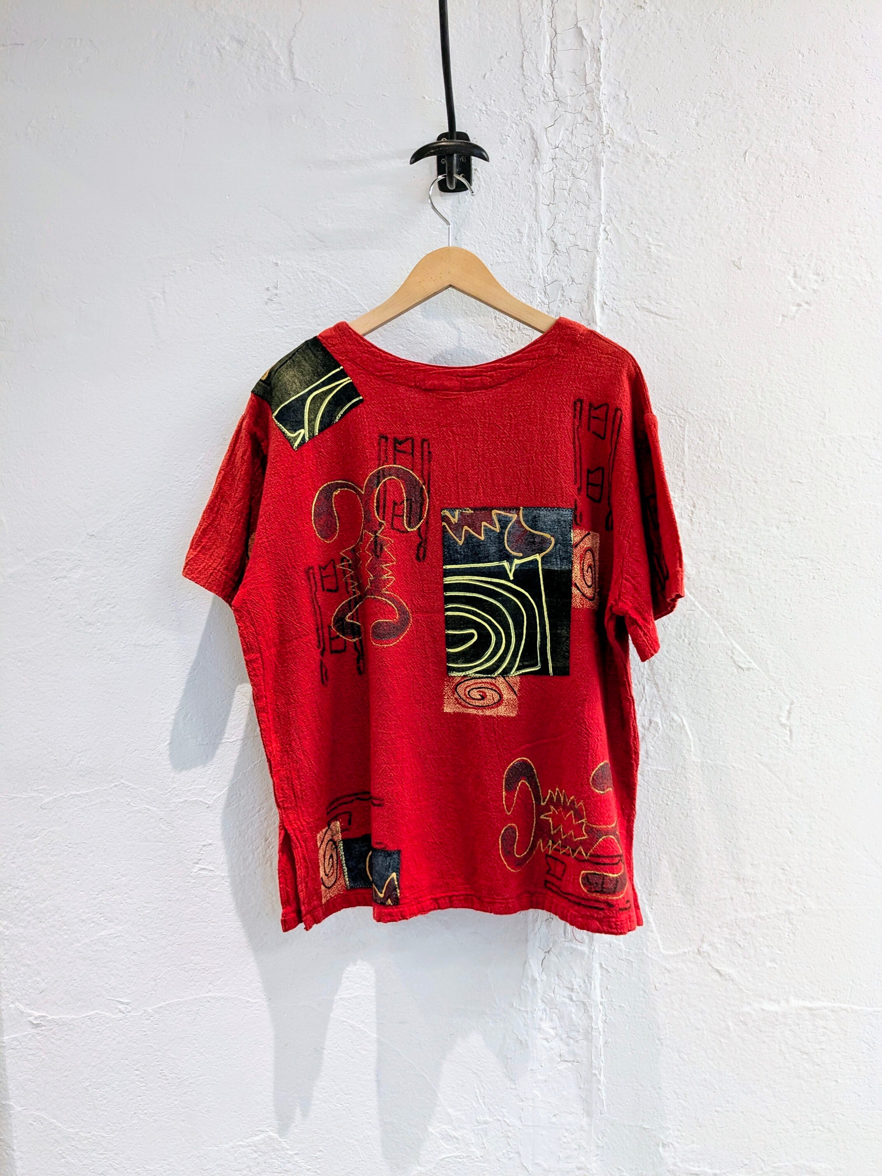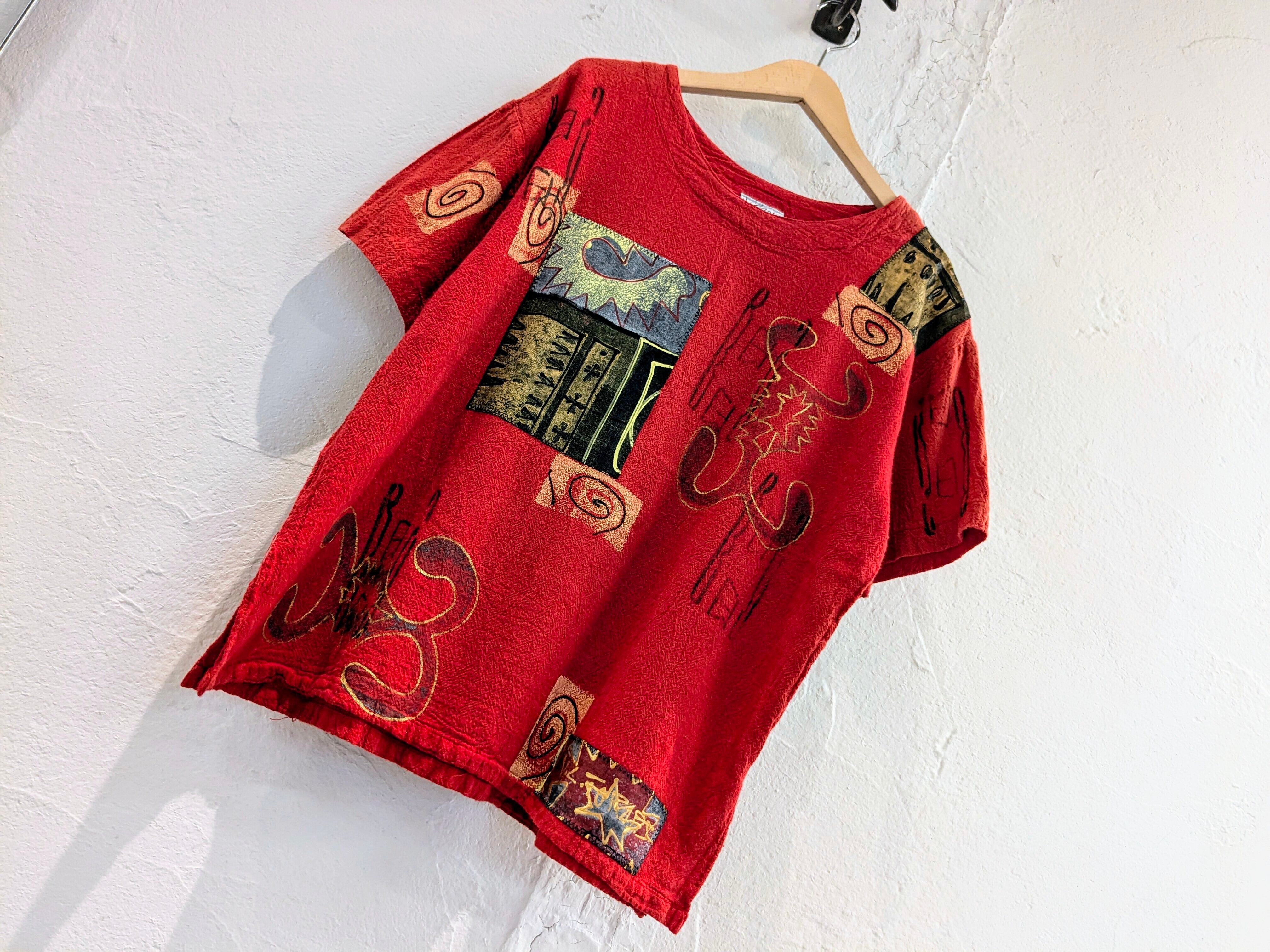 刺繍もなのか、おそらく手作業でデザインされたアイテム。シャツのような生地で、形はTシャツ。シワ加工もされており、表面に動きのあるデザイン。シルエットはボックスのようなシルエットなのも嬉しいポイント。
