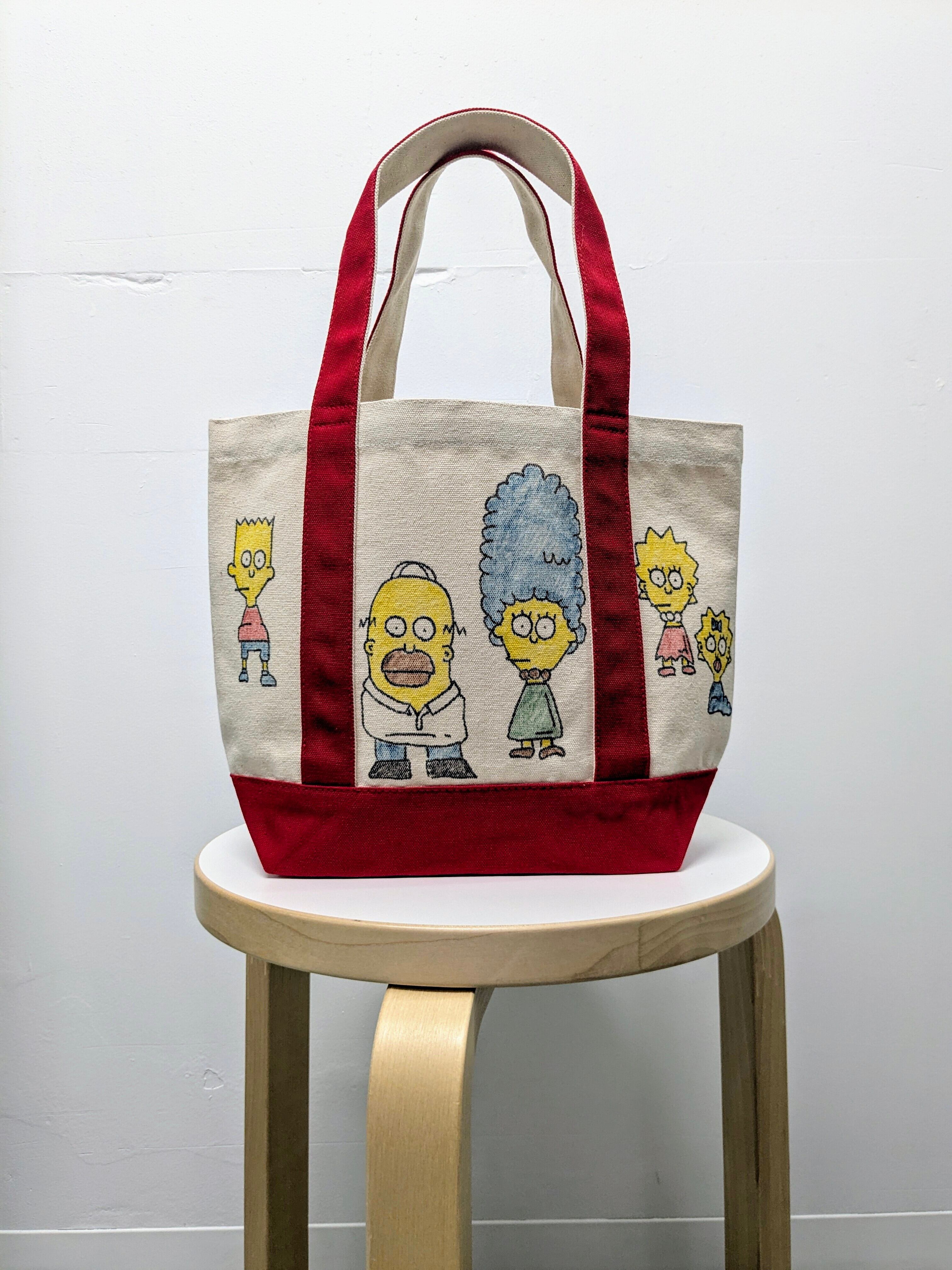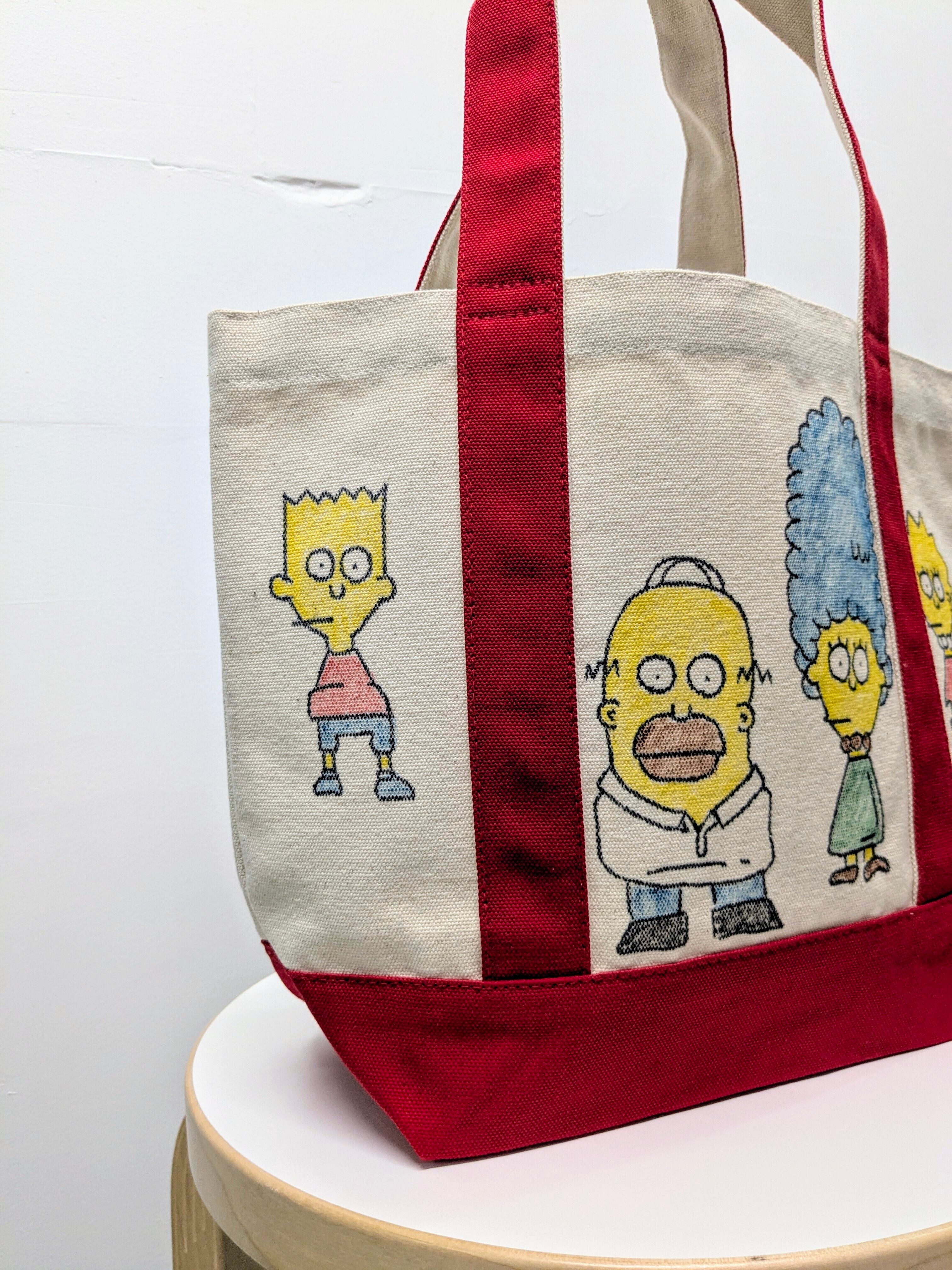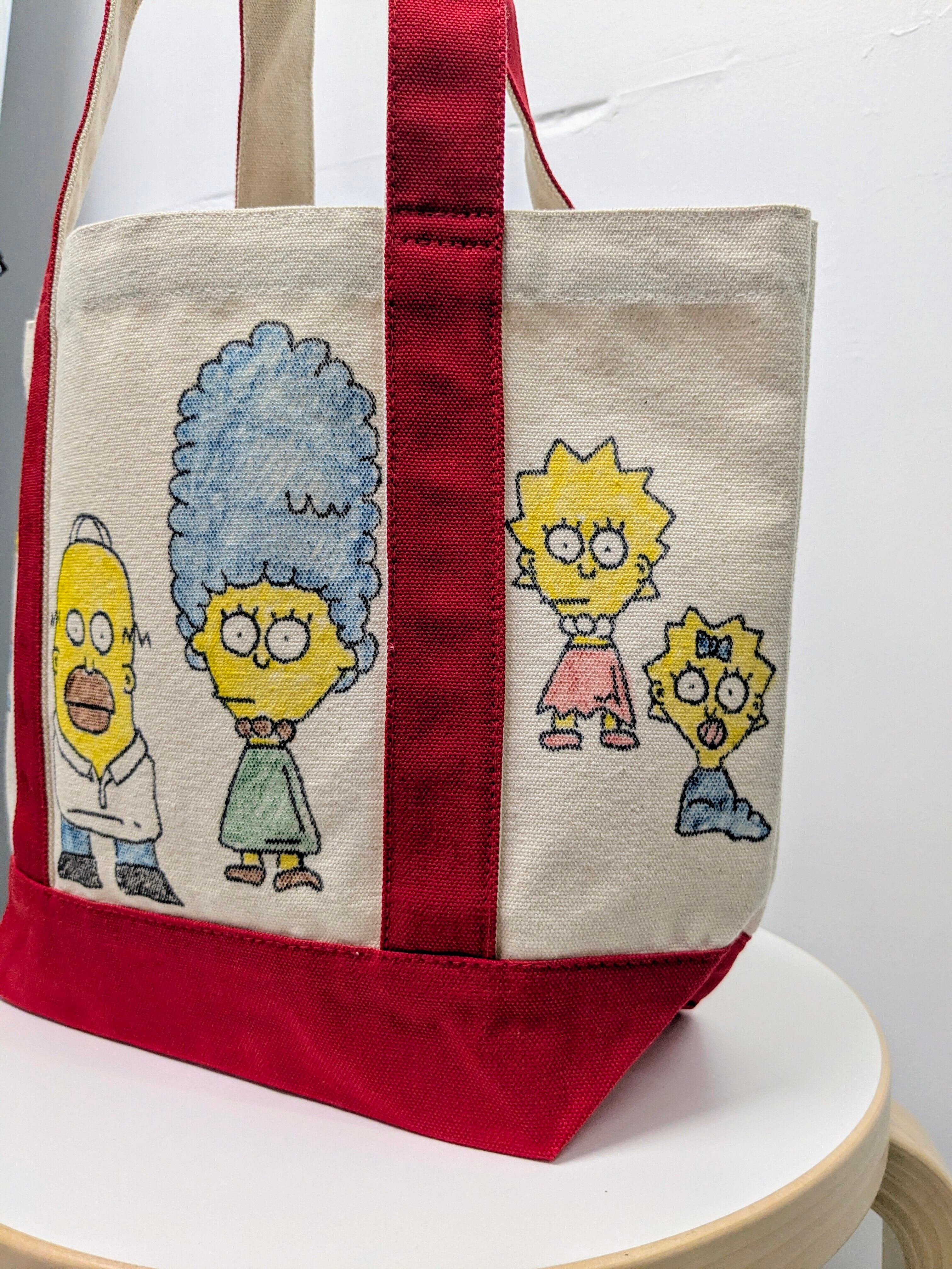 キャンバスのトートバッグにイラストを加えています。メモリアルの要素があり、どこか見たことあるキャラクターがいたりと、とにかく可愛いアイテム。全て手作業になるので、唯一無二の一点物となります。