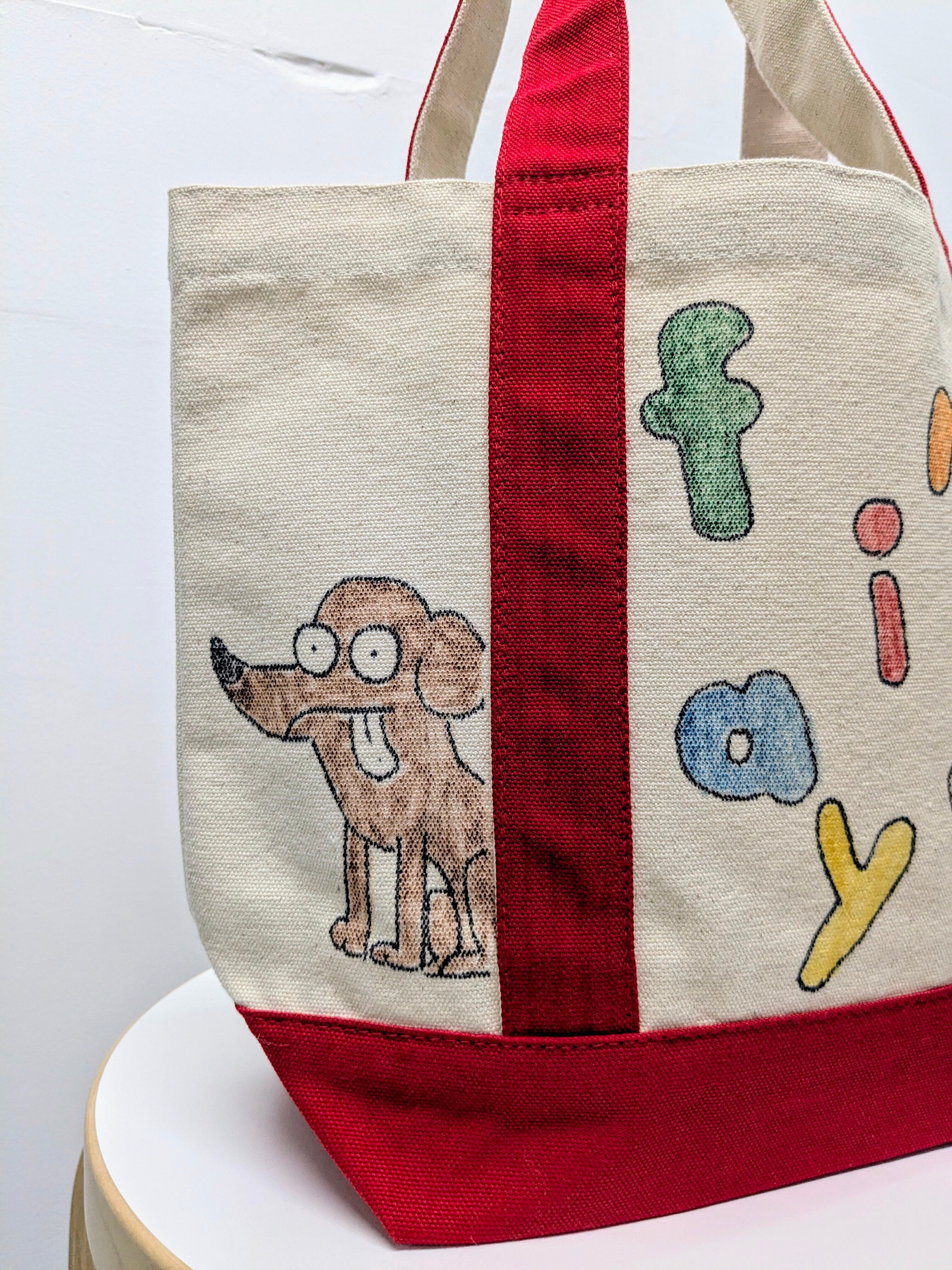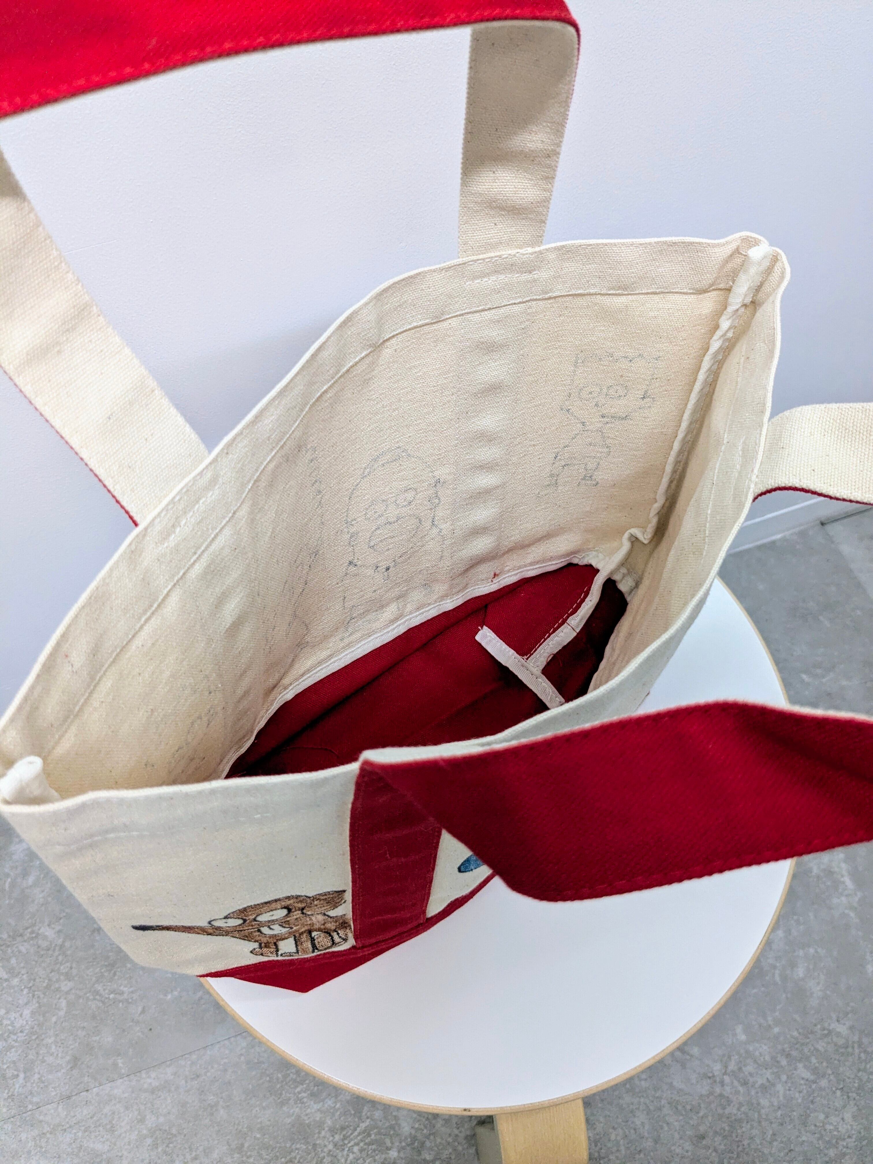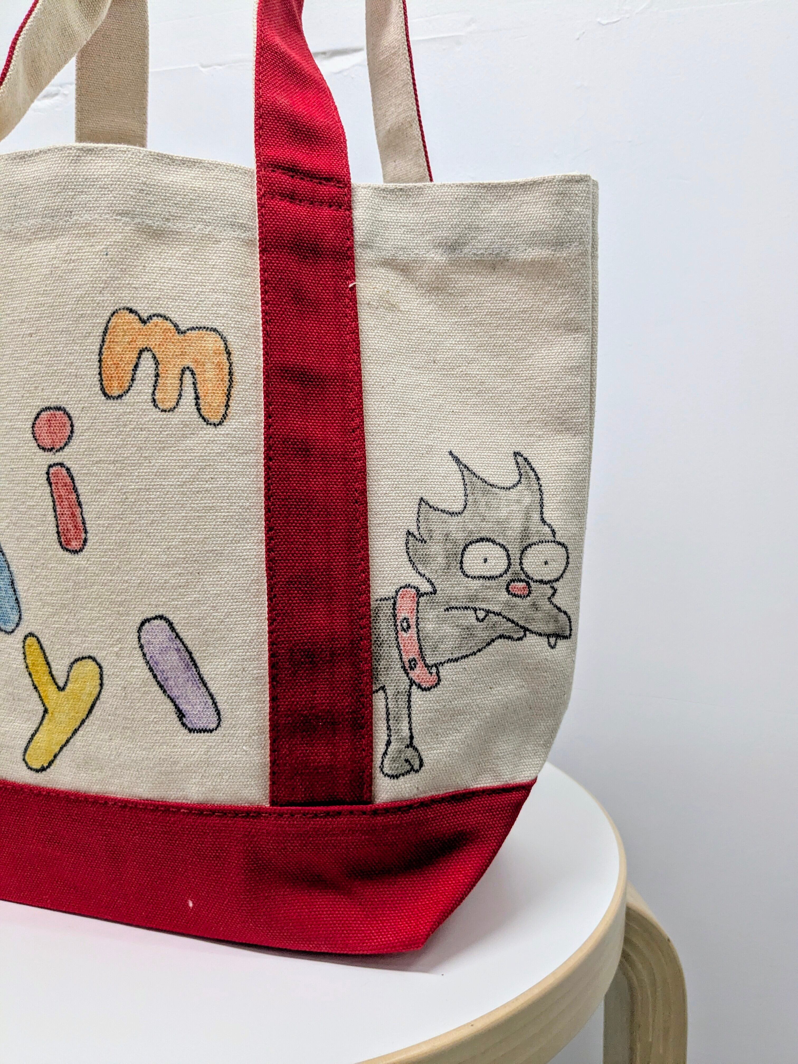 キャンバスのトートバッグにイラストを加えています。メモリアルの要素があり、どこか見たことあるキャラクターがいたりと、とにかく可愛いアイテム。全て手作業になるので、唯一無二の一点物となります。