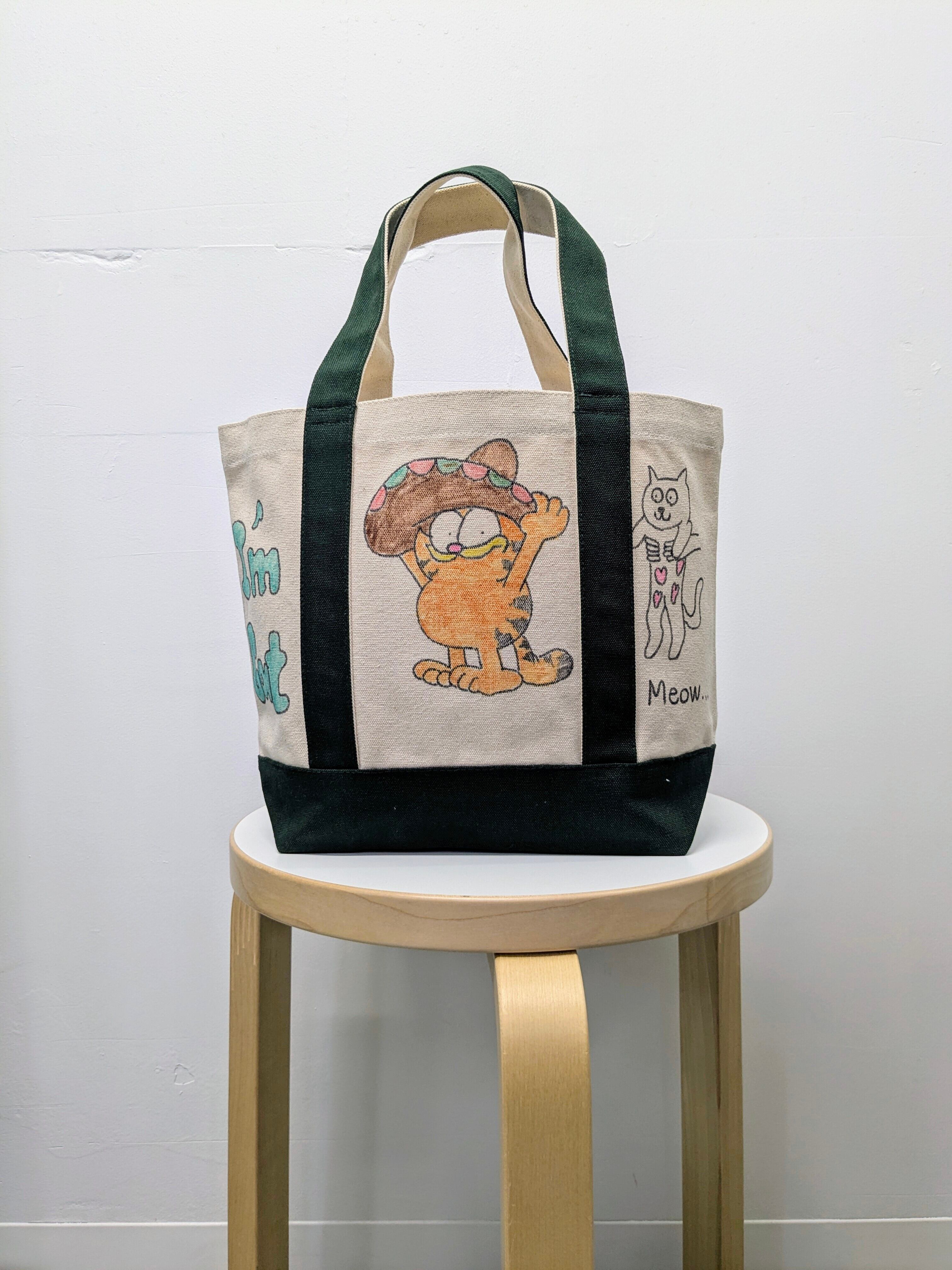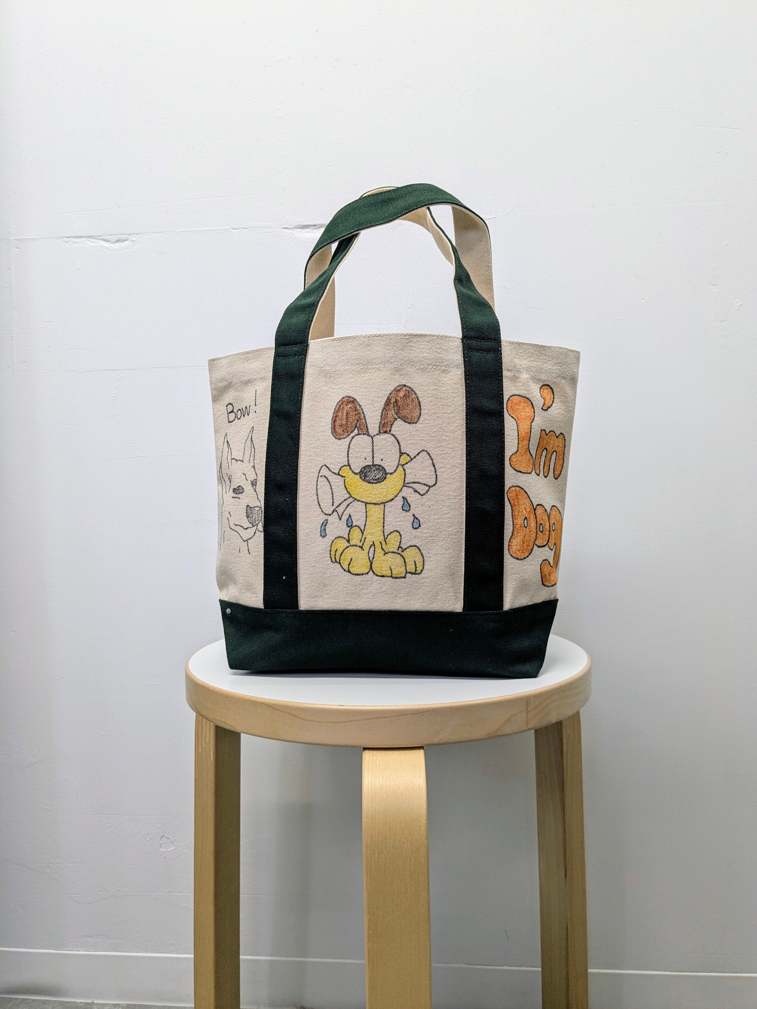 キャンバスのトートバッグにイラストを加えています。メモリアルの要素があり、どこか見たことあるキャラクターがいたりと、とにかく可愛いアイテム。全て手作業になるので、唯一無二の一点物となります。