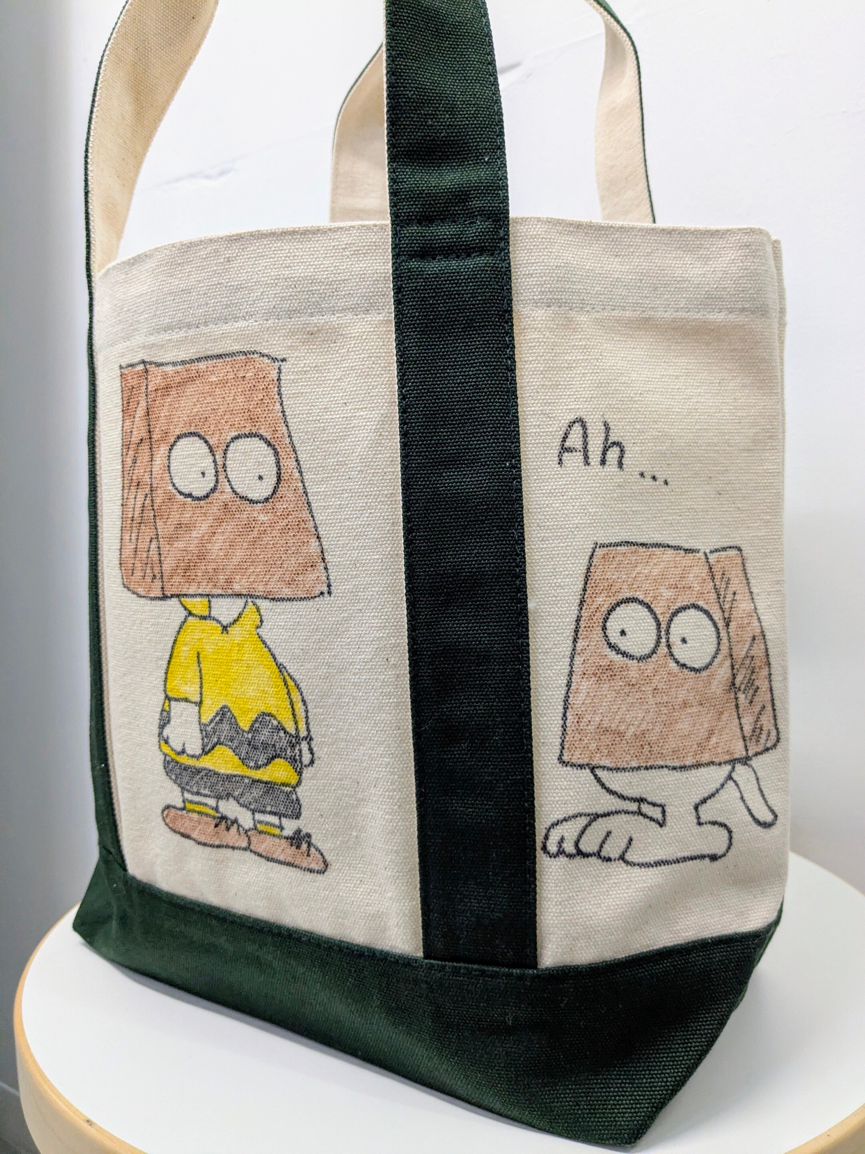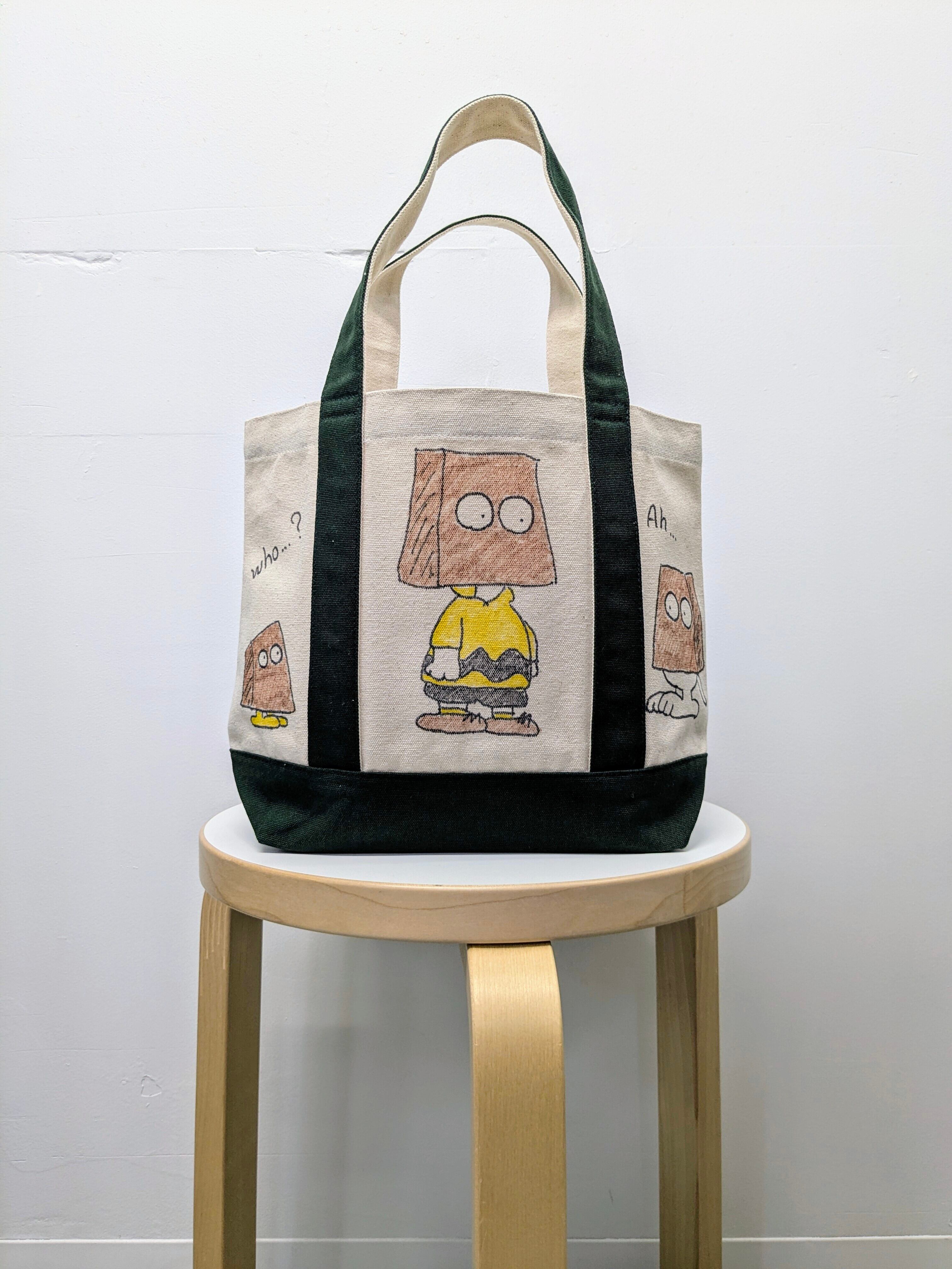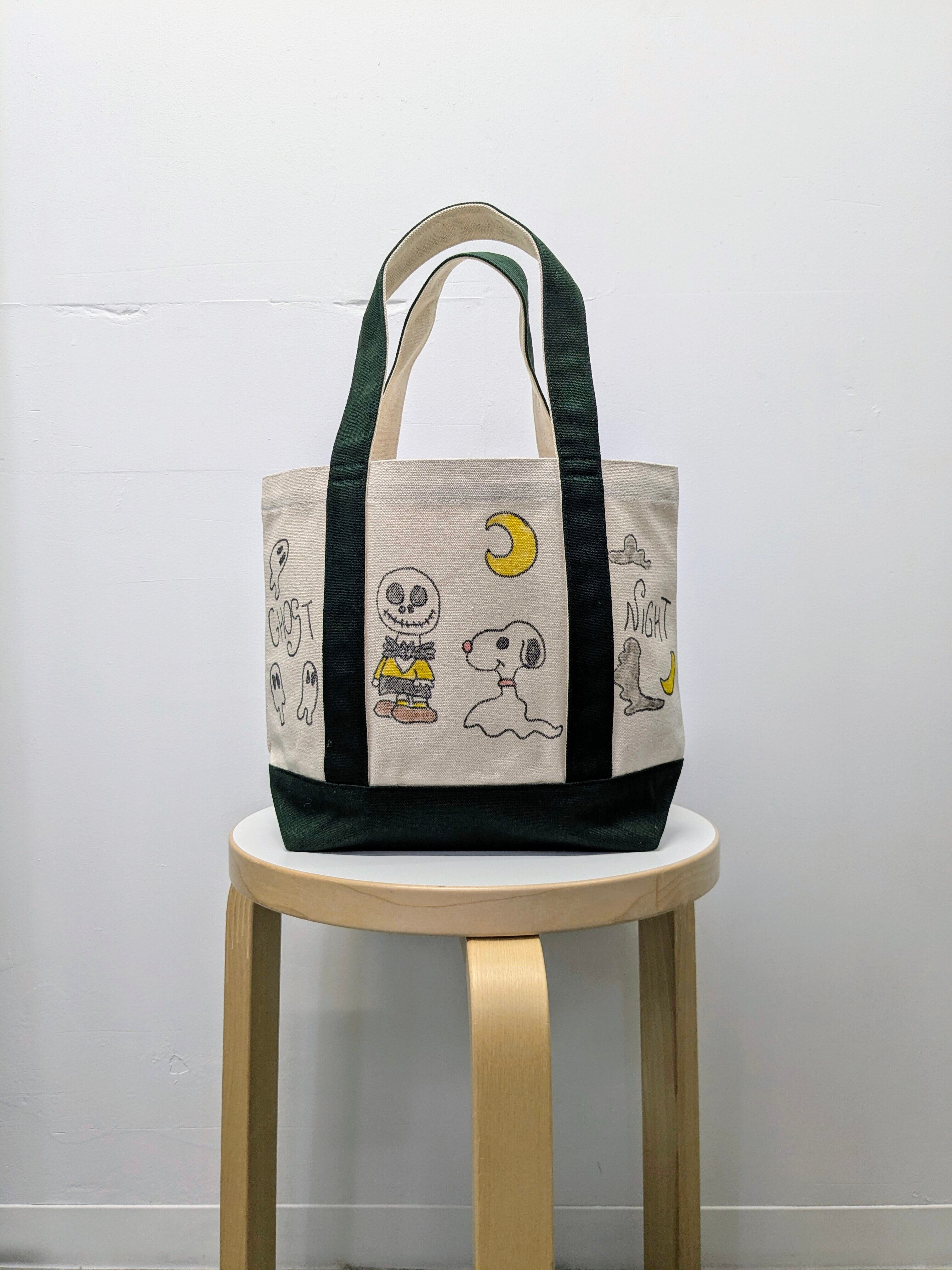 キャンバスのトートバッグにイラストを加えています。メモリアルの要素があり、どこか見たことあるキャラクターがいたりと、とにかく可愛いアイテム。全て手作業になるので、唯一無二の一点物となります。