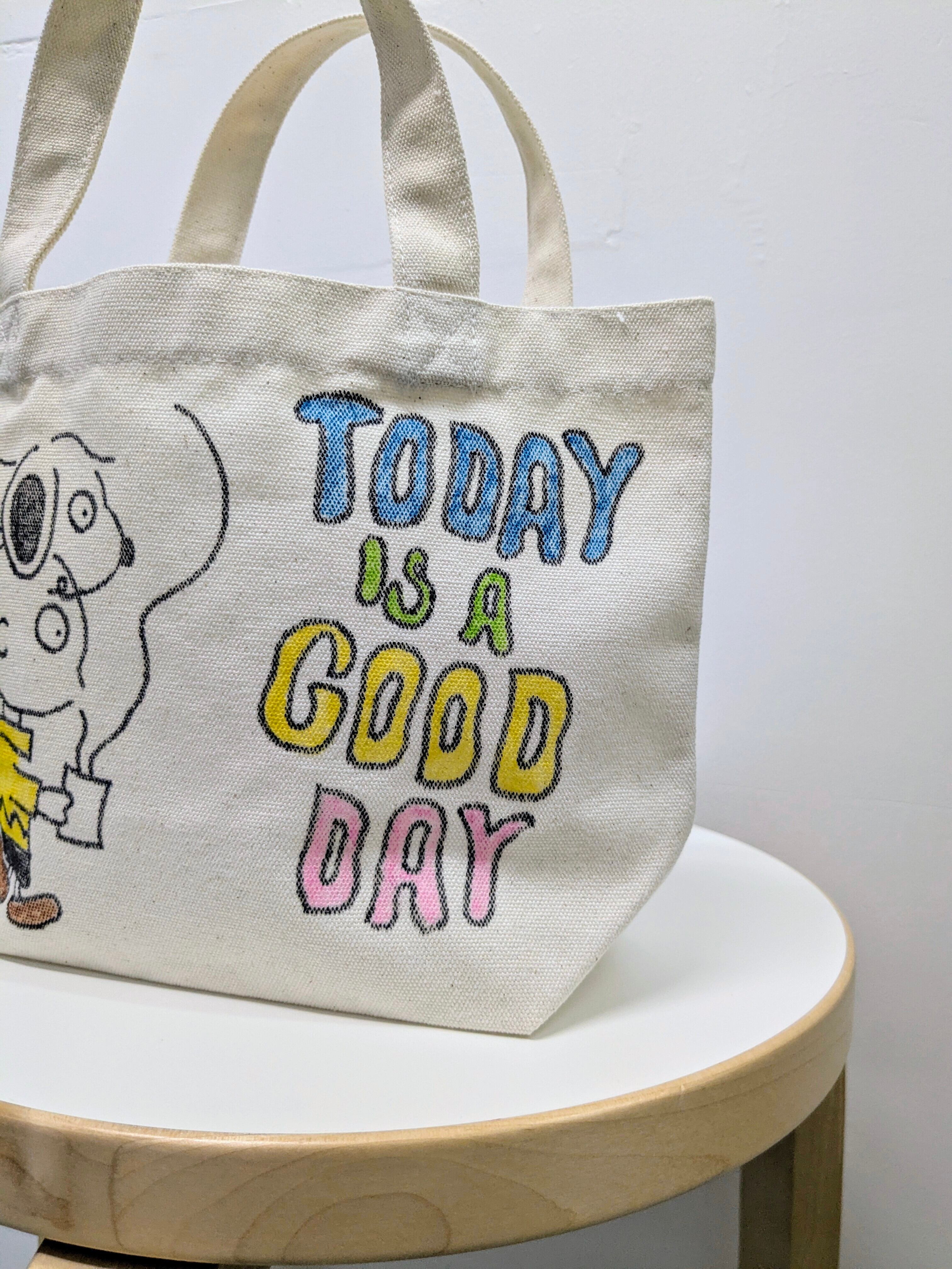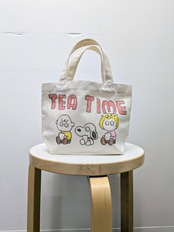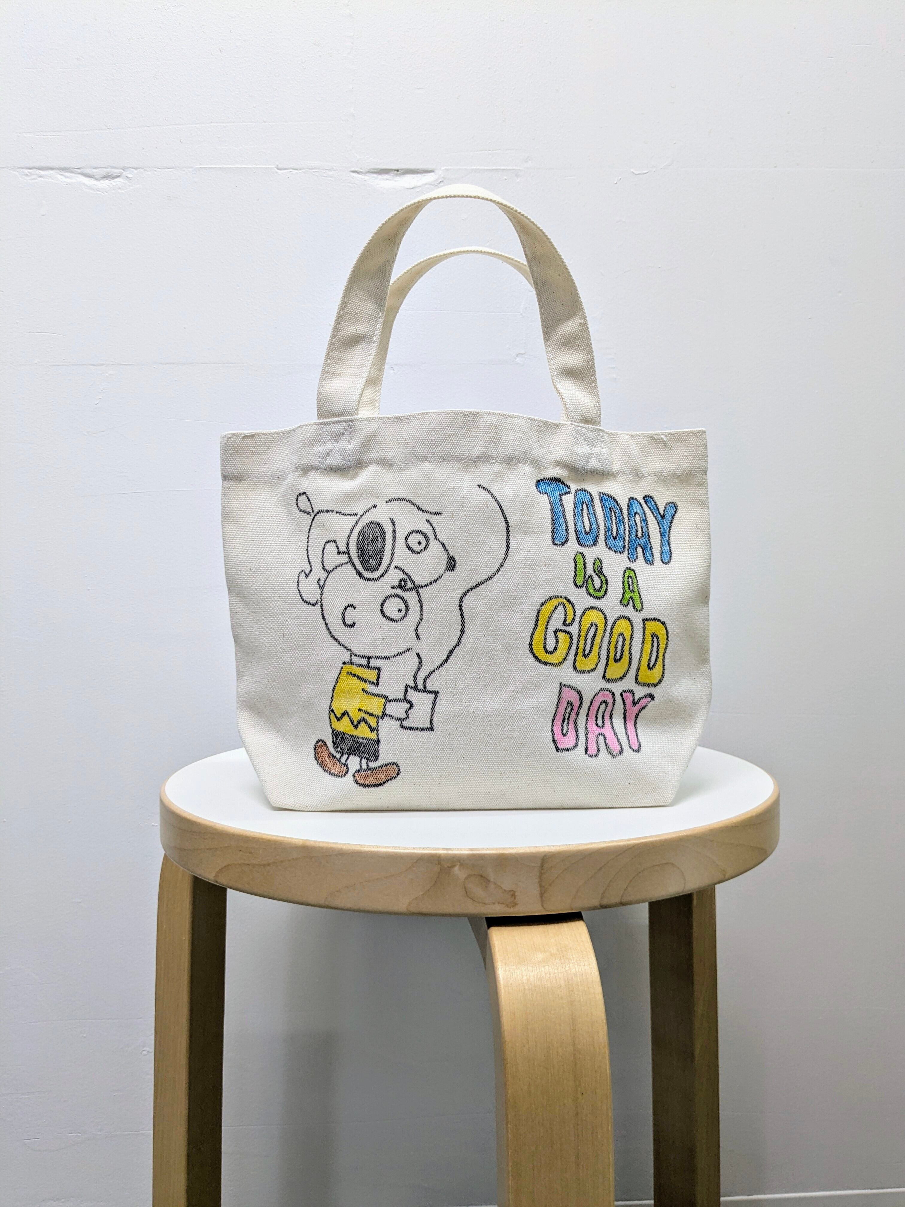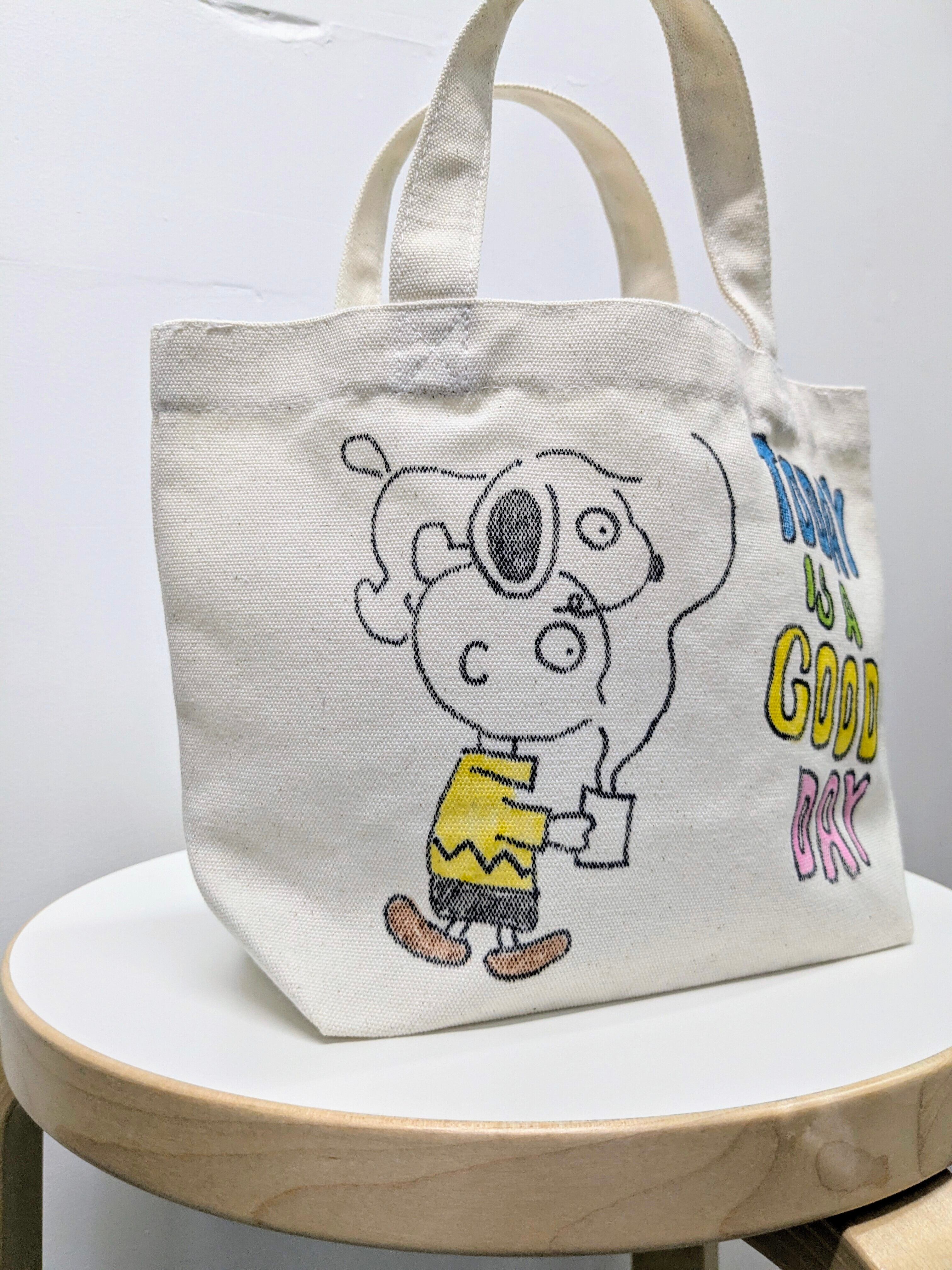 キャンバスのトートバッグにイラストを加えています。メモリアルの要素があり、どこか見たことあるキャラクターがいたりと、とにかく可愛いアイテム。全て手作業になるので、唯一無二の一点物となります。