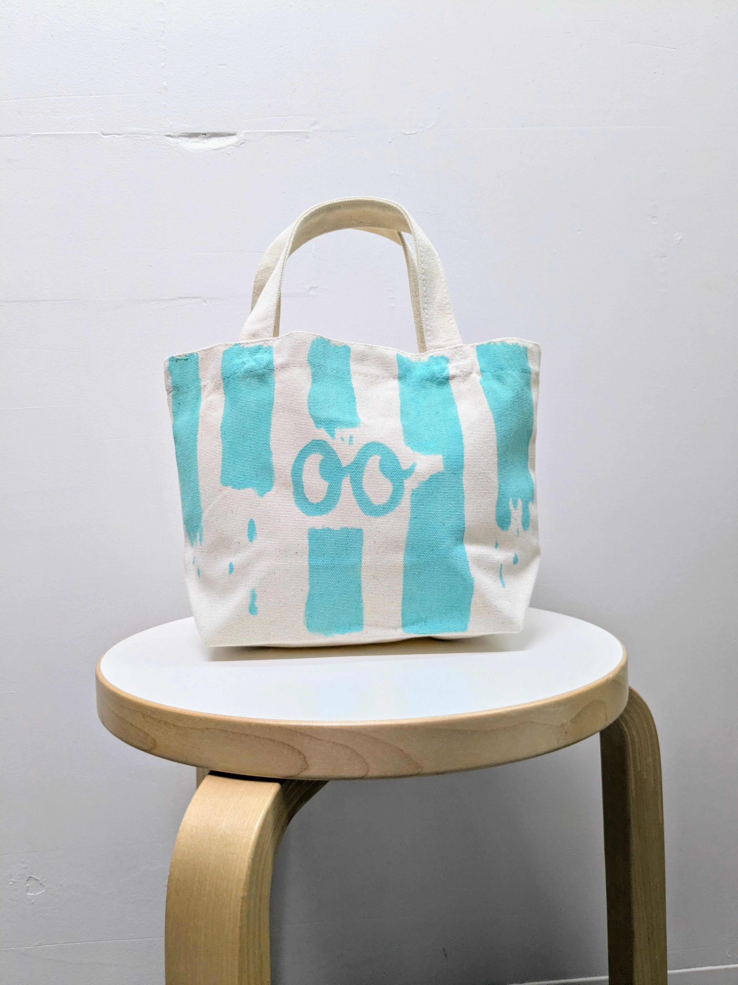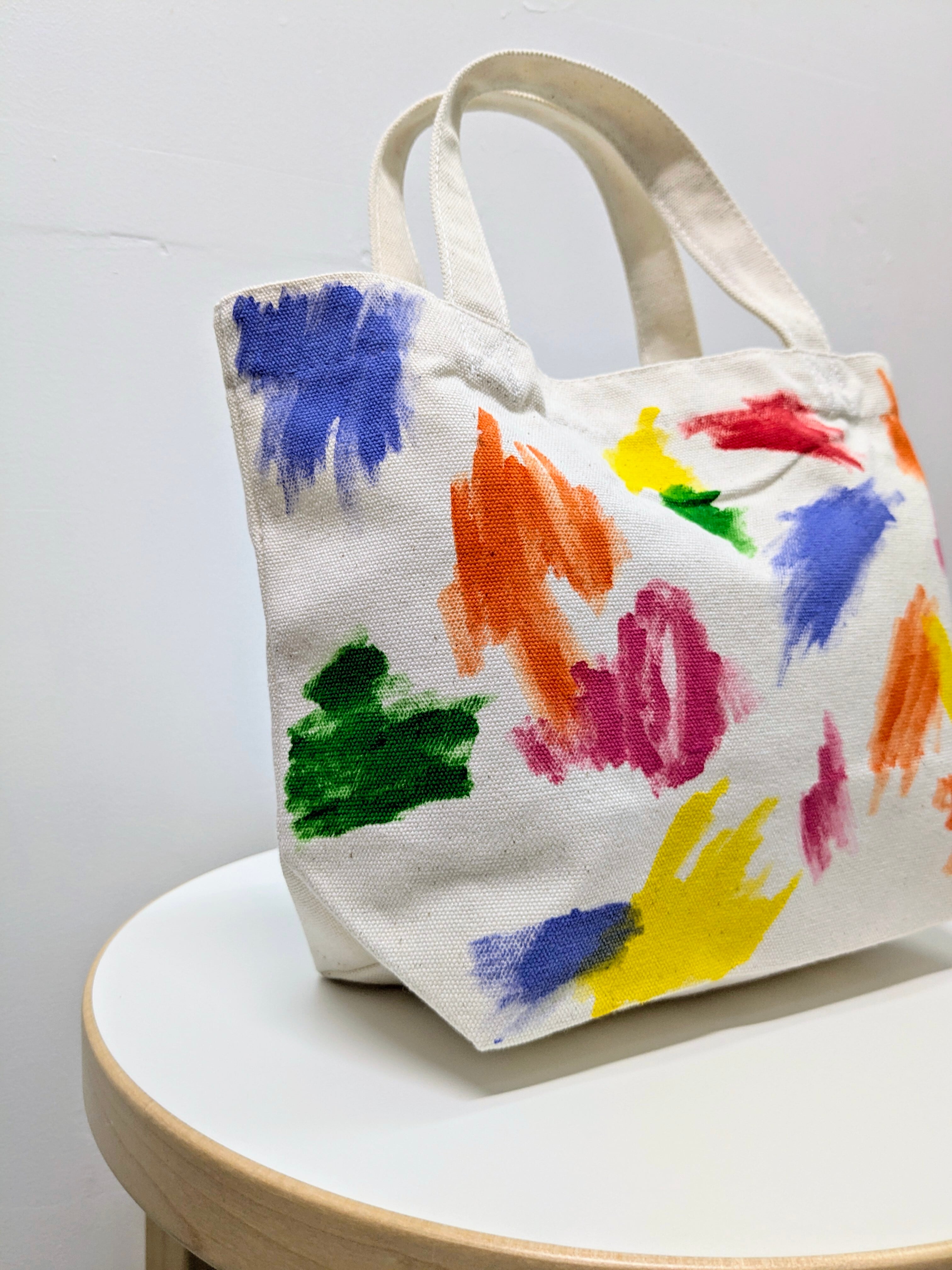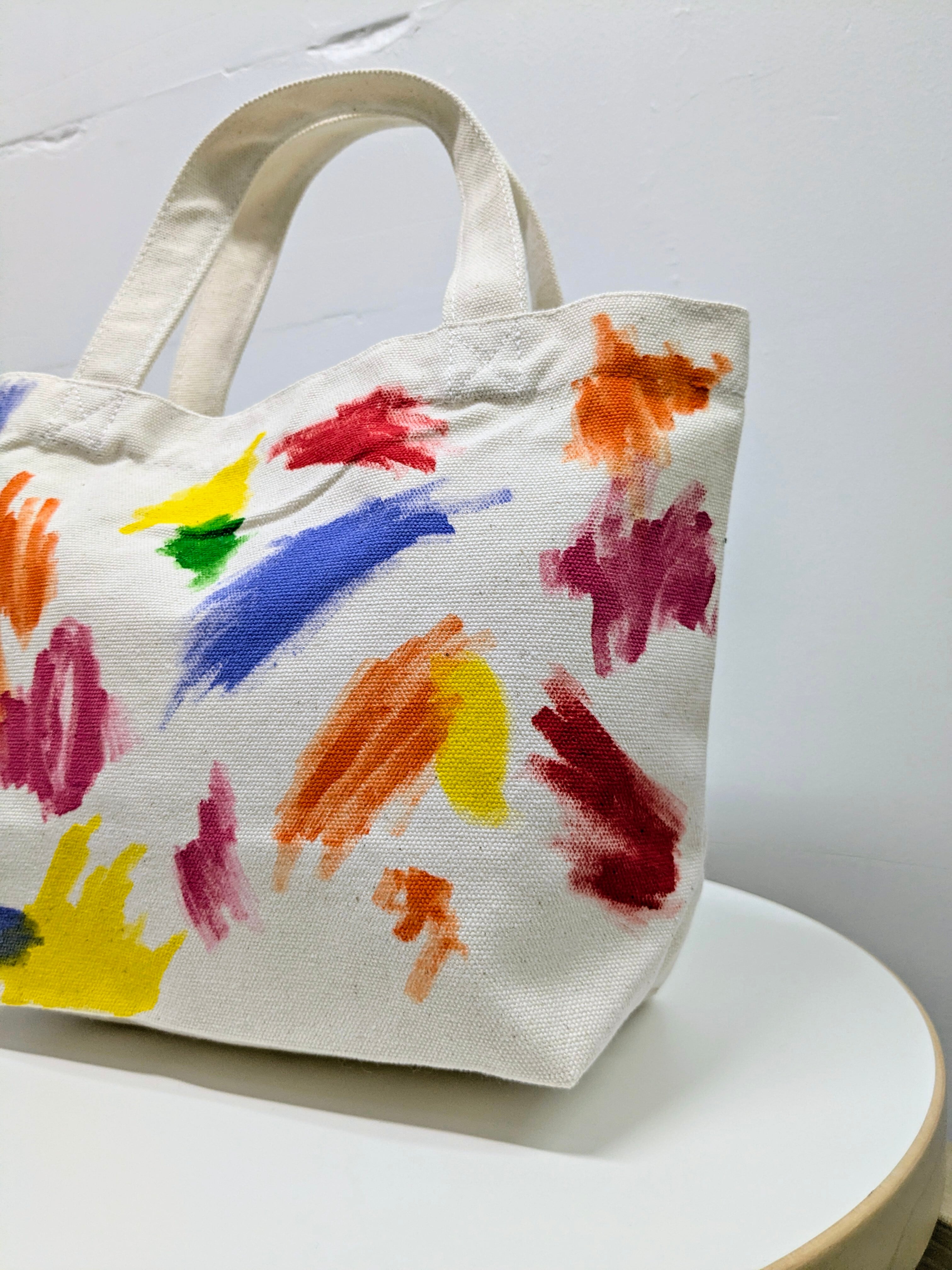キャンバスのトートバッグにイラストを加えています。適当なのか、計算された配置なのか、、、ただ色使い、雰囲気がとにかく可愛いアイテム。全て手作業になるので、唯一無二の一点物となります。