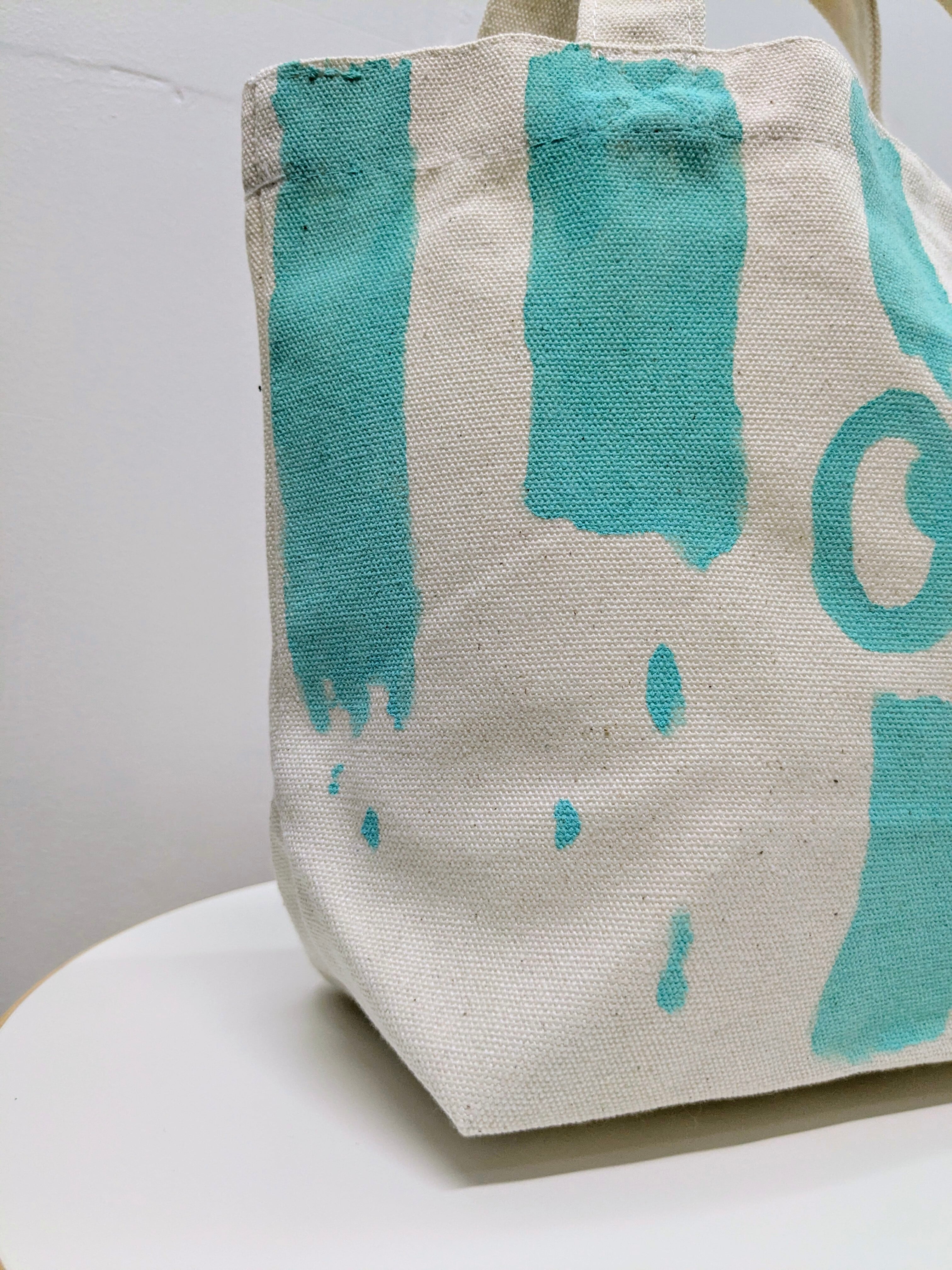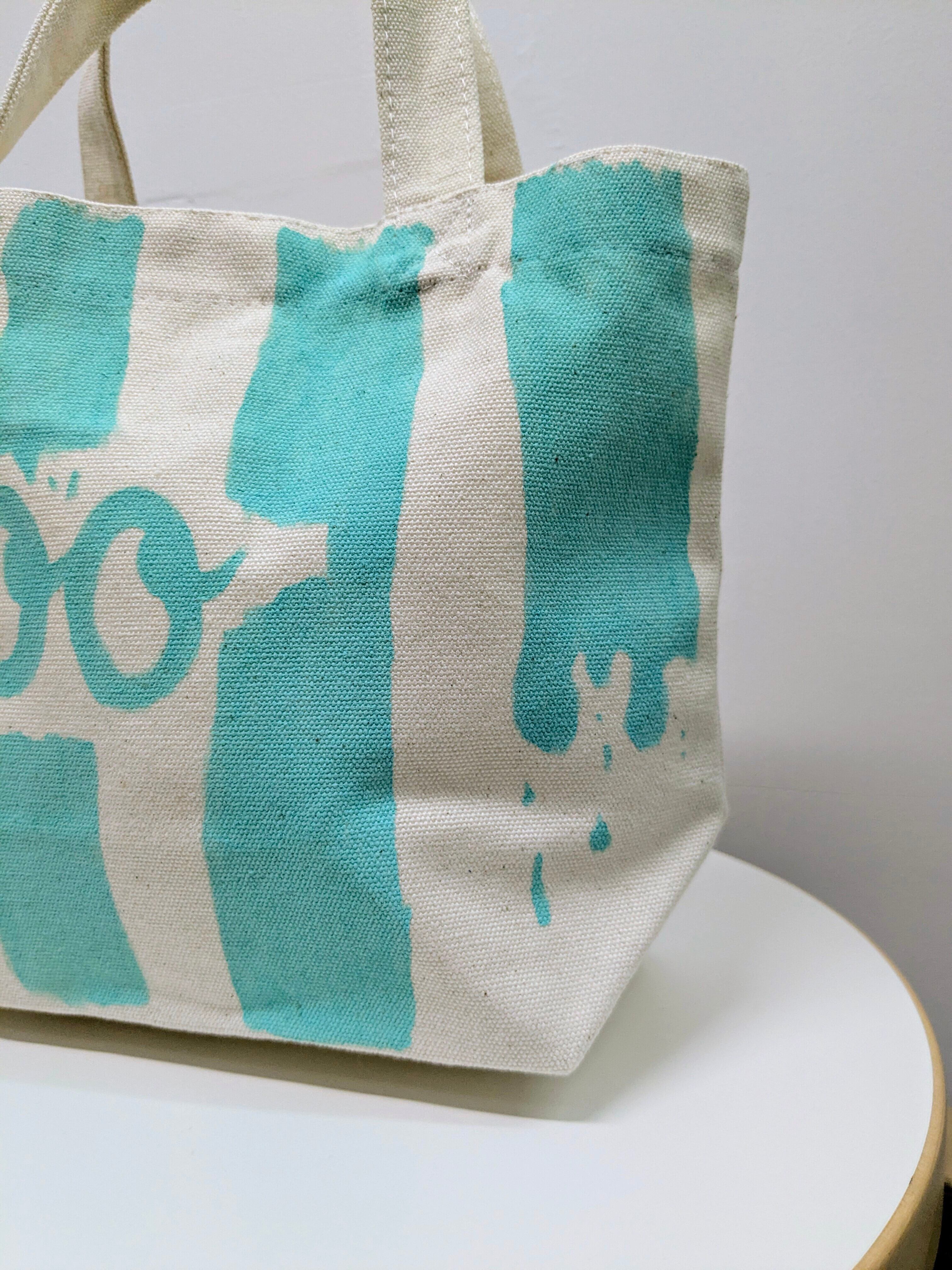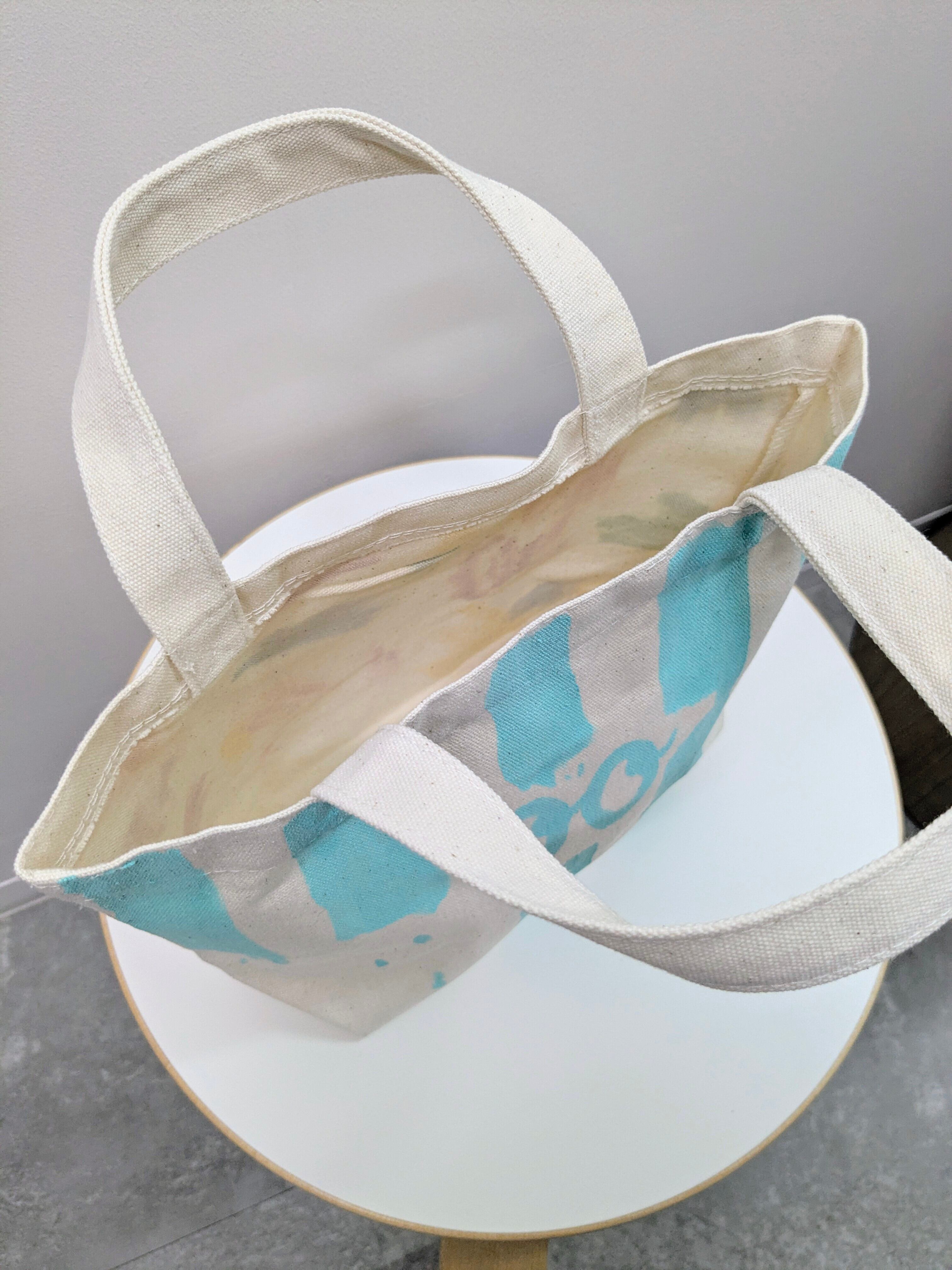 キャンバスのトートバッグにイラストを加えています。適当なのか、計算された配置なのか、、、ただ色使い、雰囲気がとにかく可愛いアイテム。全て手作業になるので、唯一無二の一点物となります。
