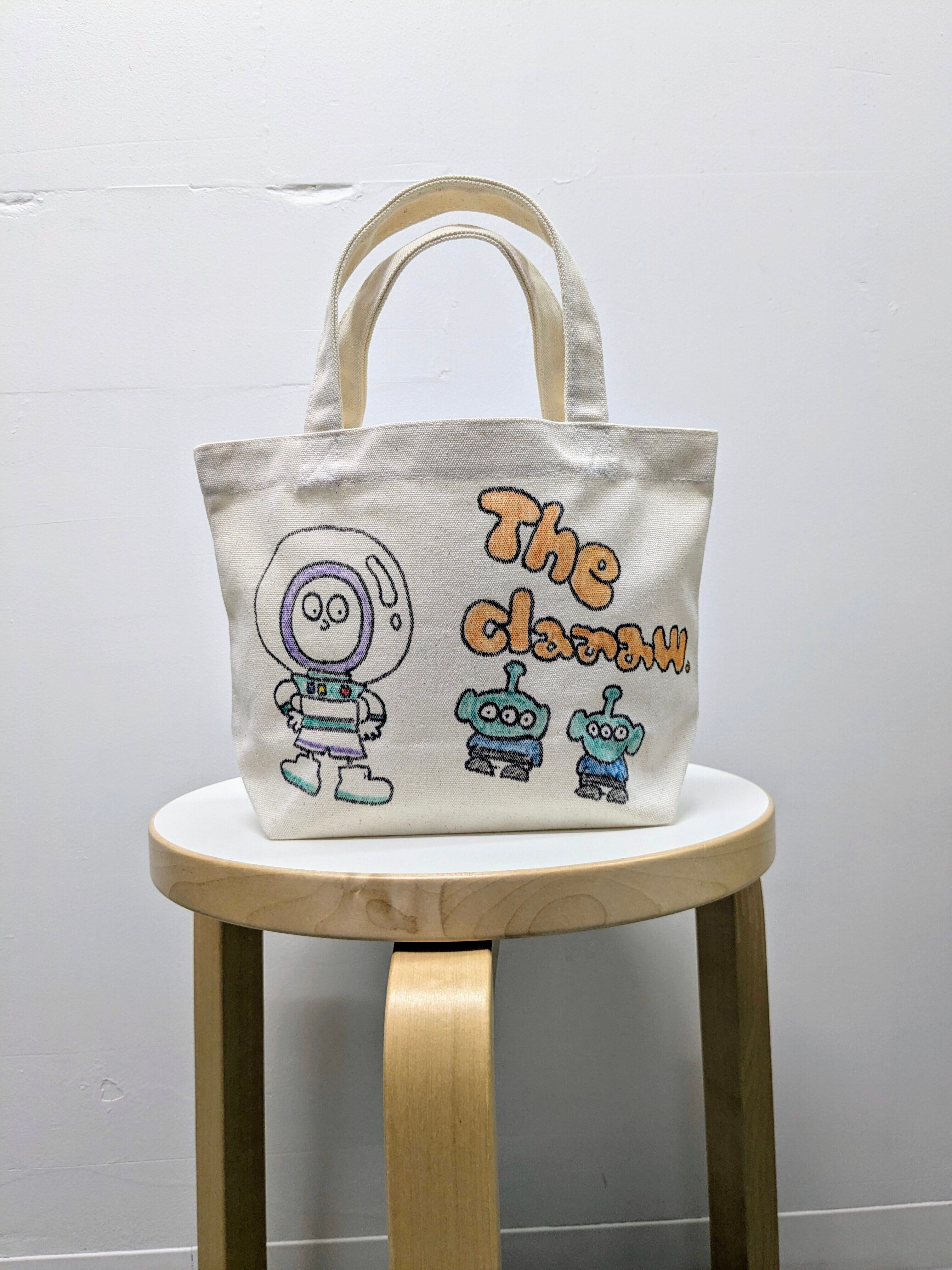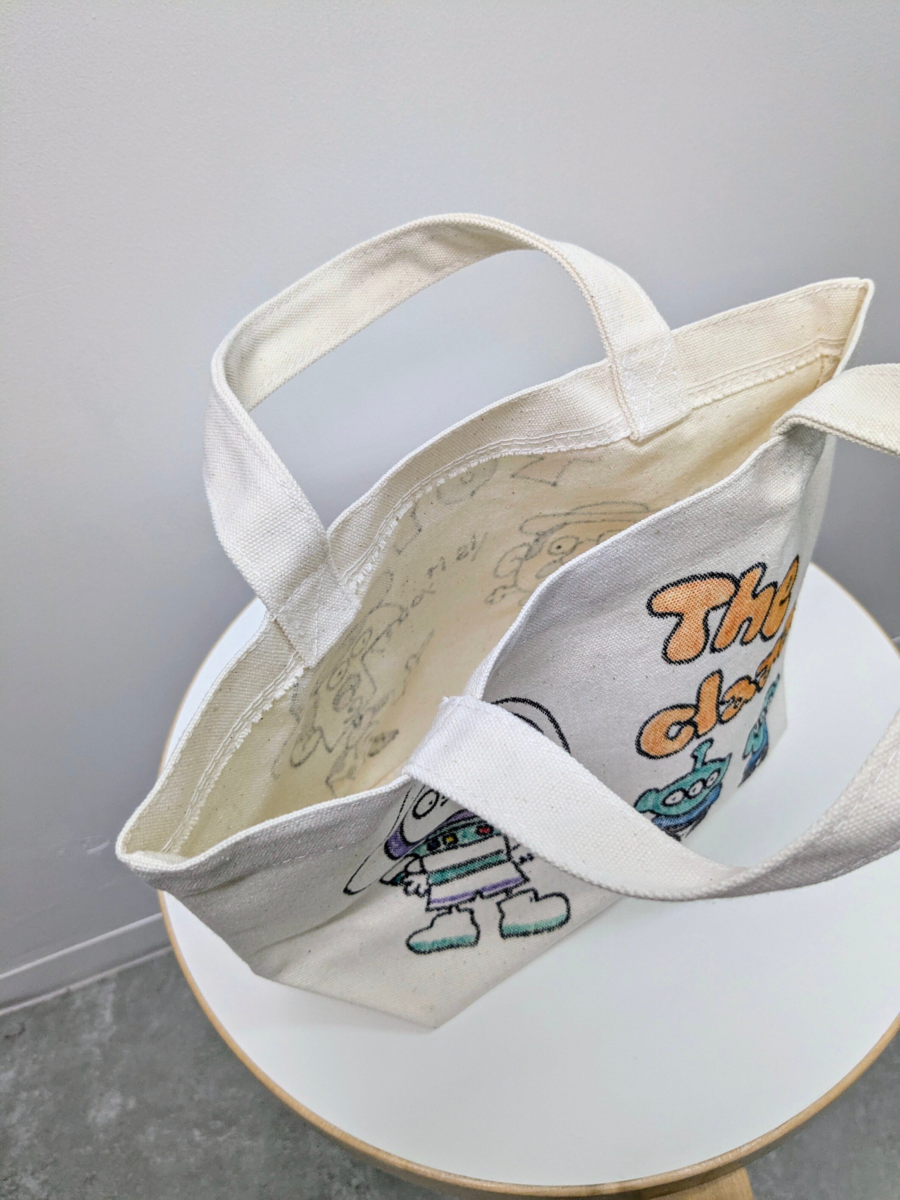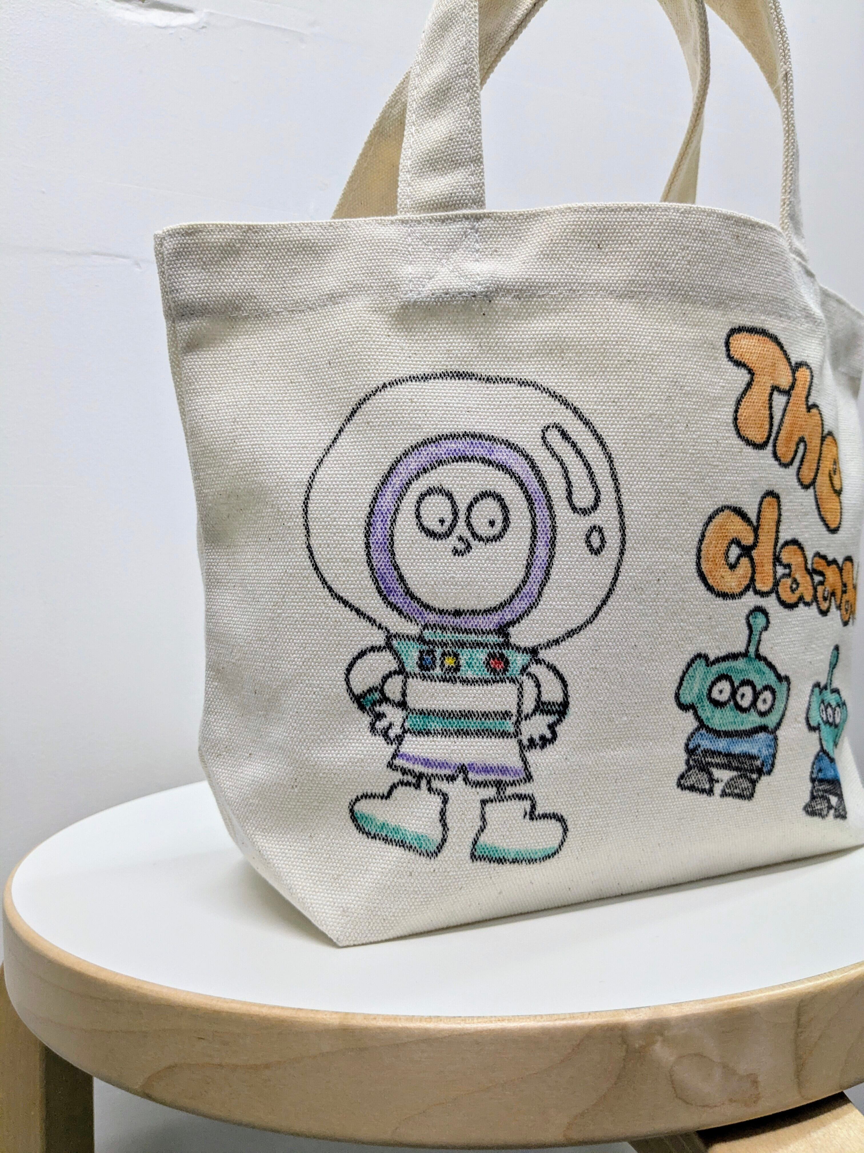 キャンバスのトートバッグにイラストを加えています。メモリアルの要素があり、どこか見たことあるキャラクターがいたりと、とにかく可愛いアイテム。全て手作業になるので、唯一無二の一点物となります。