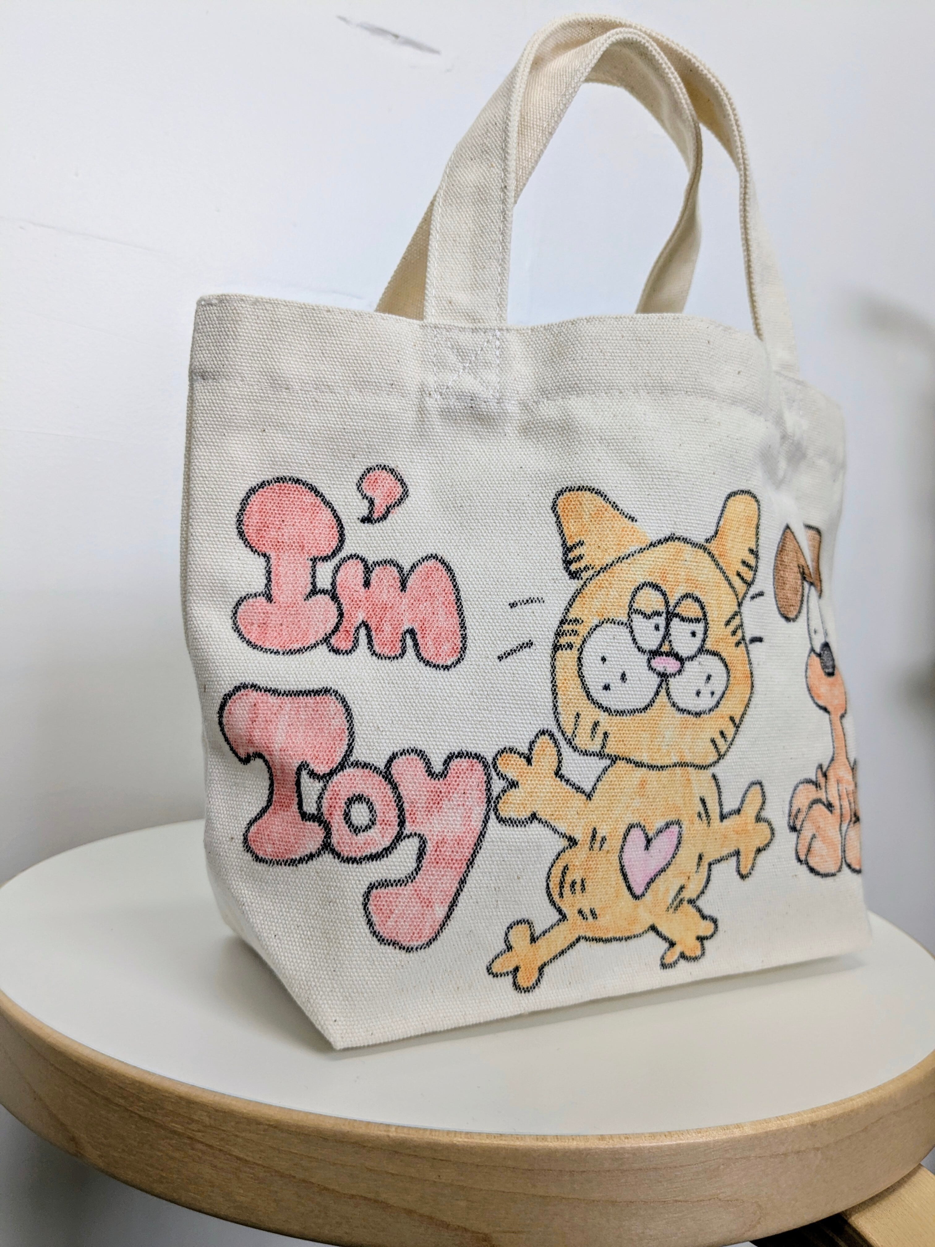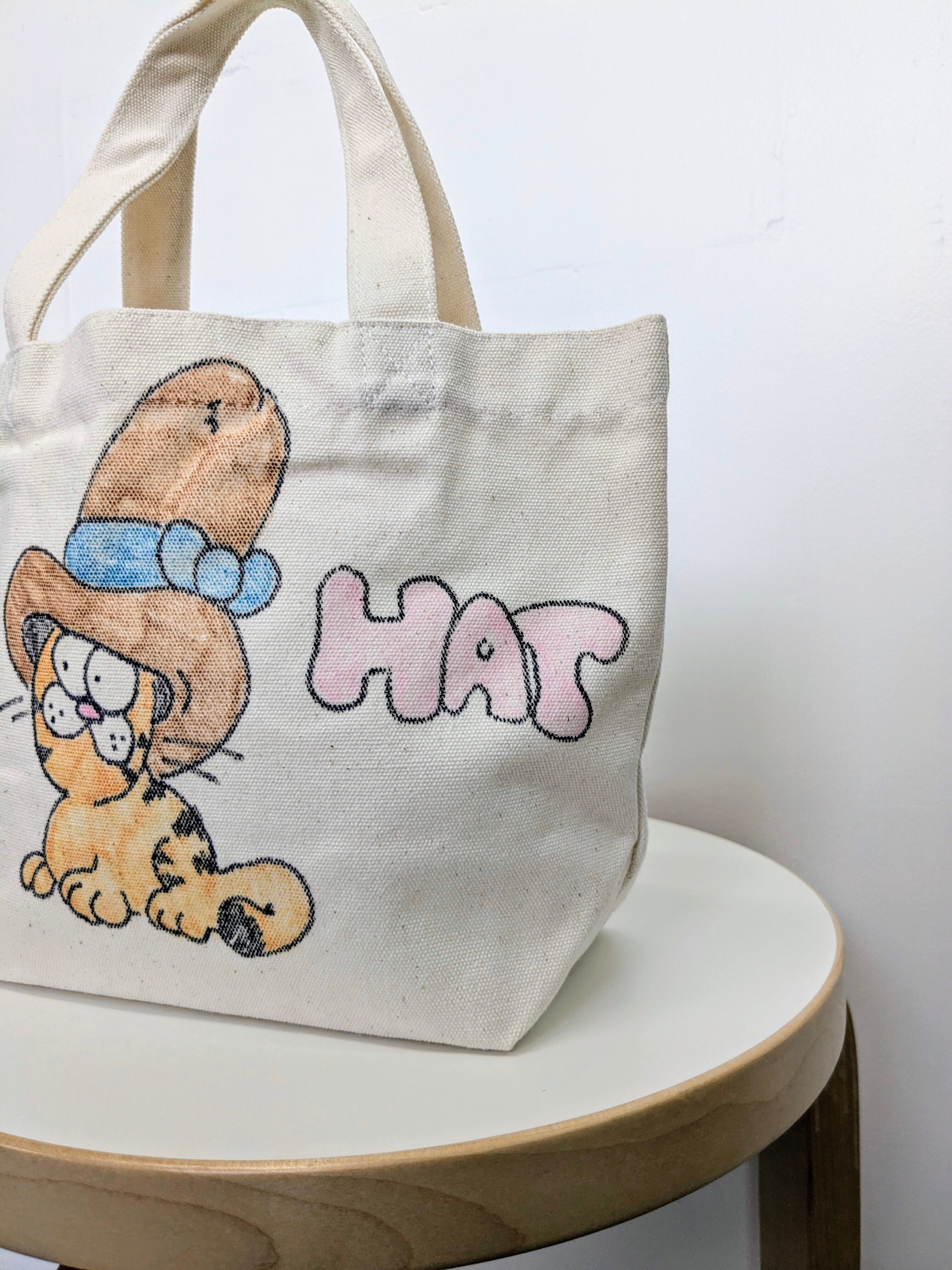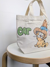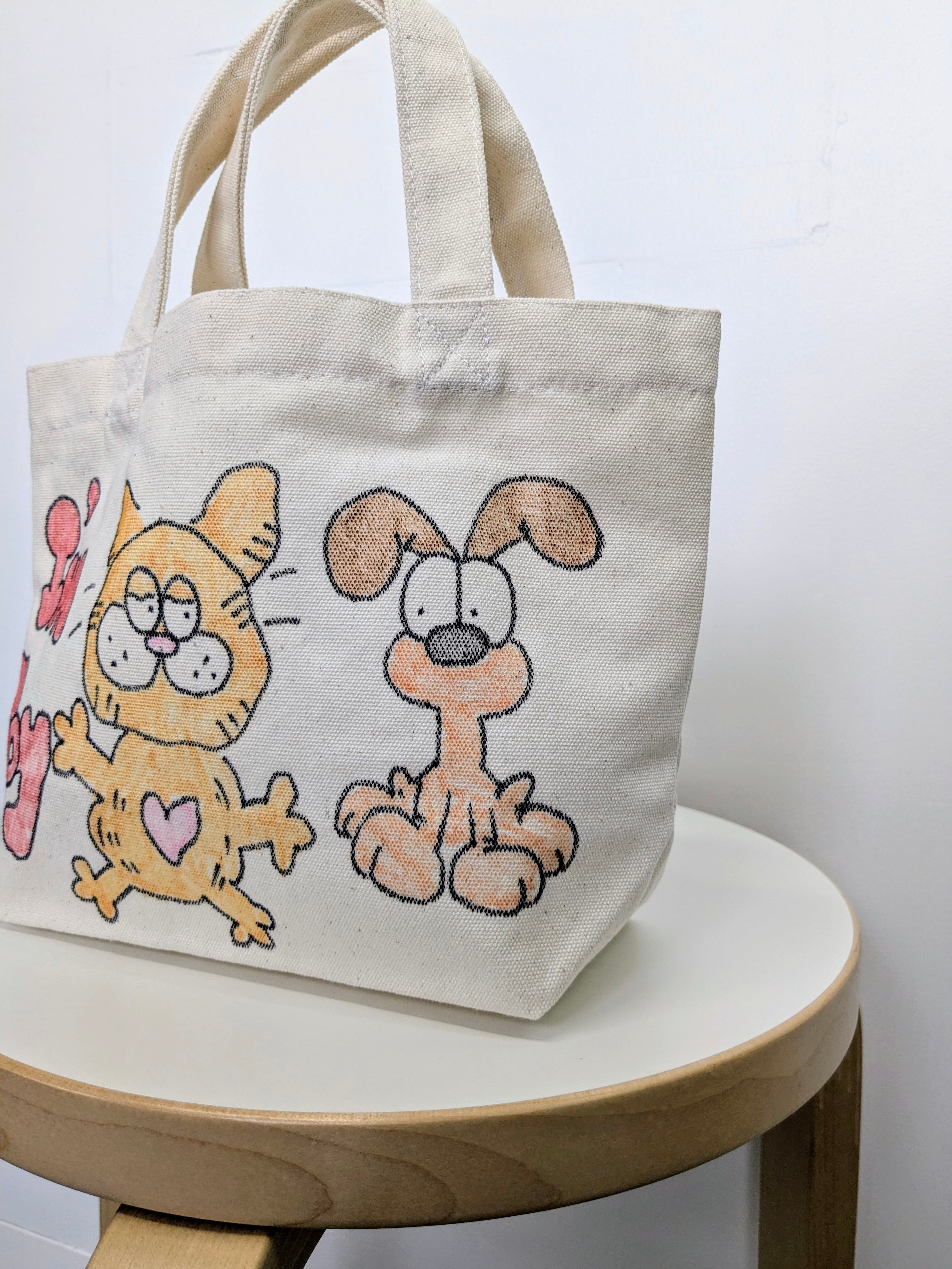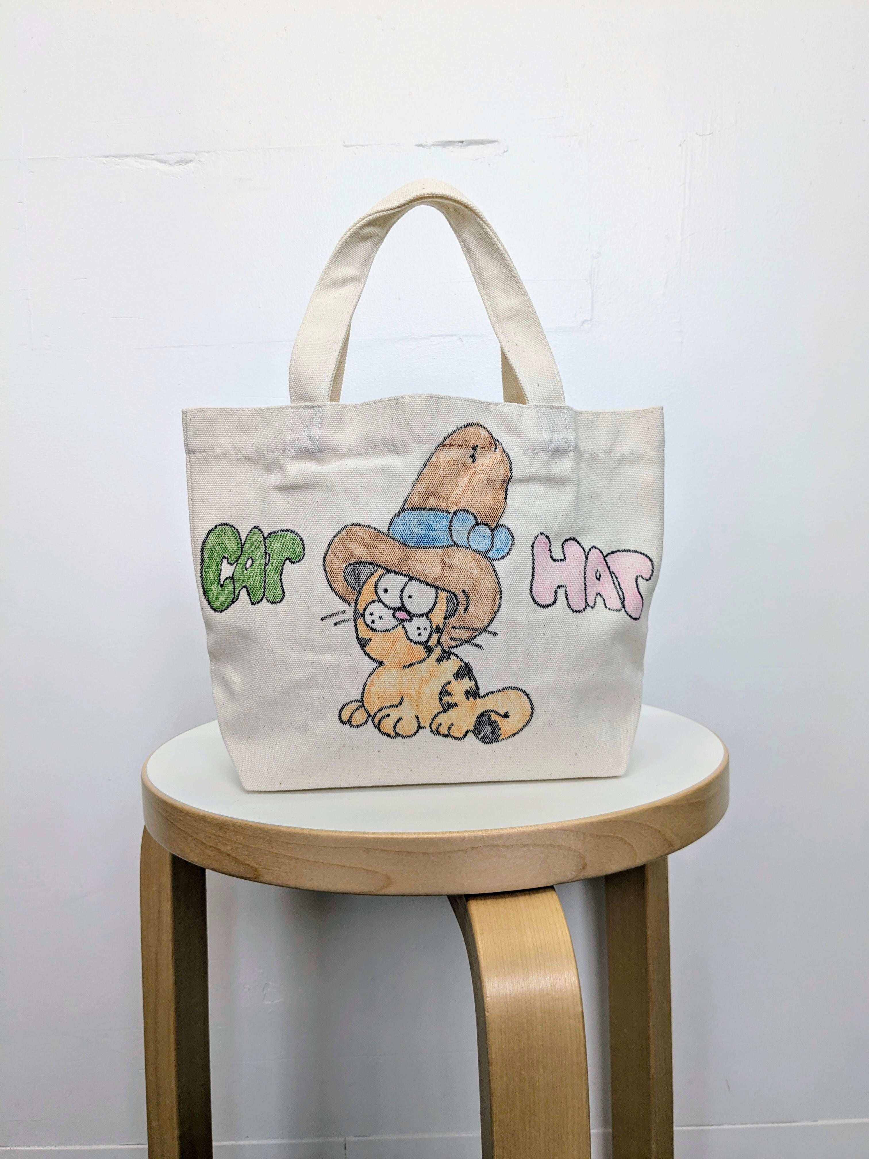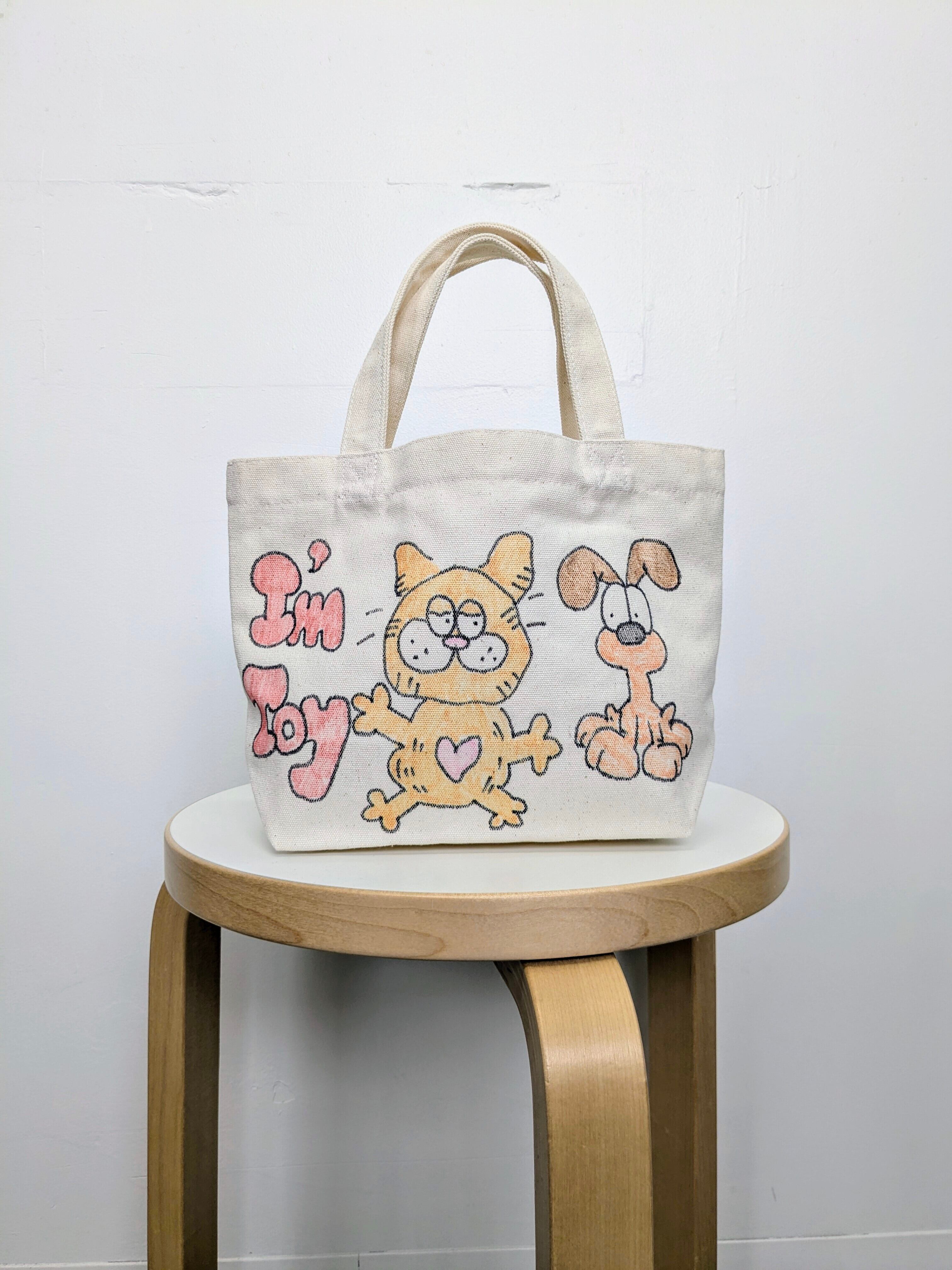 キャンバスのトートバッグにイラストを加えています。メモリアルの要素があり、どこか見たことあるキャラクターがいたりと、とにかく可愛いアイテム。全て手作業になるので、唯一無二の一点物となります。