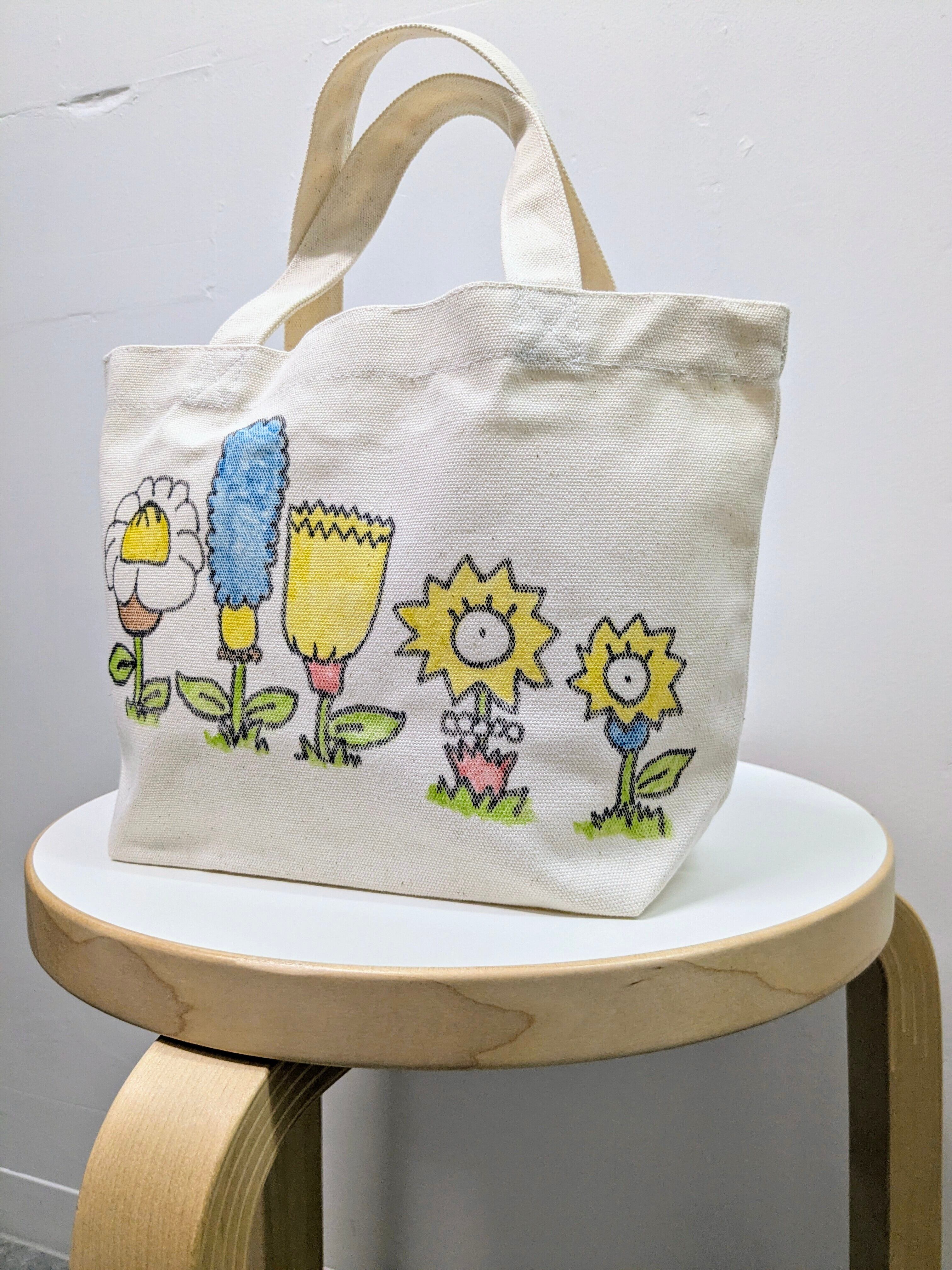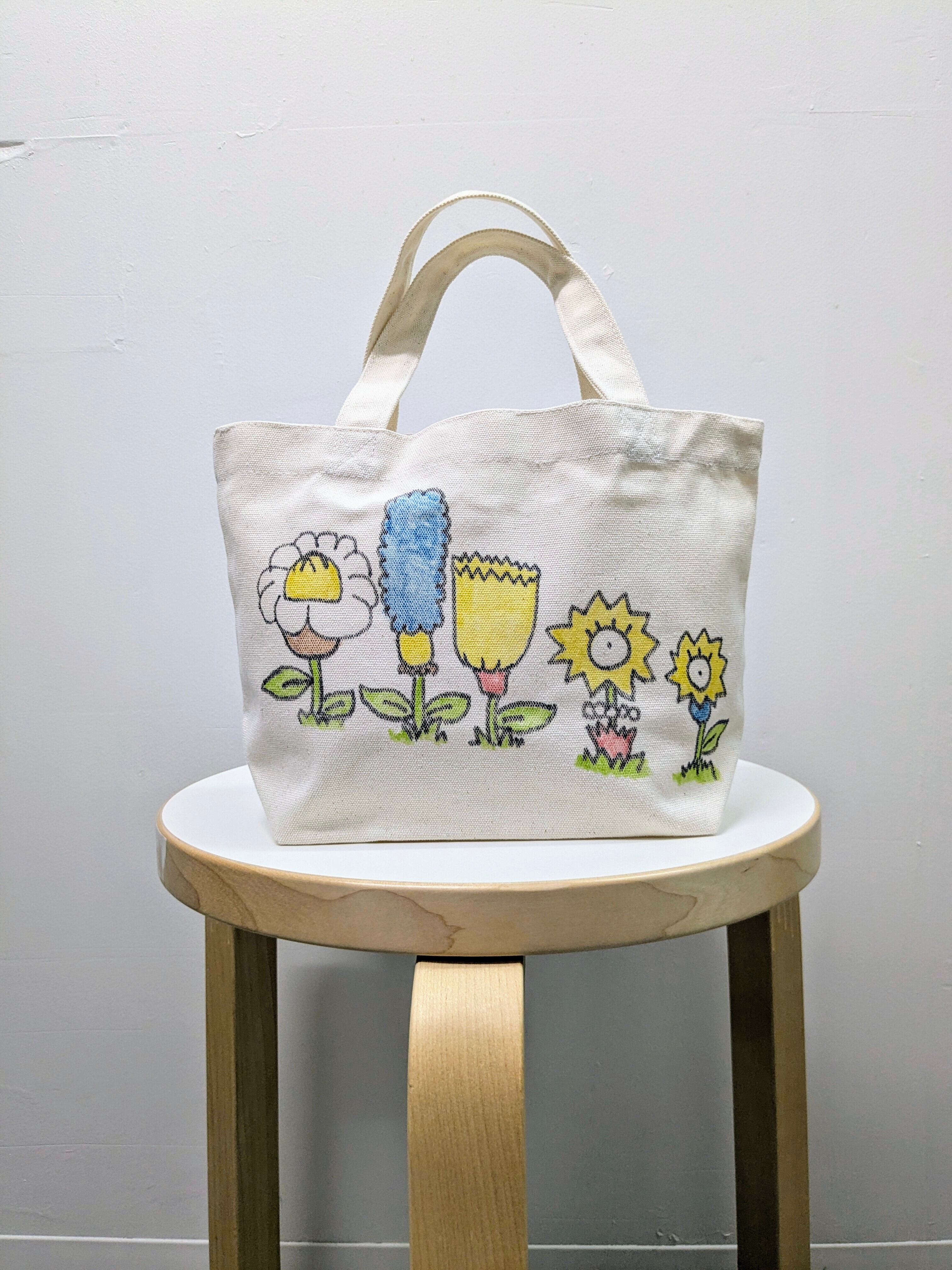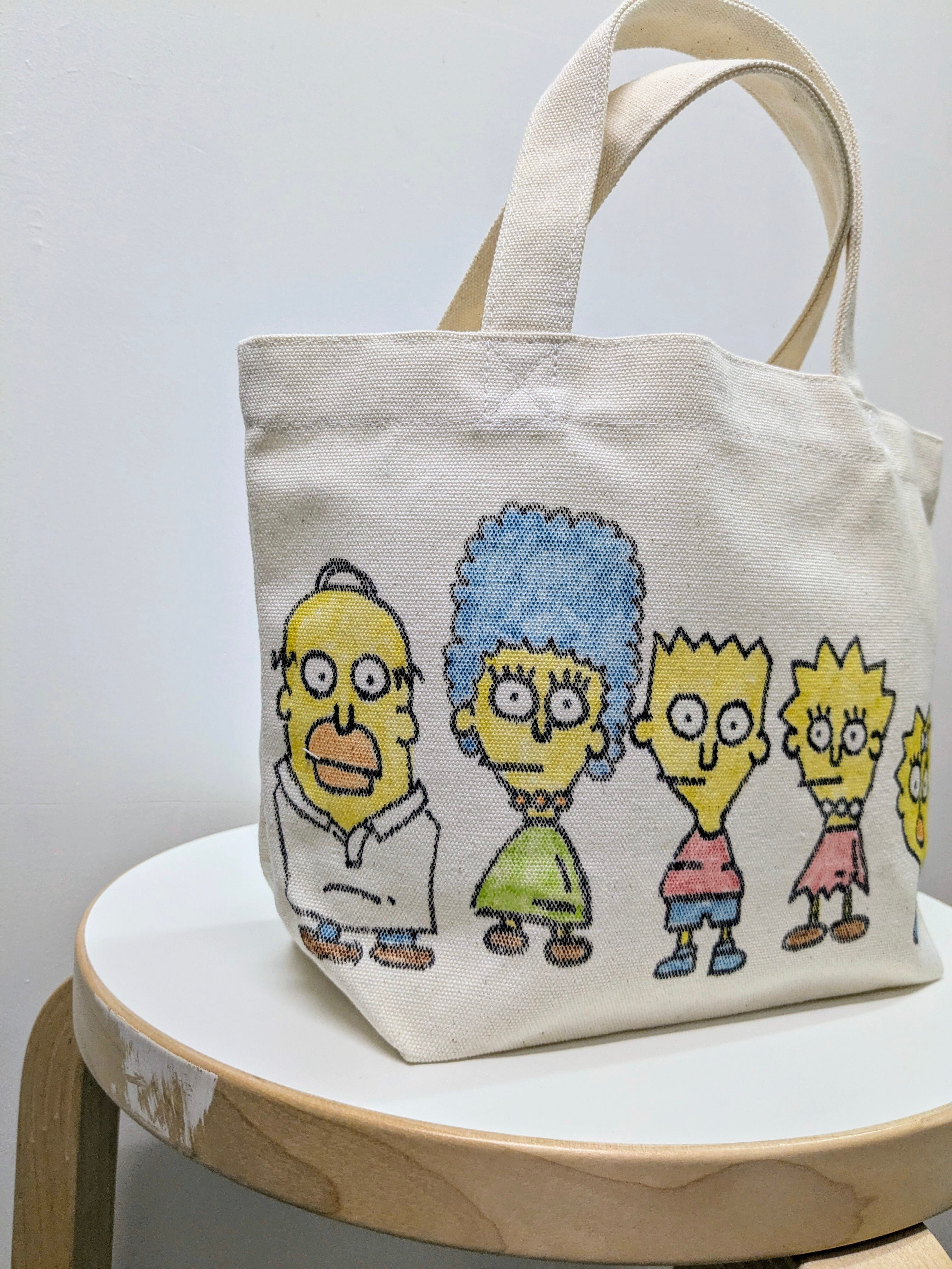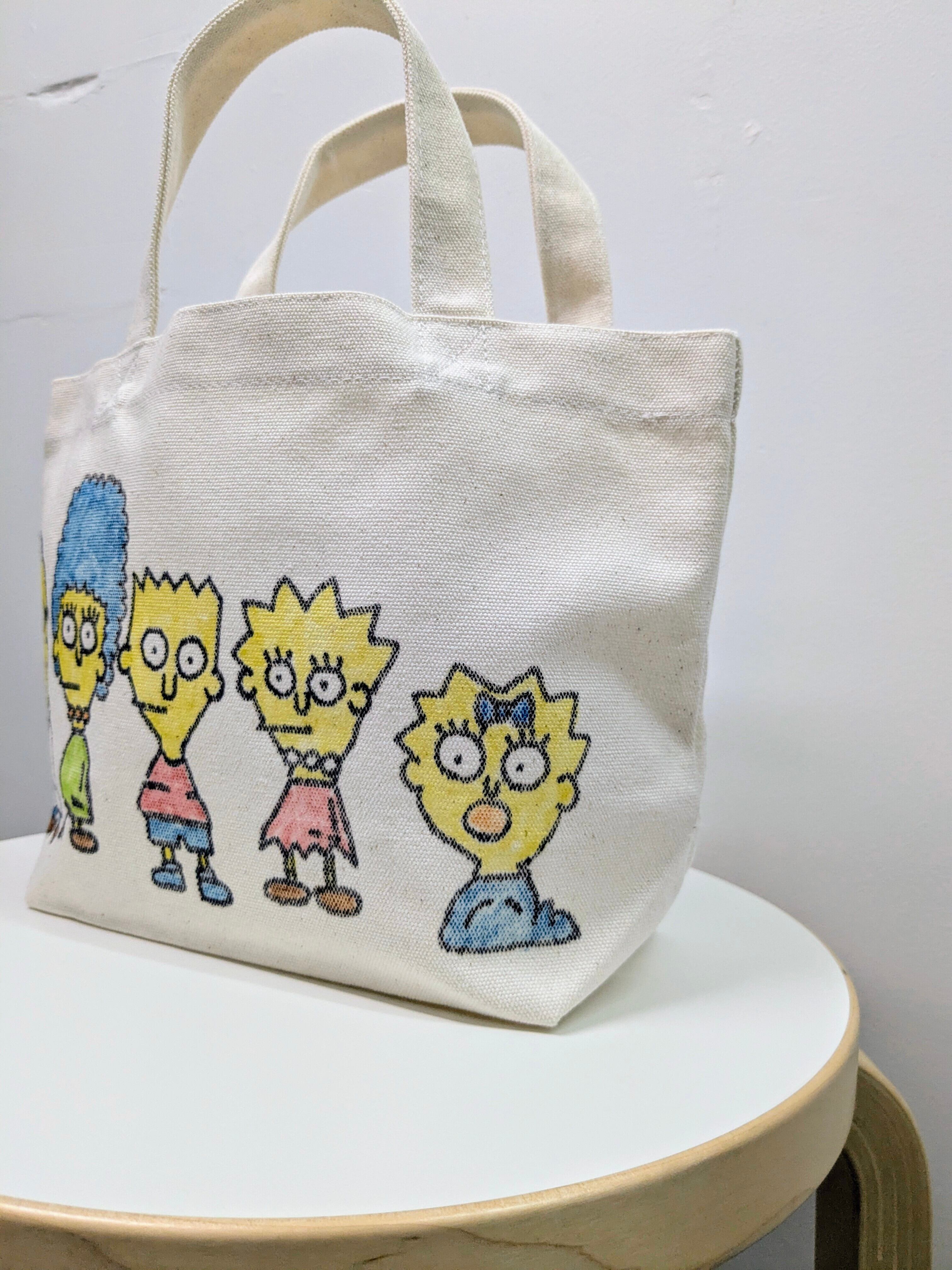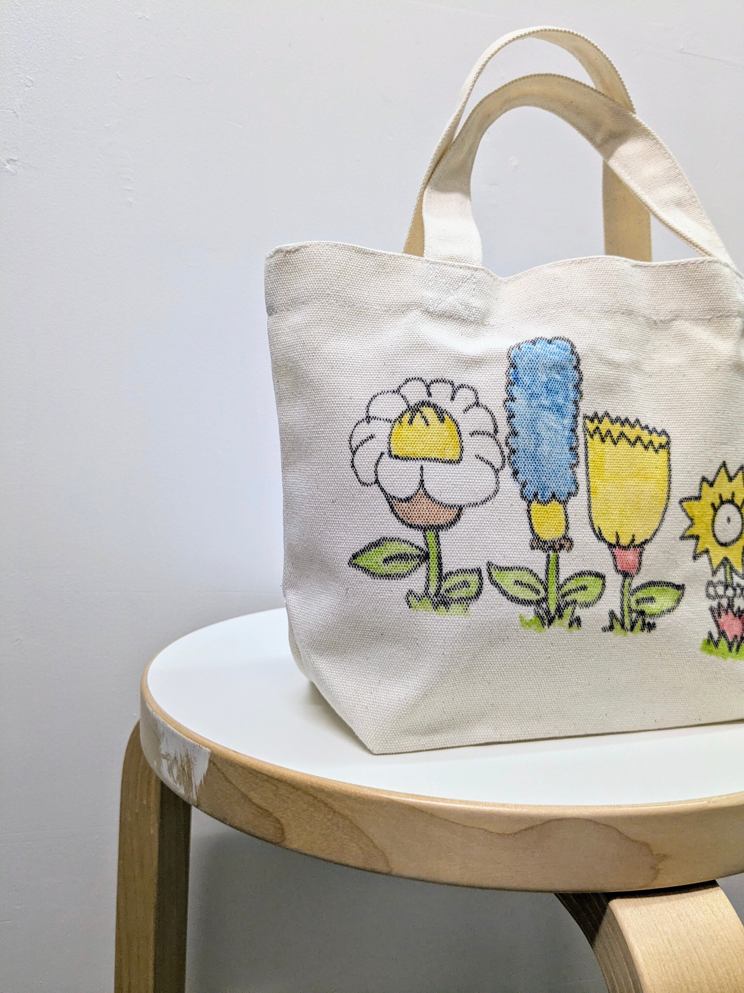 キャンバスのトートバッグにイラストを加えています。メモリアルの要素があり、どこか見たことあるキャラクターがいたりと、とにかく可愛いアイテム。全て手作業になるので、唯一無二の一点物となります。