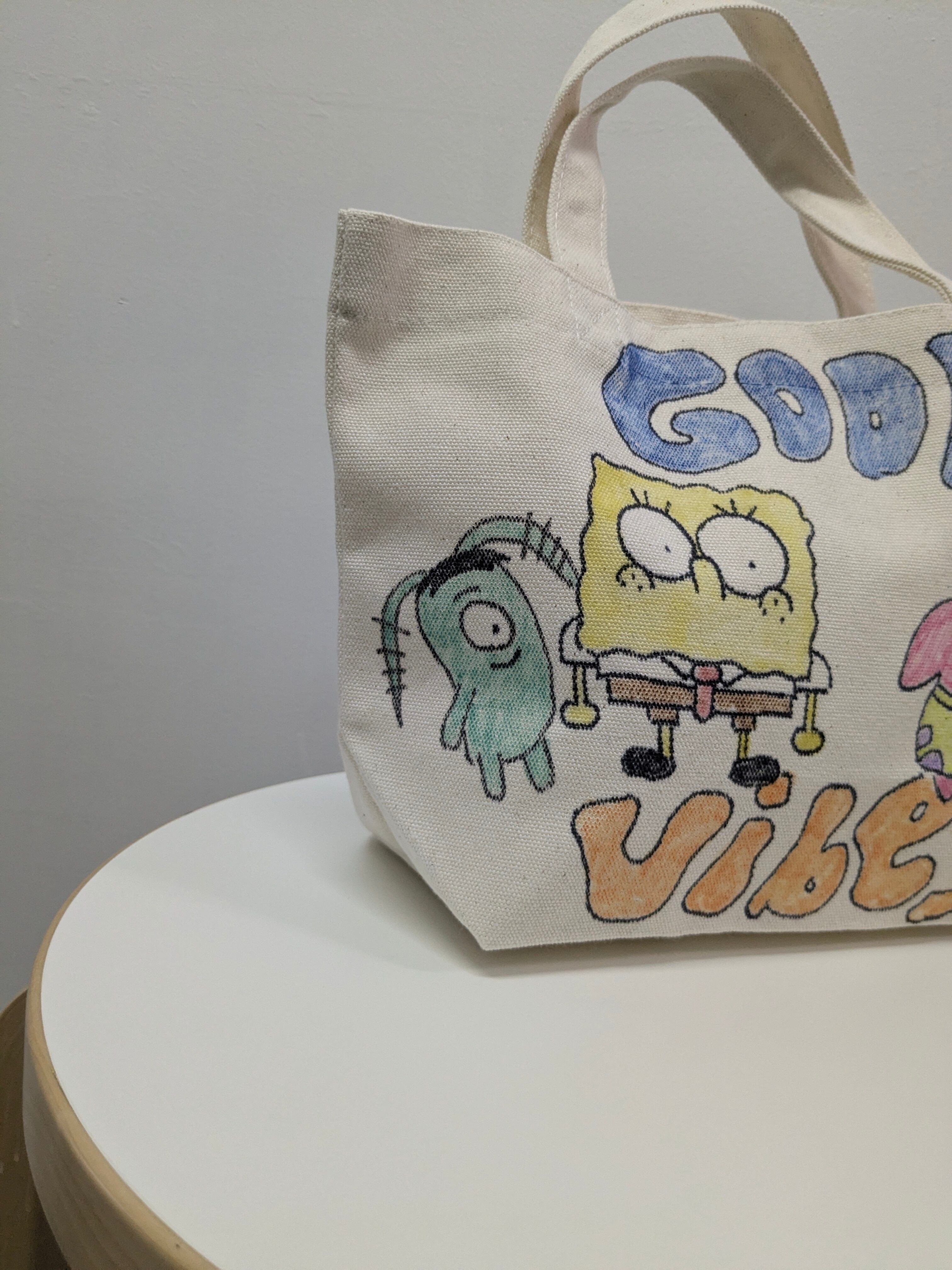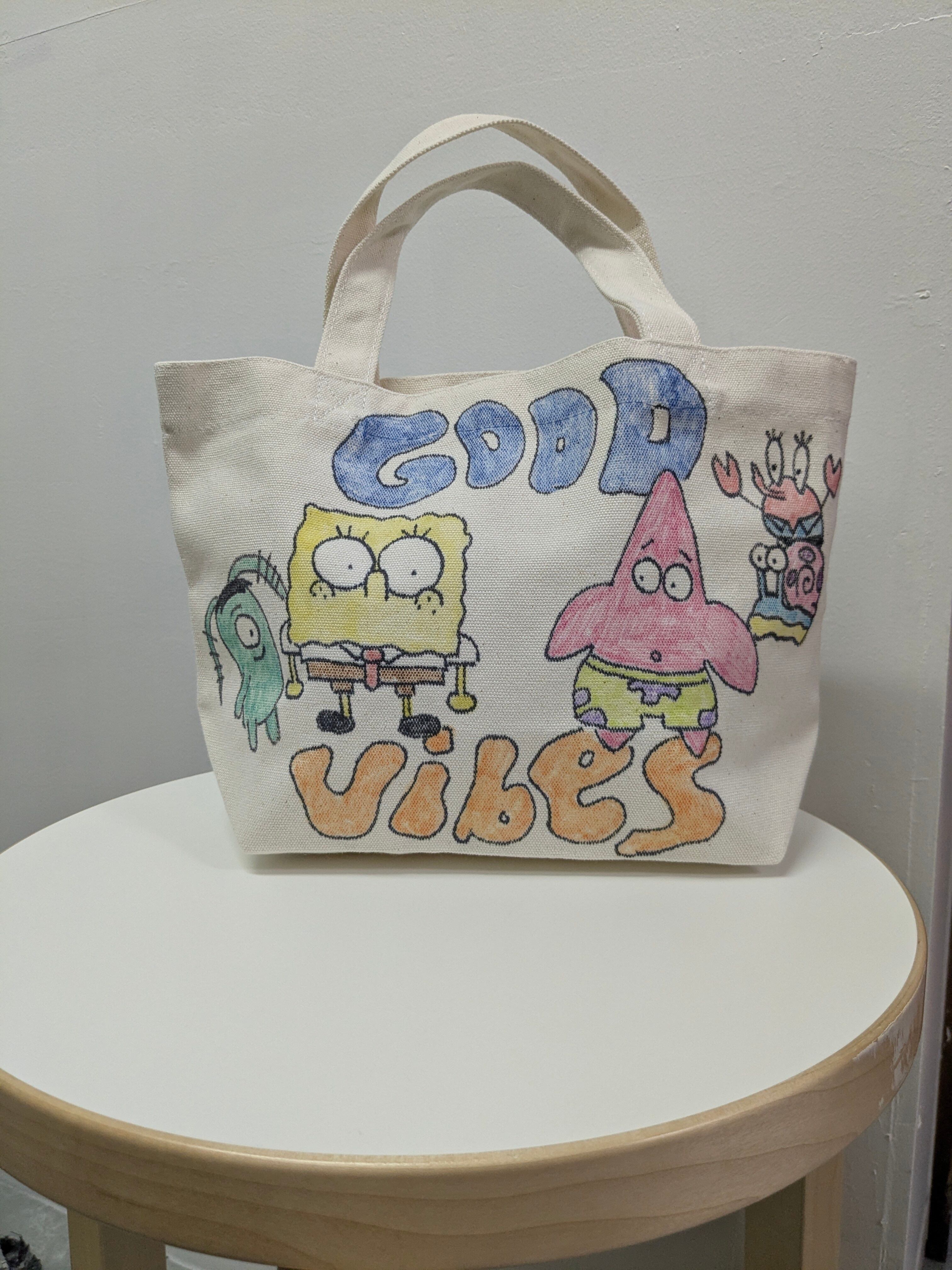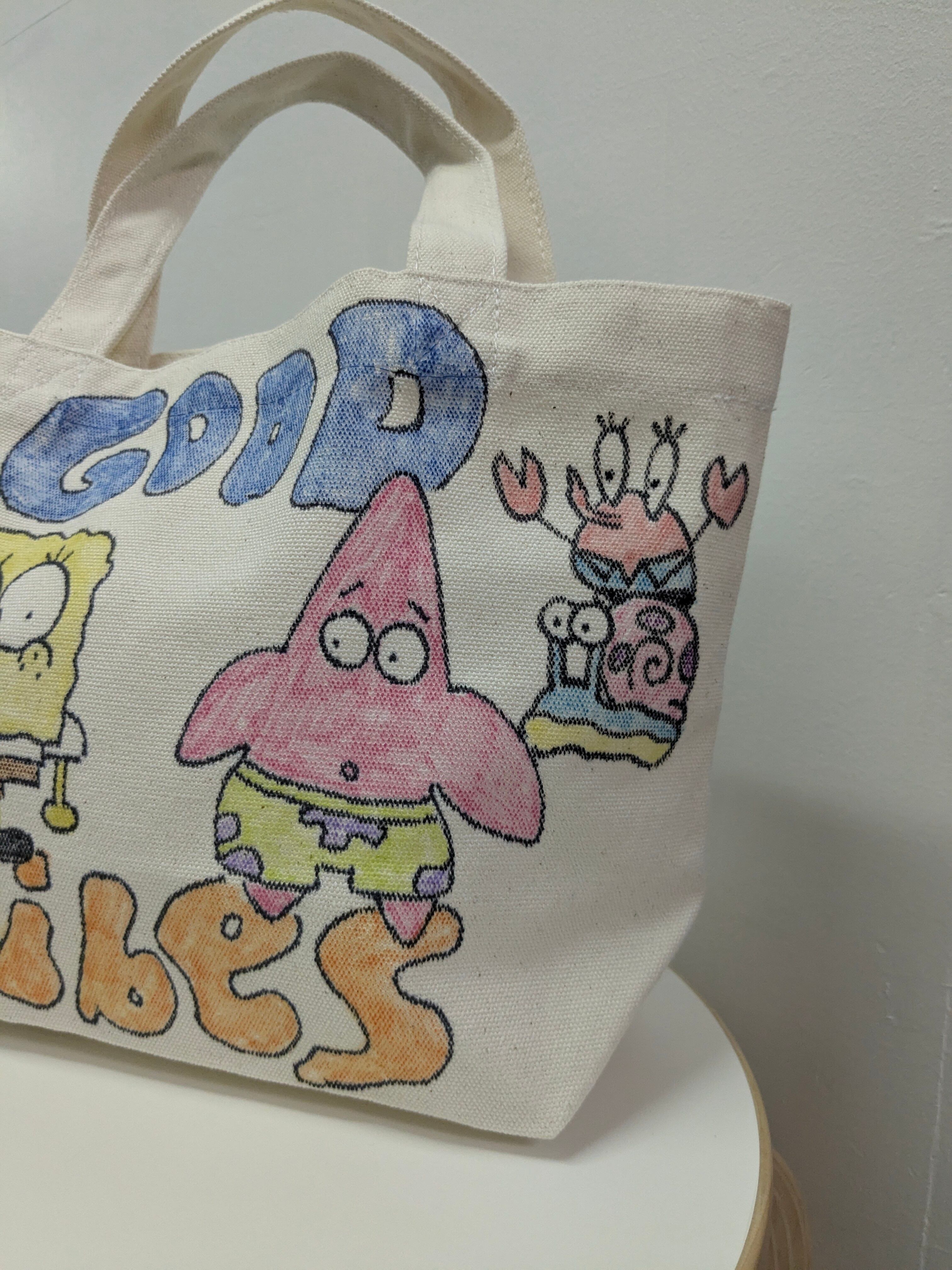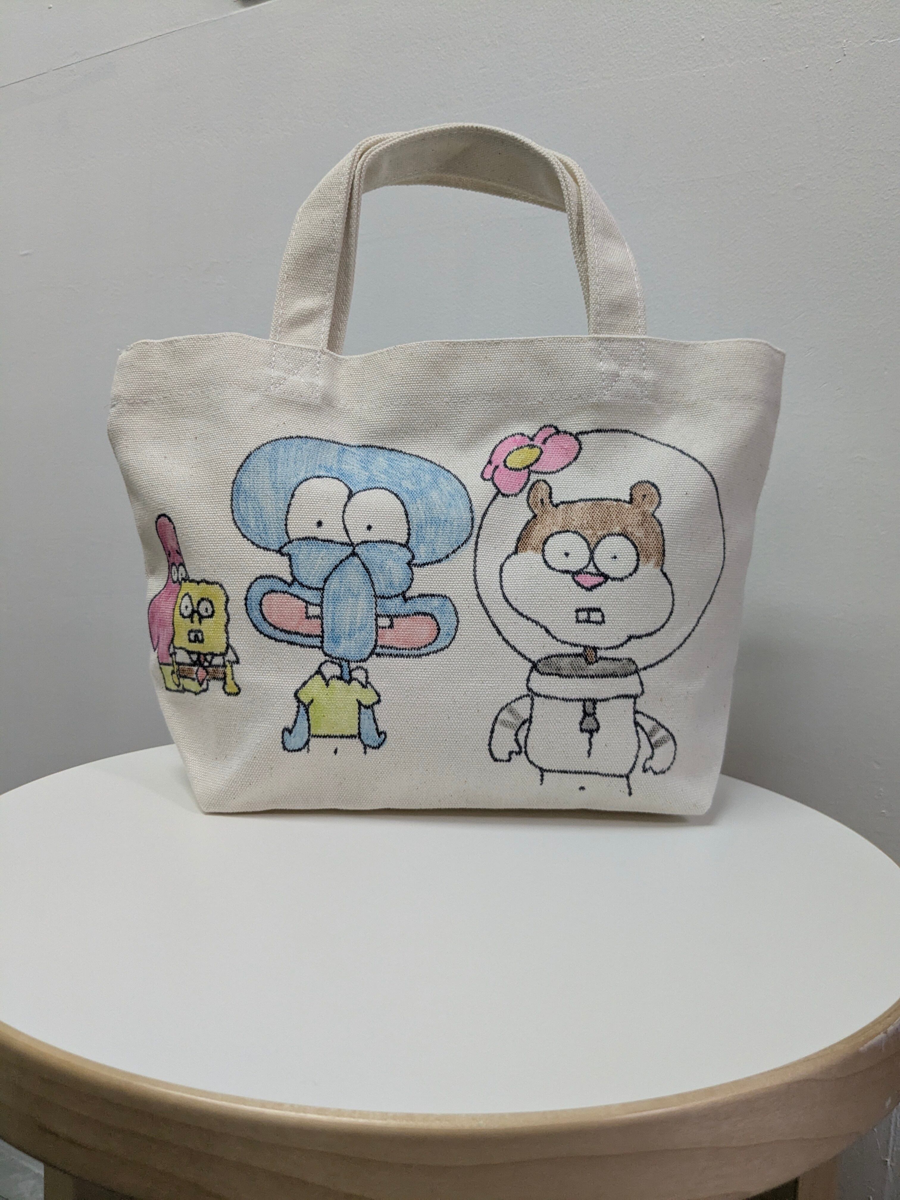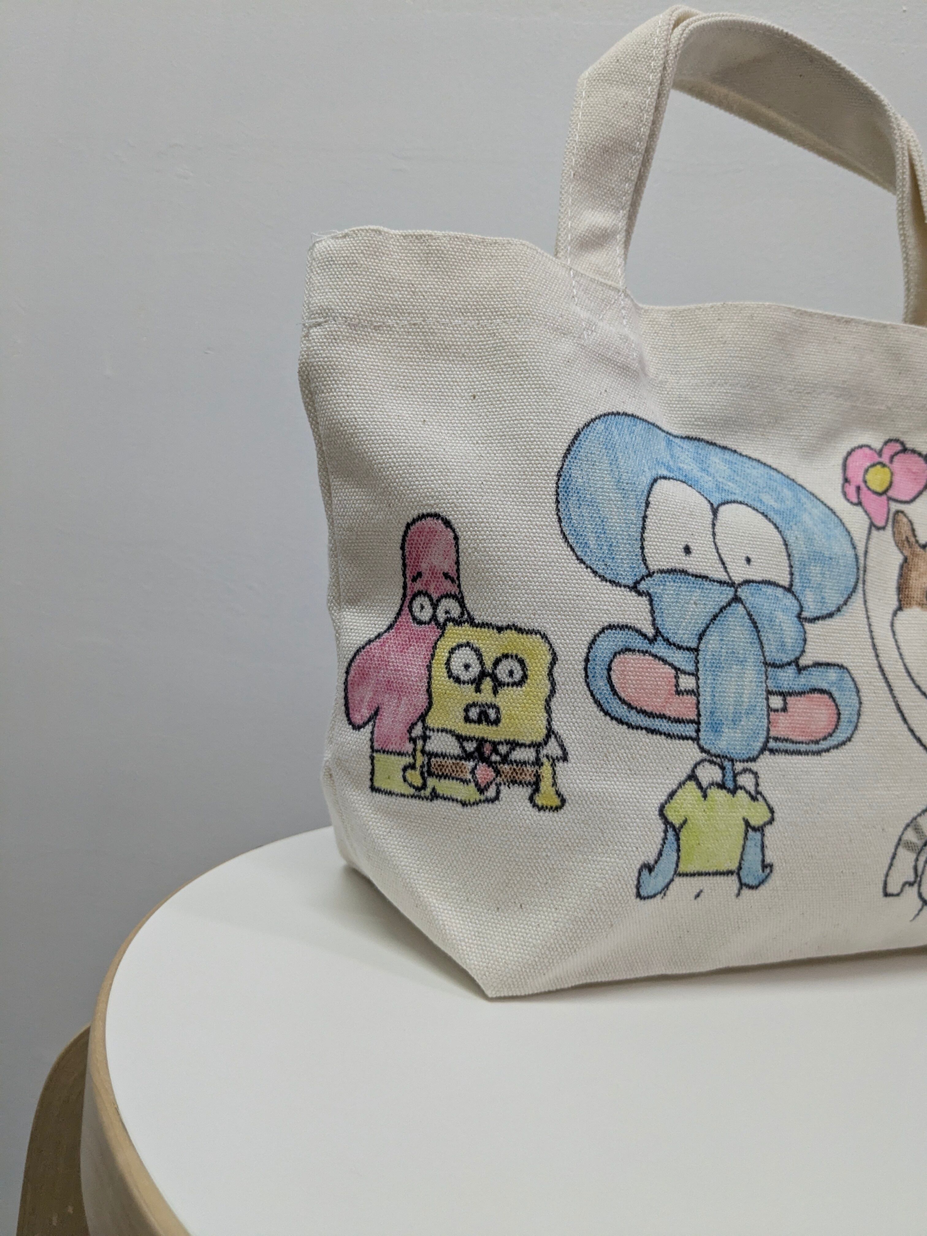 キャンバスのトートバッグにイラストを加えています。メモリアルの要素があり、どこか見たことあるキャラクターがいたりと、とにかく可愛いアイテム。全て手作業になるので、唯一無二の一点物となります。