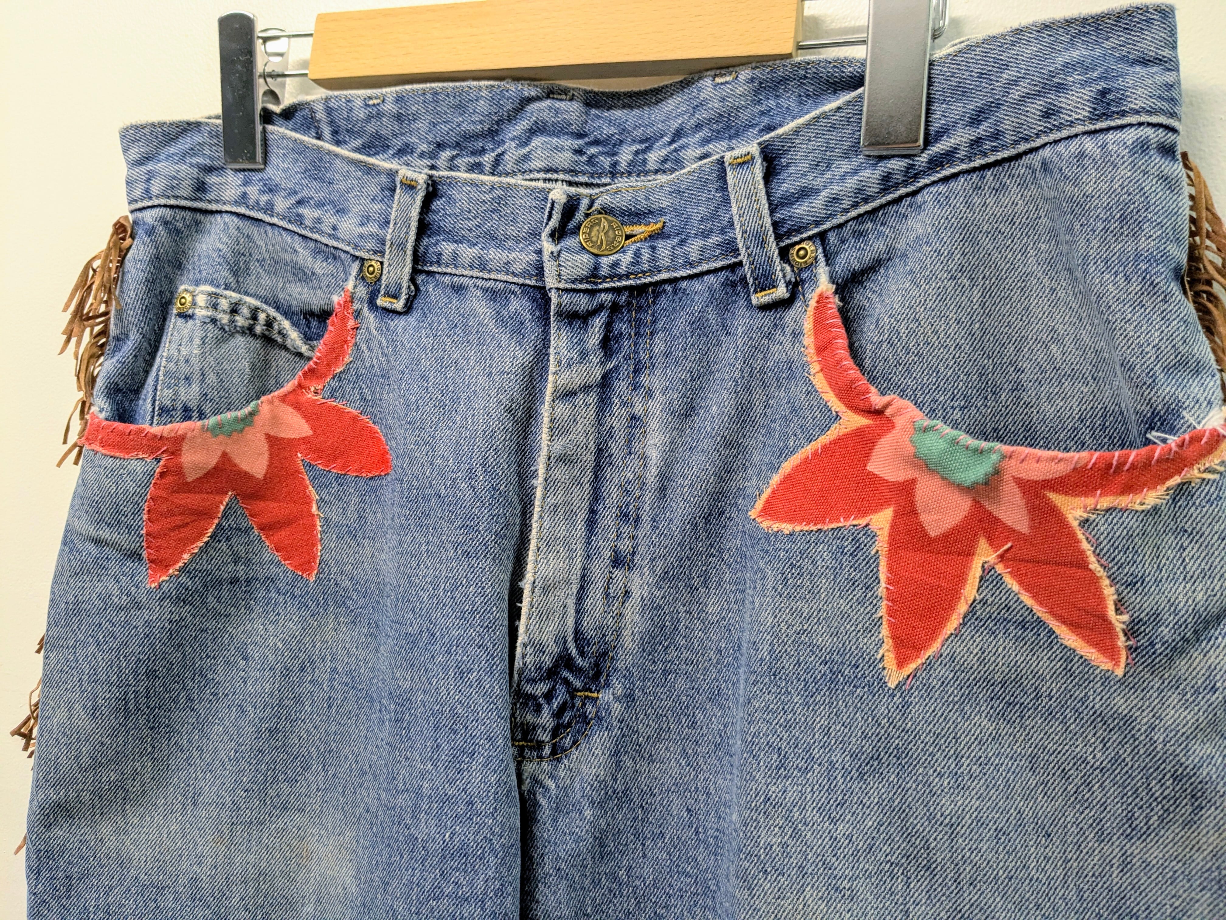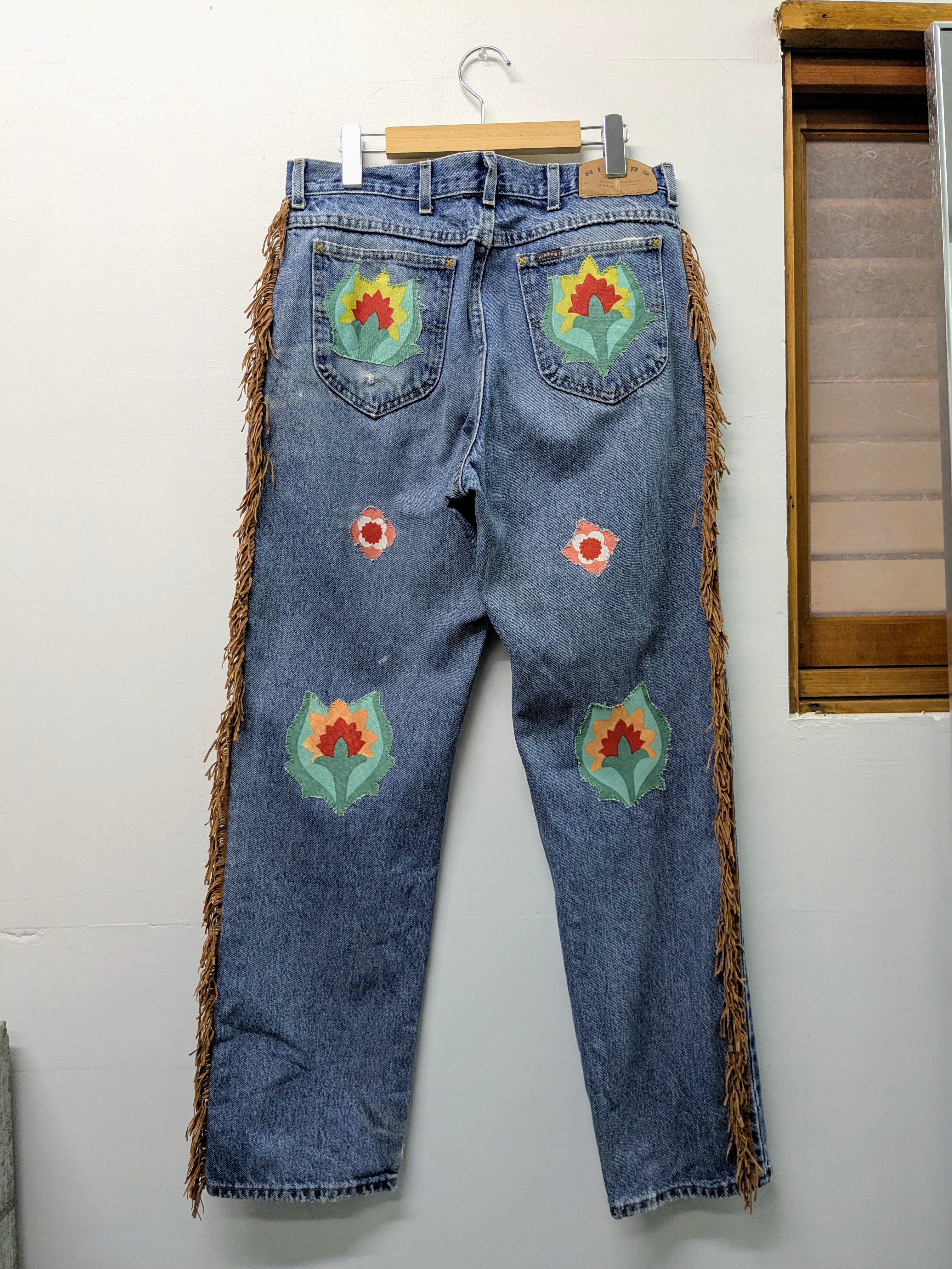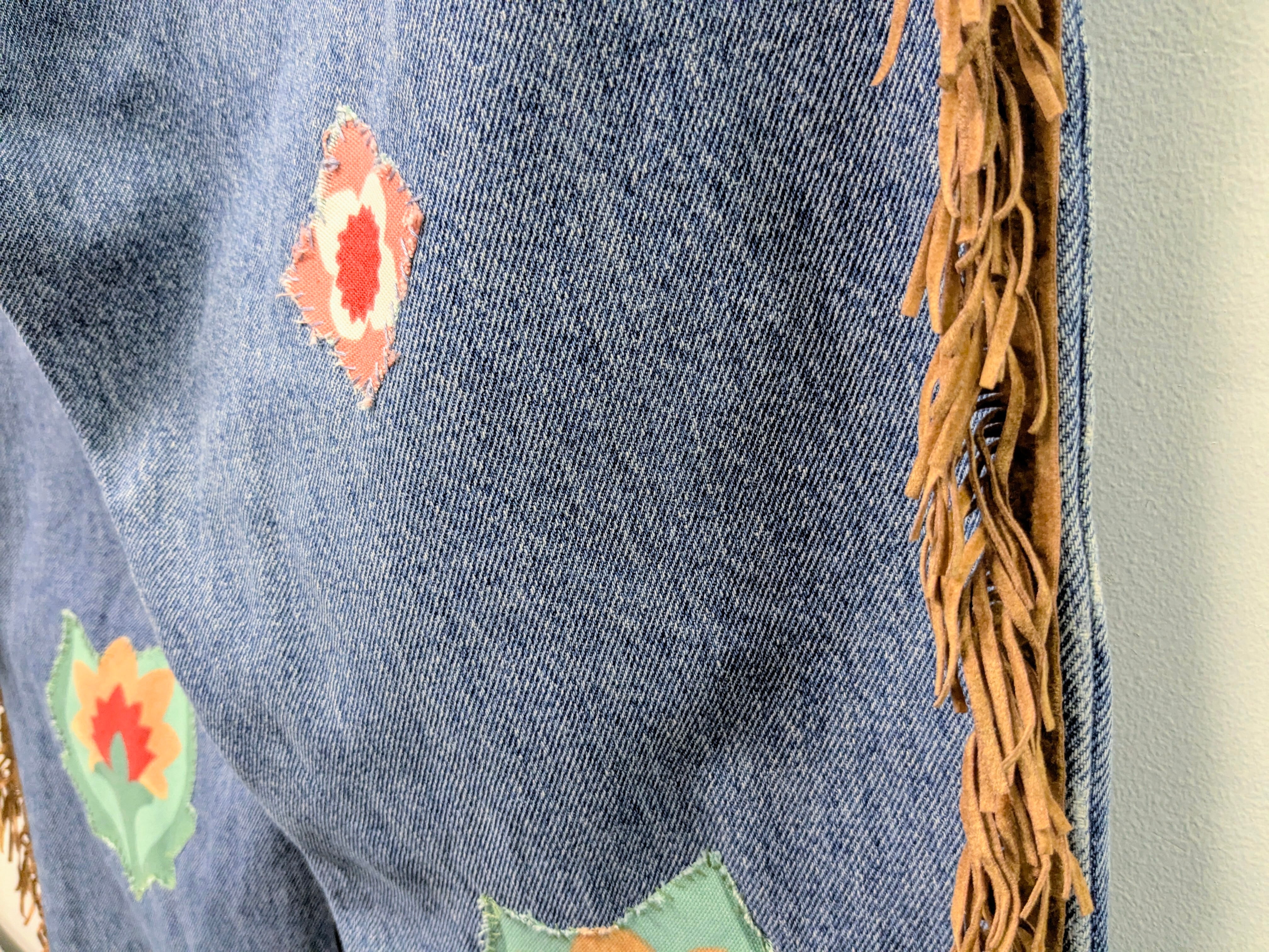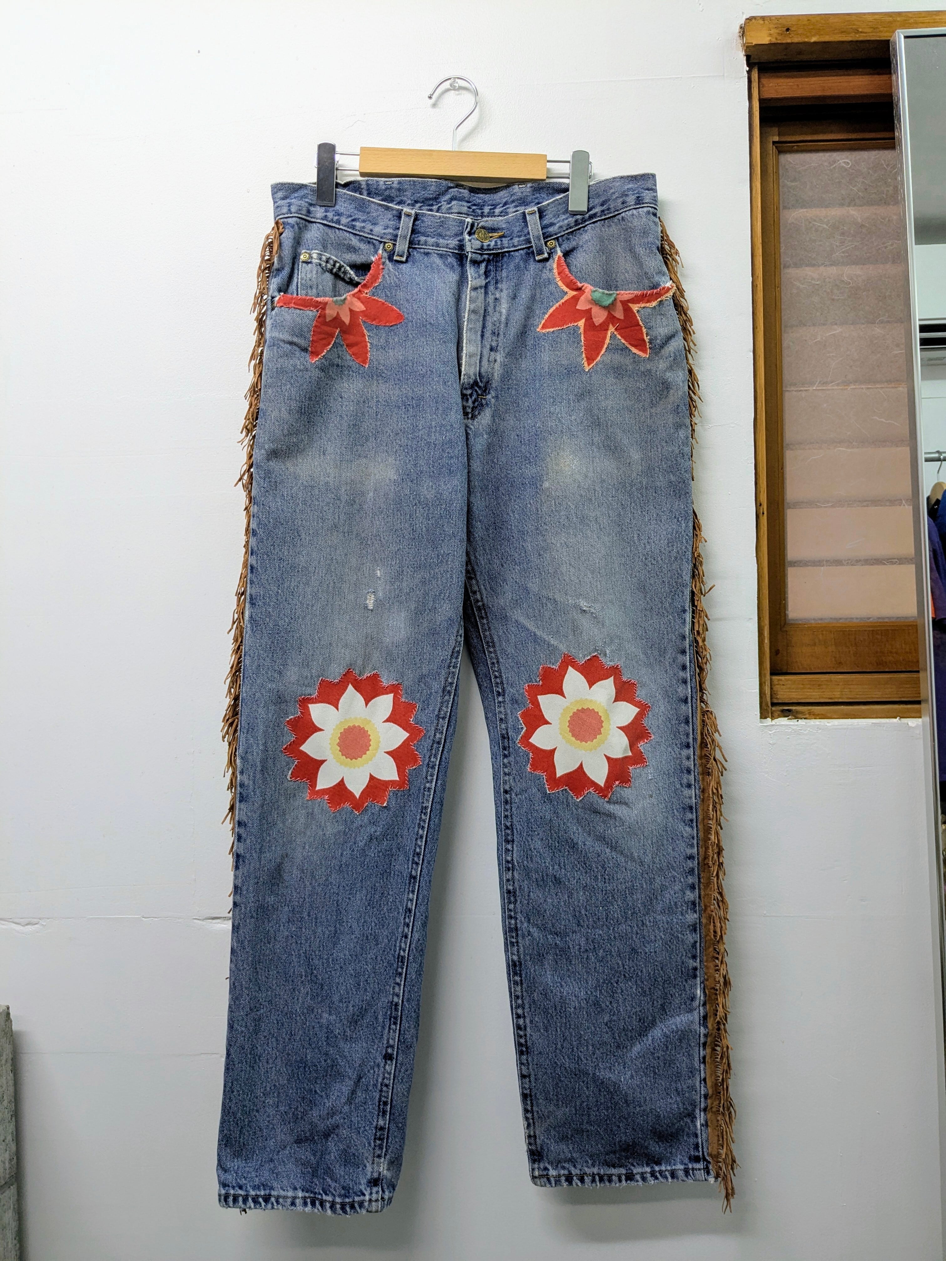 花柄のパッチとスウェードのフリンジがサイドラインのようについたデザインデニム。おそらく前所有者の方がリメイクしたモノ。なので、世界に1点しかないアイテムになります。キズあり。
