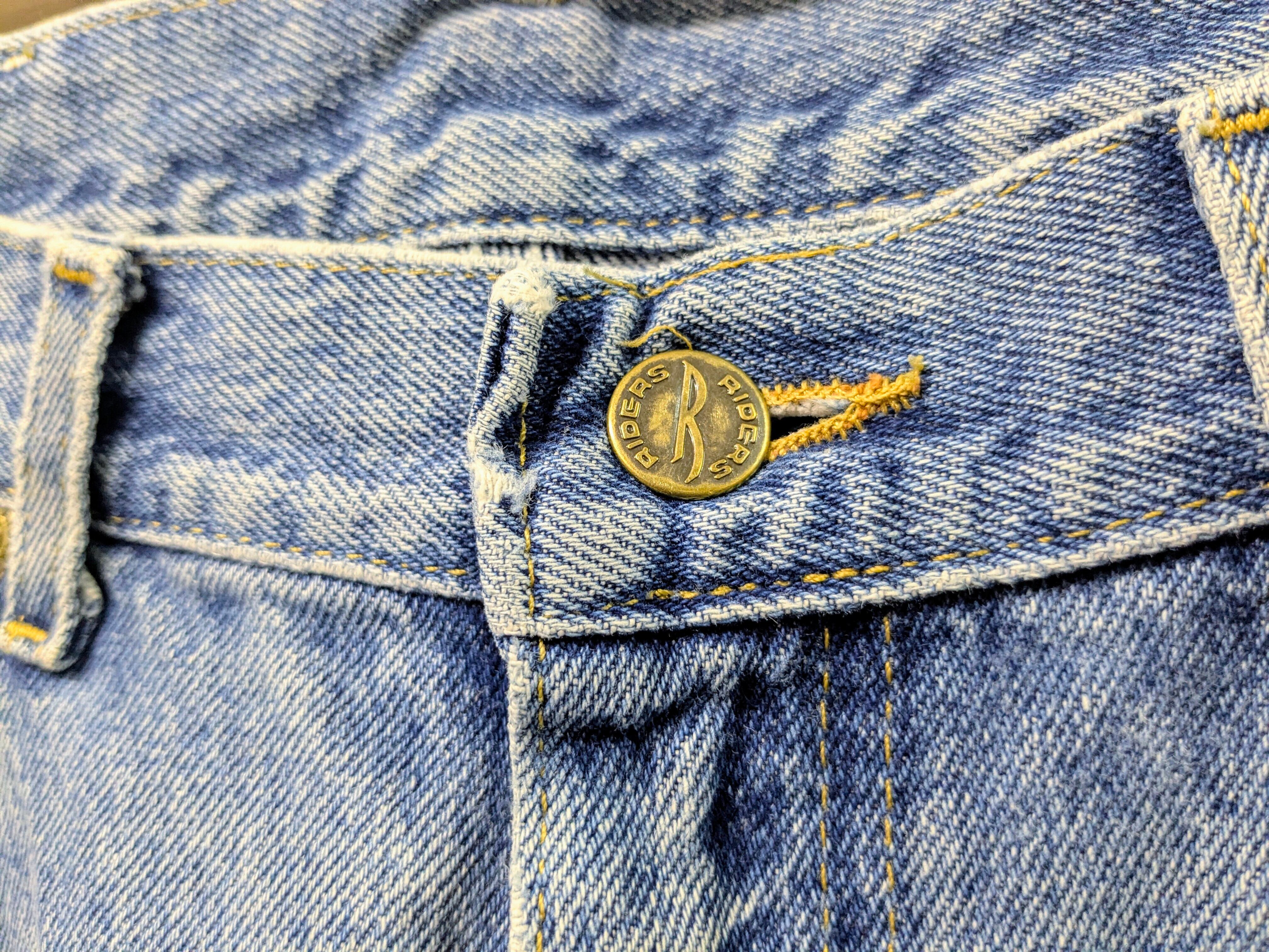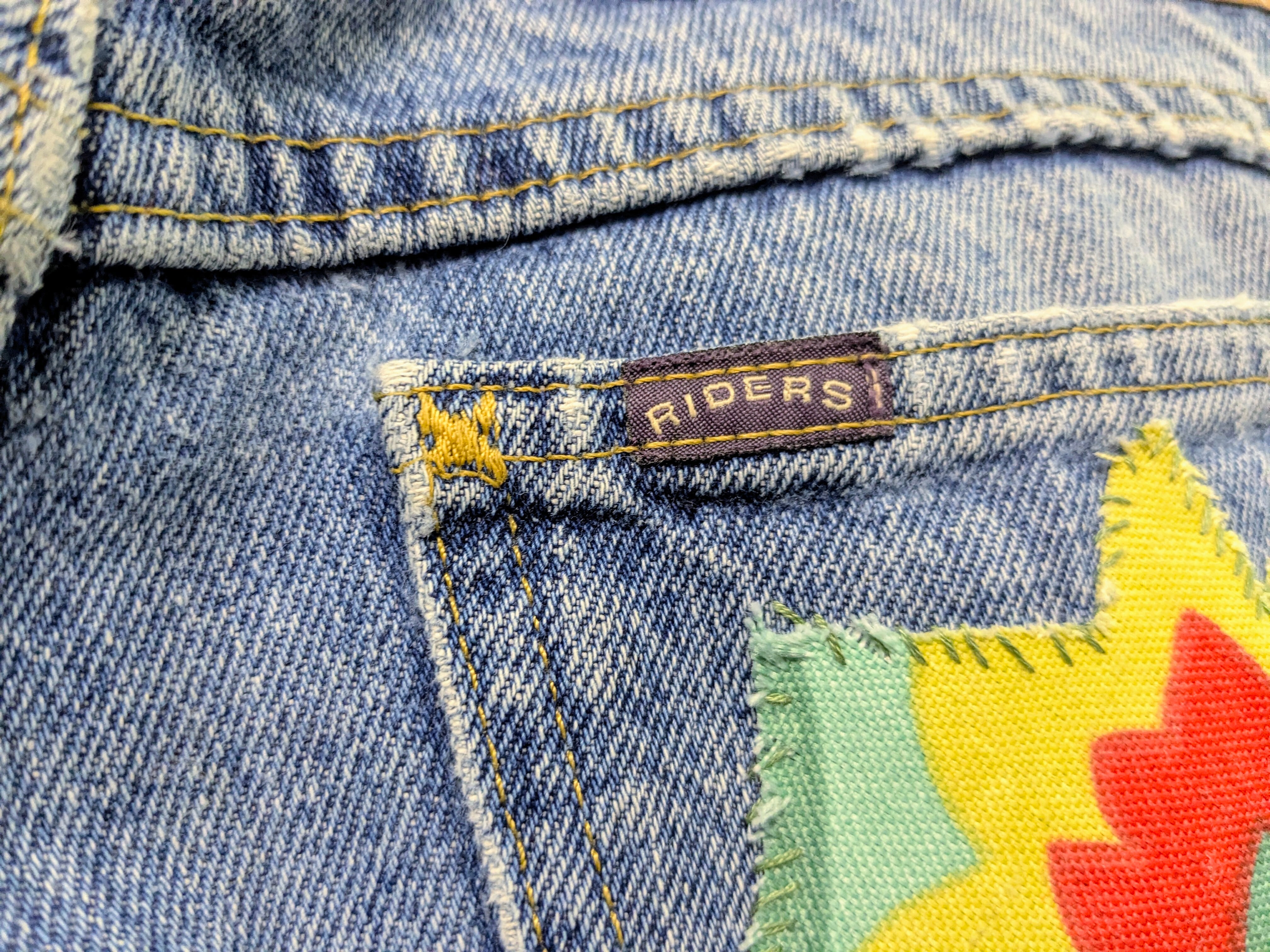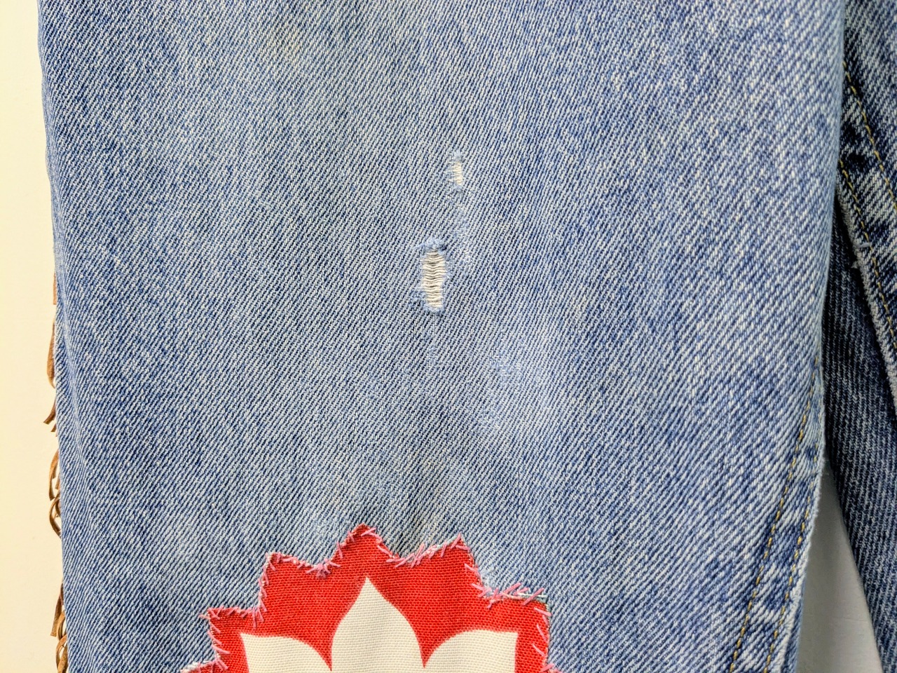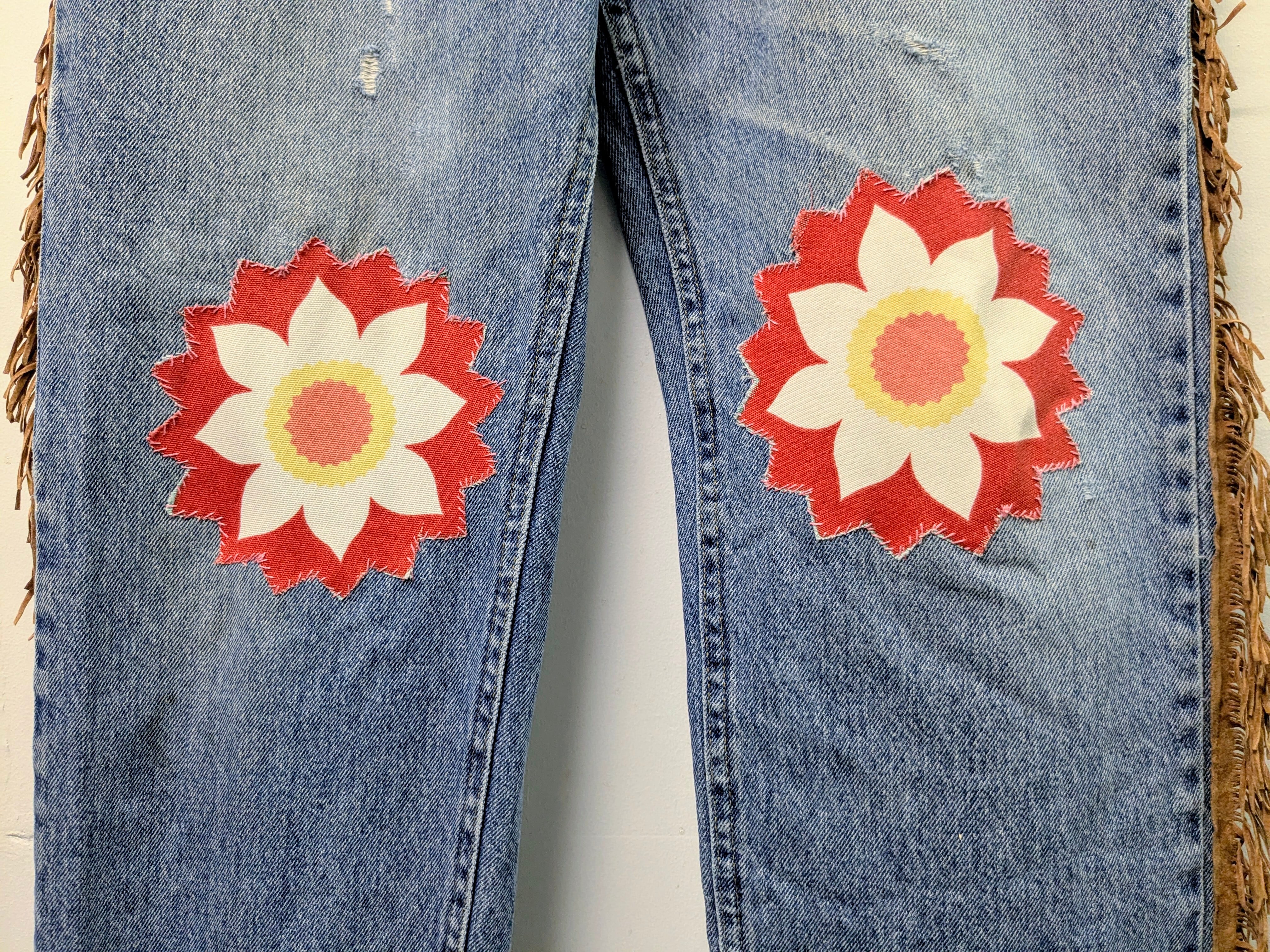 花柄のパッチとスウェードのフリンジがサイドラインのようについたデザインデニム。おそらく前所有者の方がリメイクしたモノ。なので、世界に1点しかないアイテムになります。キズあり。