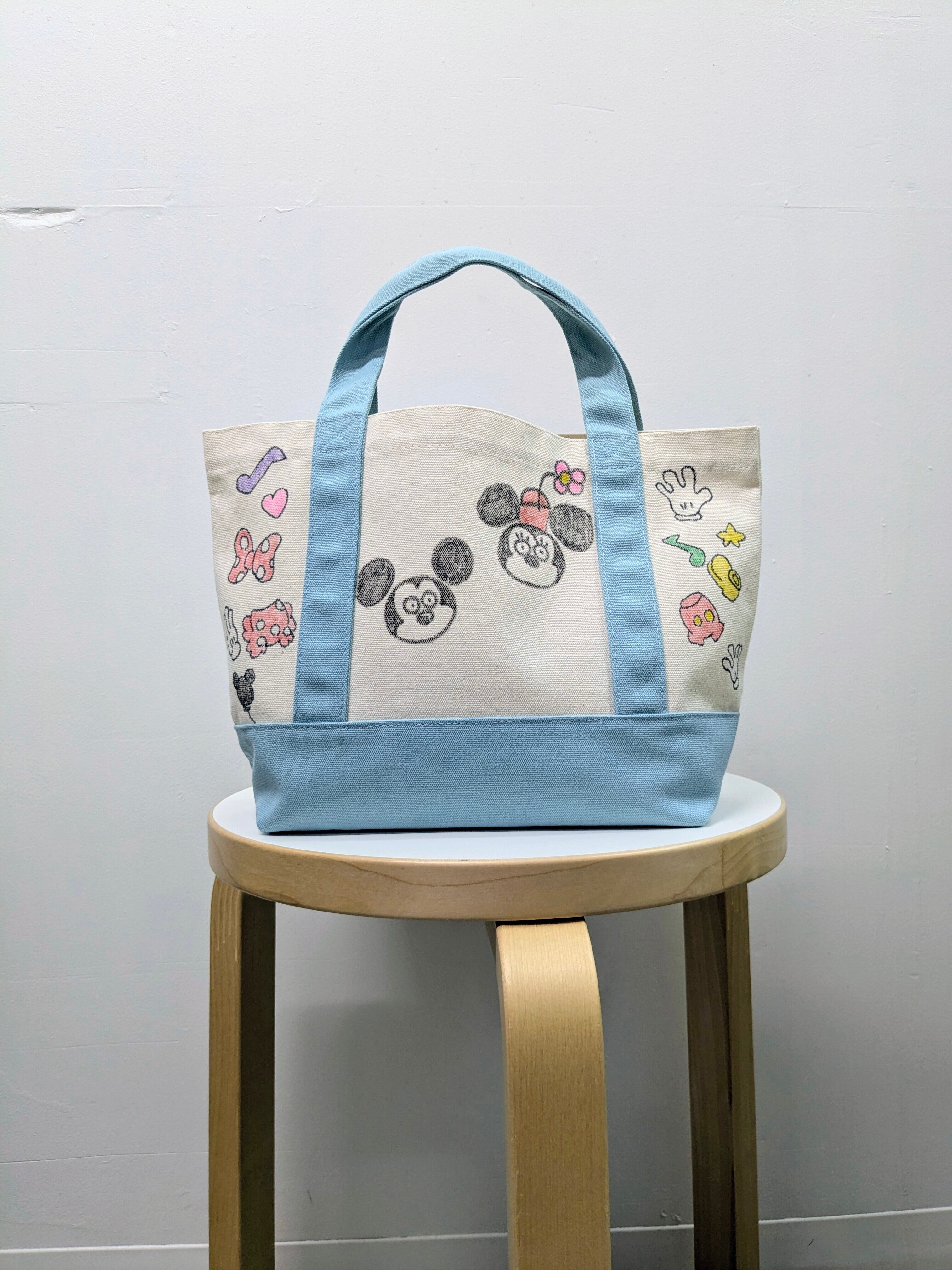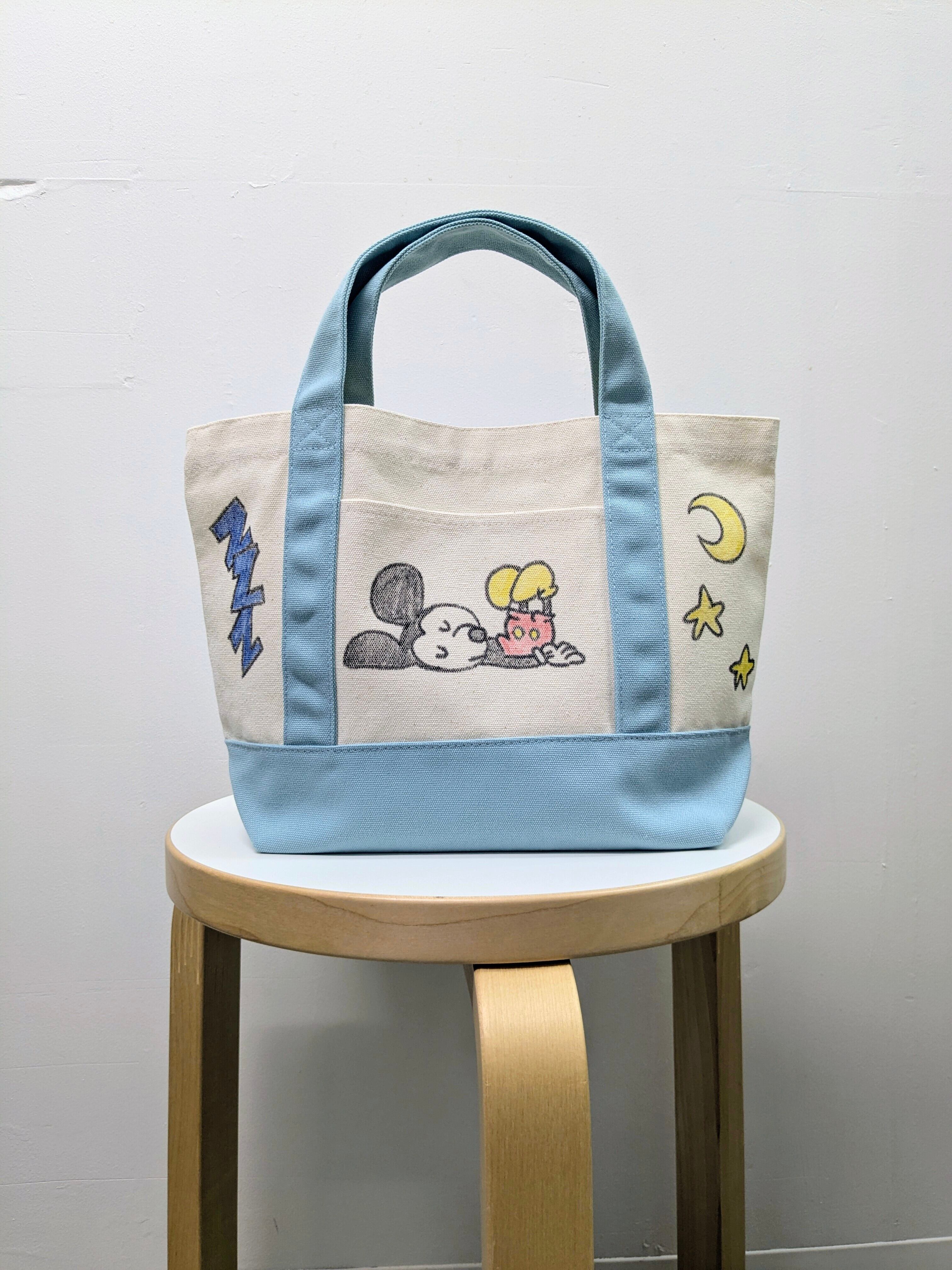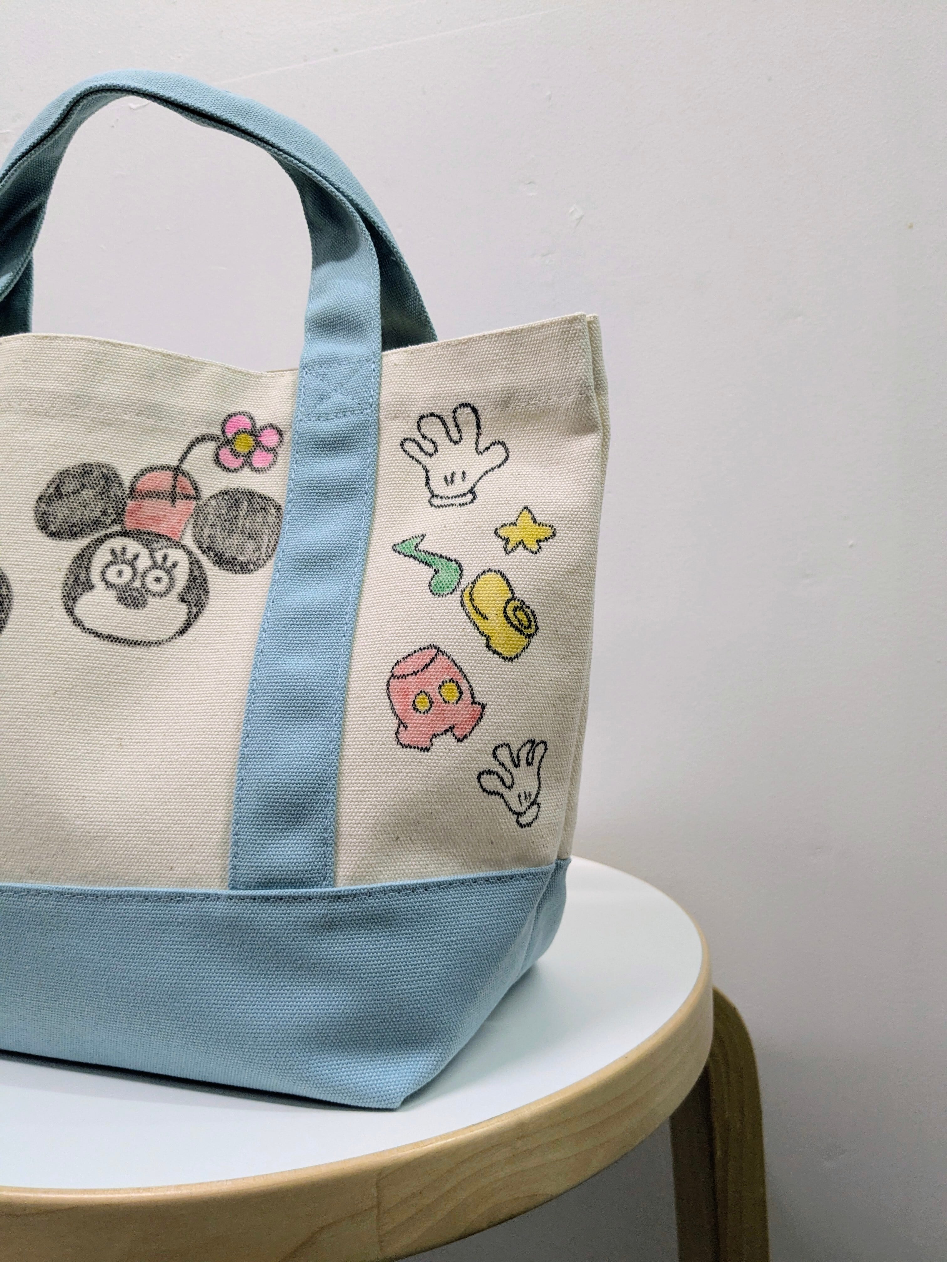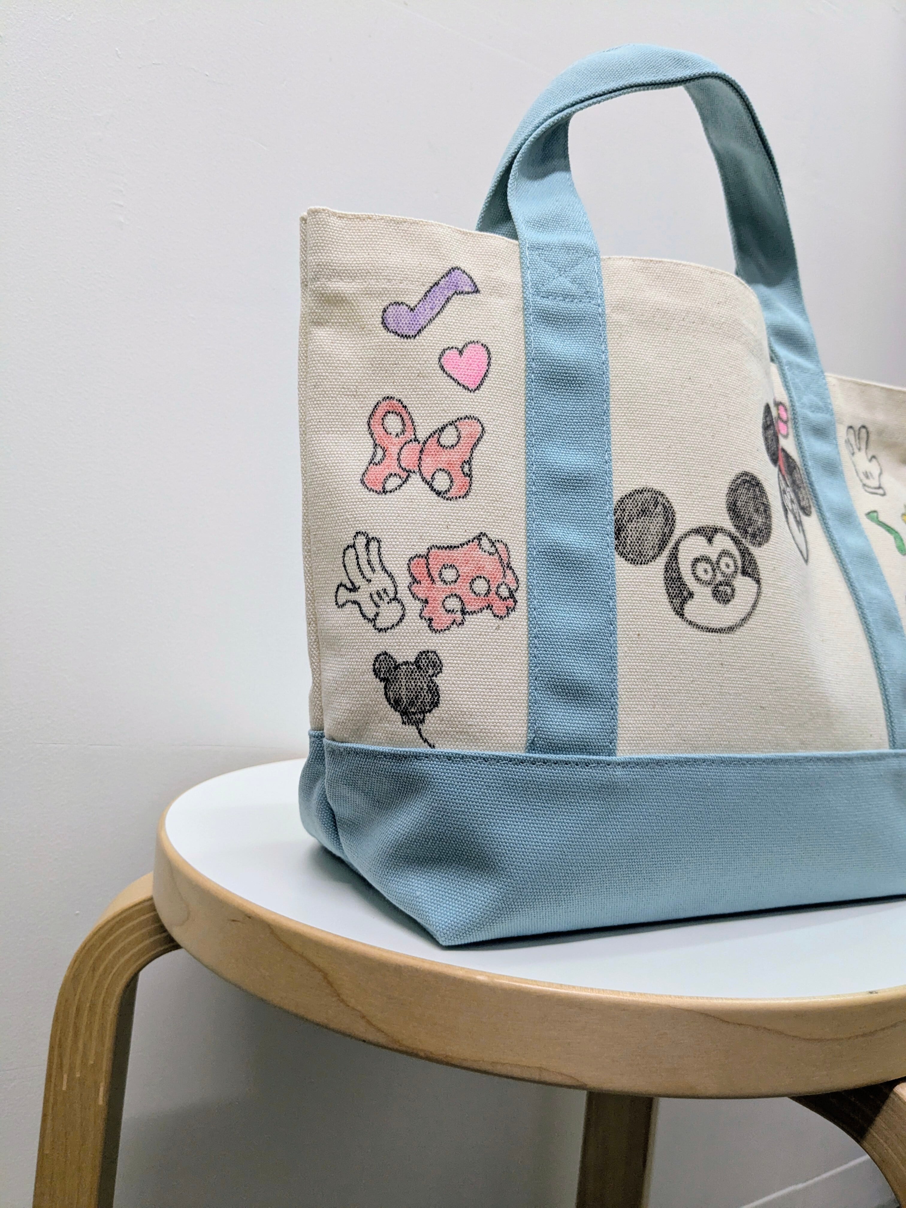 キャンバスのトートバッグにイラストを加えています。メモリアルの要素があり、どこか見たことあるキャラクターがいたりと、とにかく可愛いアイテム。全て手作業になるので、唯一無二の一点物となります。