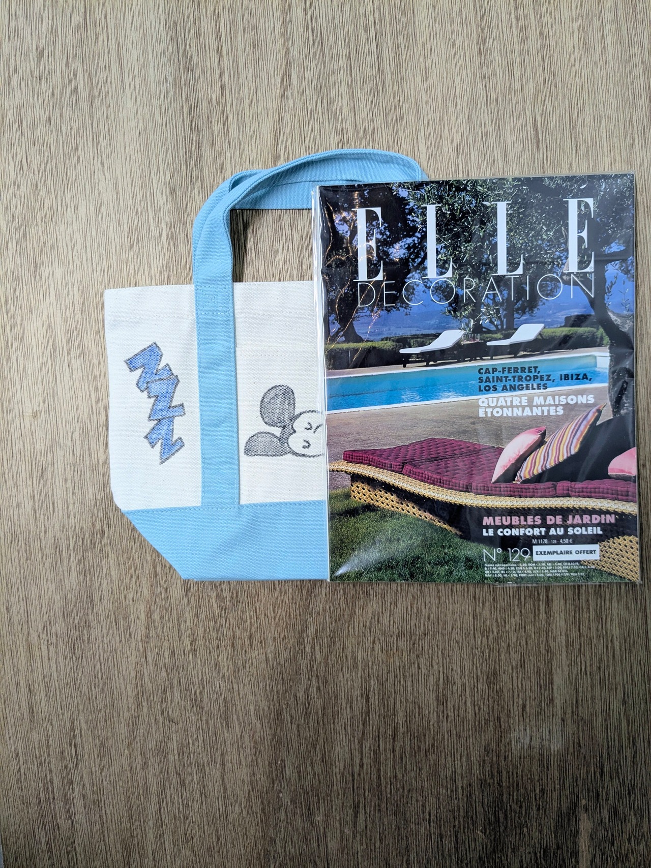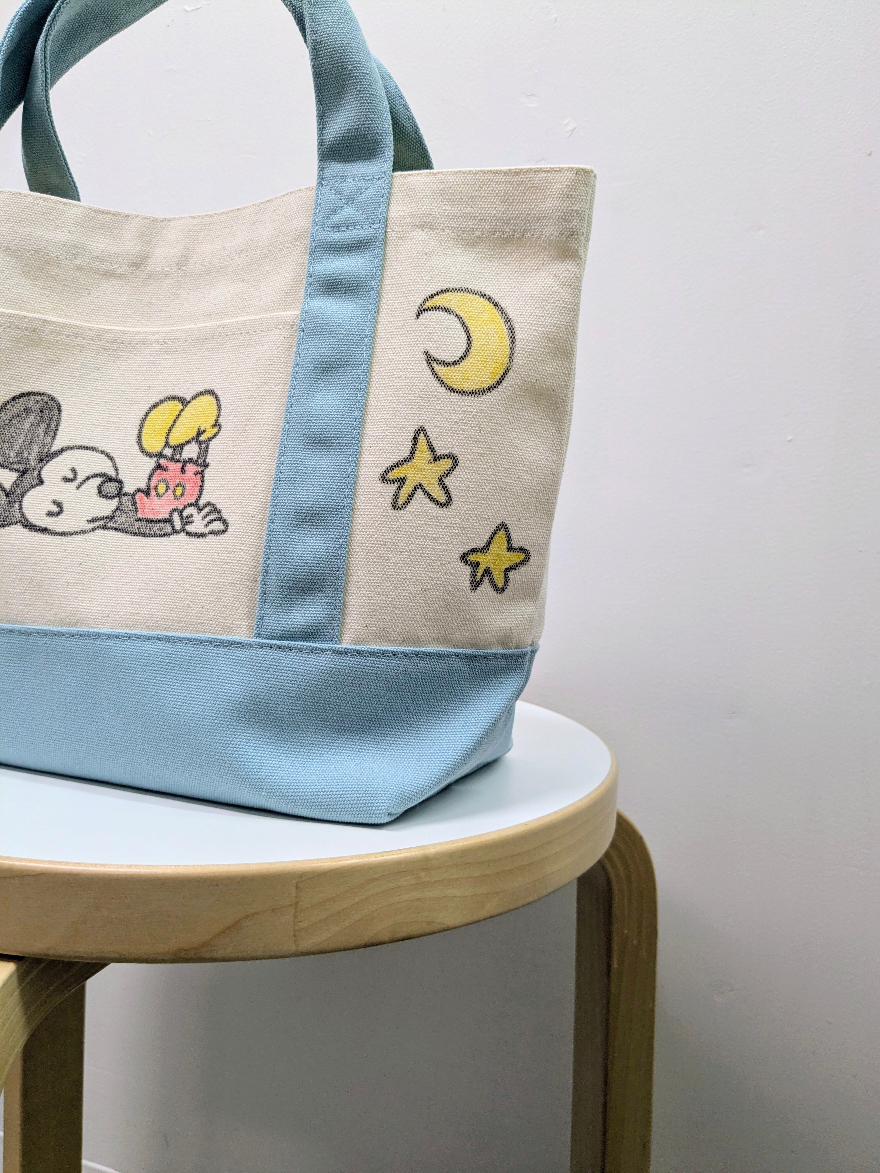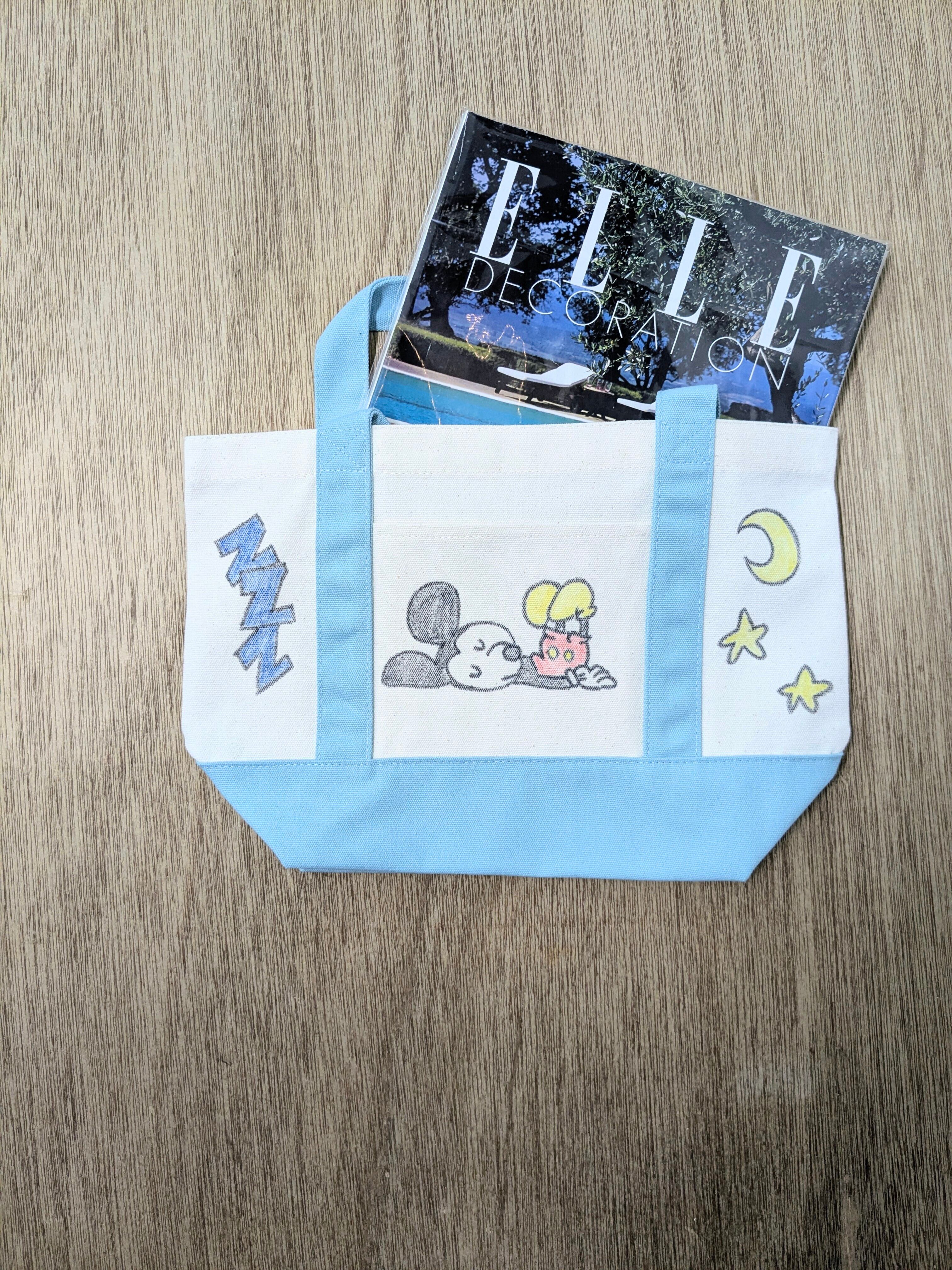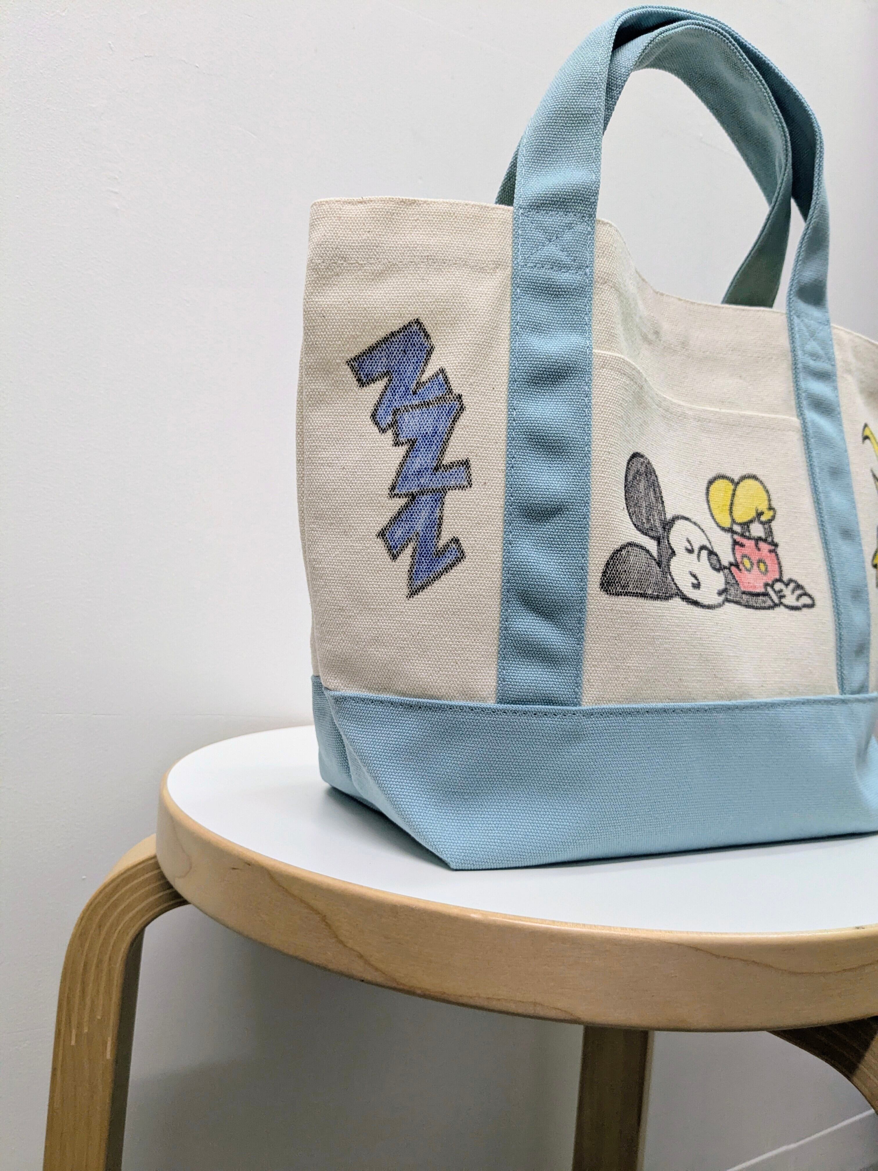 キャンバスのトートバッグにイラストを加えています。メモリアルの要素があり、どこか見たことあるキャラクターがいたりと、とにかく可愛いアイテム。全て手作業になるので、唯一無二の一点物となります。