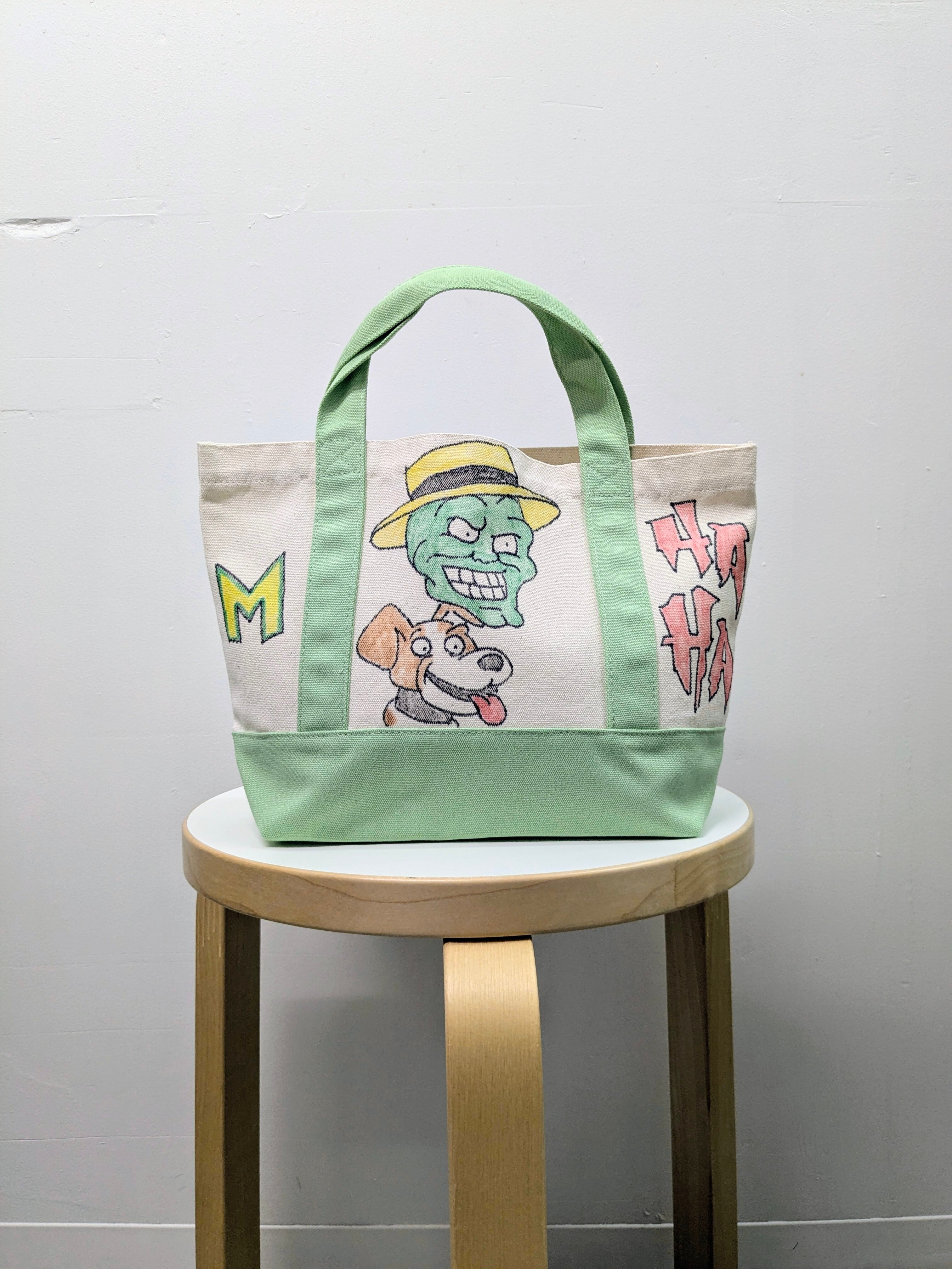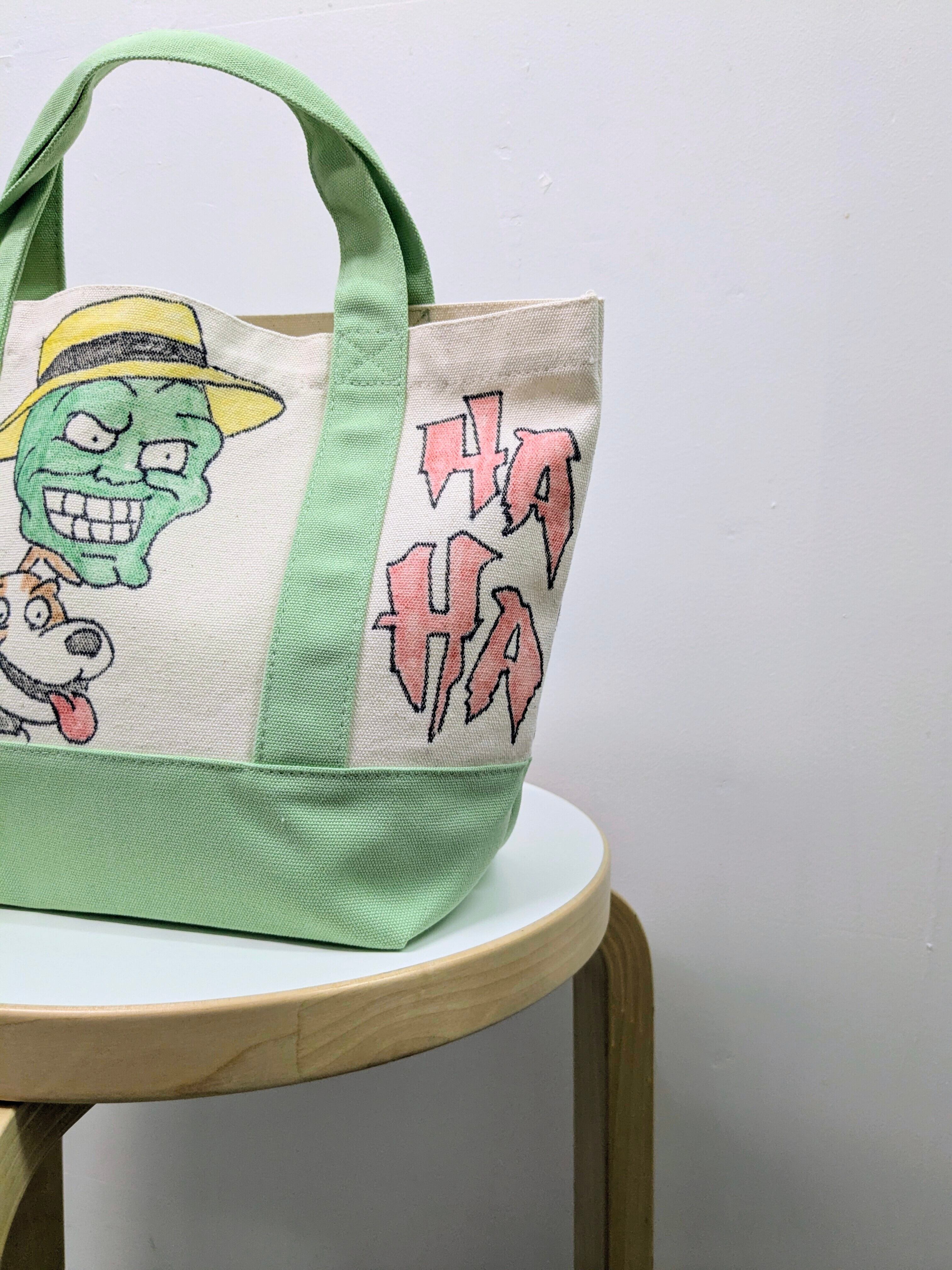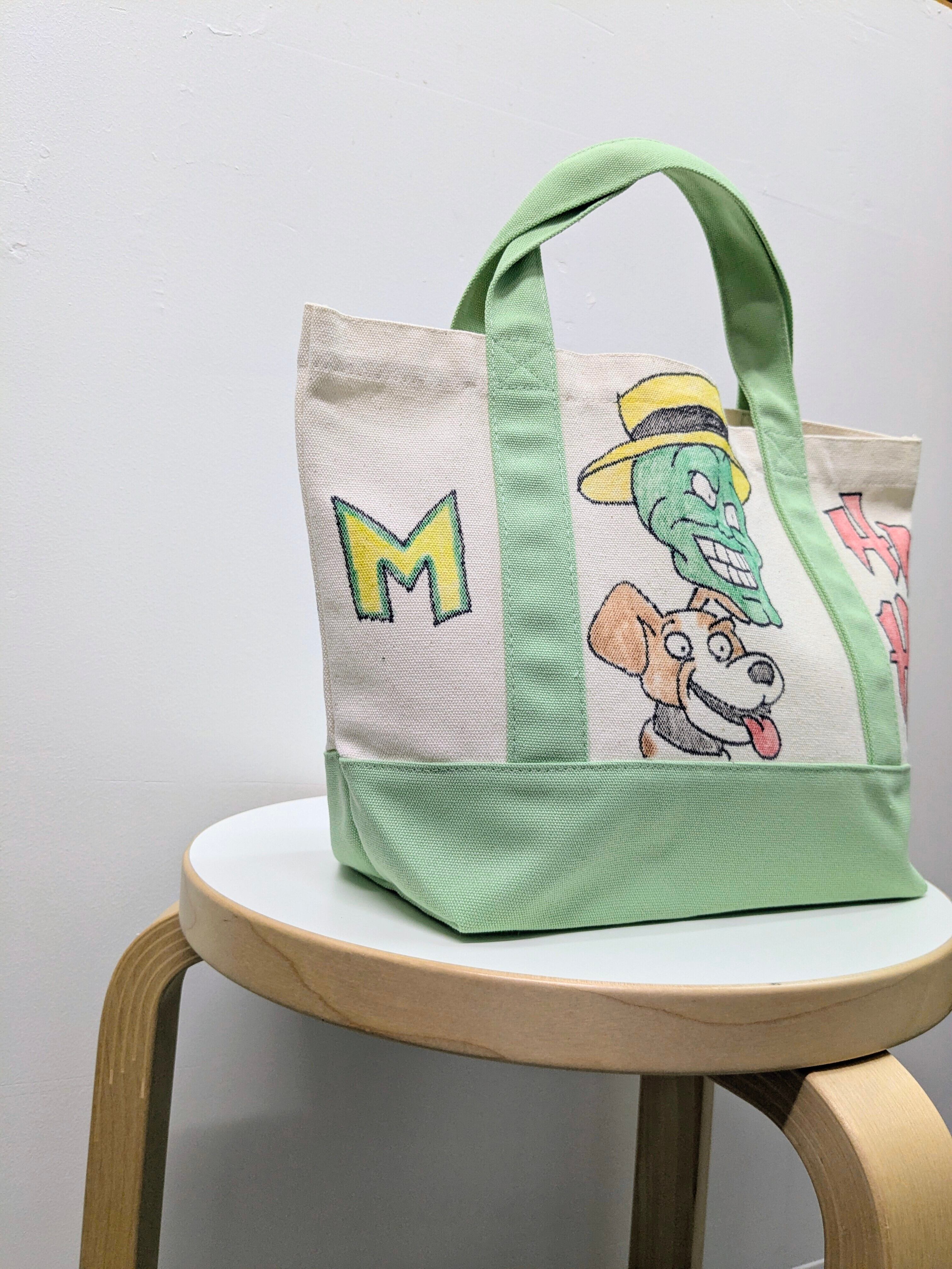 キャンバスのトートバッグにイラストを加えています。メモリアルの要素があり、どこか見たことあるキャラクターがいたりと、とにかく可愛いアイテム。全て手作業になるので、唯一無二の一点物となります。