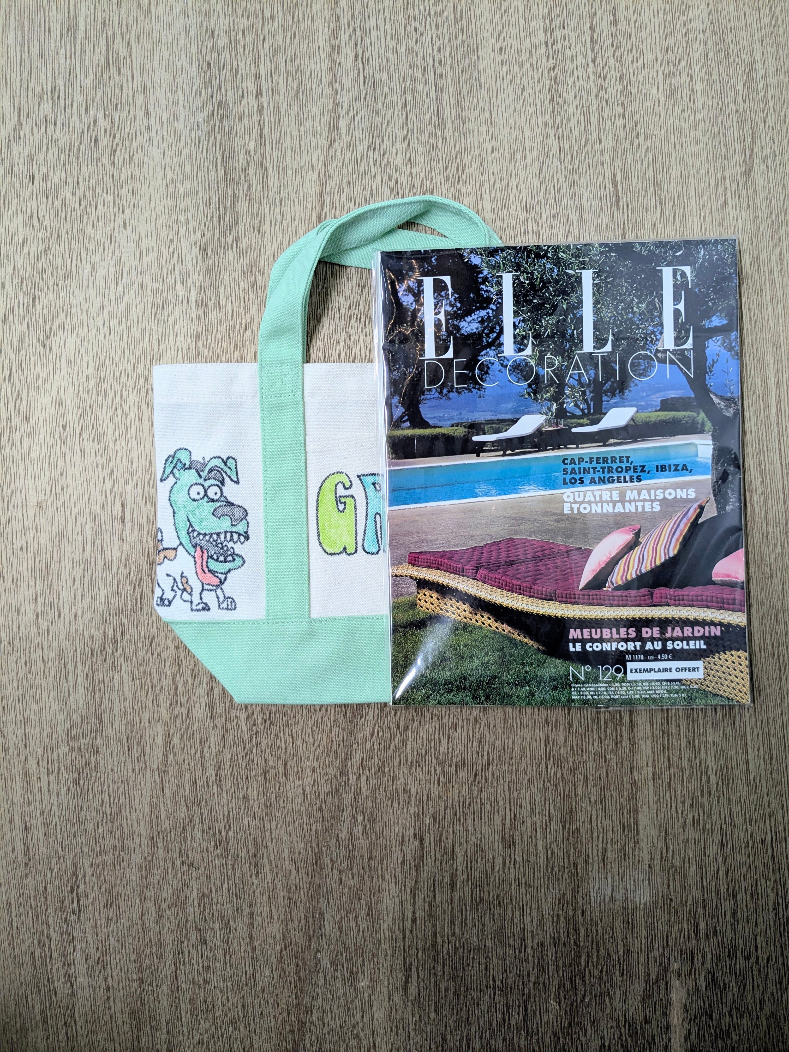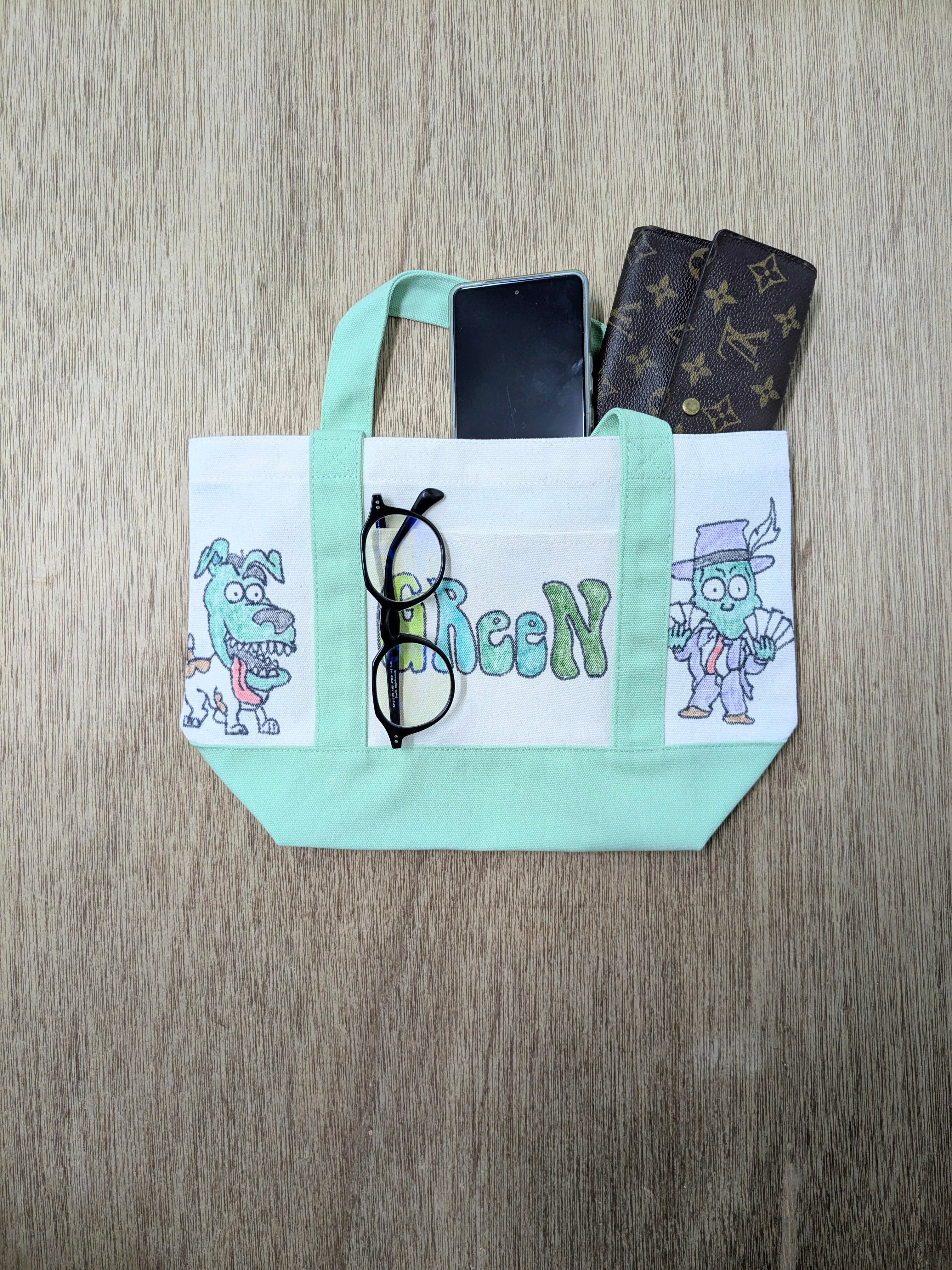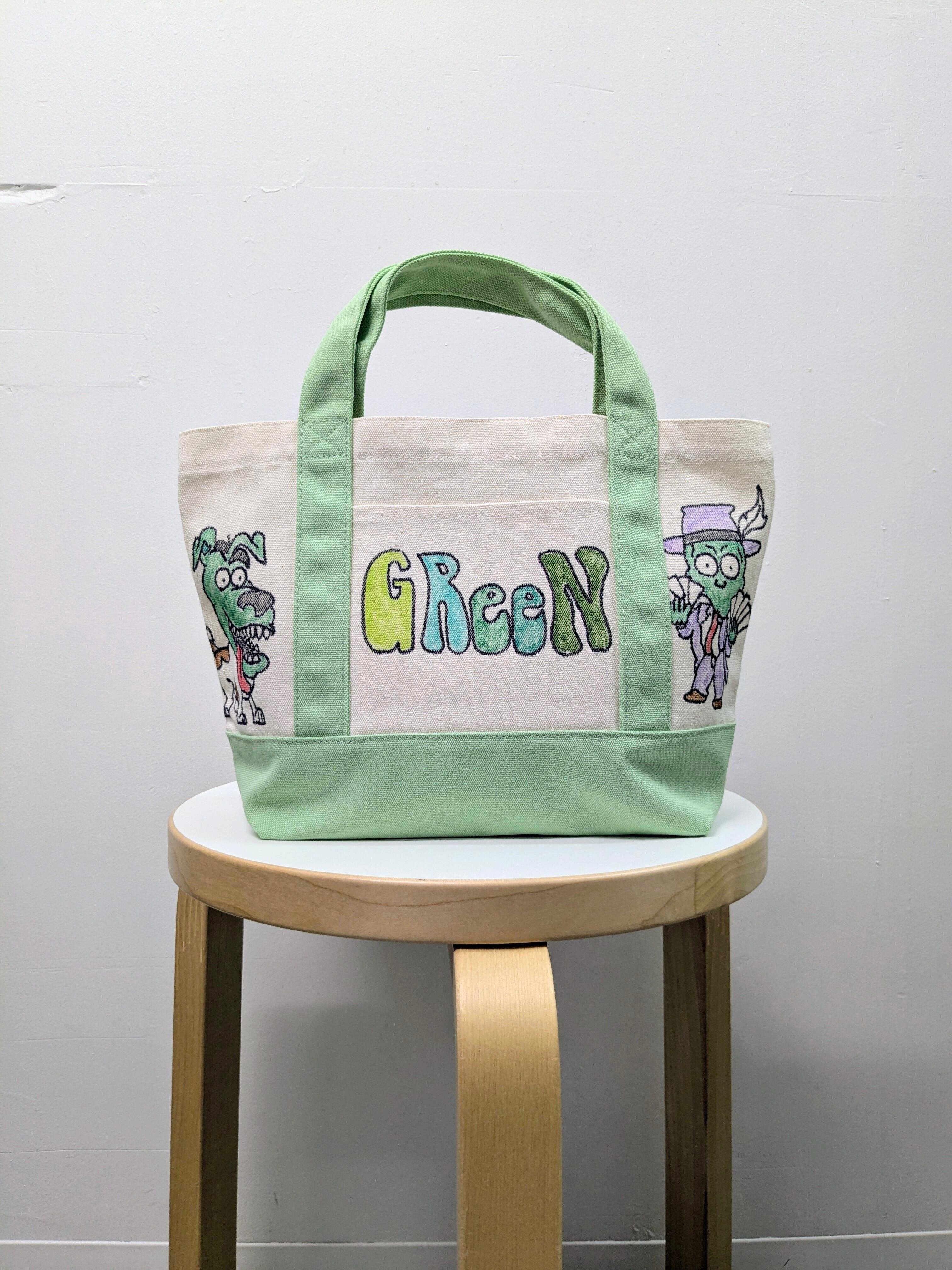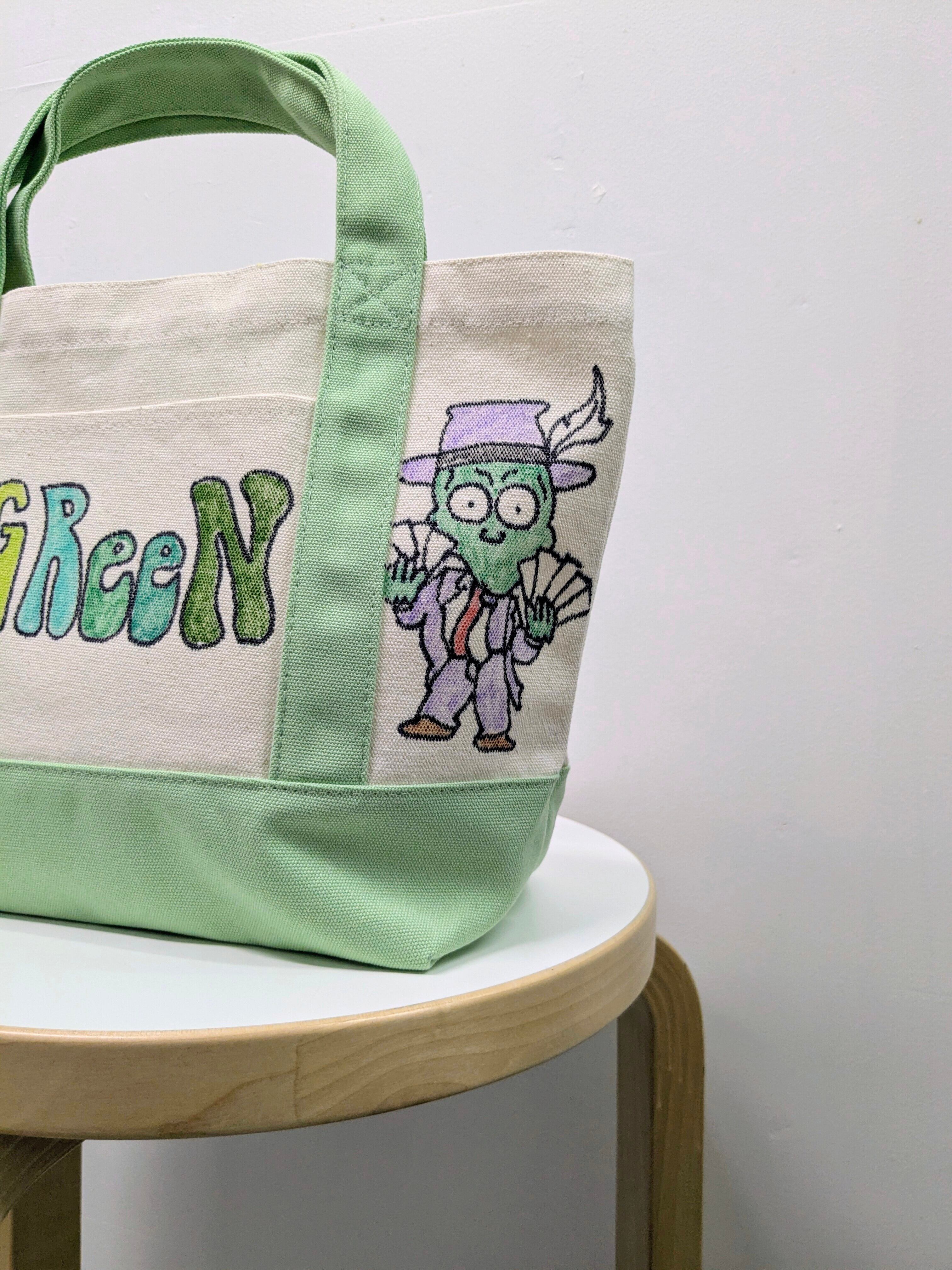 キャンバスのトートバッグにイラストを加えています。メモリアルの要素があり、どこか見たことあるキャラクターがいたりと、とにかく可愛いアイテム。全て手作業になるので、唯一無二の一点物となります。