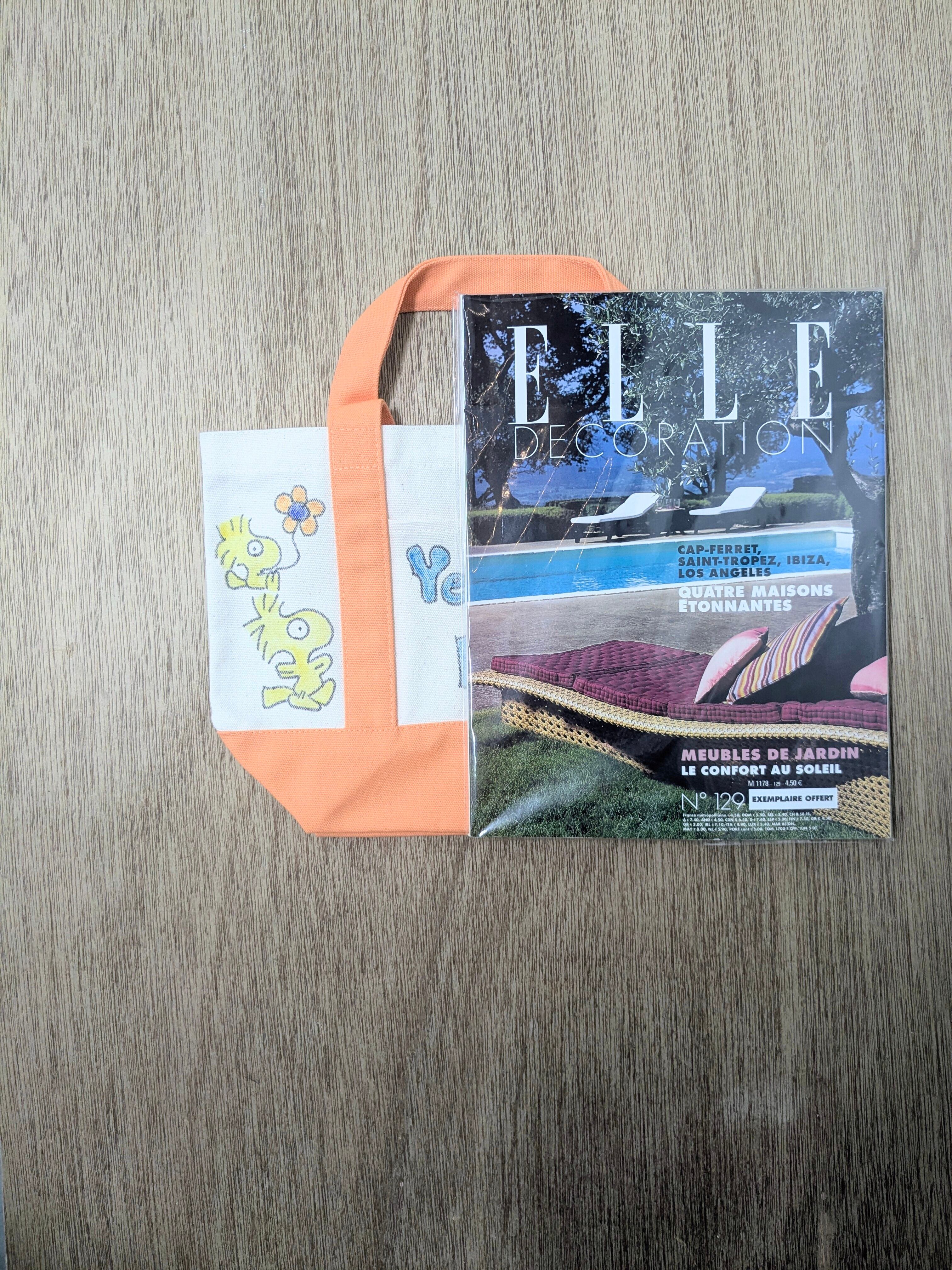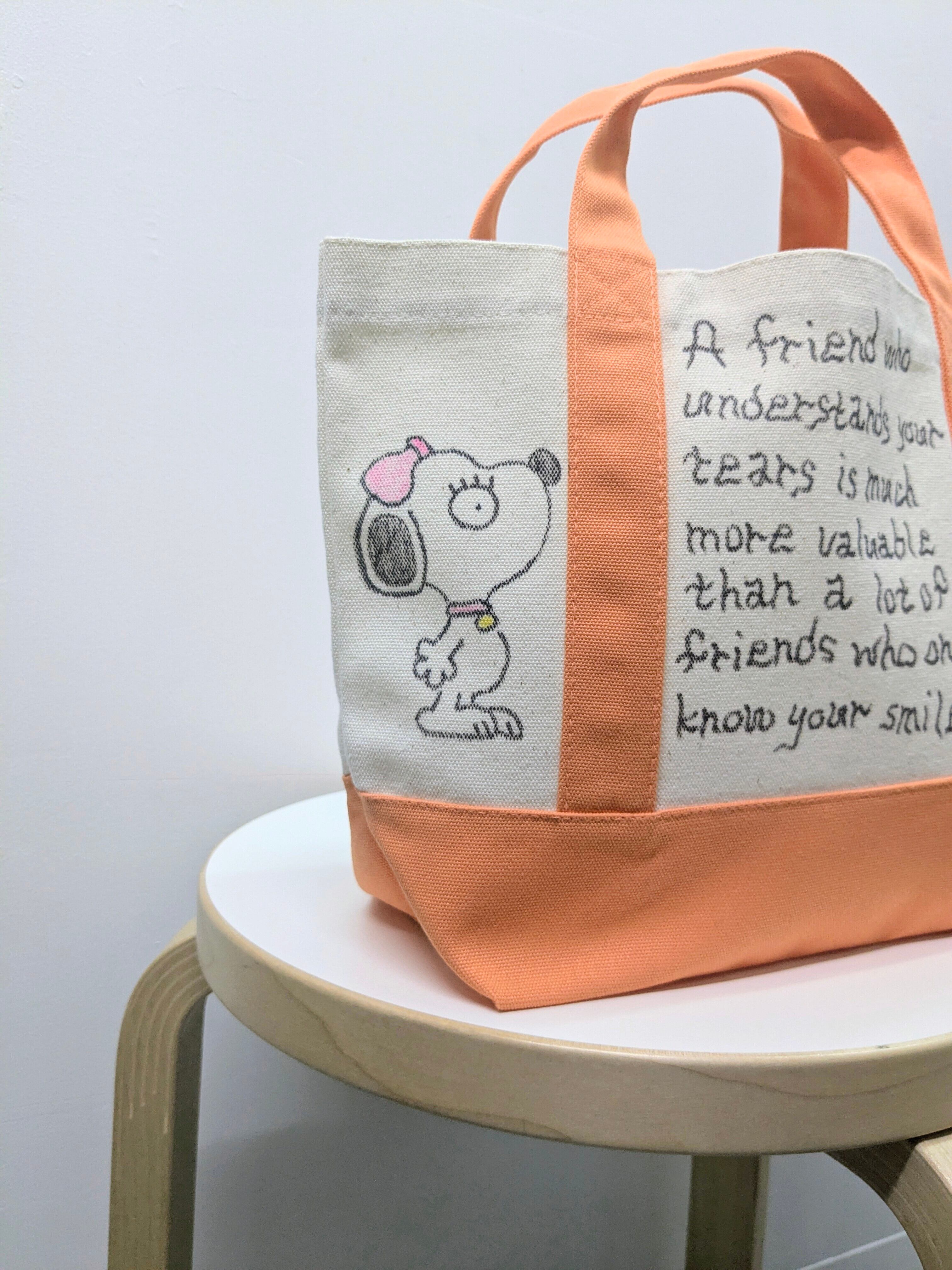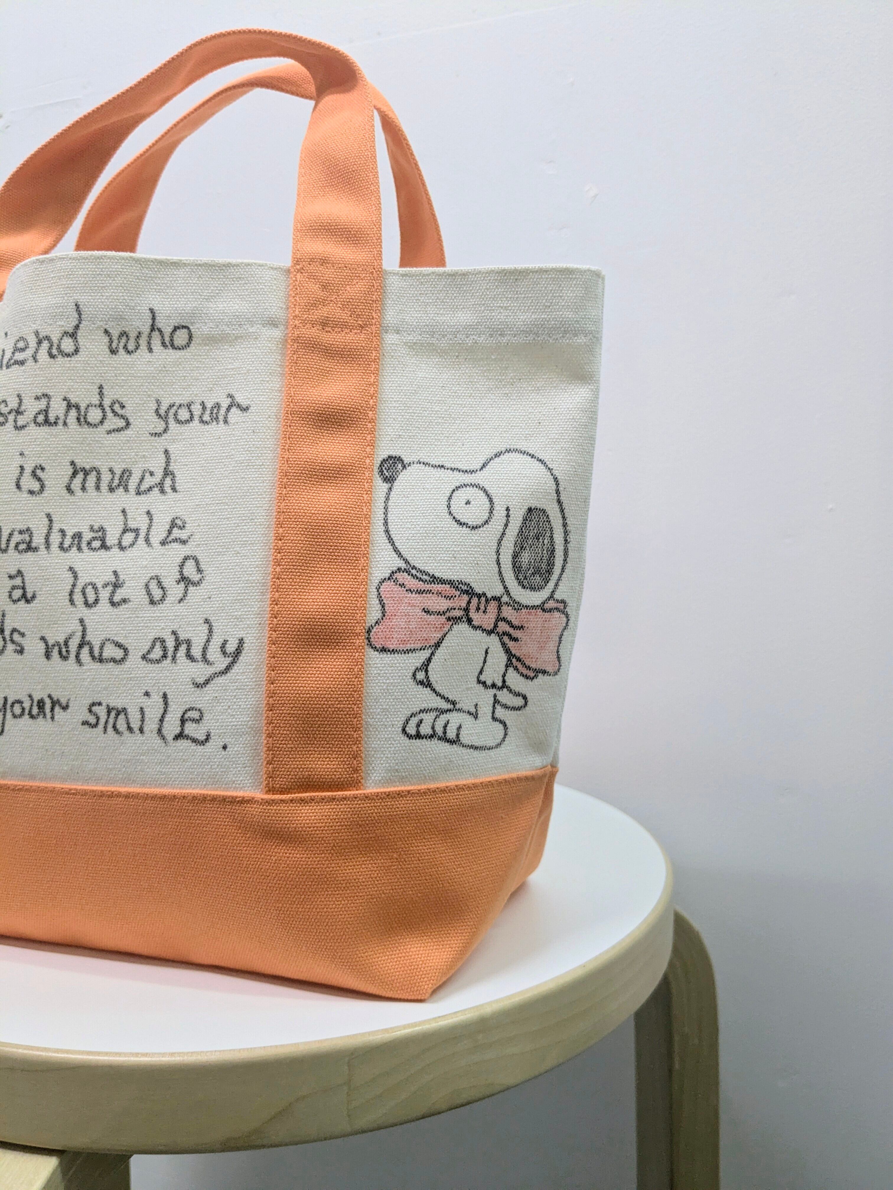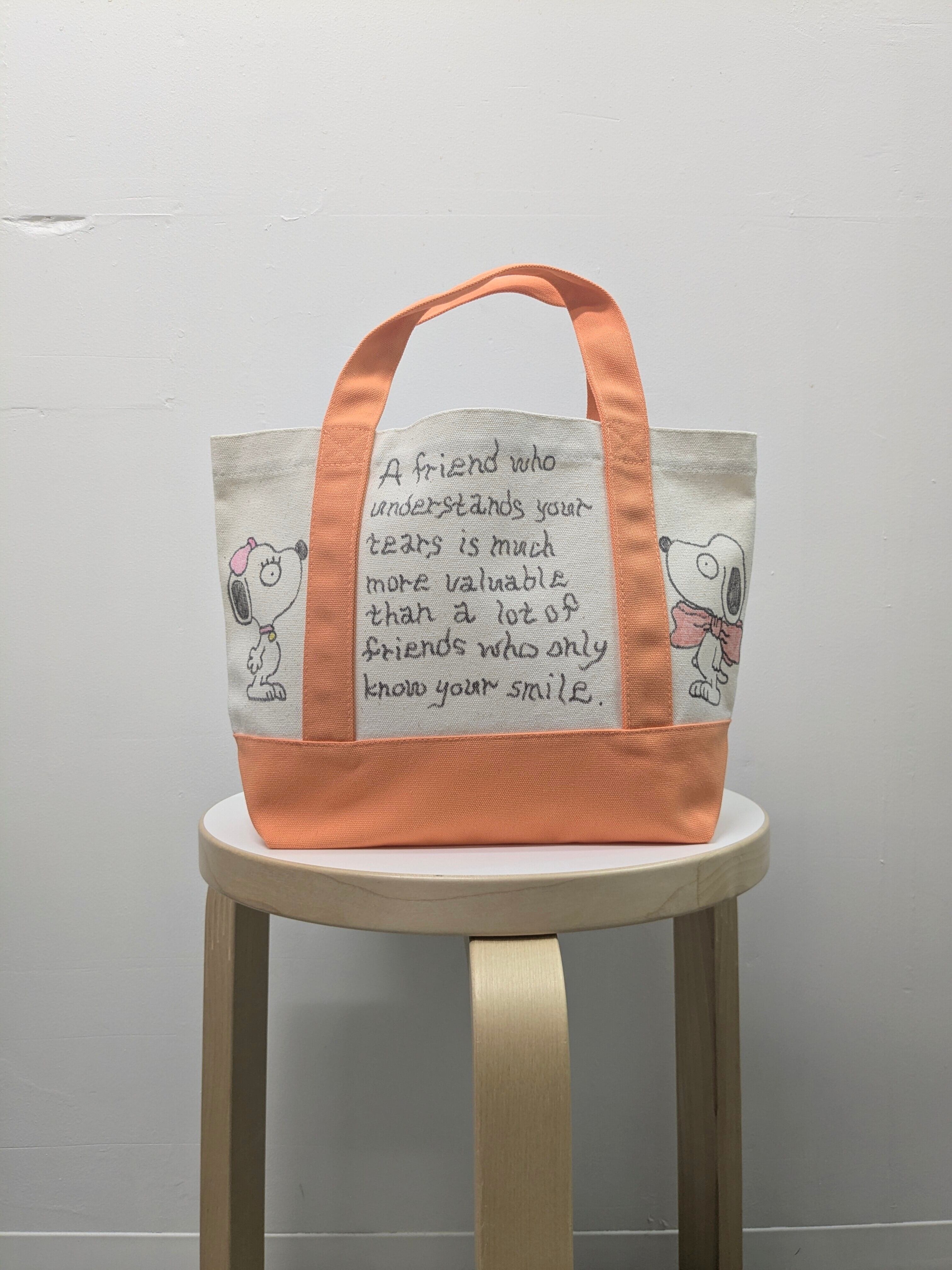 キャンバスのトートバッグにイラストを加えています。メモリアルの要素があり、どこか見たことあるキャラクターがいたりと、とにかく可愛いアイテム。全て手作業になるので、唯一無二の一点物となります。