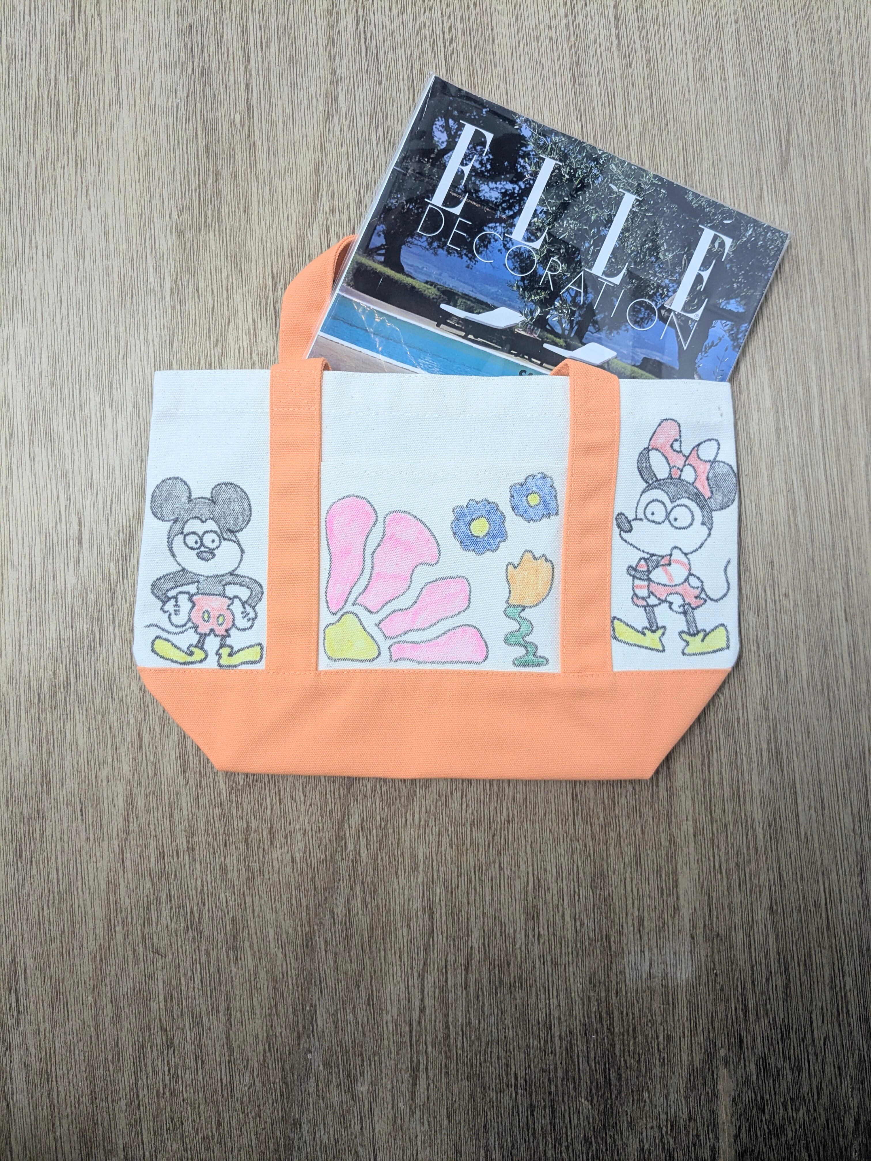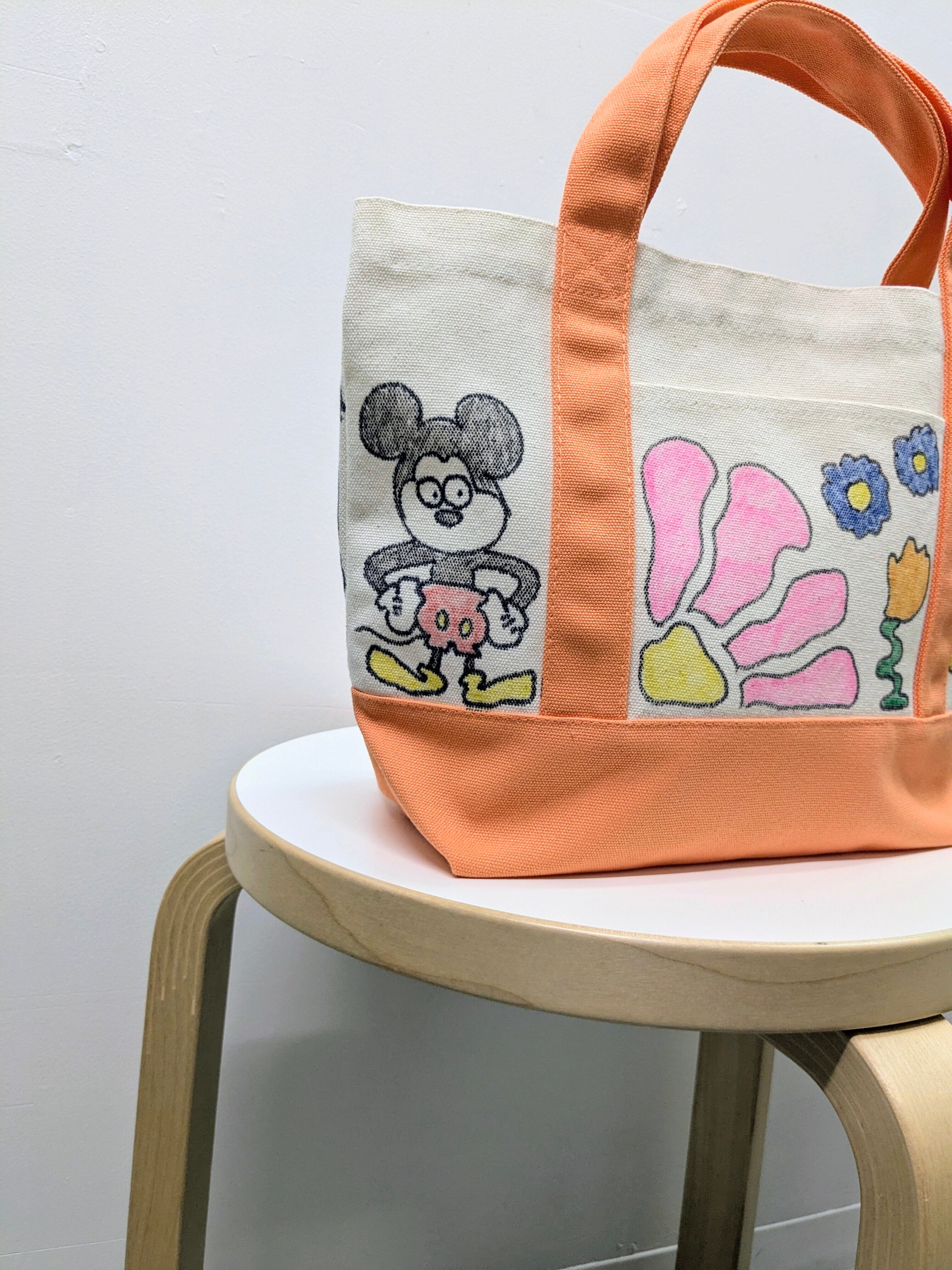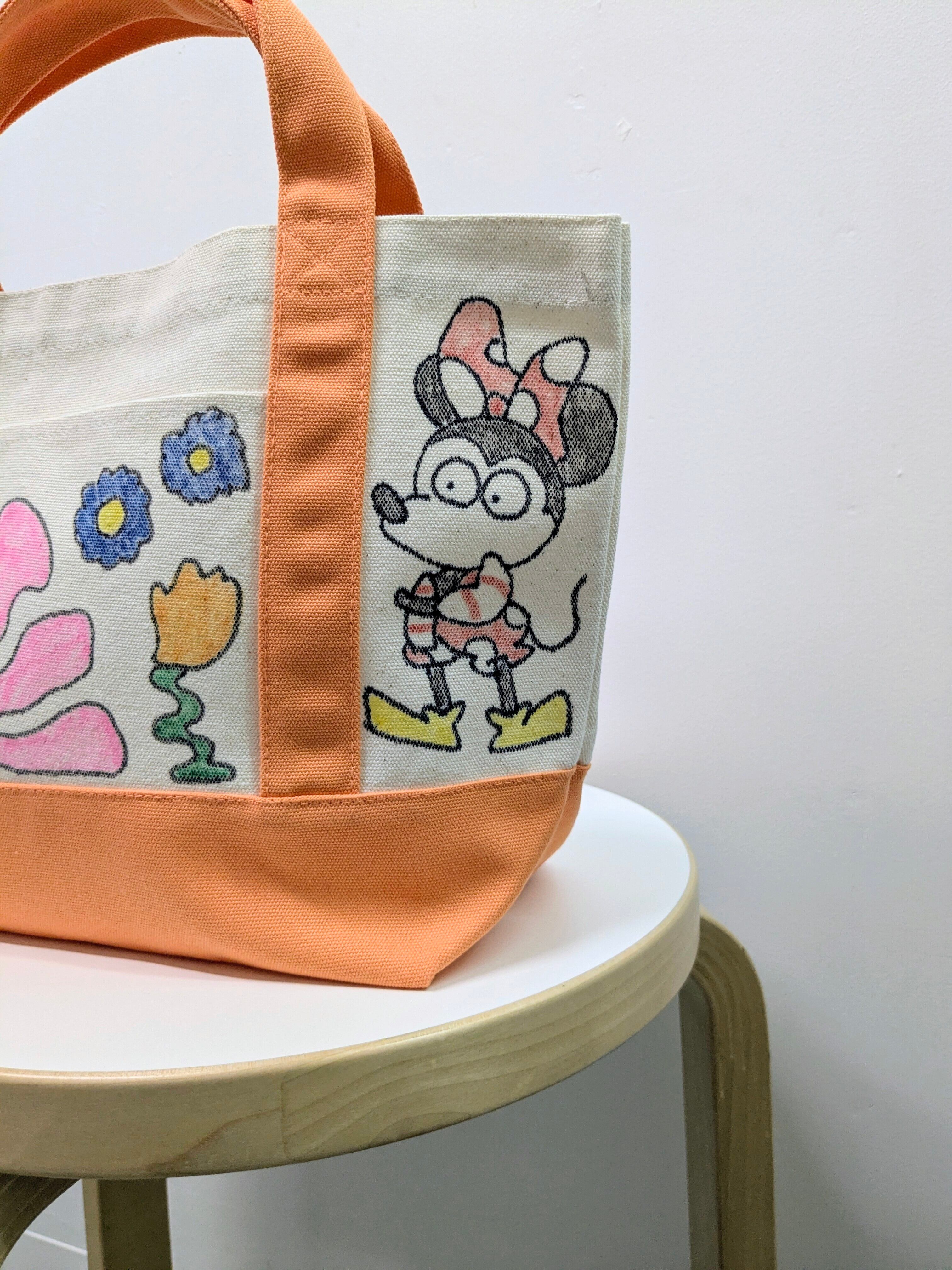 キャンバスのトートバッグにイラストを加えています。メモリアルの要素があり、どこか見たことあるキャラクターがいたりと、とにかく可愛いアイテム。全て手作業になるので、唯一無二の一点物となります。