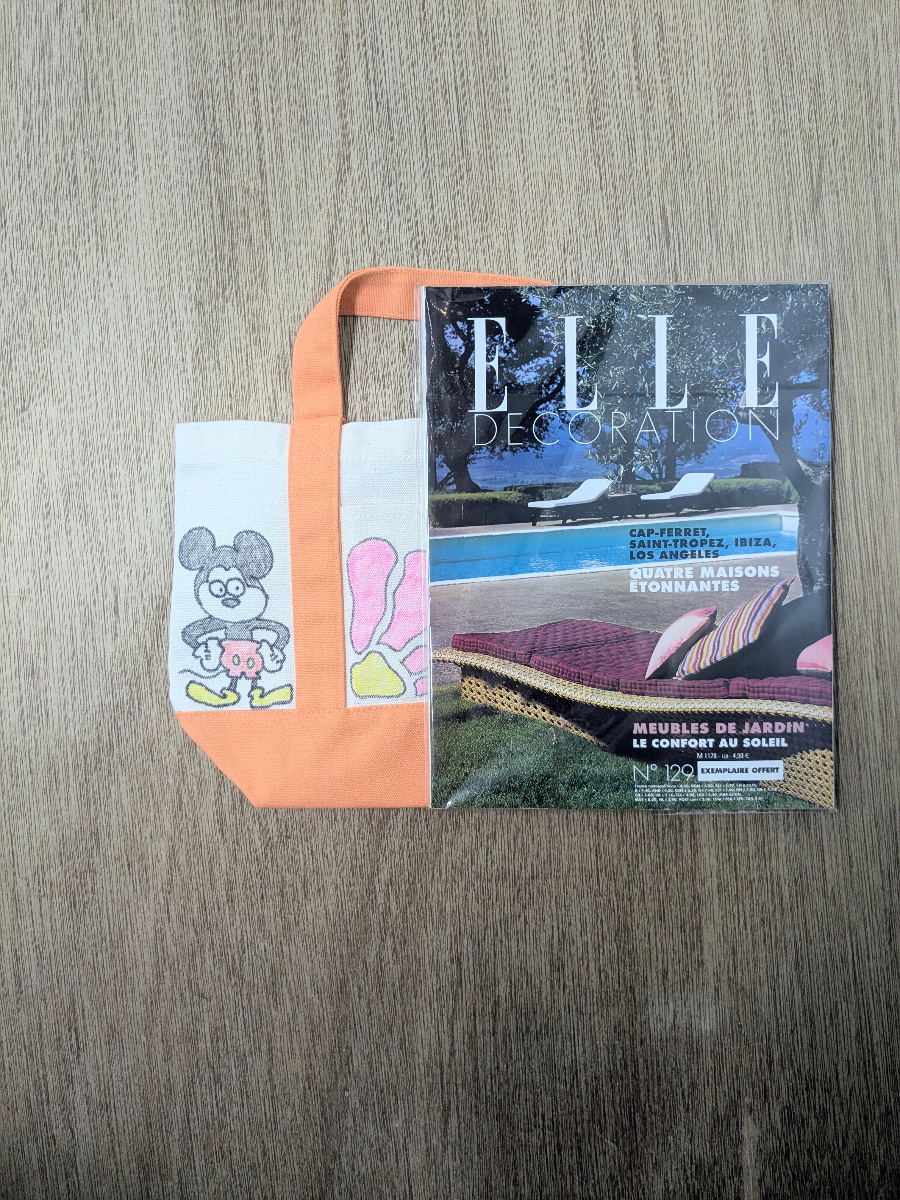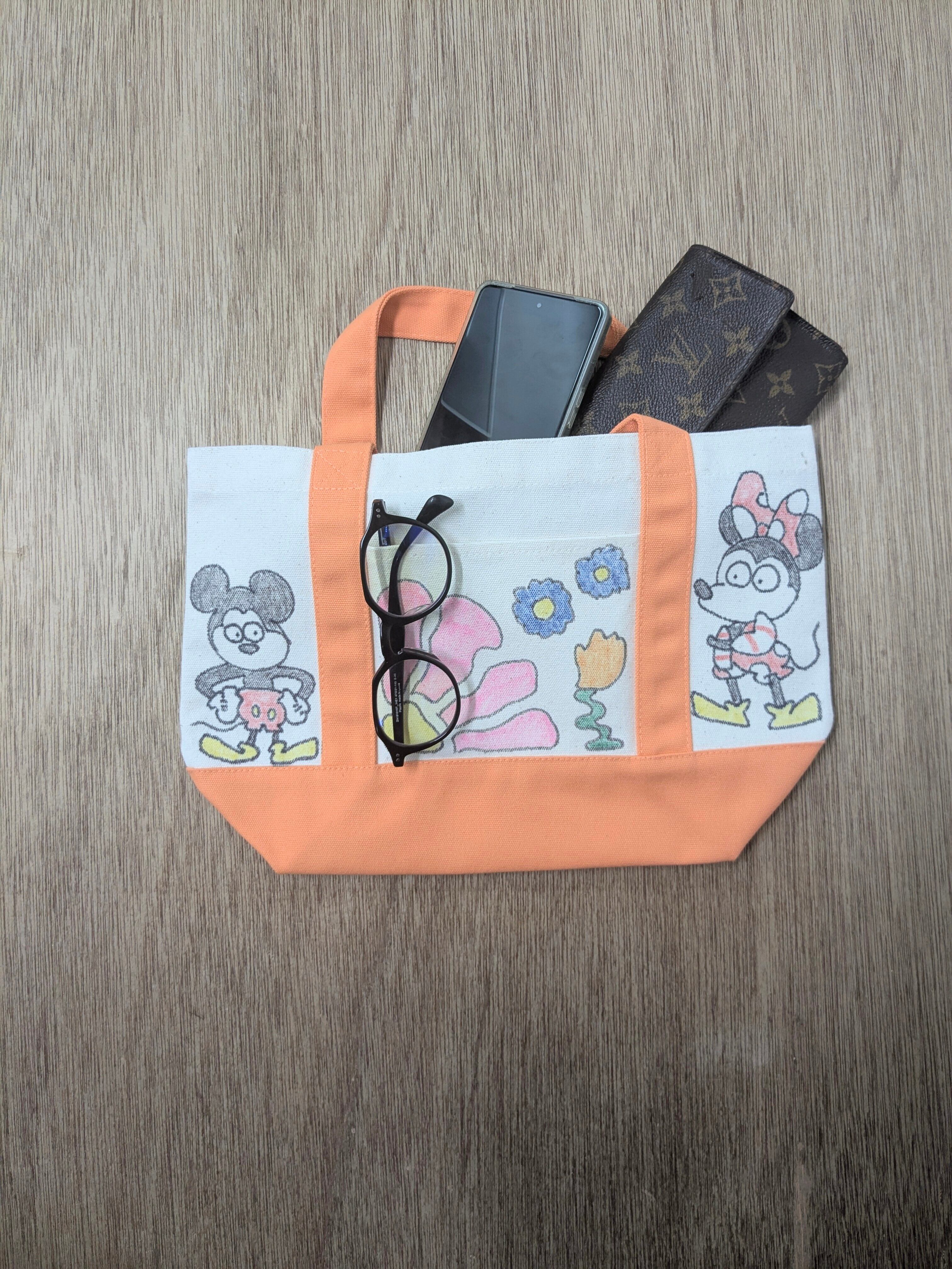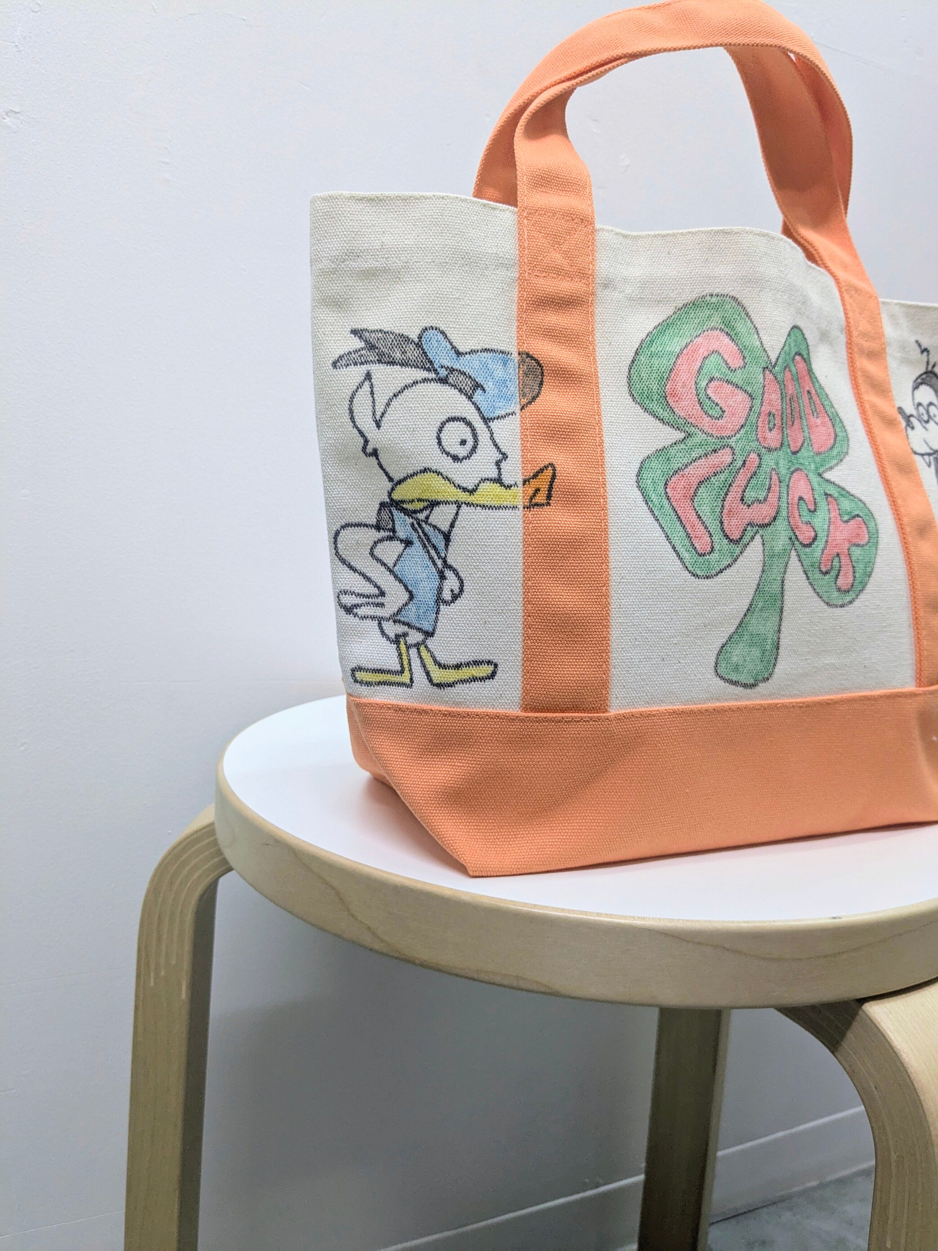 キャンバスのトートバッグにイラストを加えています。メモリアルの要素があり、どこか見たことあるキャラクターがいたりと、とにかく可愛いアイテム。全て手作業になるので、唯一無二の一点物となります。