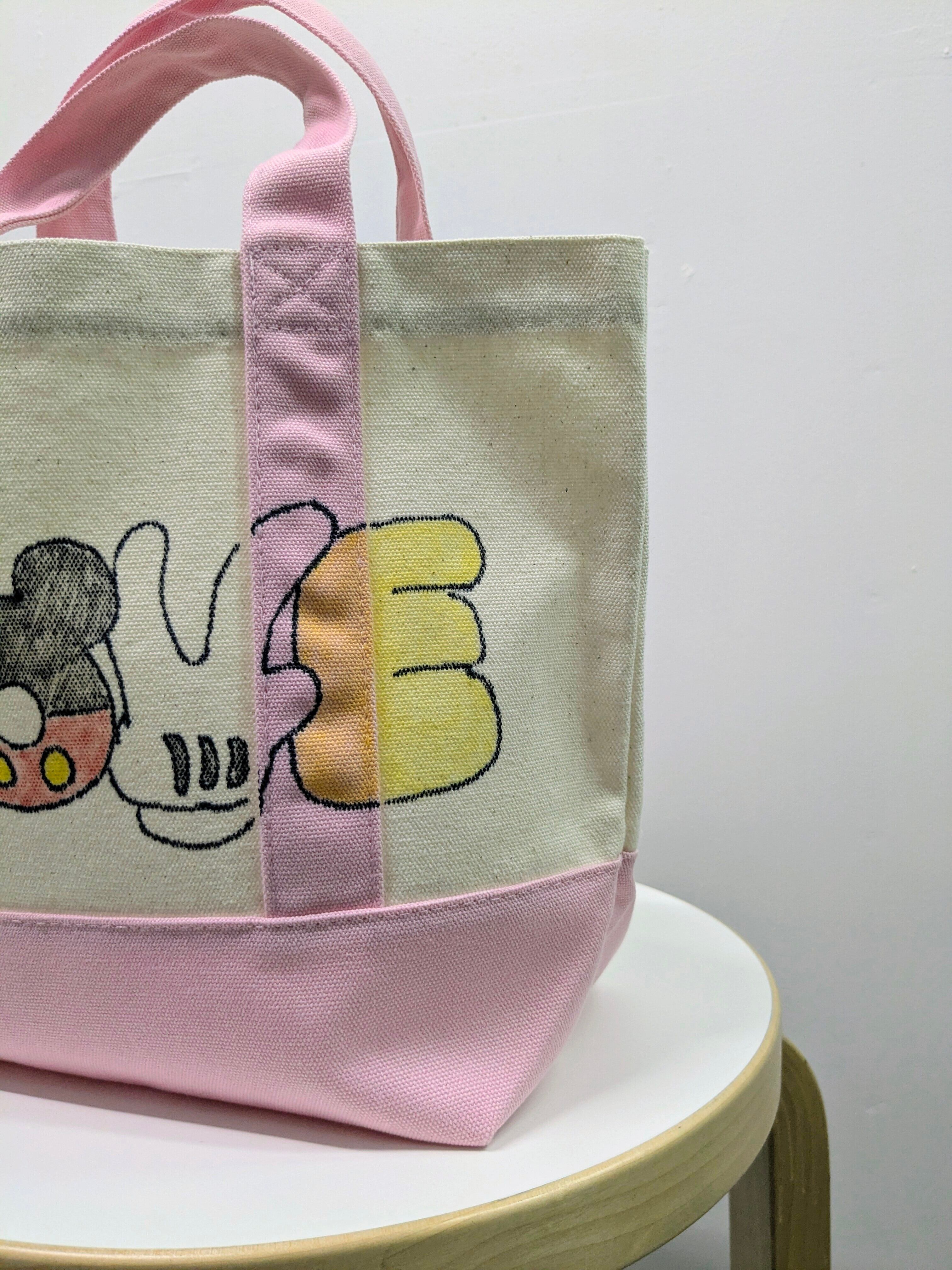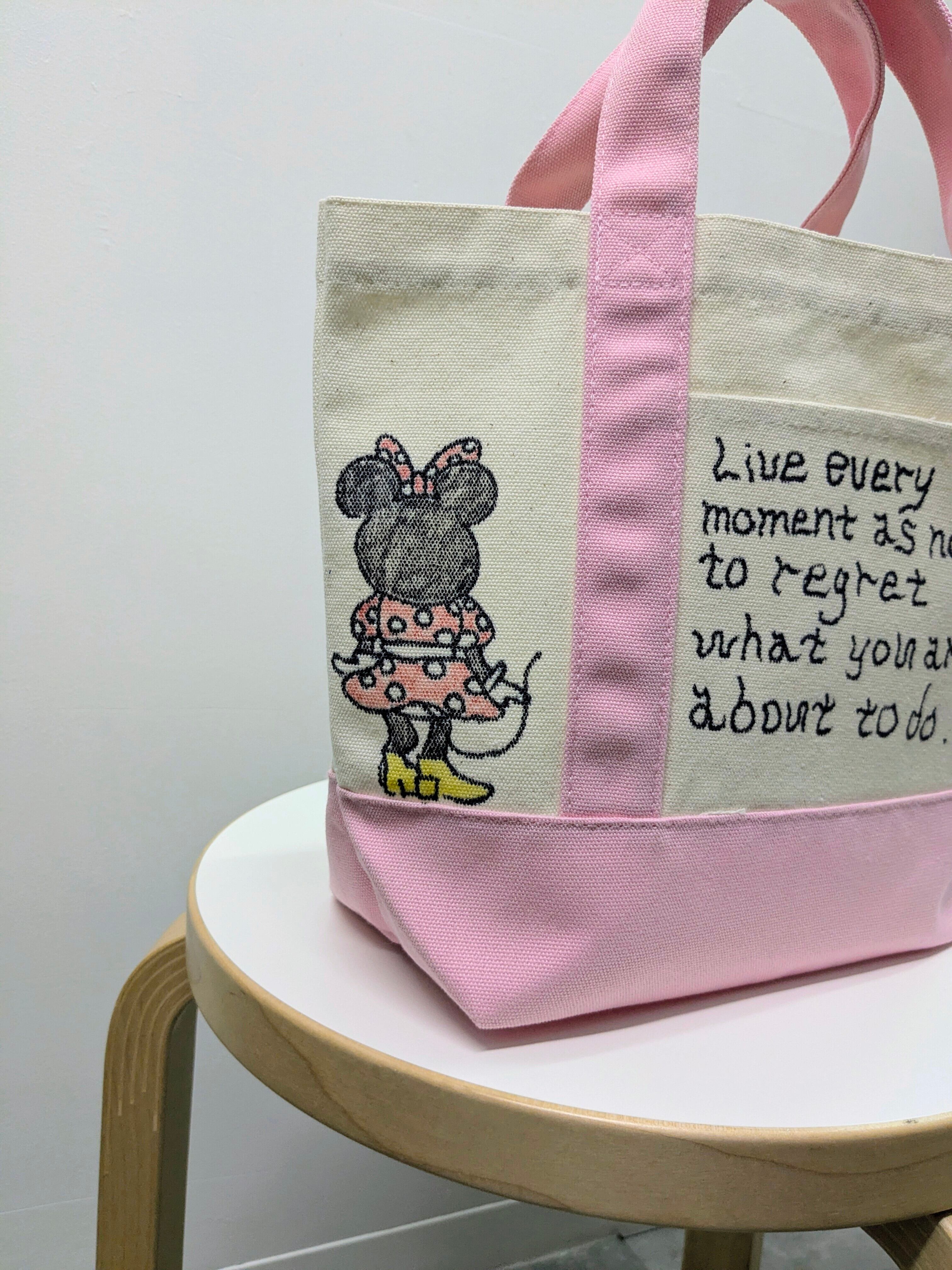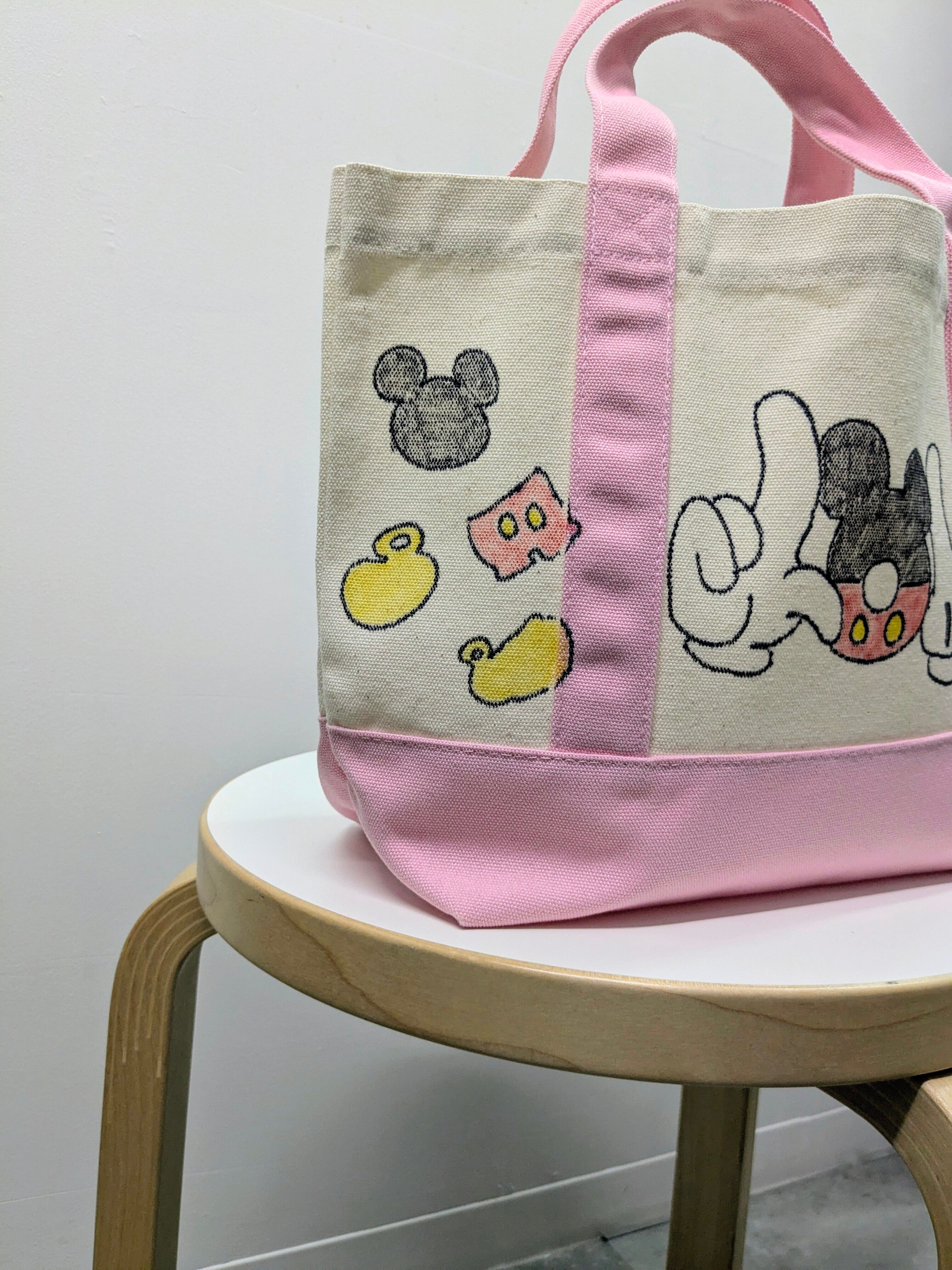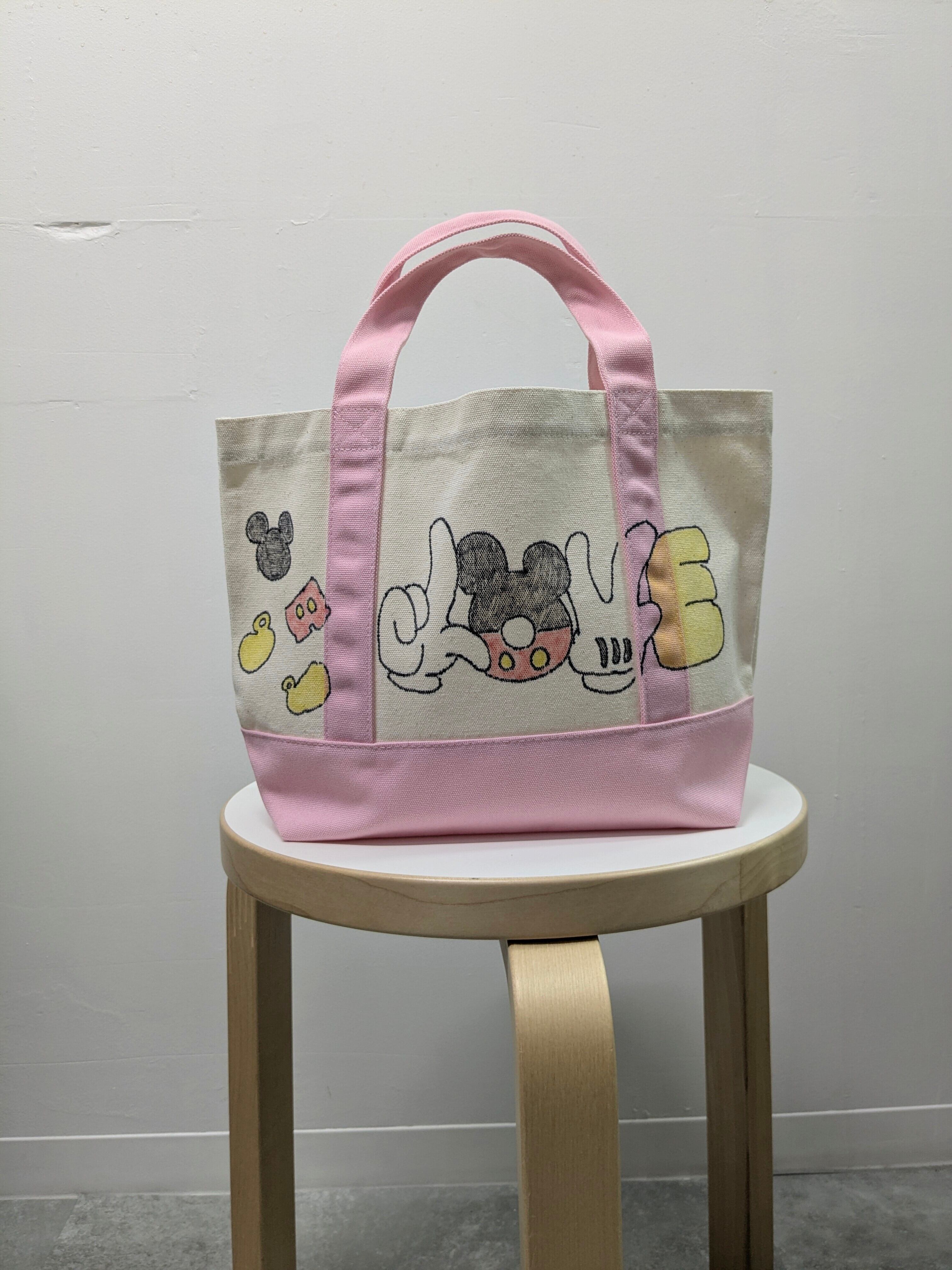 キャンバスのトートバッグにイラストを加えています。メモリアルの要素があり、どこか見たことあるキャラクターがいたりと、とにかく可愛いアイテム。全て手作業になるので、唯一無二の一点物となります。