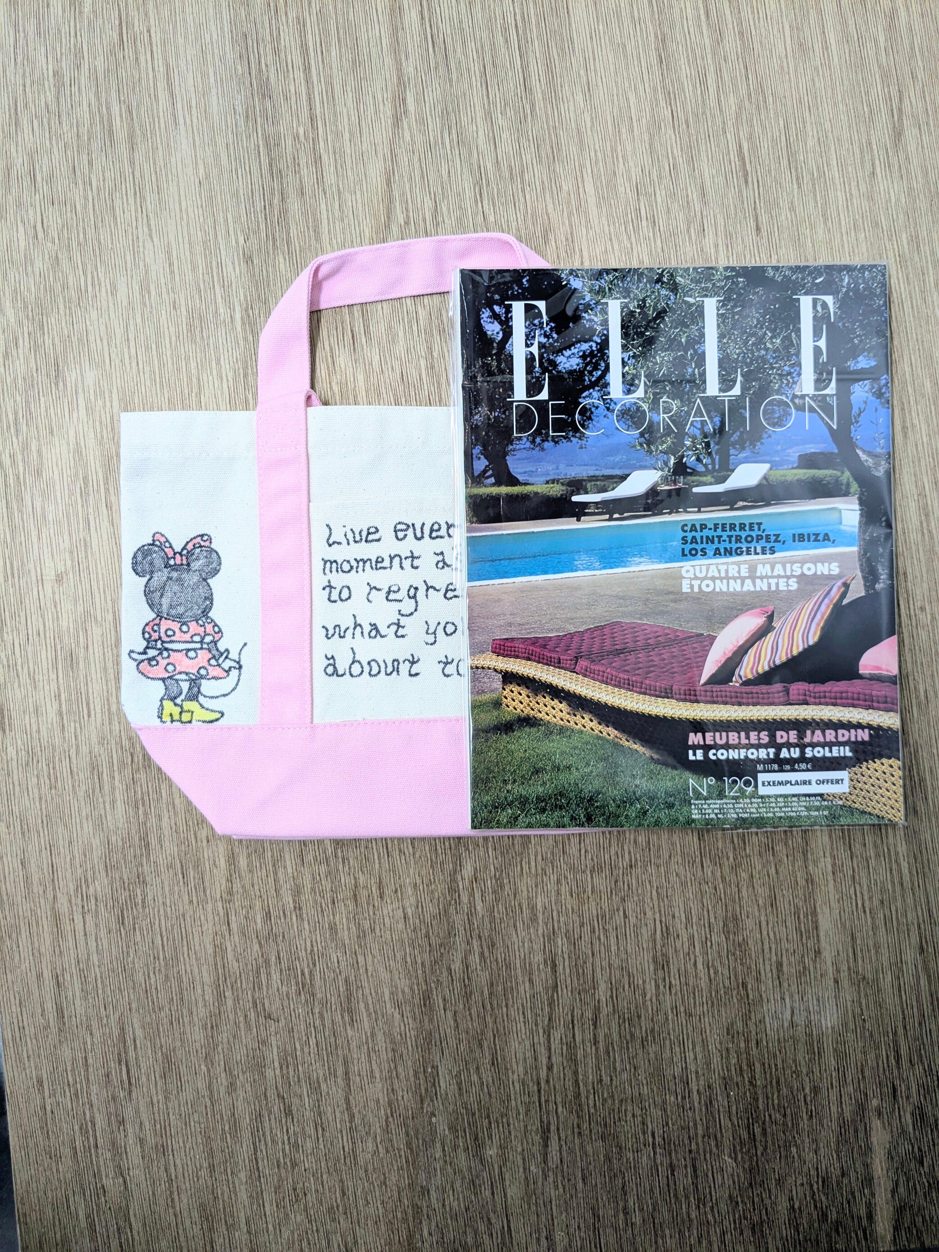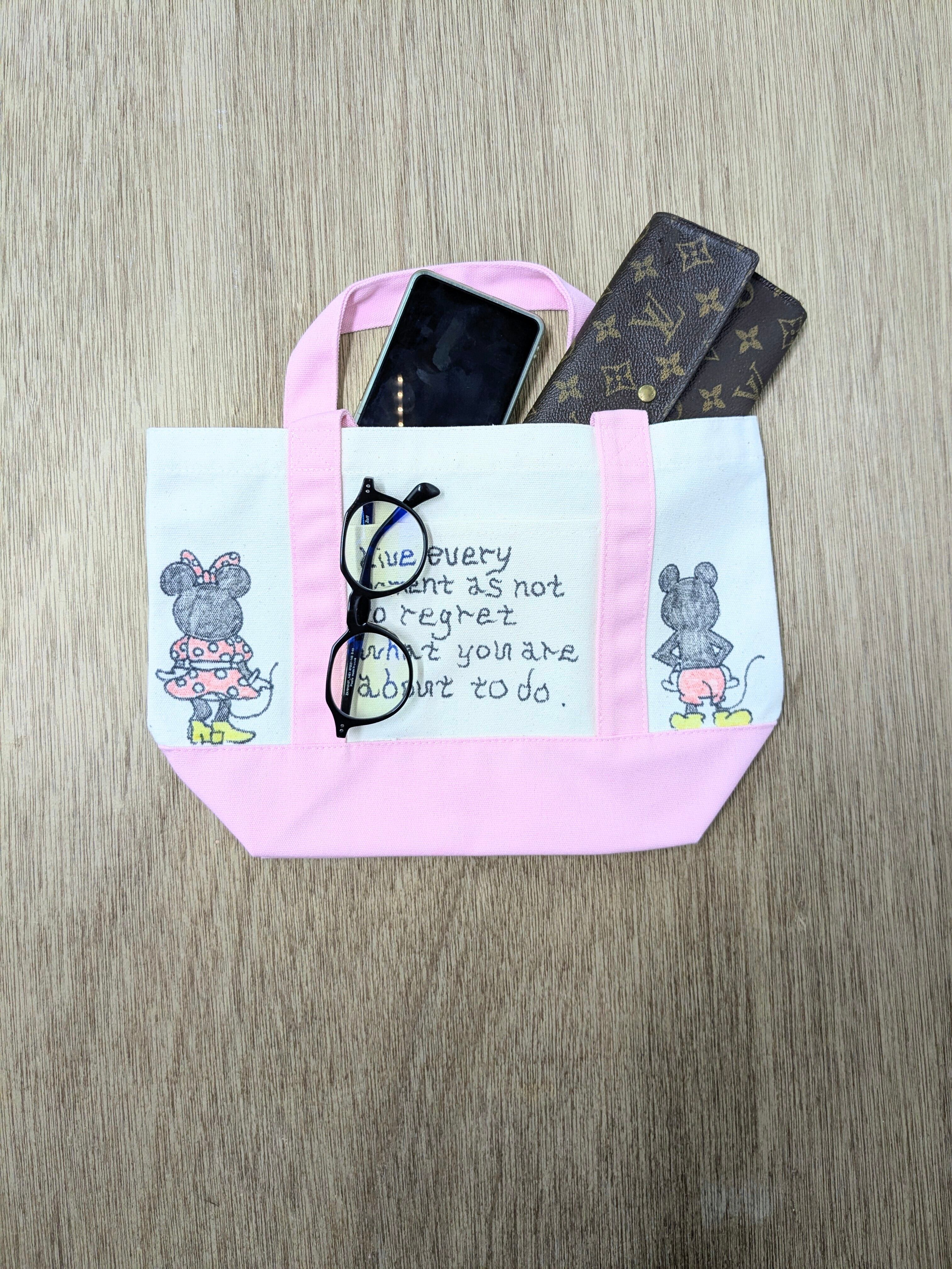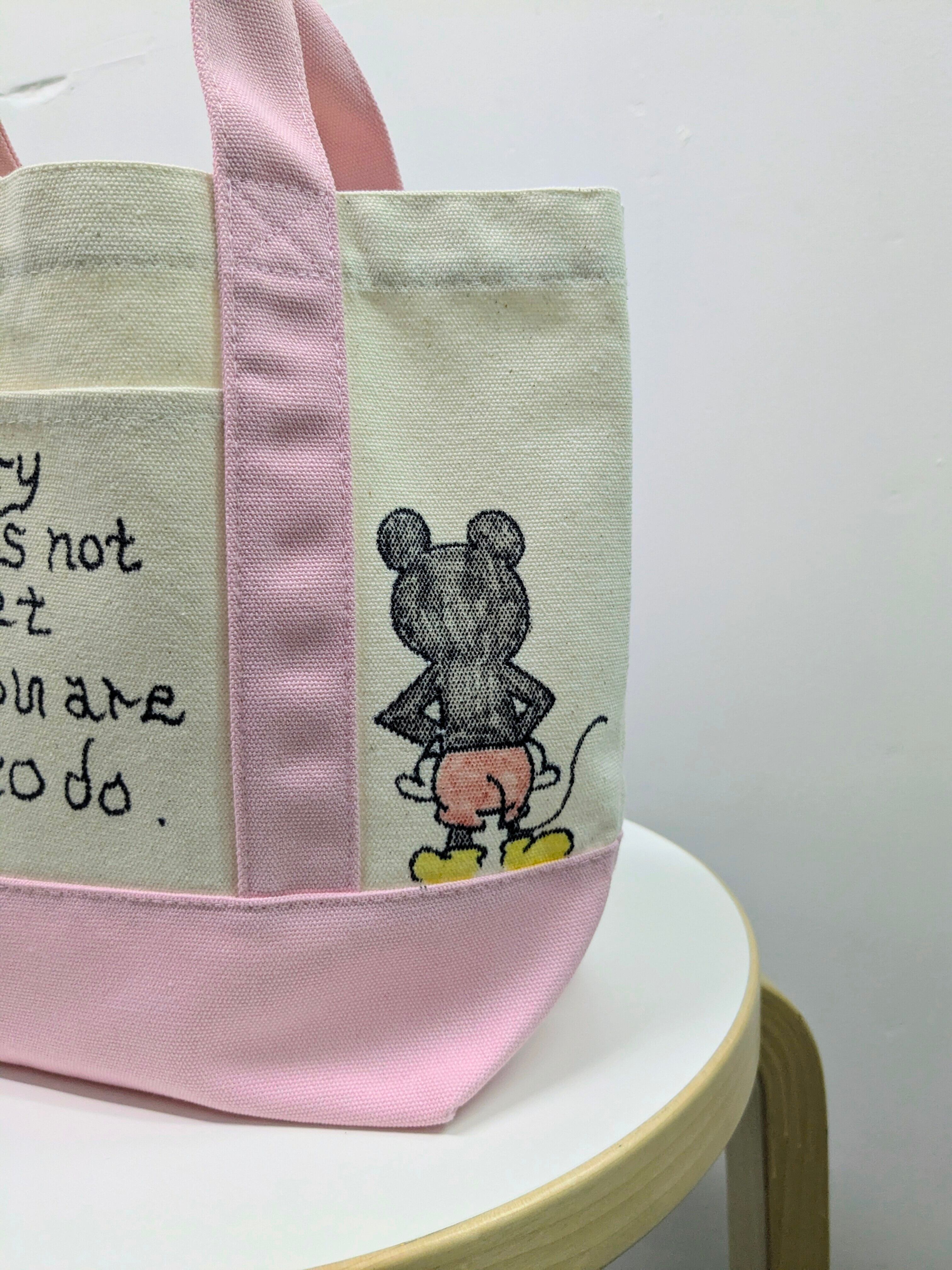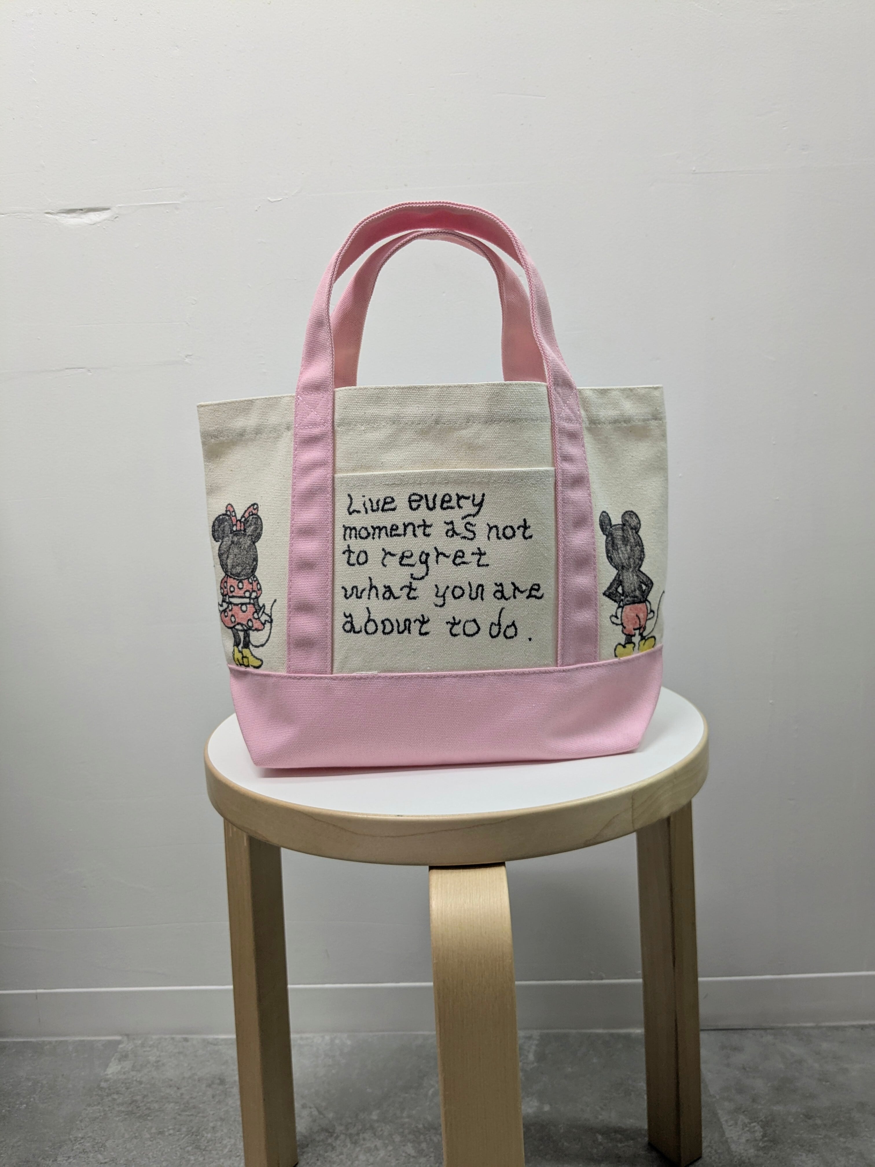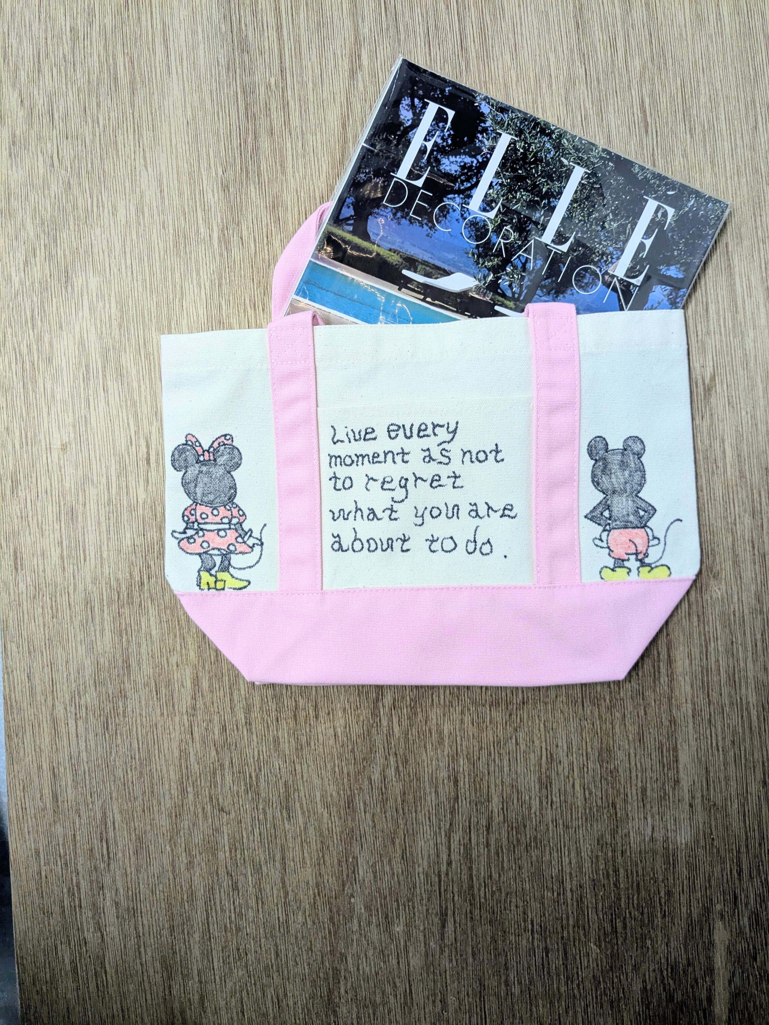 キャンバスのトートバッグにイラストを加えています。メモリアルの要素があり、どこか見たことあるキャラクターがいたりと、とにかく可愛いアイテム。全て手作業になるので、唯一無二の一点物となります。