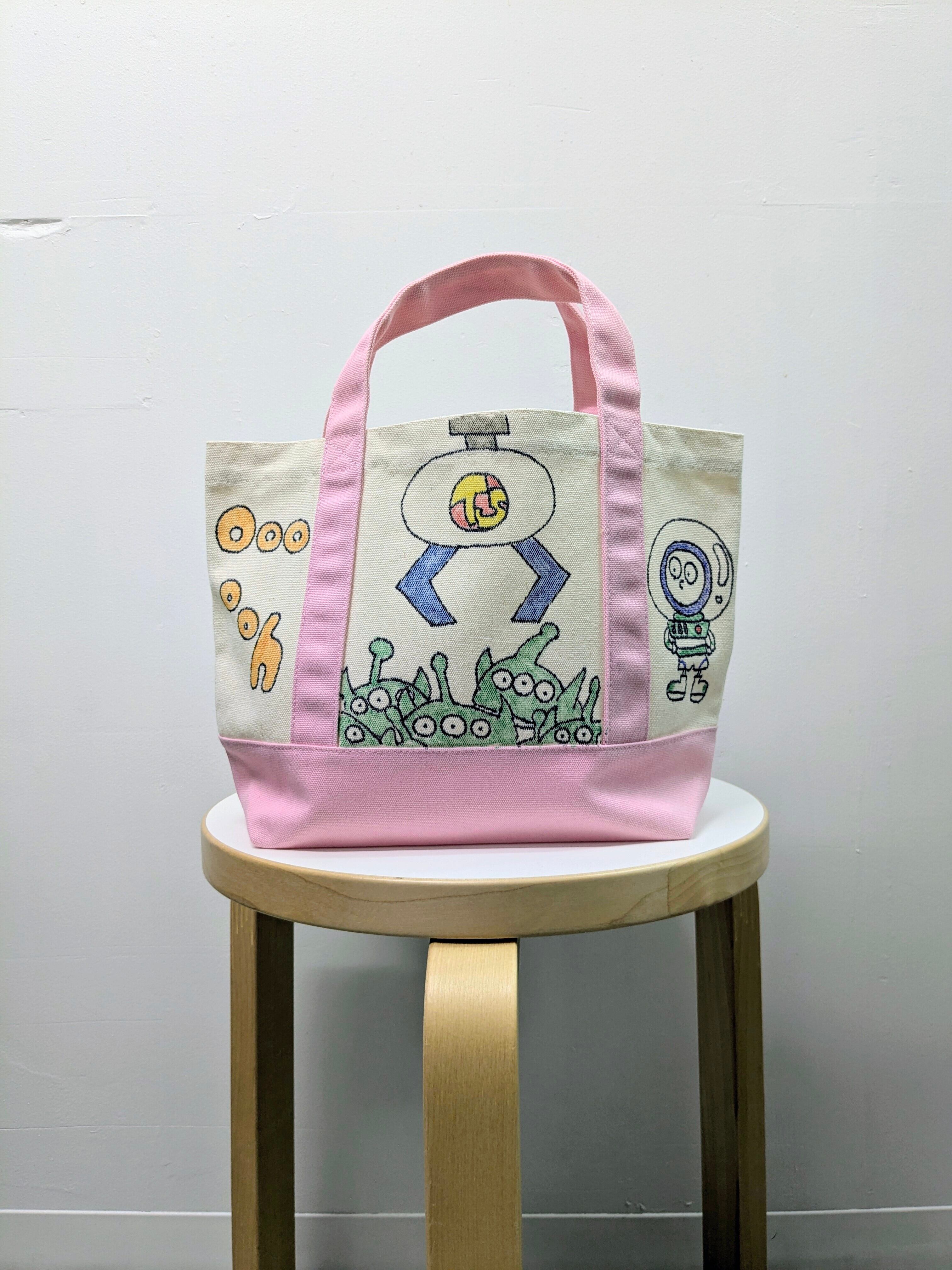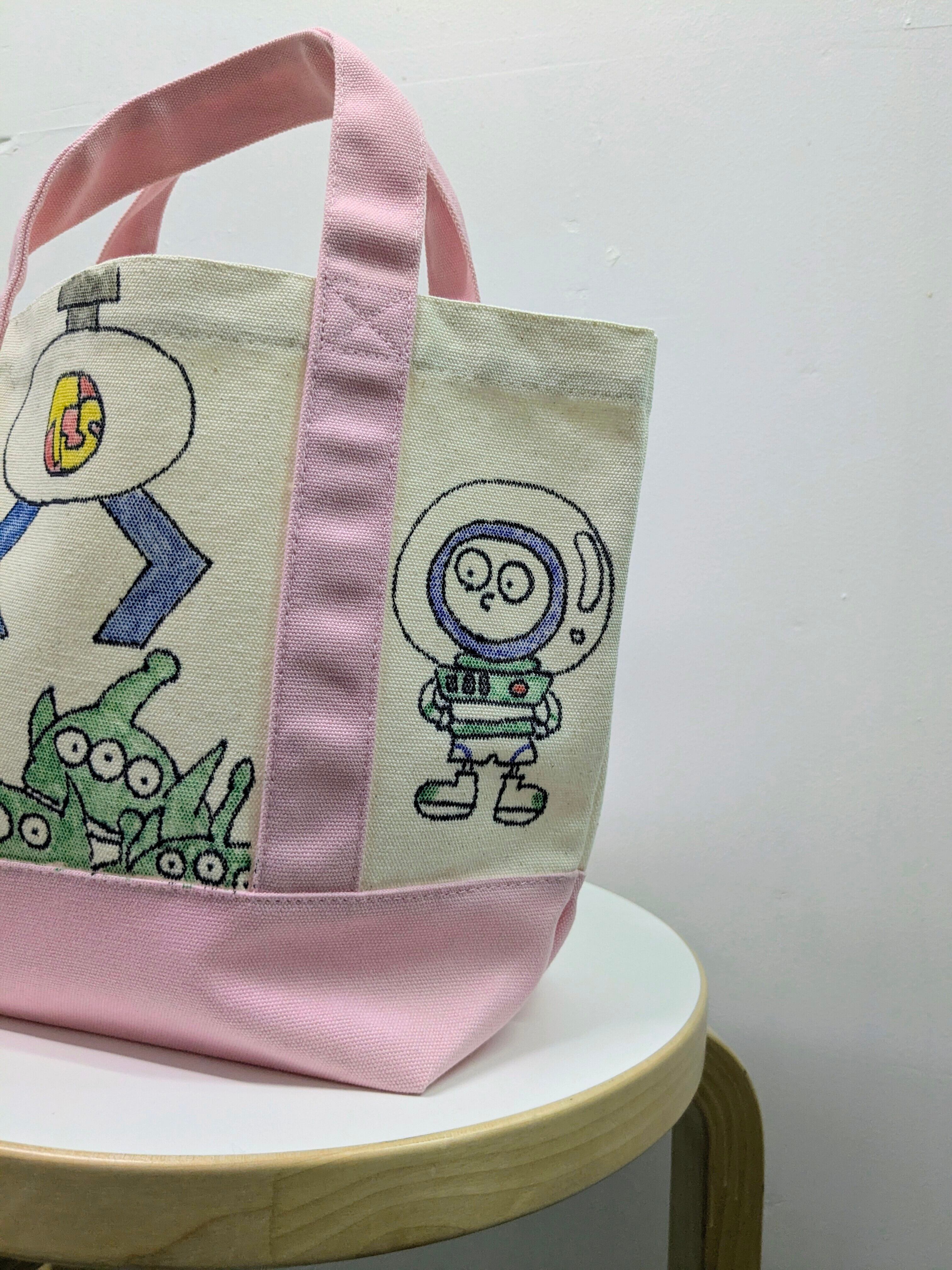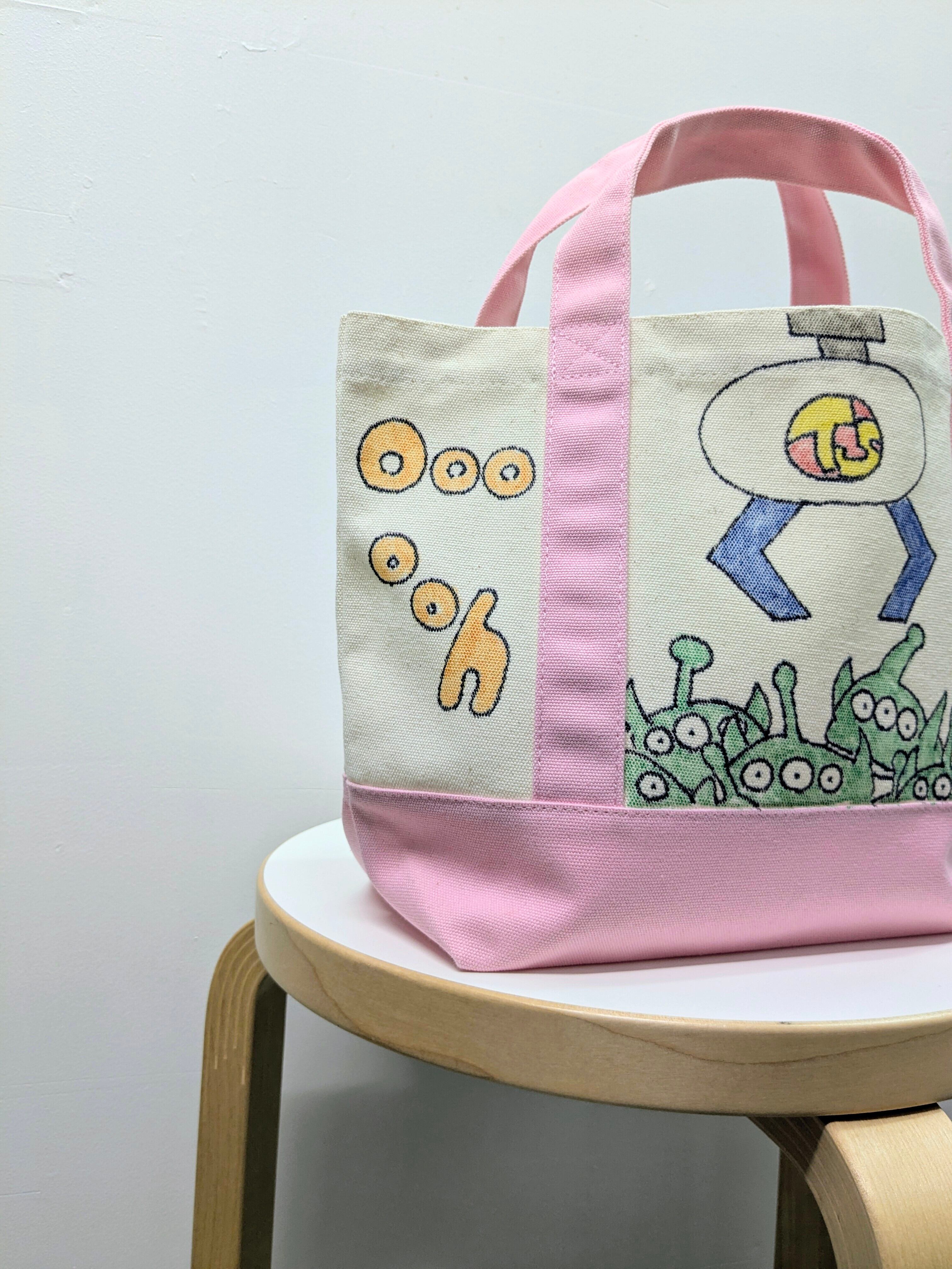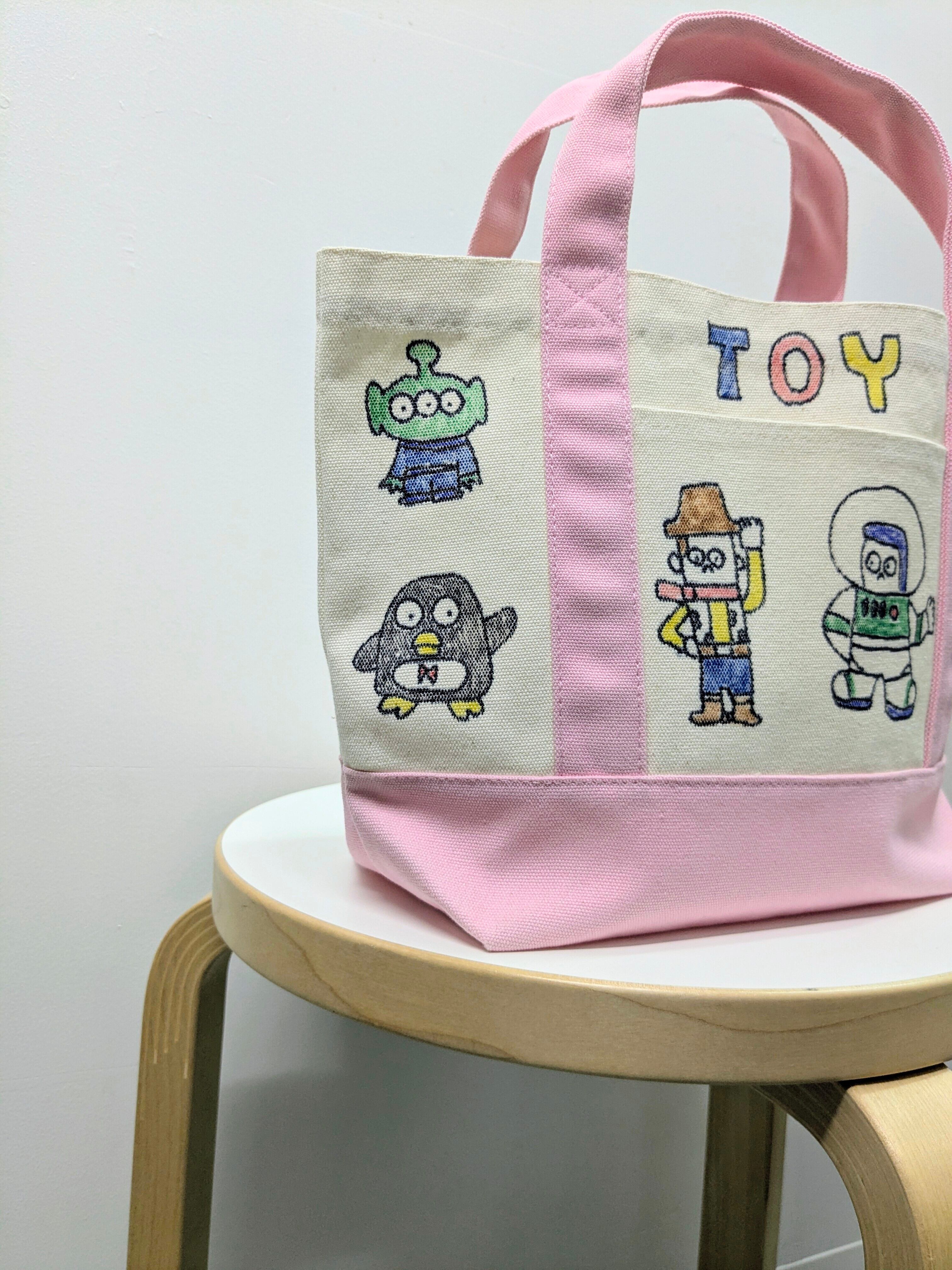 キャンバスのトートバッグにイラストを加えています。メモリアルの要素があり、どこか見たことあるキャラクターがいたりと、とにかく可愛いアイテム。全て手作業になるので、唯一無二の一点物となります。