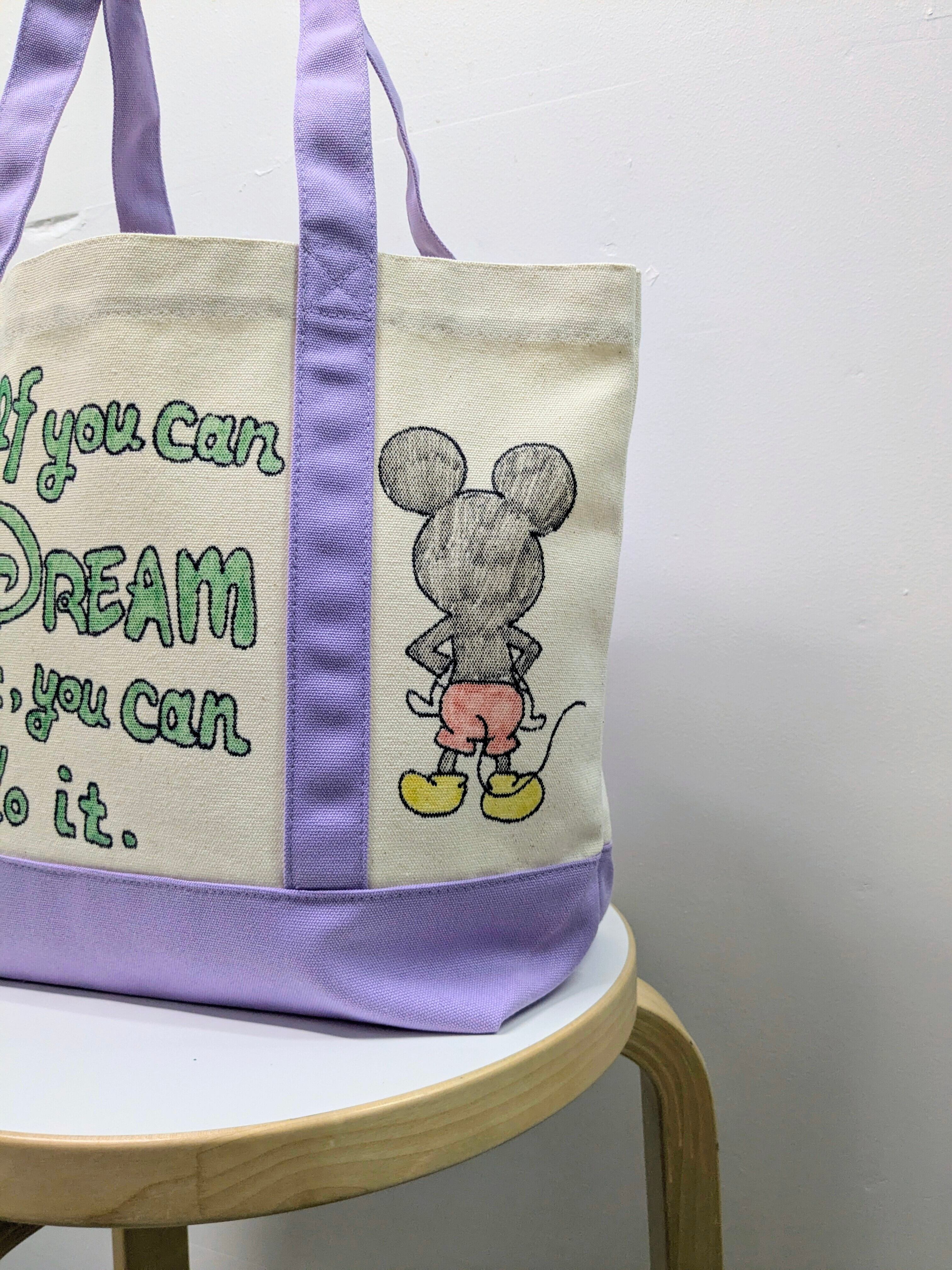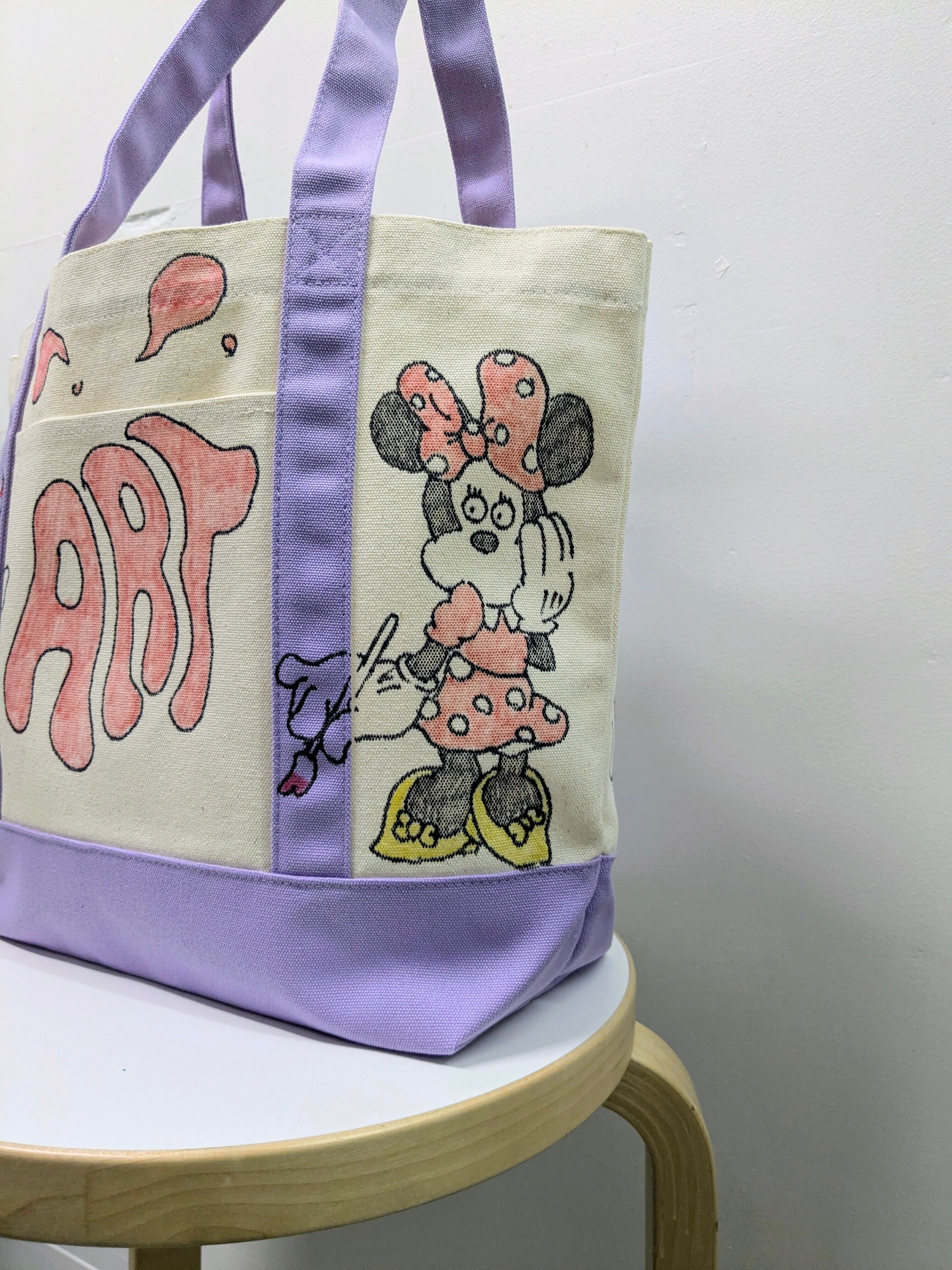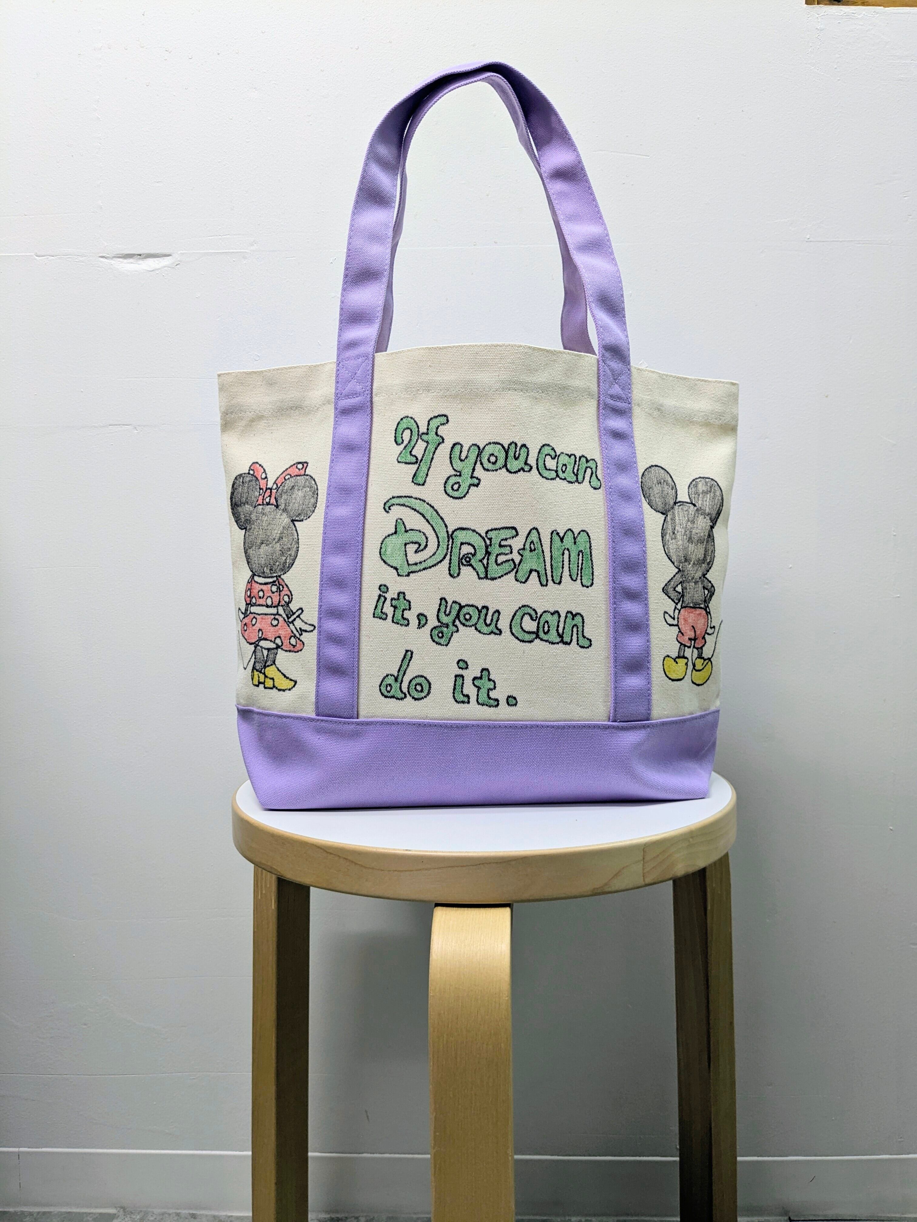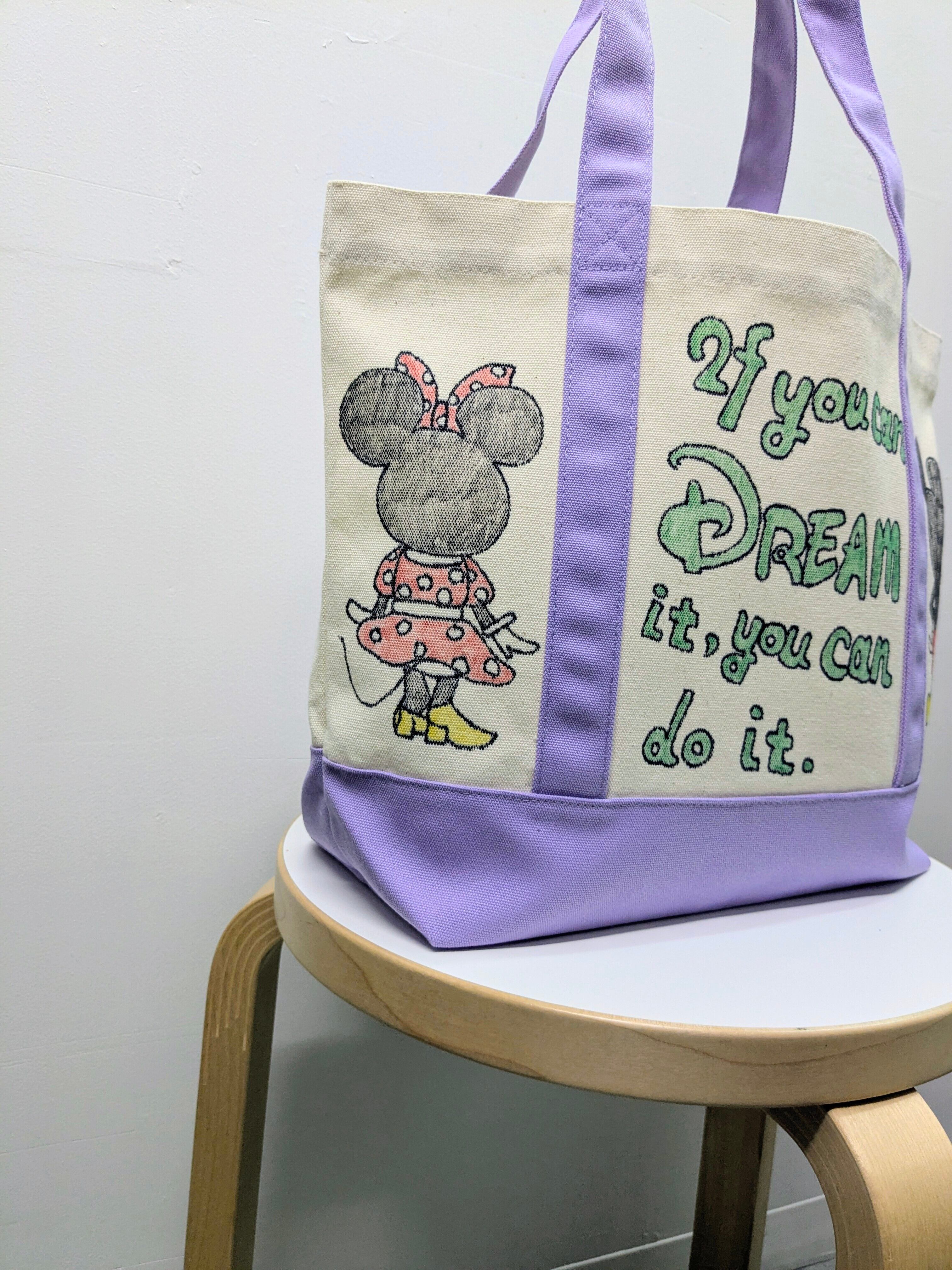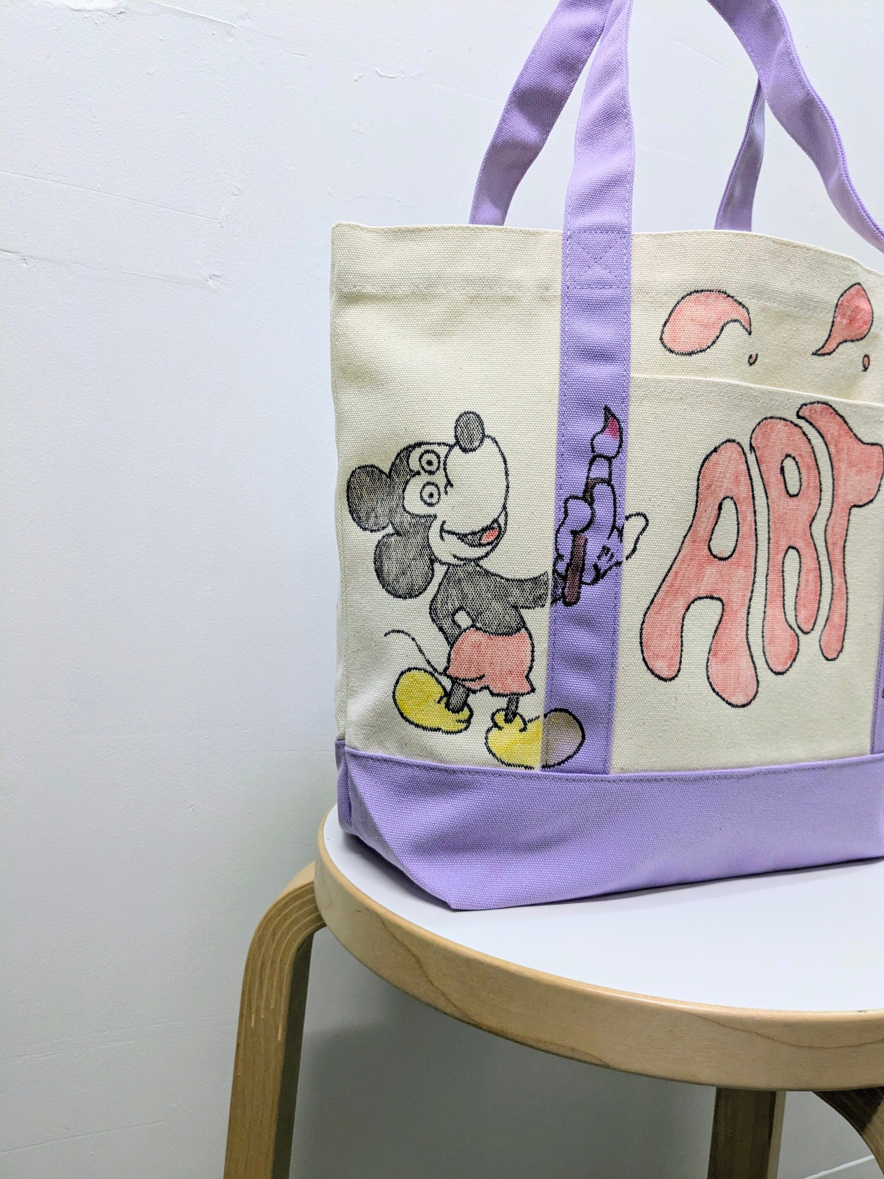 キャンバスのトートバッグにイラストを加えています。メモリアルの要素があり、どこか見たことあるキャラクターがいたりと、とにかく可愛いアイテム。全て手作業になるので、唯一無二の一点物となります。
