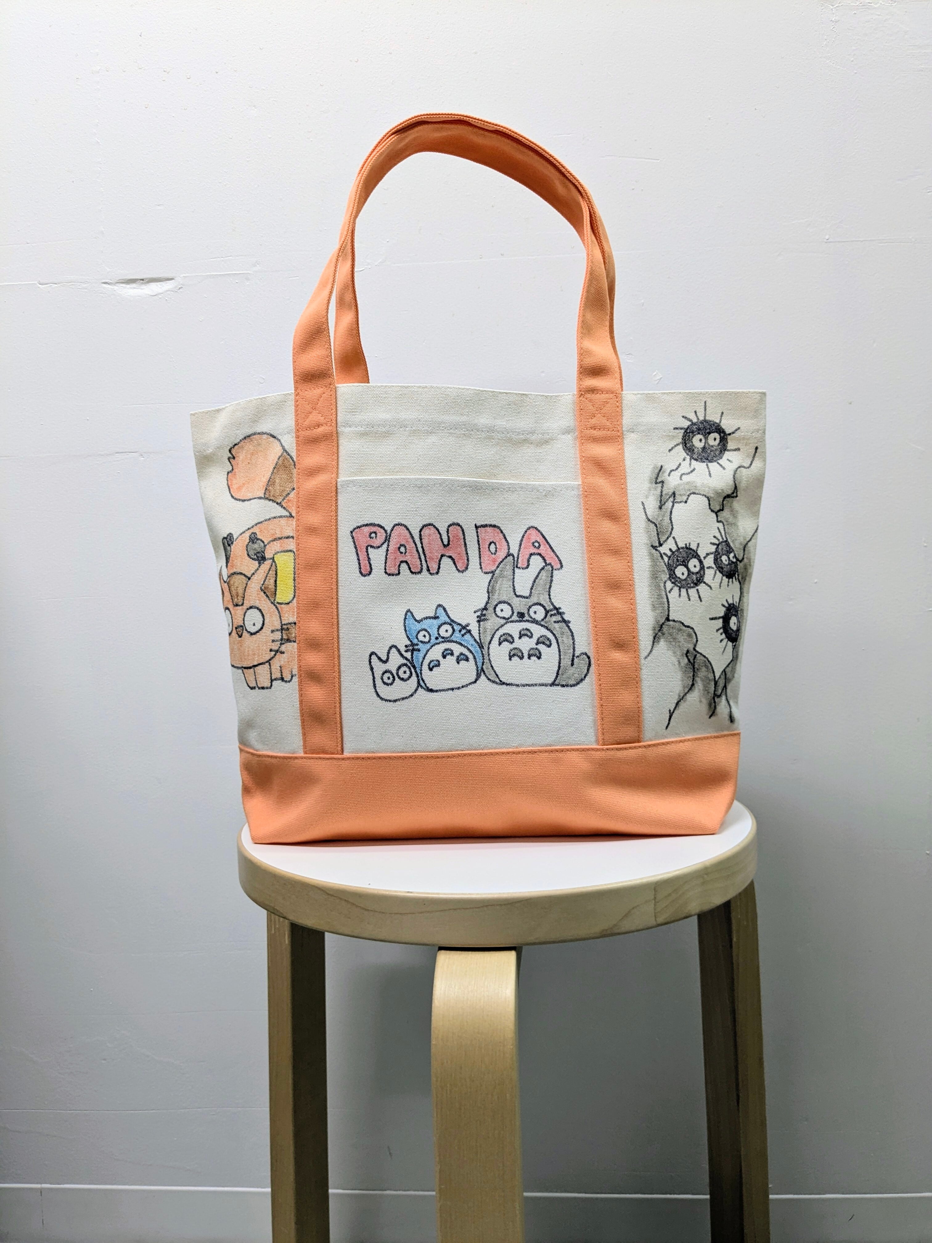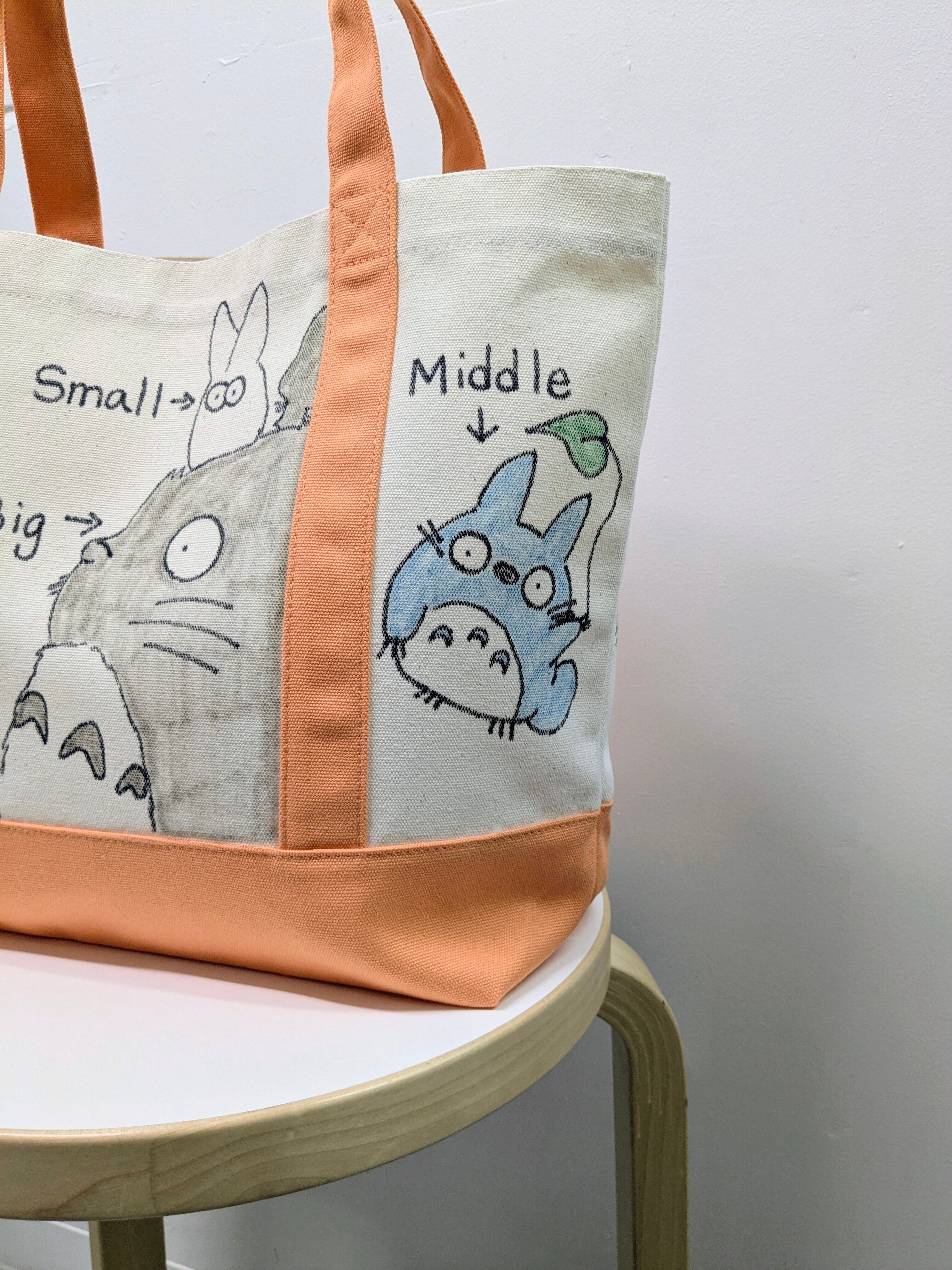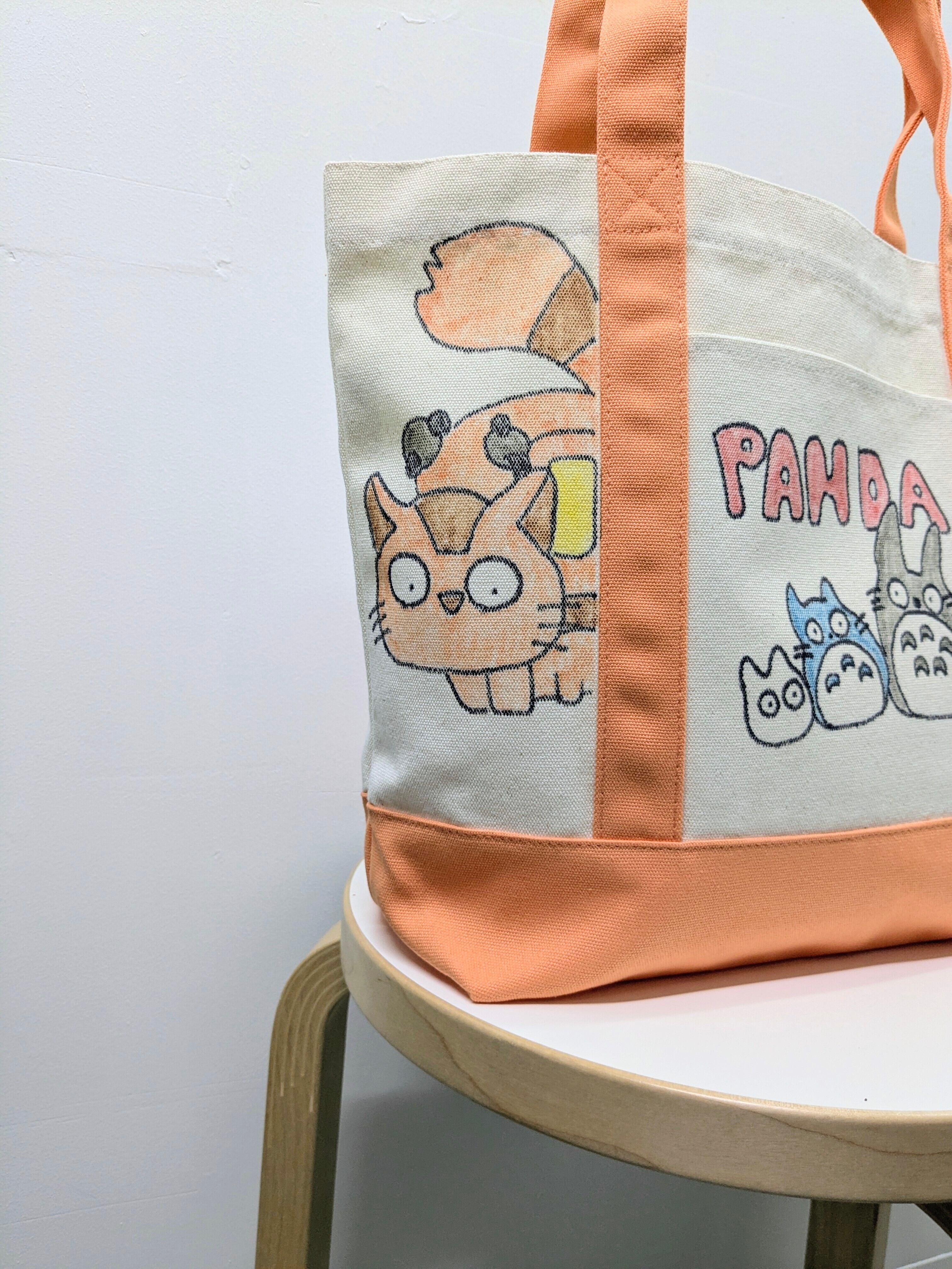 キャンバスのトートバッグにイラストを加えています。メモリアルの要素があり、どこか見たことあるキャラクターがいたりと、とにかく可愛いアイテム。全て手作業になるので、唯一無二の一点物となります。