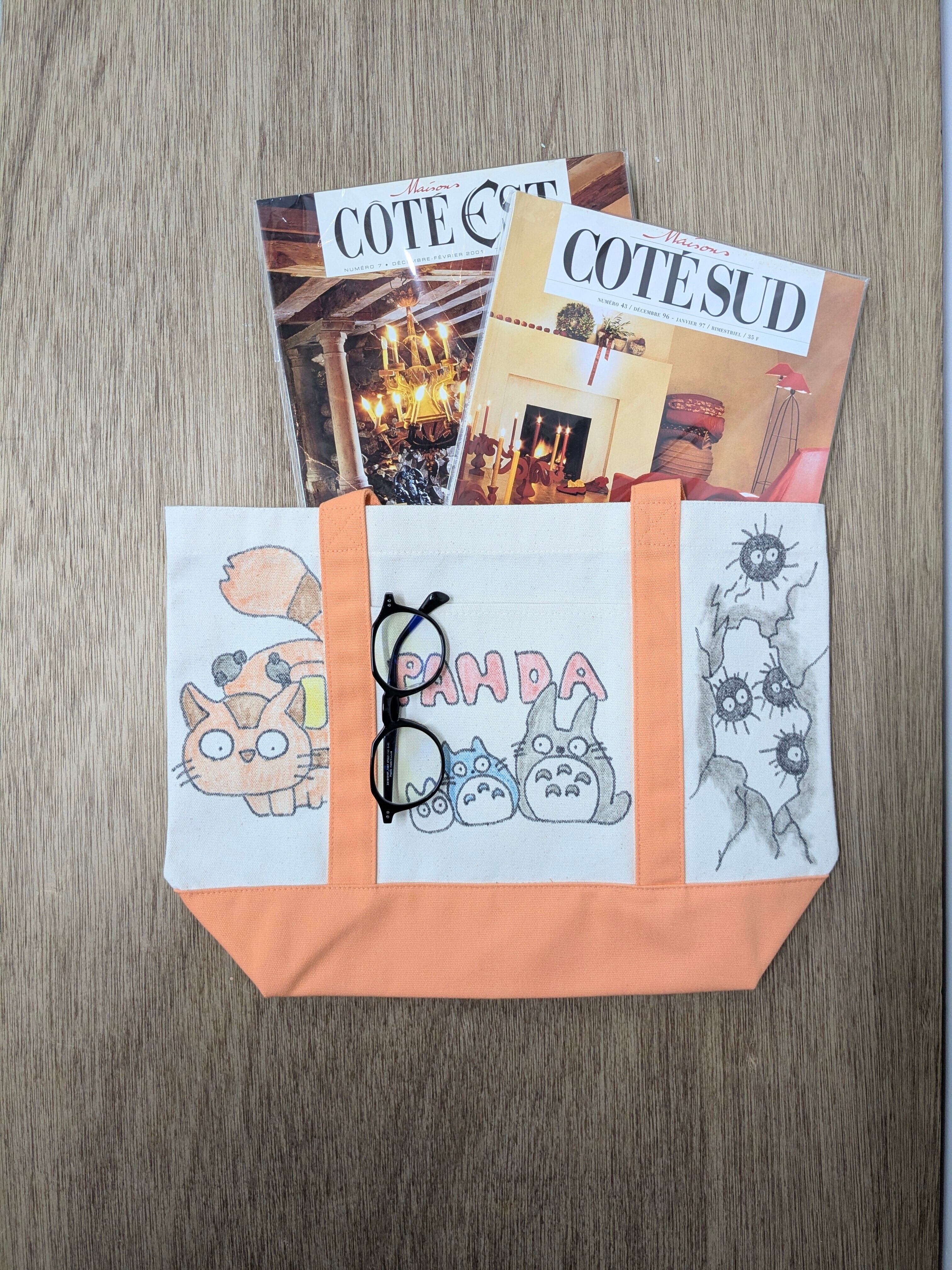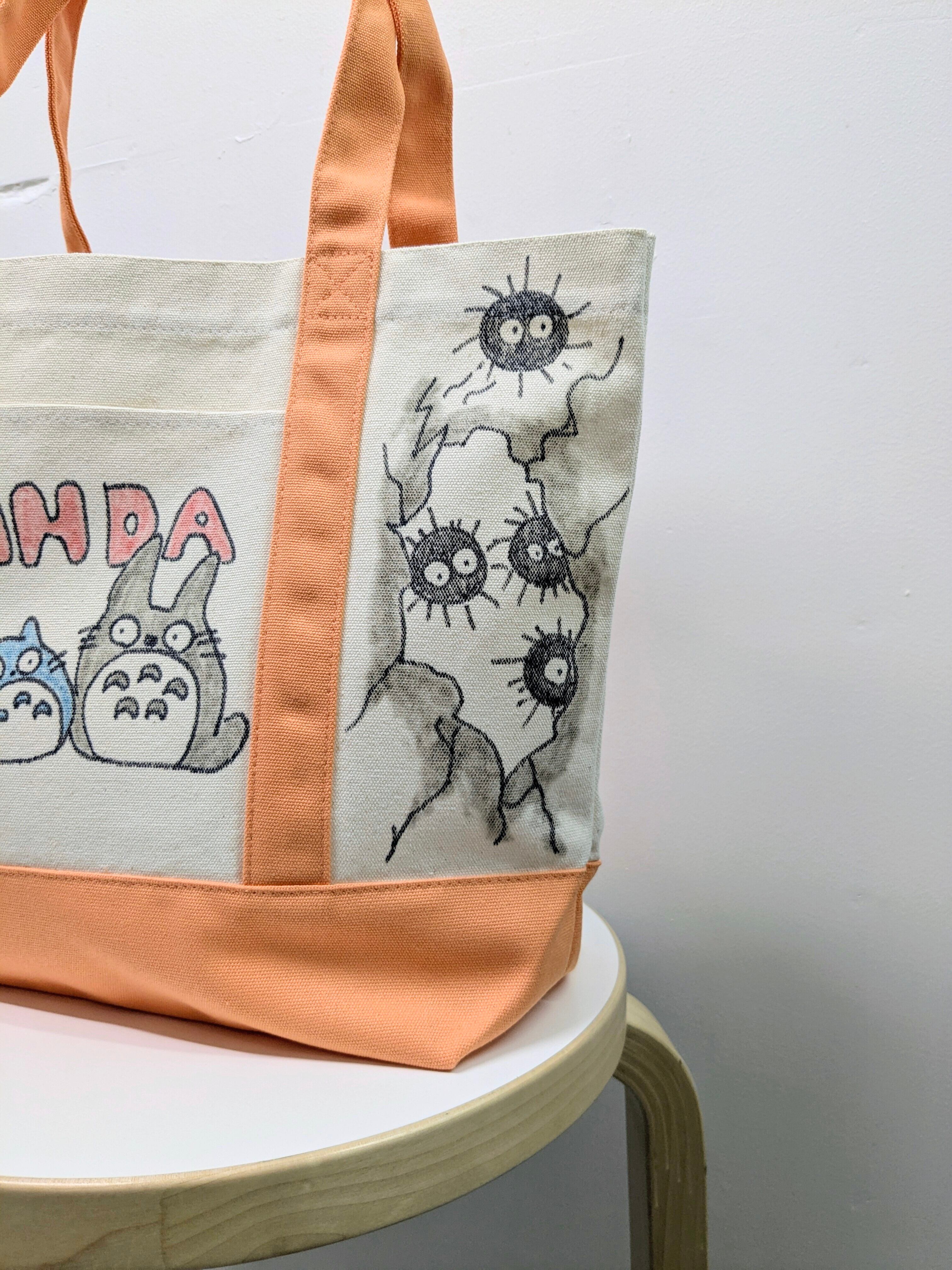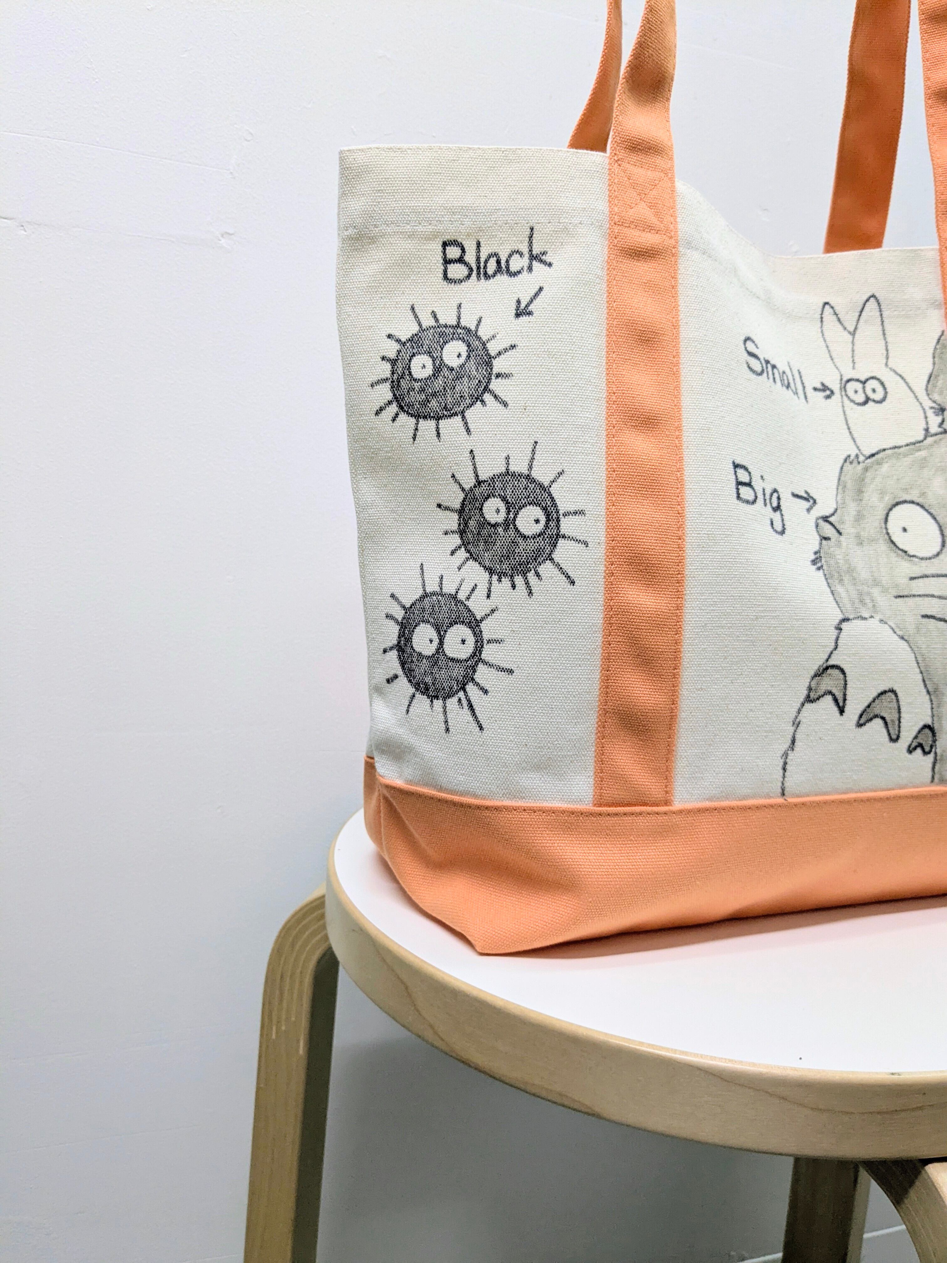 キャンバスのトートバッグにイラストを加えています。メモリアルの要素があり、どこか見たことあるキャラクターがいたりと、とにかく可愛いアイテム。全て手作業になるので、唯一無二の一点物となります。