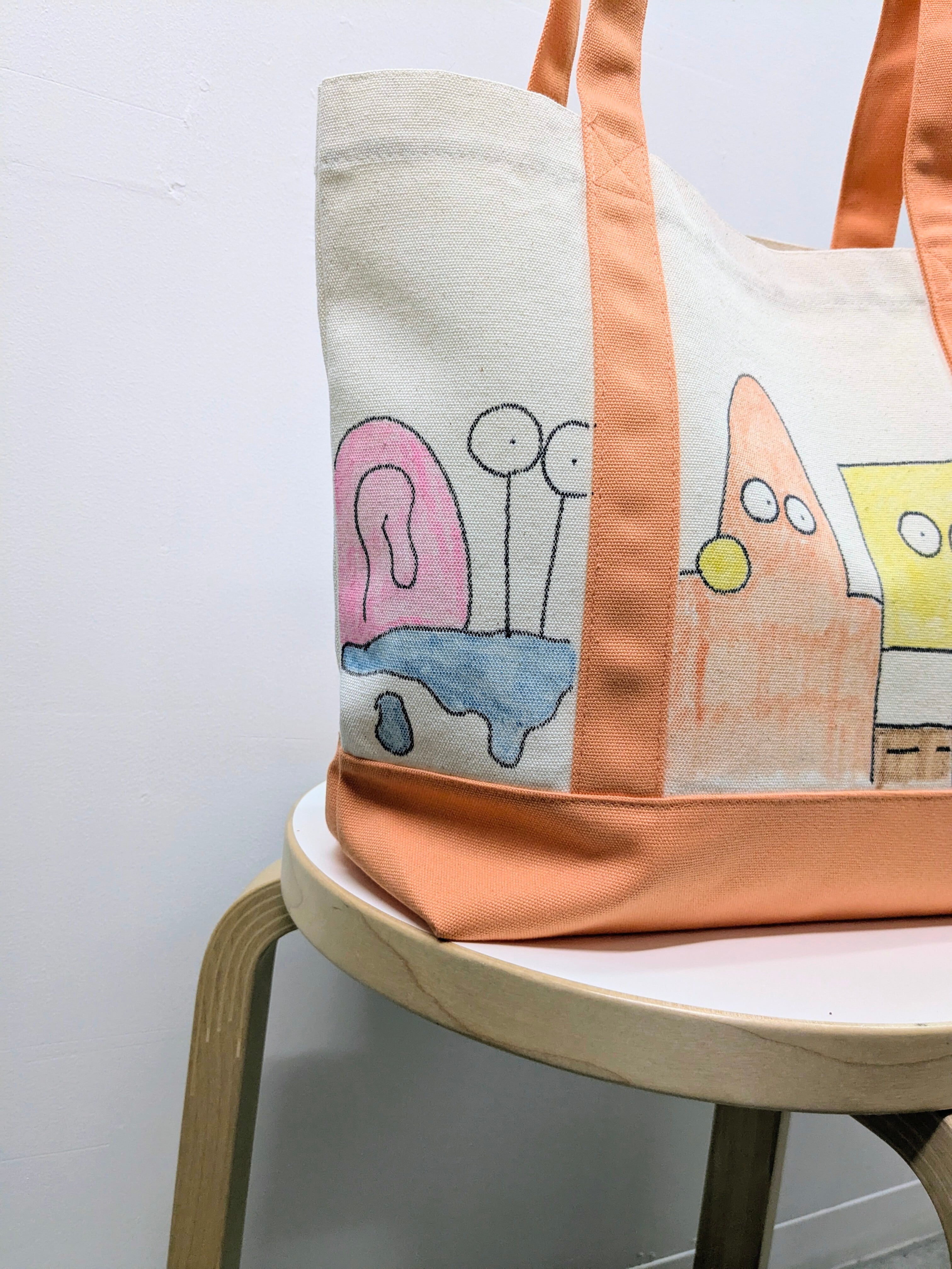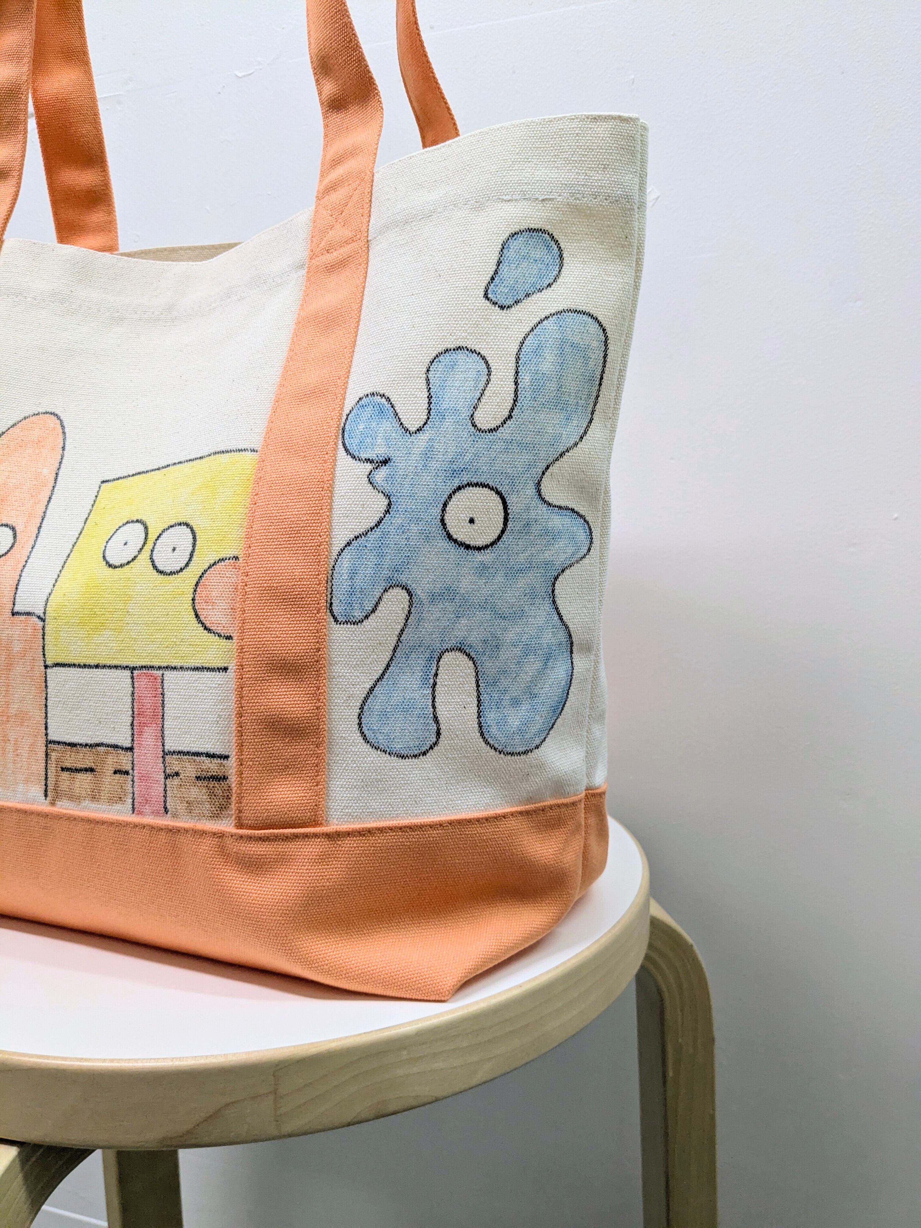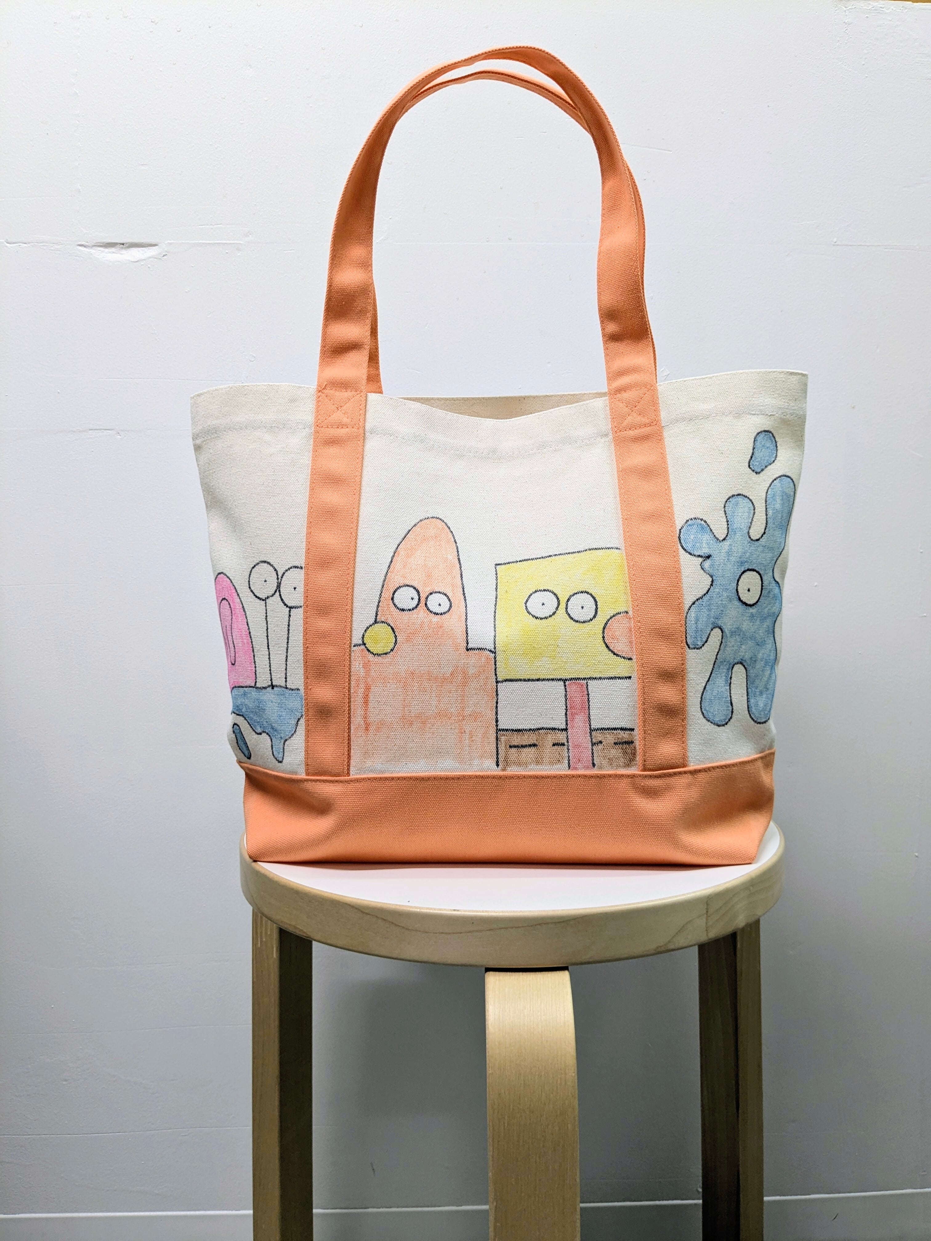 キャンバスのトートバッグにイラストを加えています。メモリアルの要素があり、どこか見たことあるキャラクターがいたりと、とにかく可愛いアイテム。全て手作業になるので、唯一無二の一点物となります。