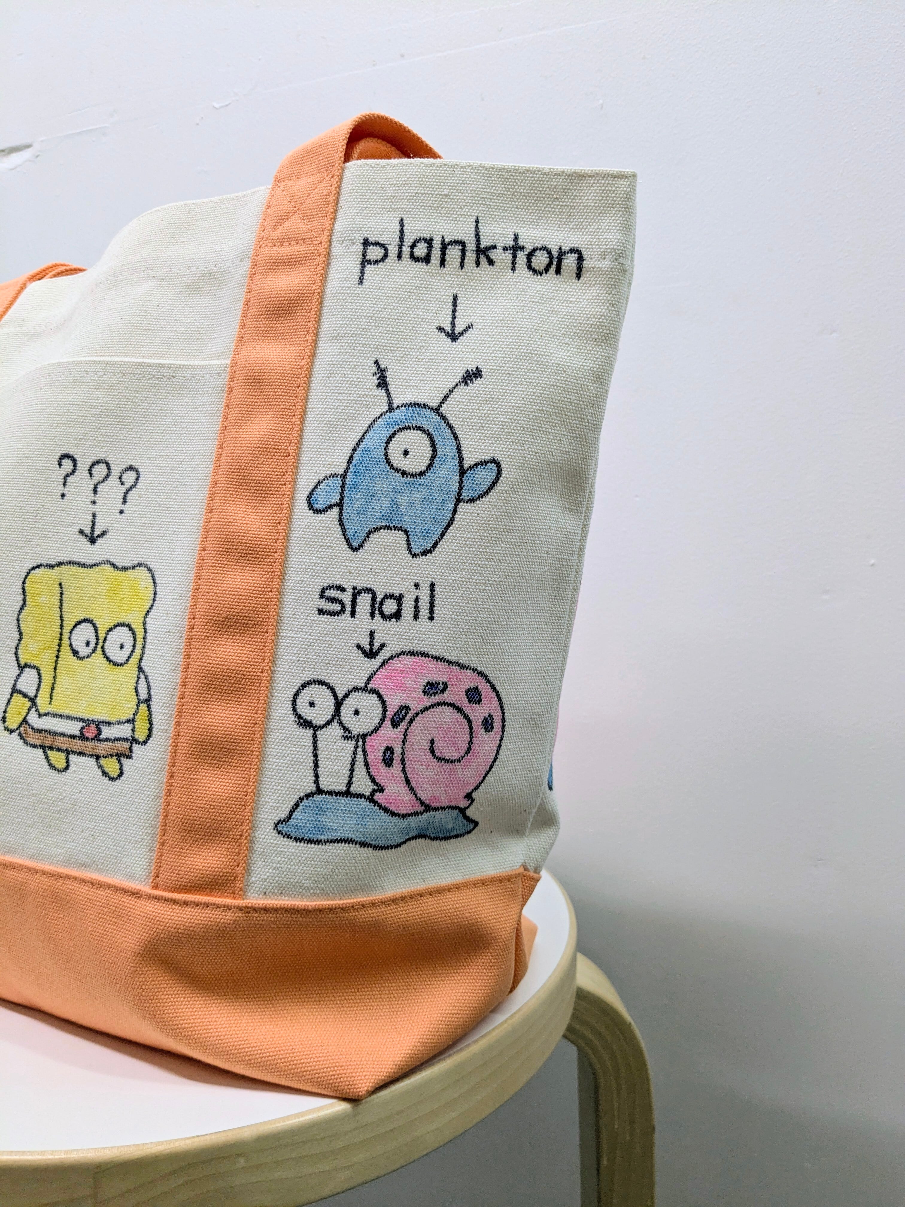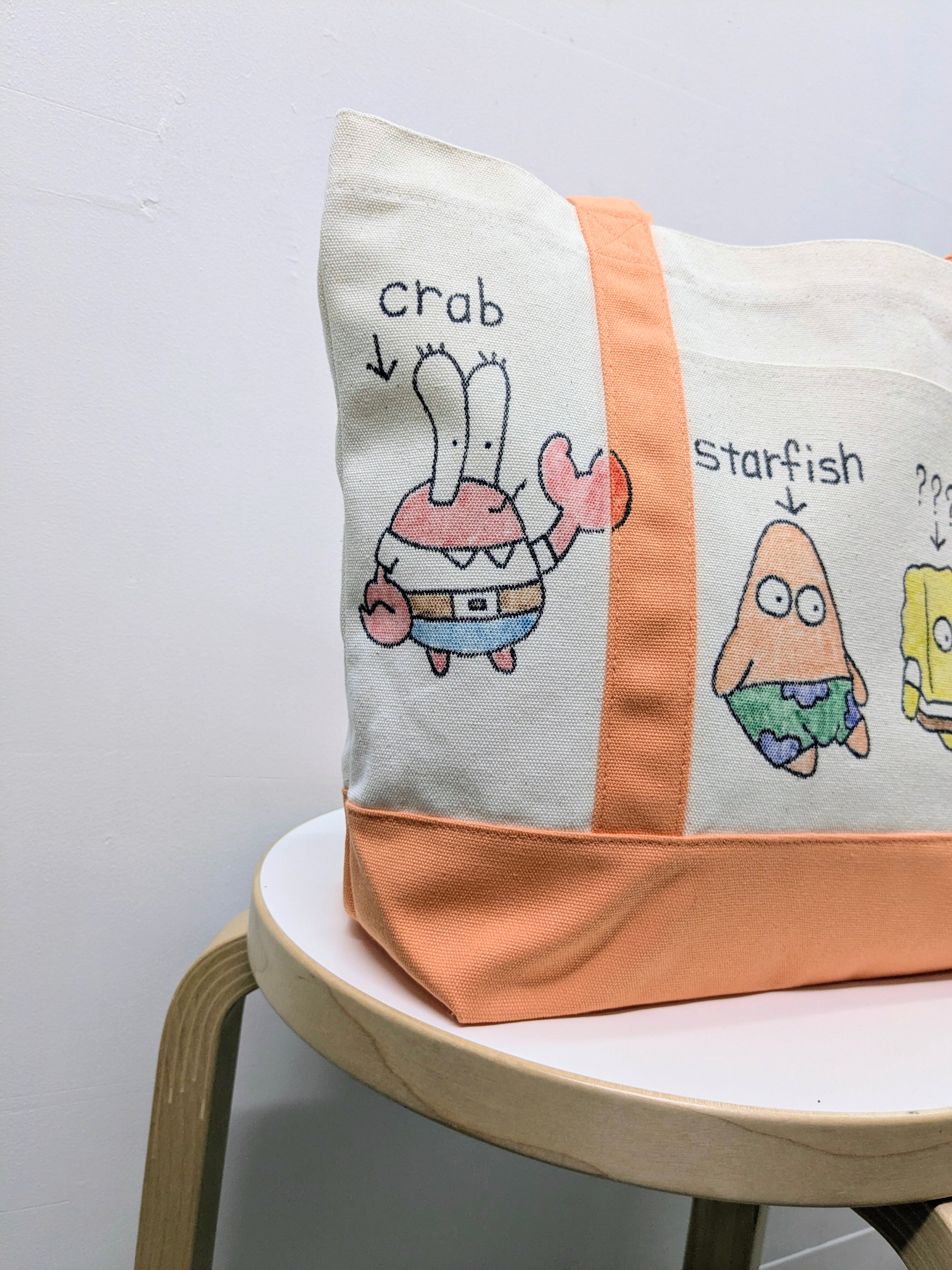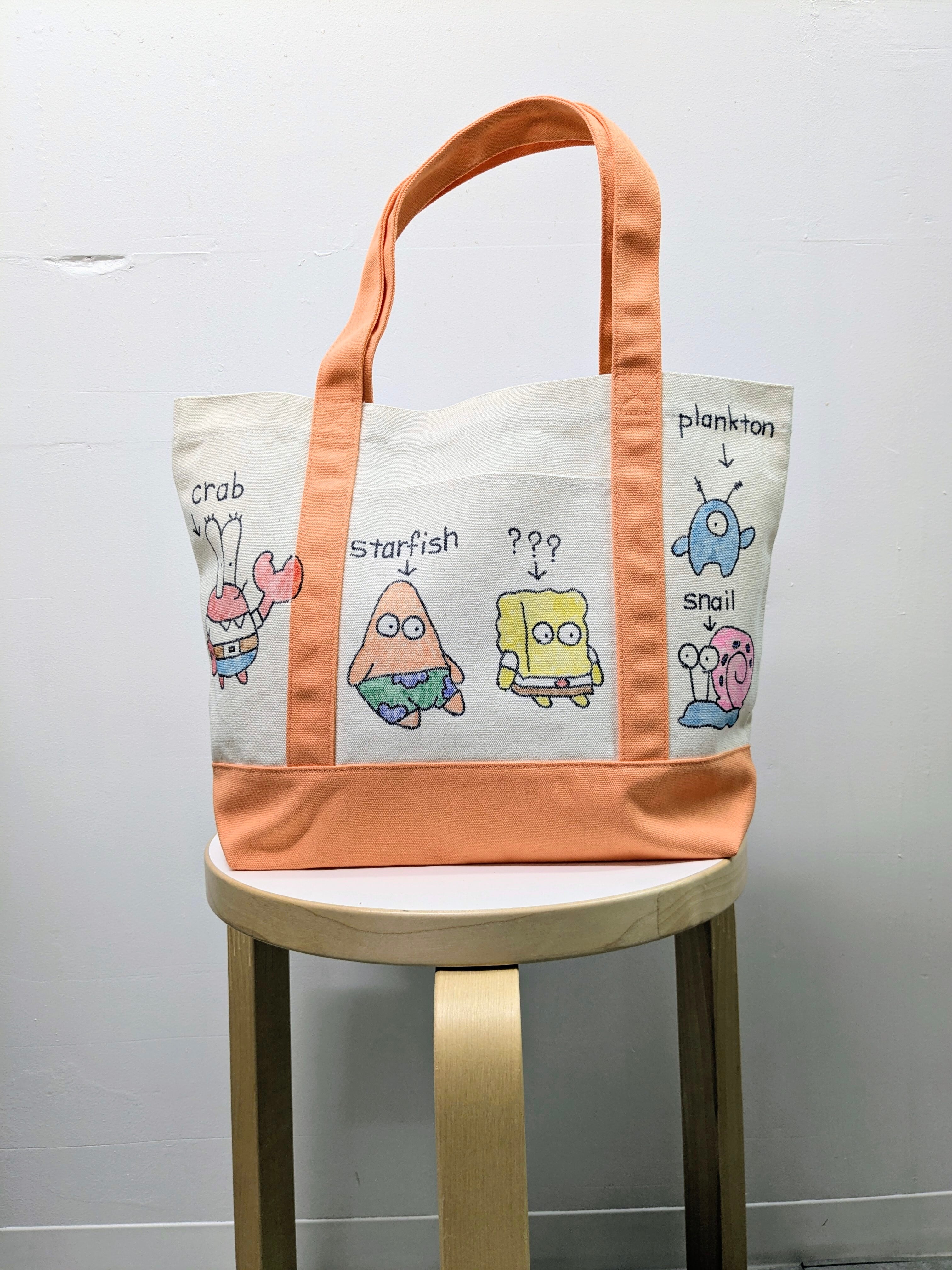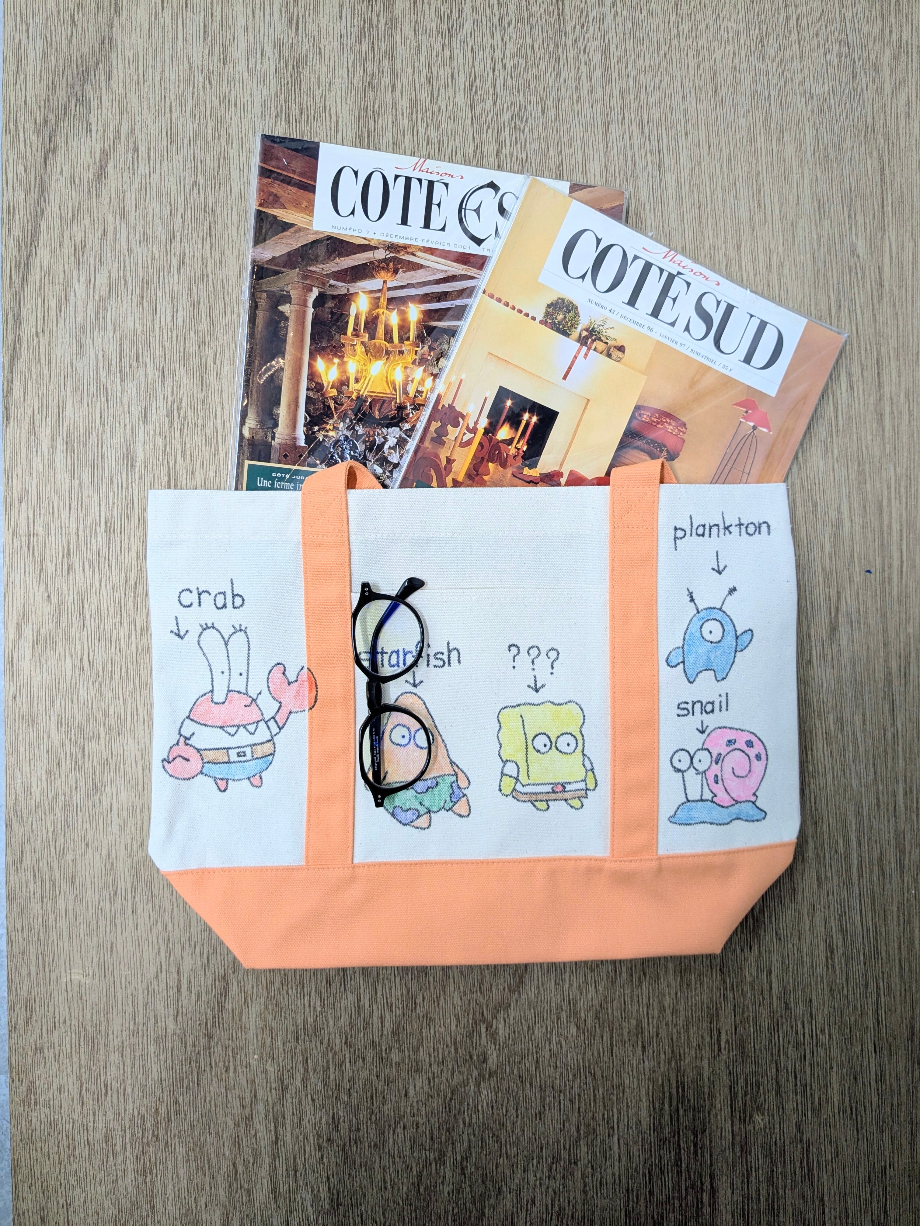 キャンバスのトートバッグにイラストを加えています。メモリアルの要素があり、どこか見たことあるキャラクターがいたりと、とにかく可愛いアイテム。全て手作業になるので、唯一無二の一点物となります。