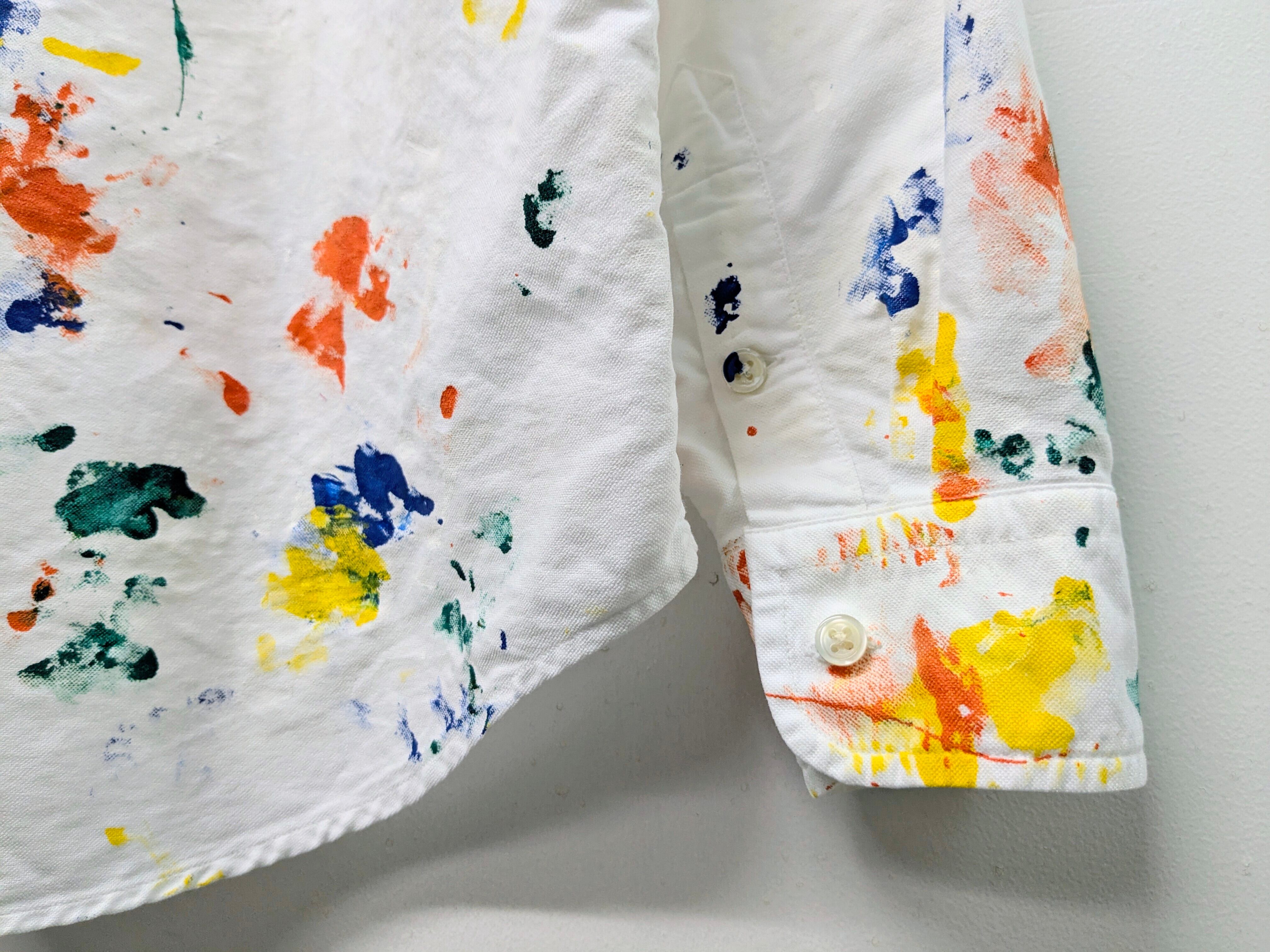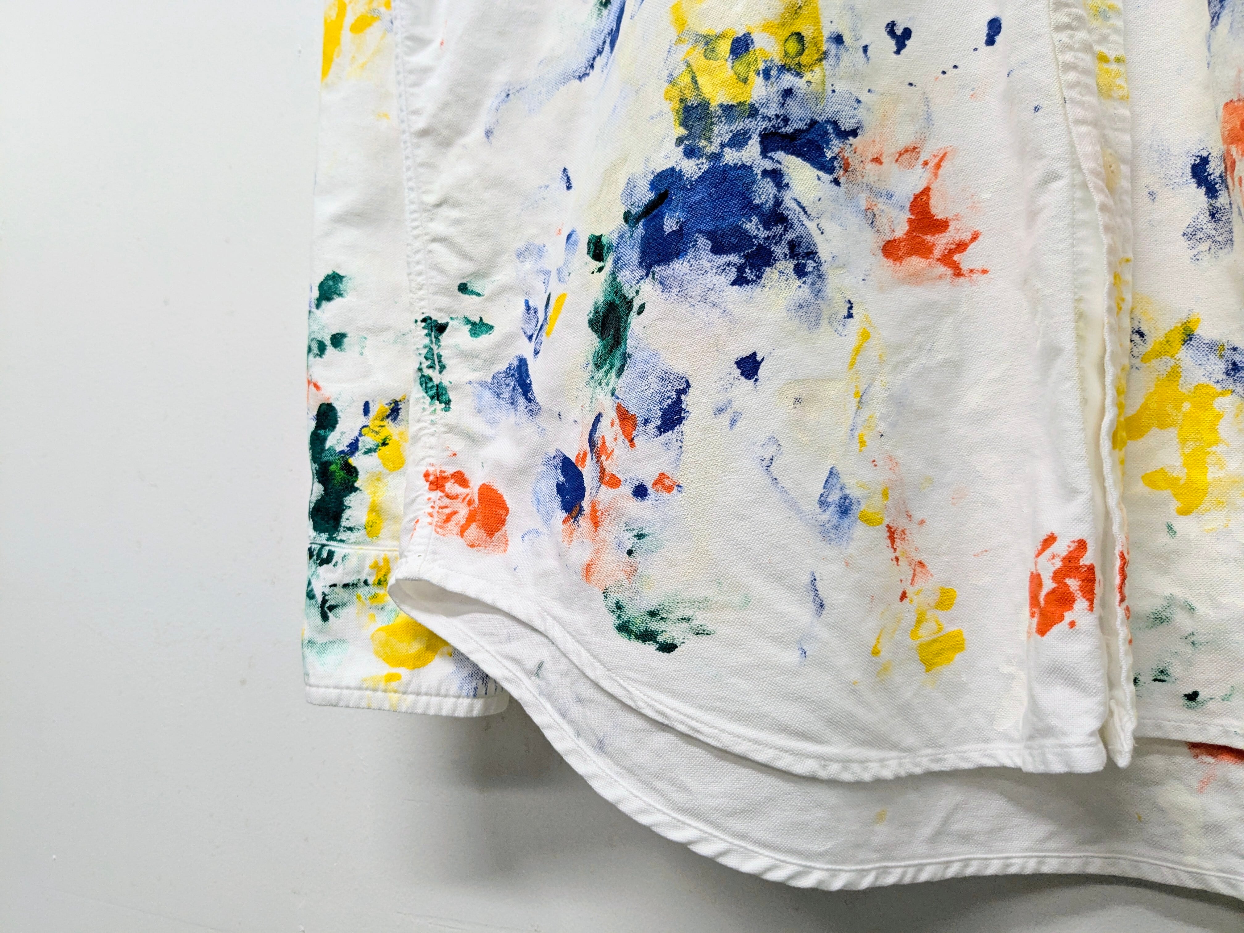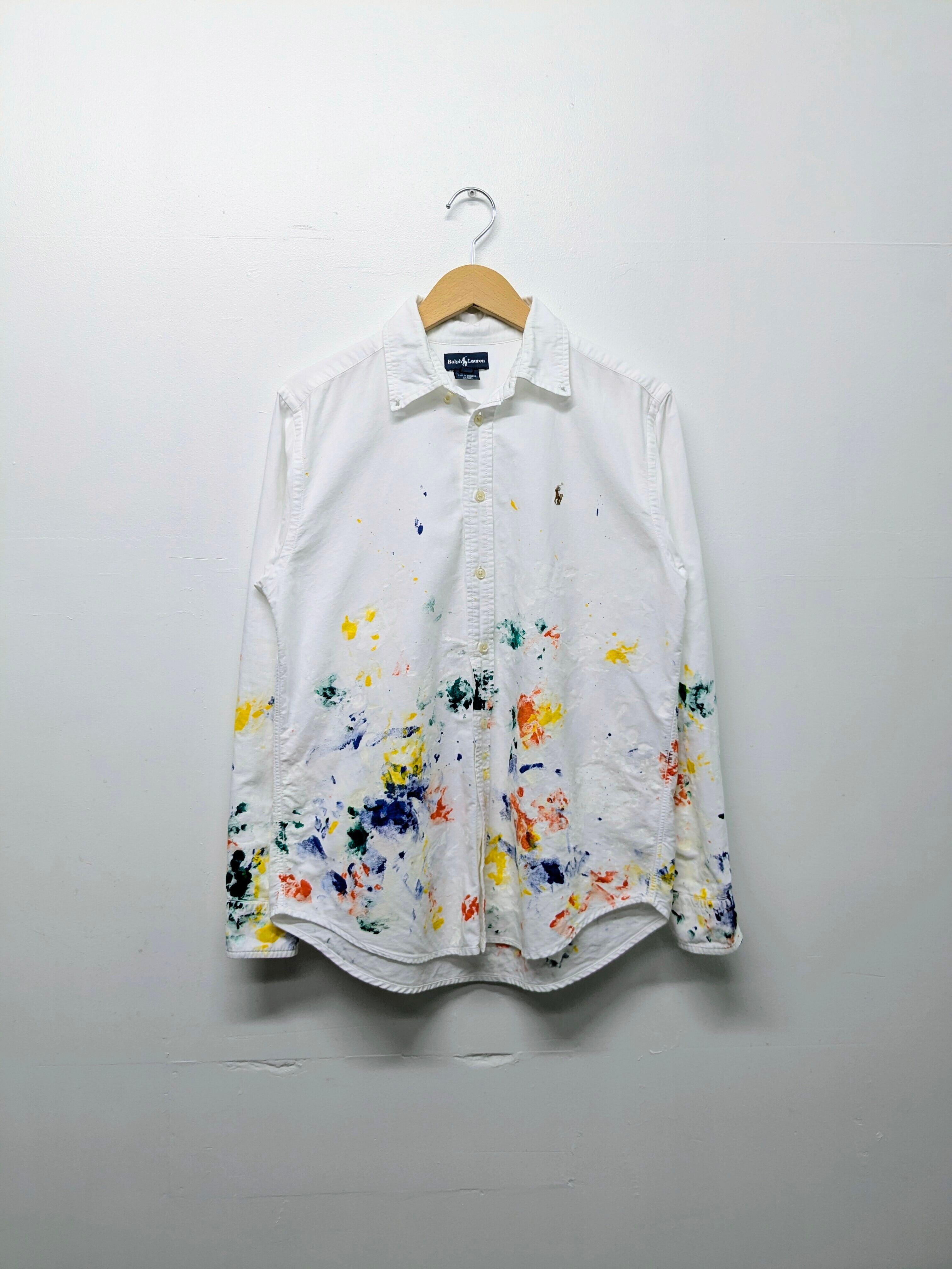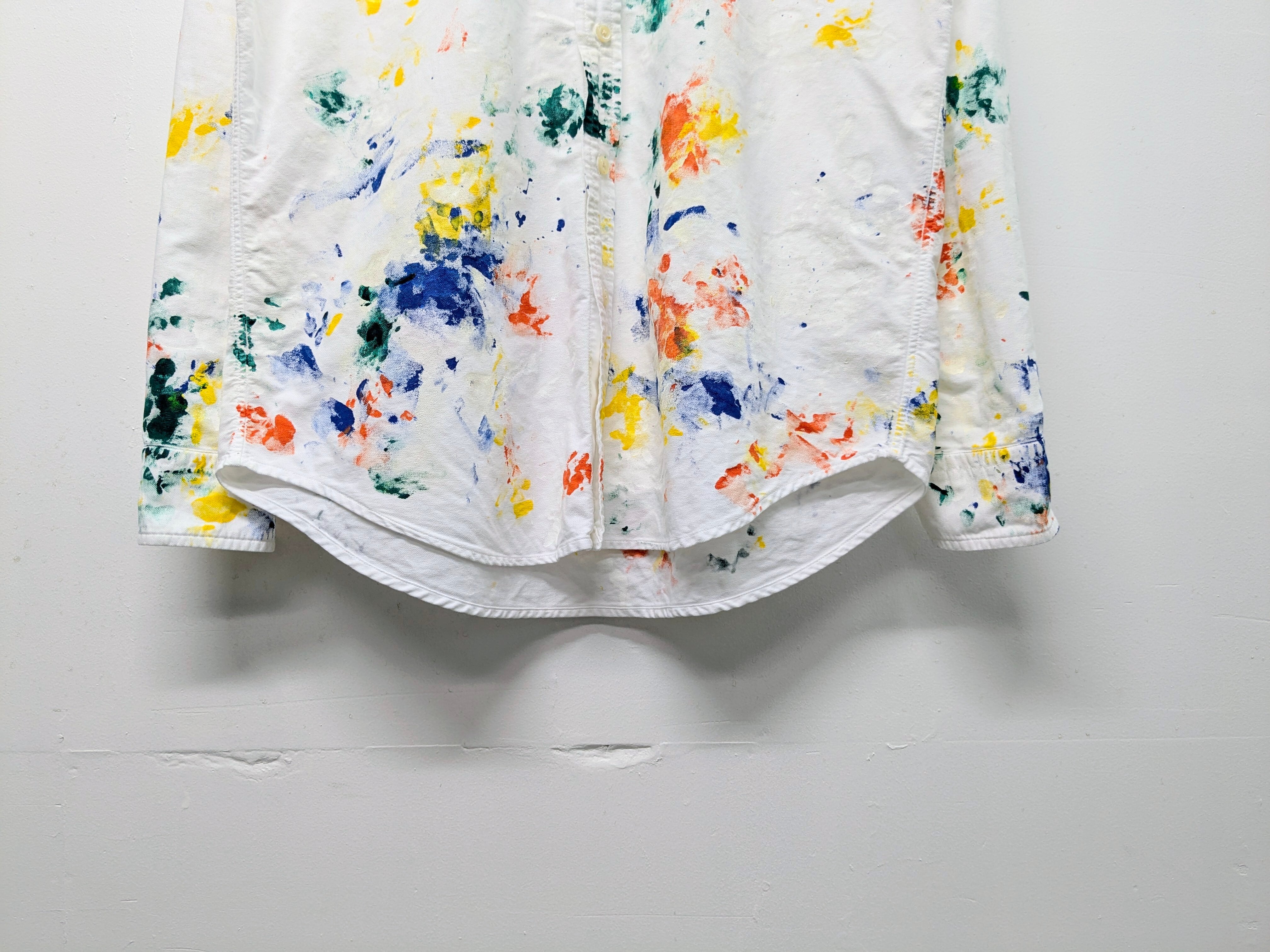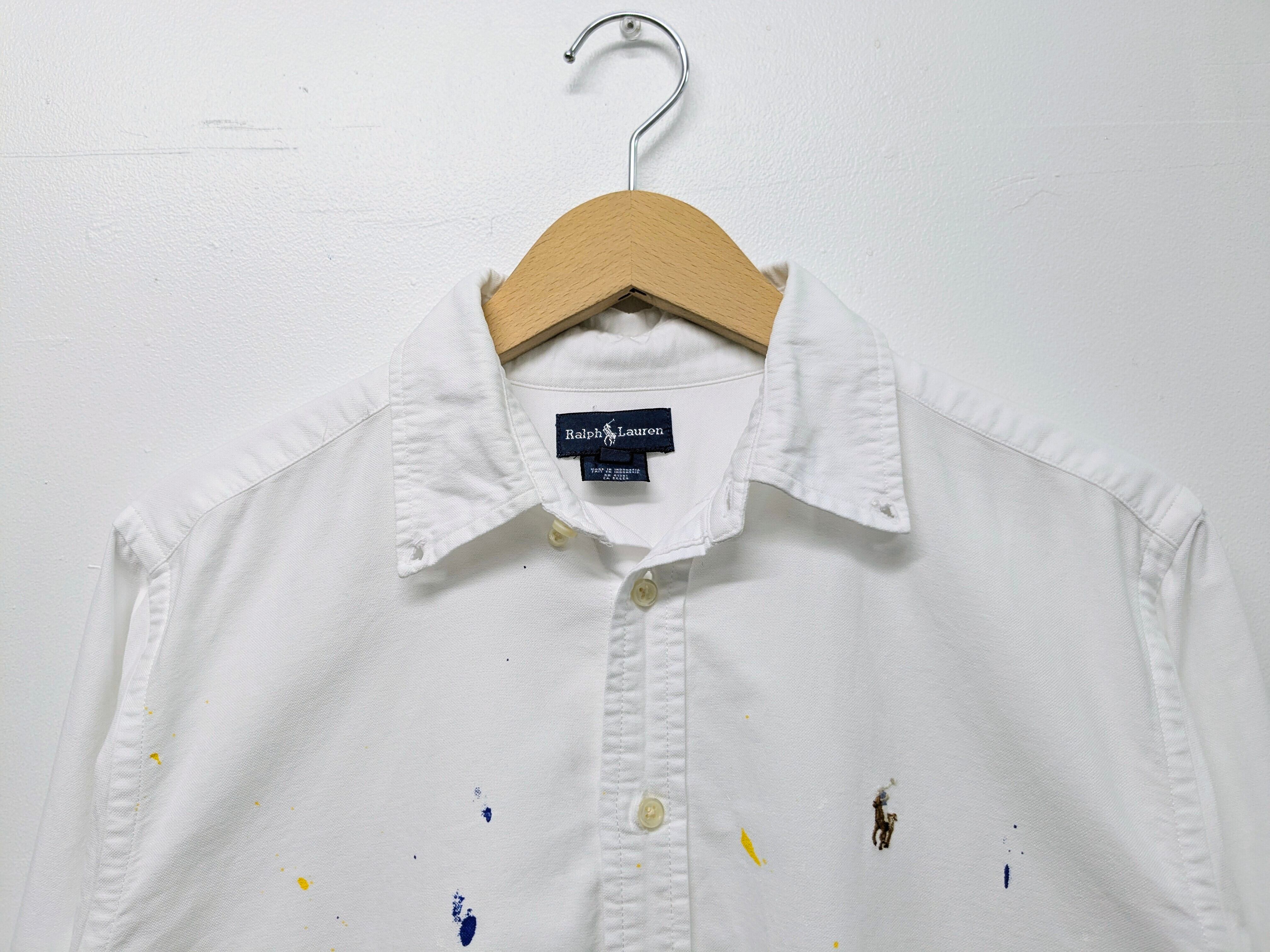 古着のラルフローレンのシャツにペイントを加えた一着。オックスフォードのシャツで若干肉厚な素材。とにかく目を引く一着となります。上からアウターを羽織ってもカッコいいかと。ヨゴレあり。