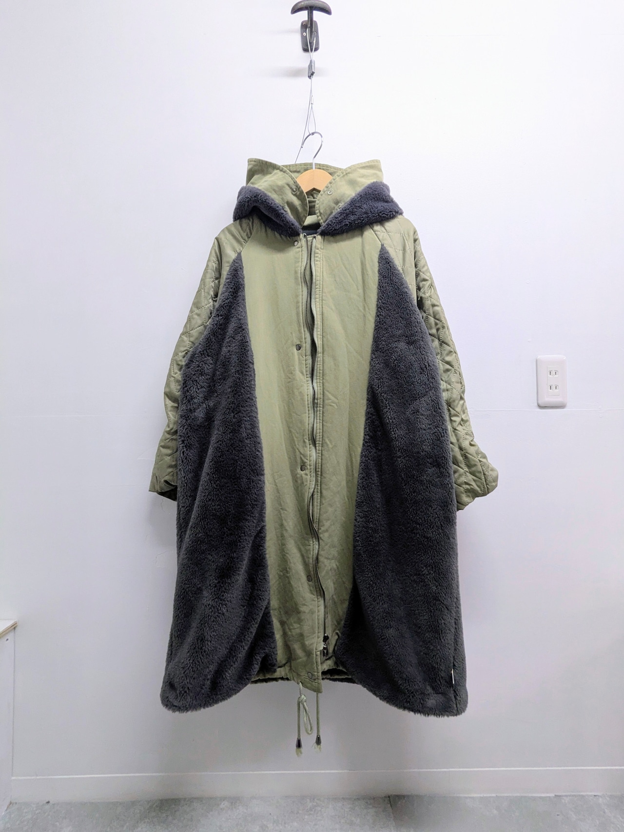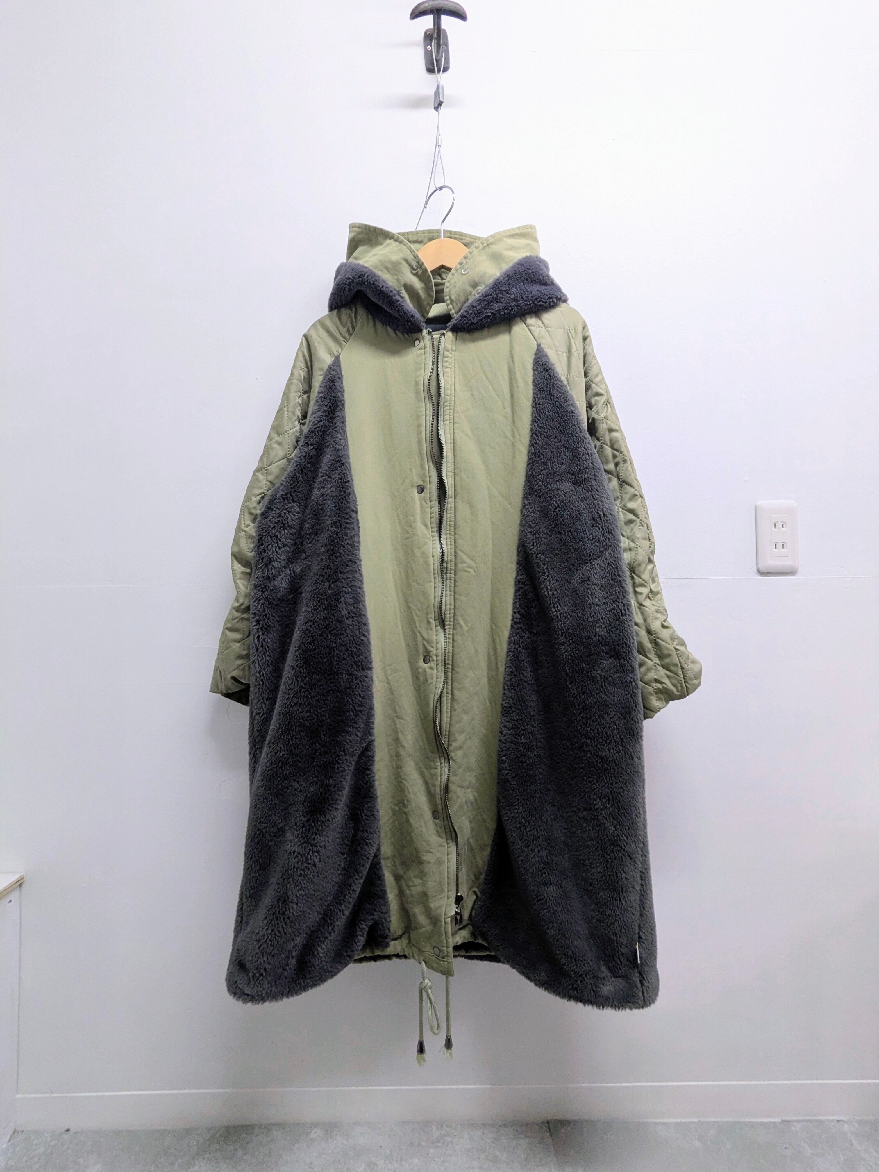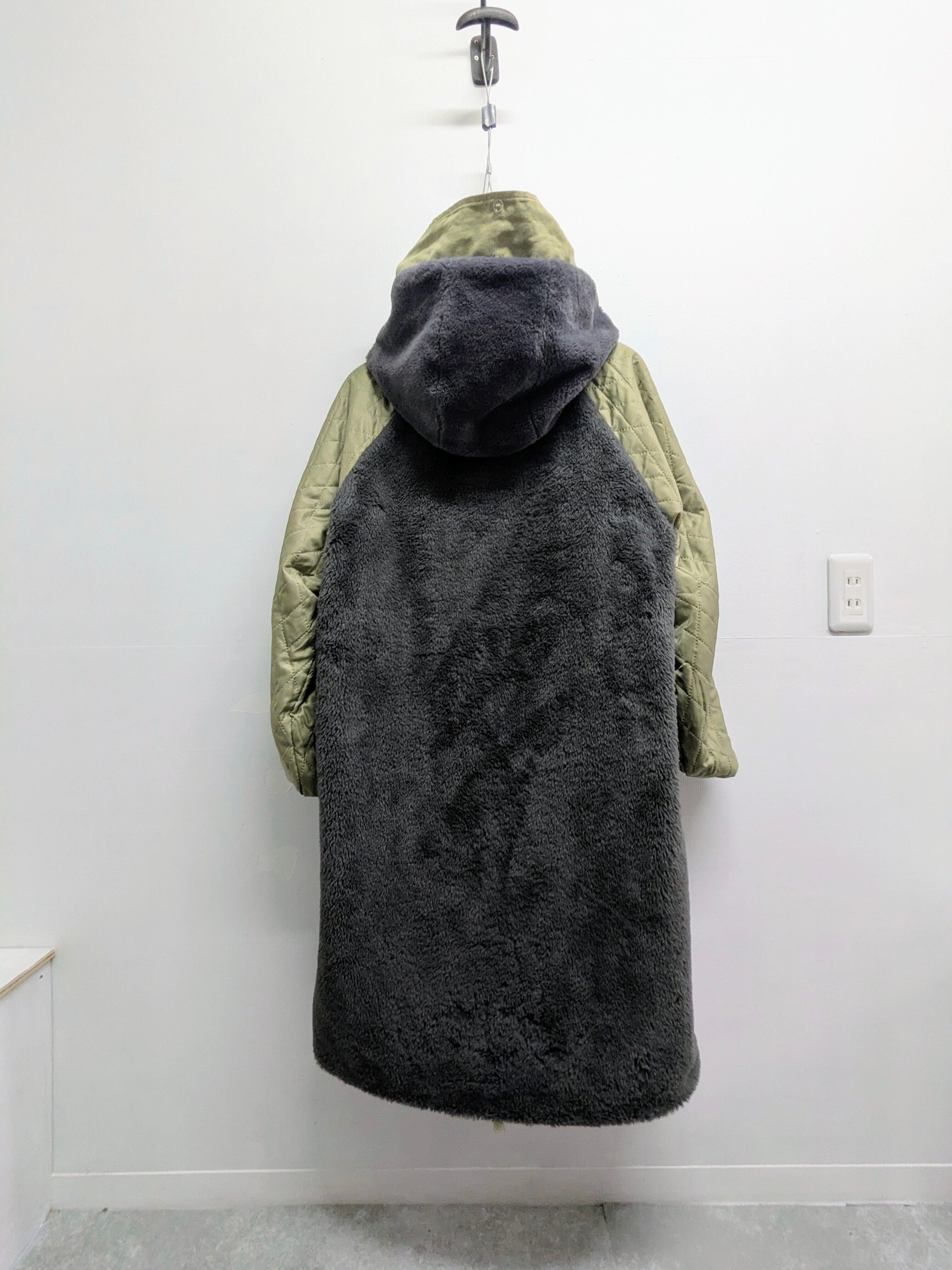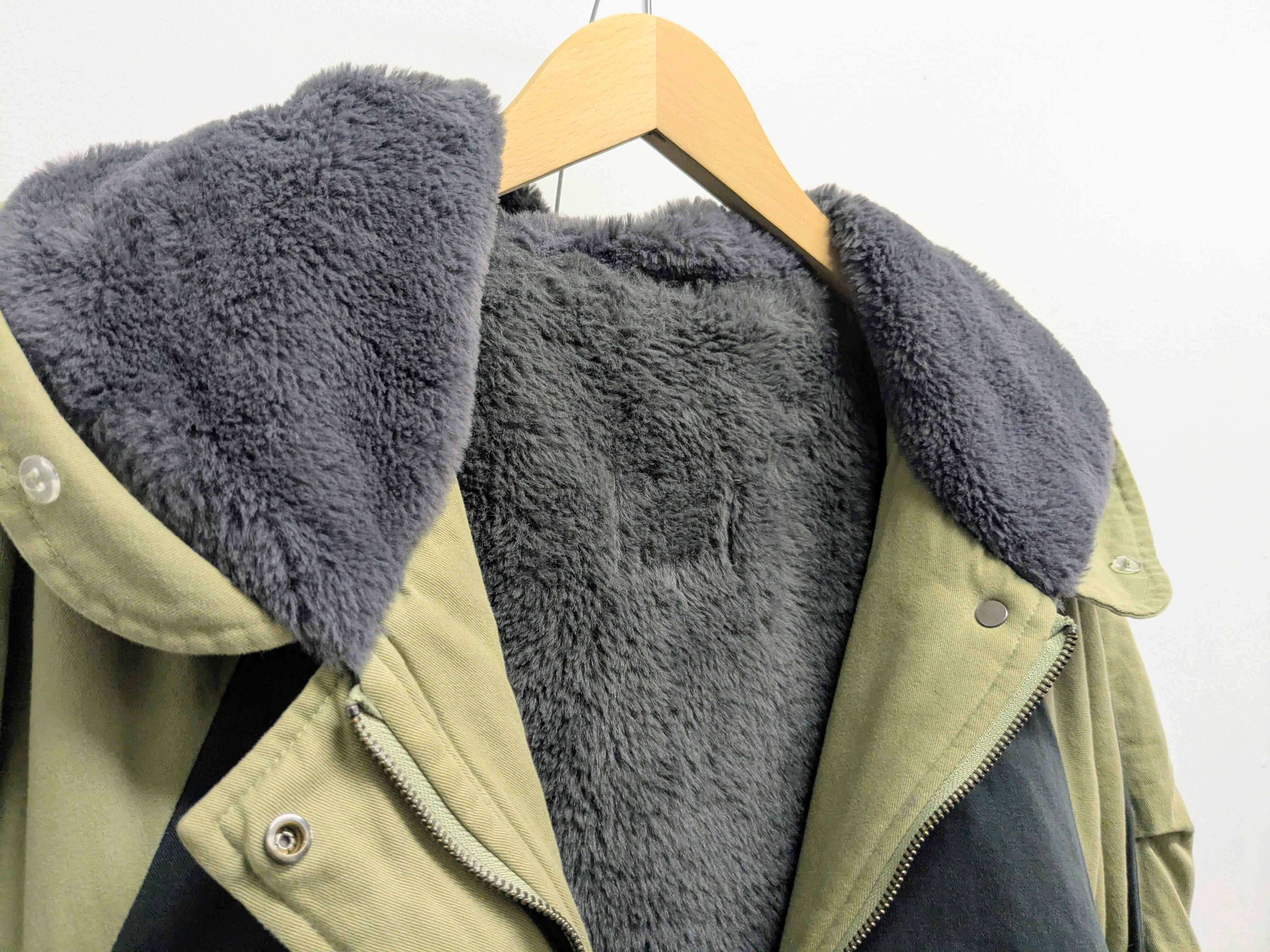 裏はファー、袖はキルティングになっており、防寒面でも頼れる一着。リバーシブルではないですが、ベルトなど外したら着ていただけるかと思います。汚れあり、おそらく襟のところ付属品欠損。