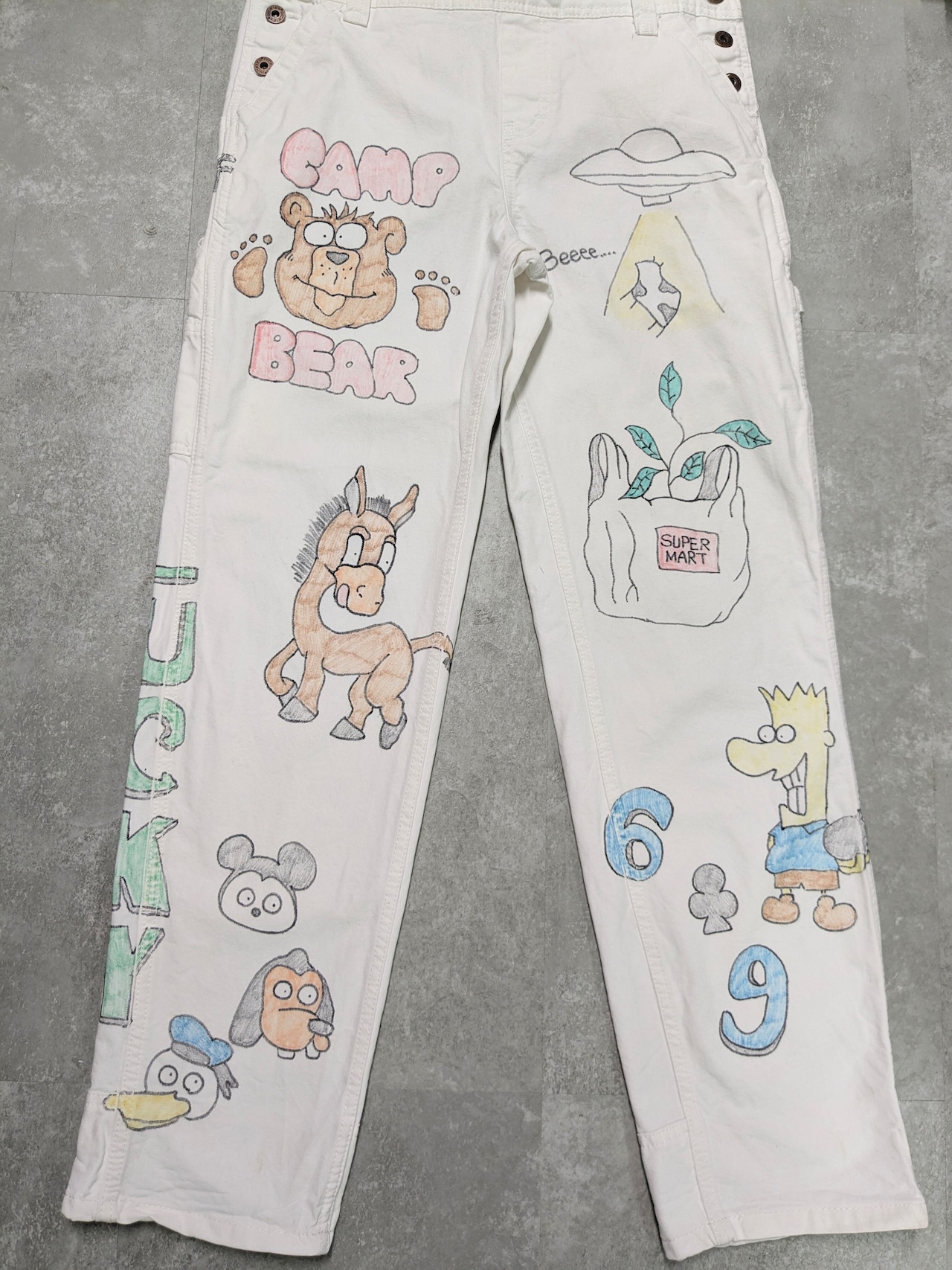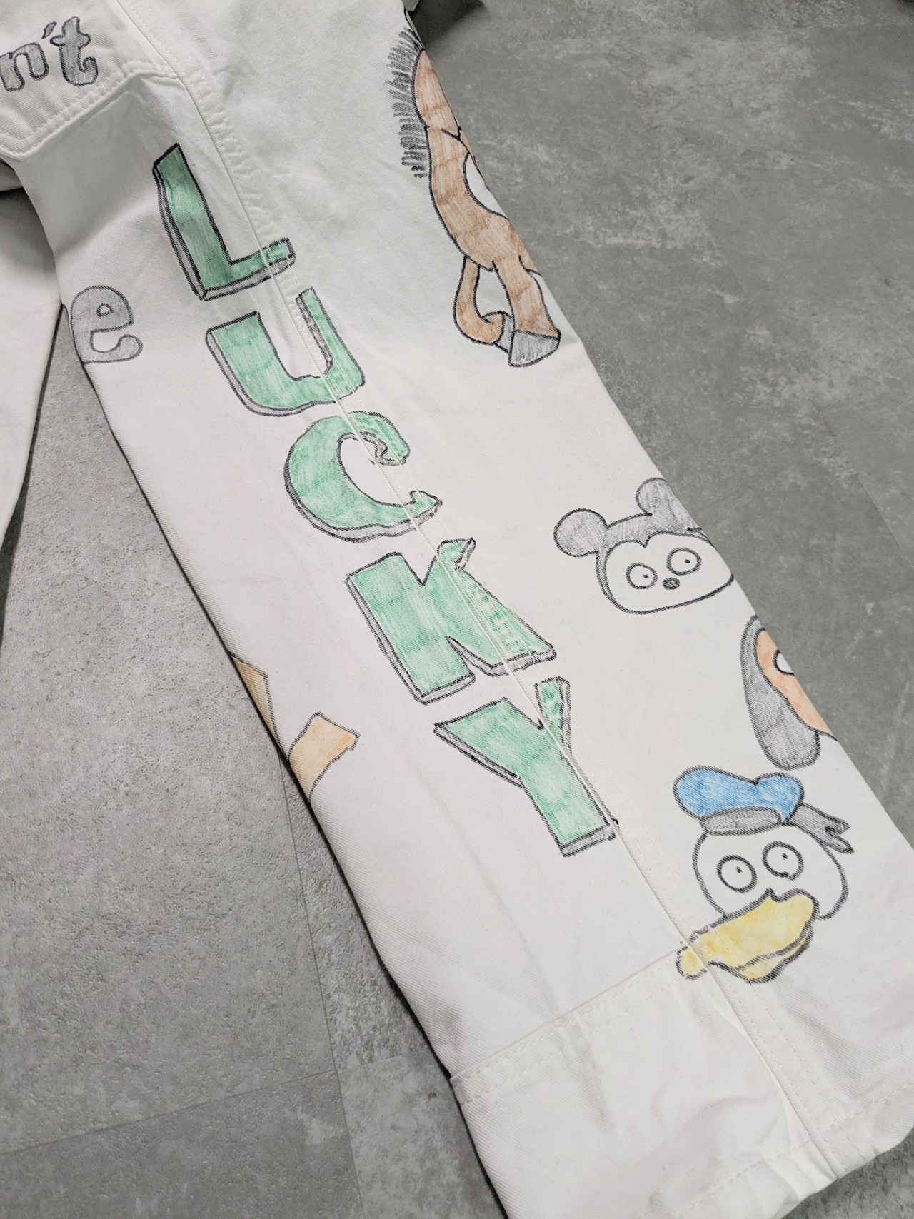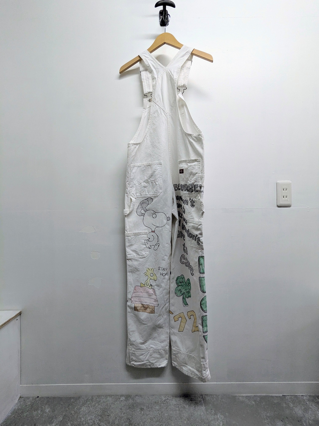 今回はディッキーズのオーバーオールを使用しています。メモリアルパンツをモチーフに作成、どこか見たことあるキャラクターがいたりと、とにかく可愛いアイテム。全て手作業になるので、唯一無二の一点物となります。汚れあり。