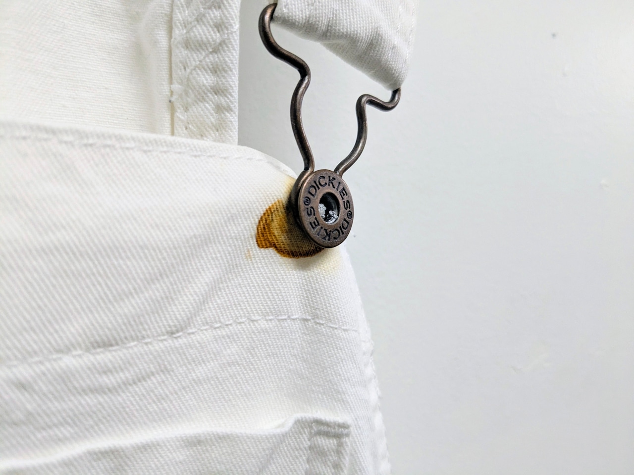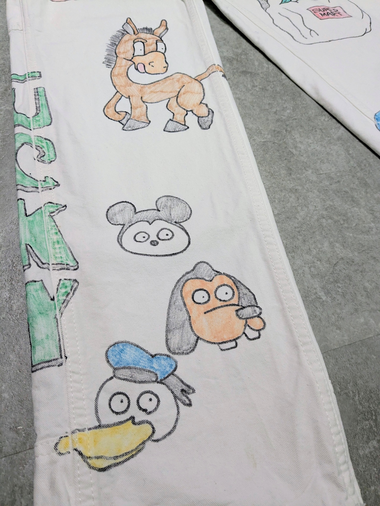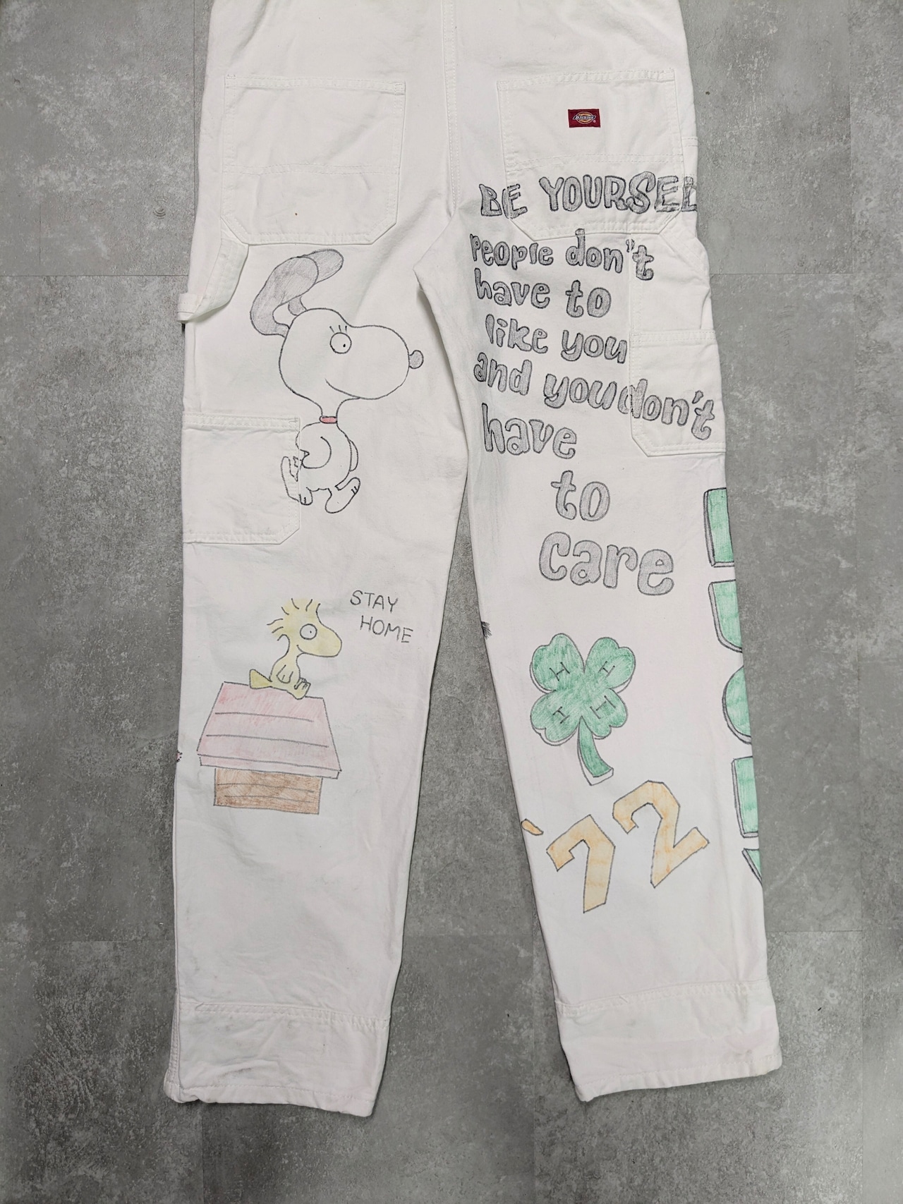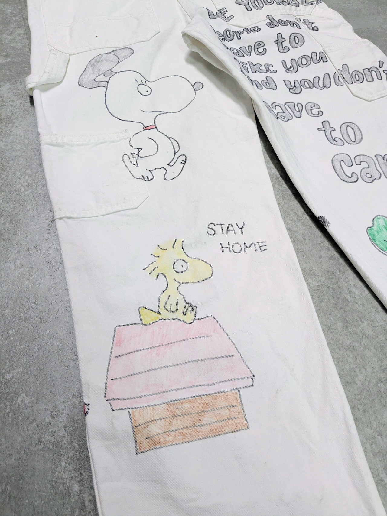 今回はディッキーズのオーバーオールを使用しています。メモリアルパンツをモチーフに作成、どこか見たことあるキャラクターがいたりと、とにかく可愛いアイテム。全て手作業になるので、唯一無二の一点物となります。汚れあり。