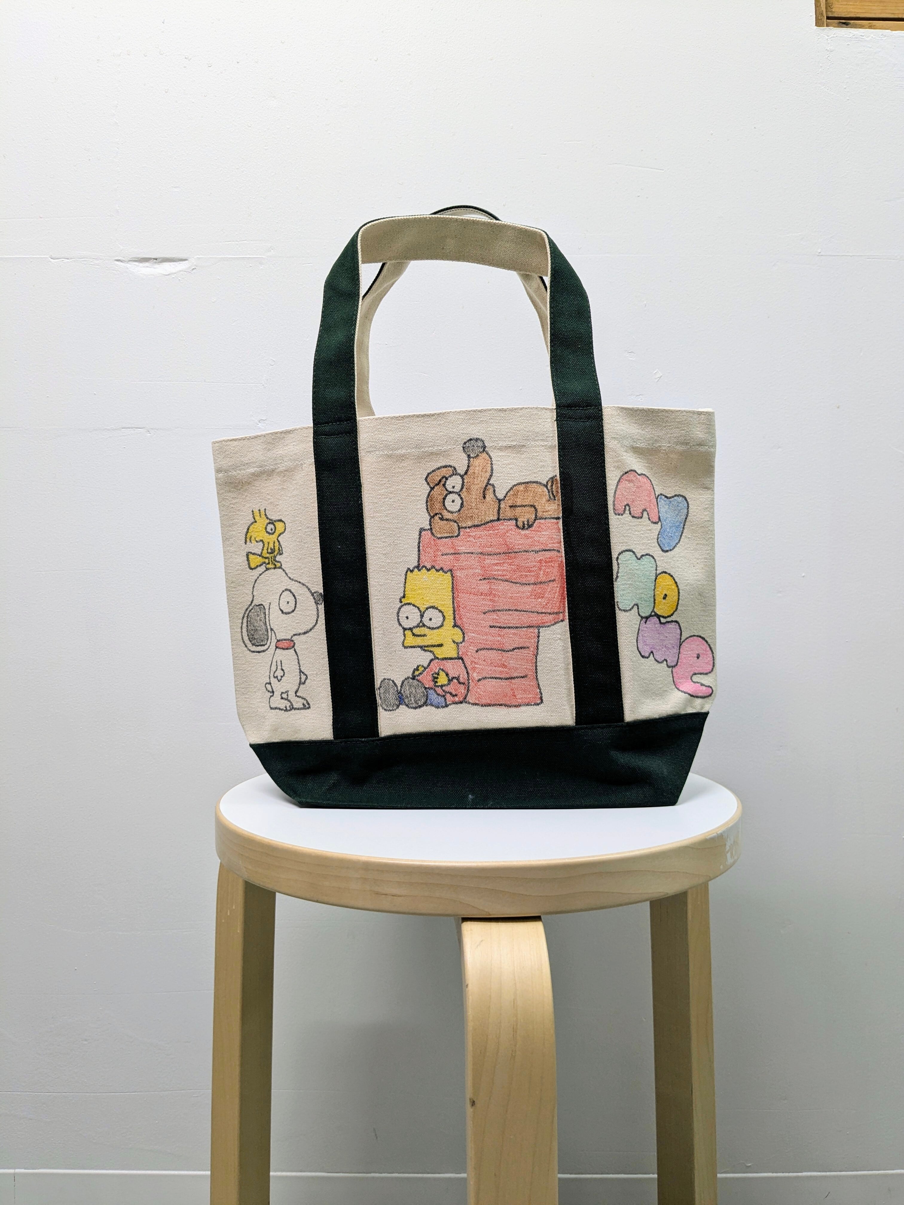 キャンバスのトートバッグにイラストを加えています。メモリアルの要素があり、どこか見たことあるキャラクターがいたりと、とにかく可愛いアイテム。全て手作業になるので、唯一無二の一点物となります。
