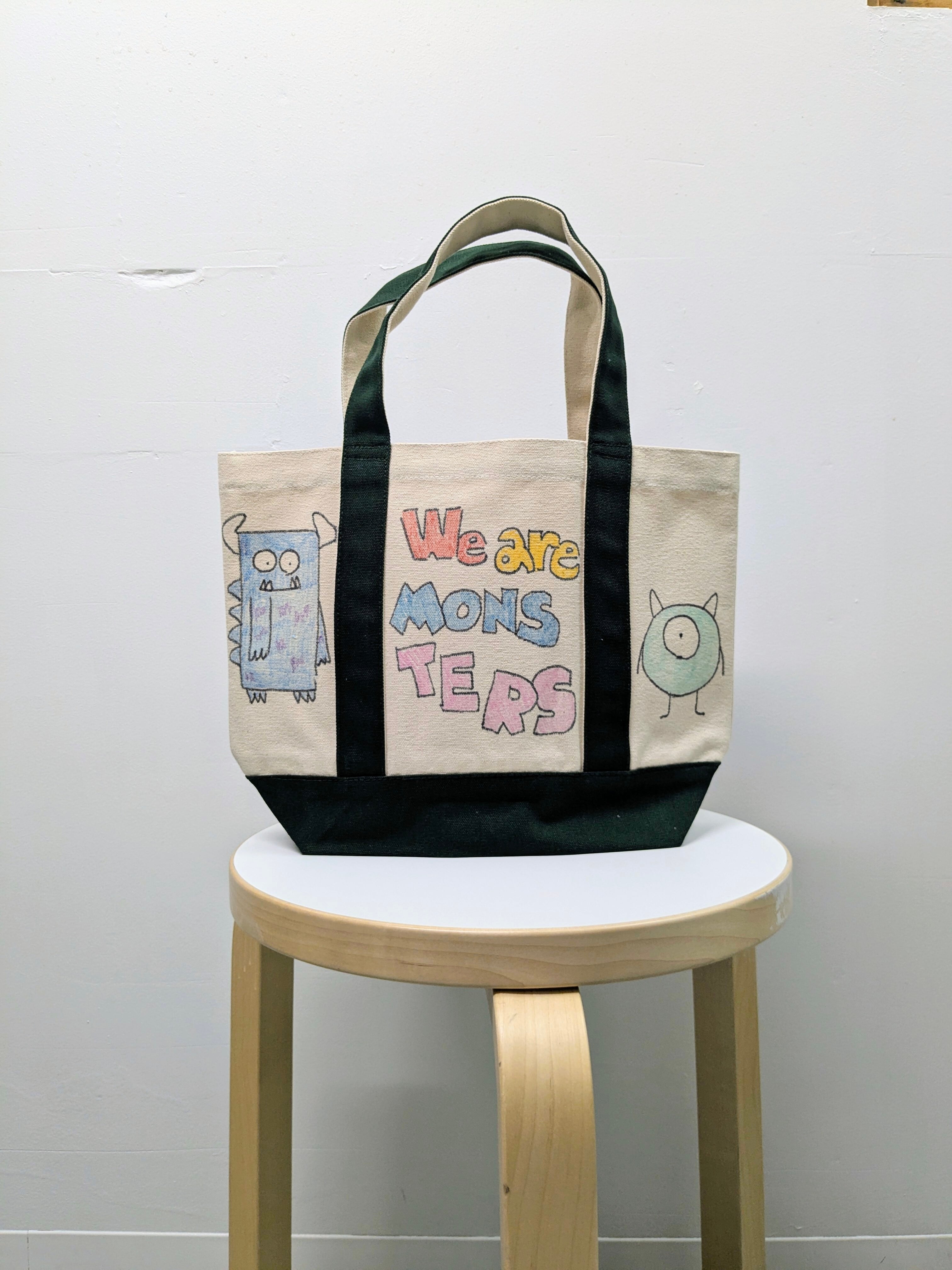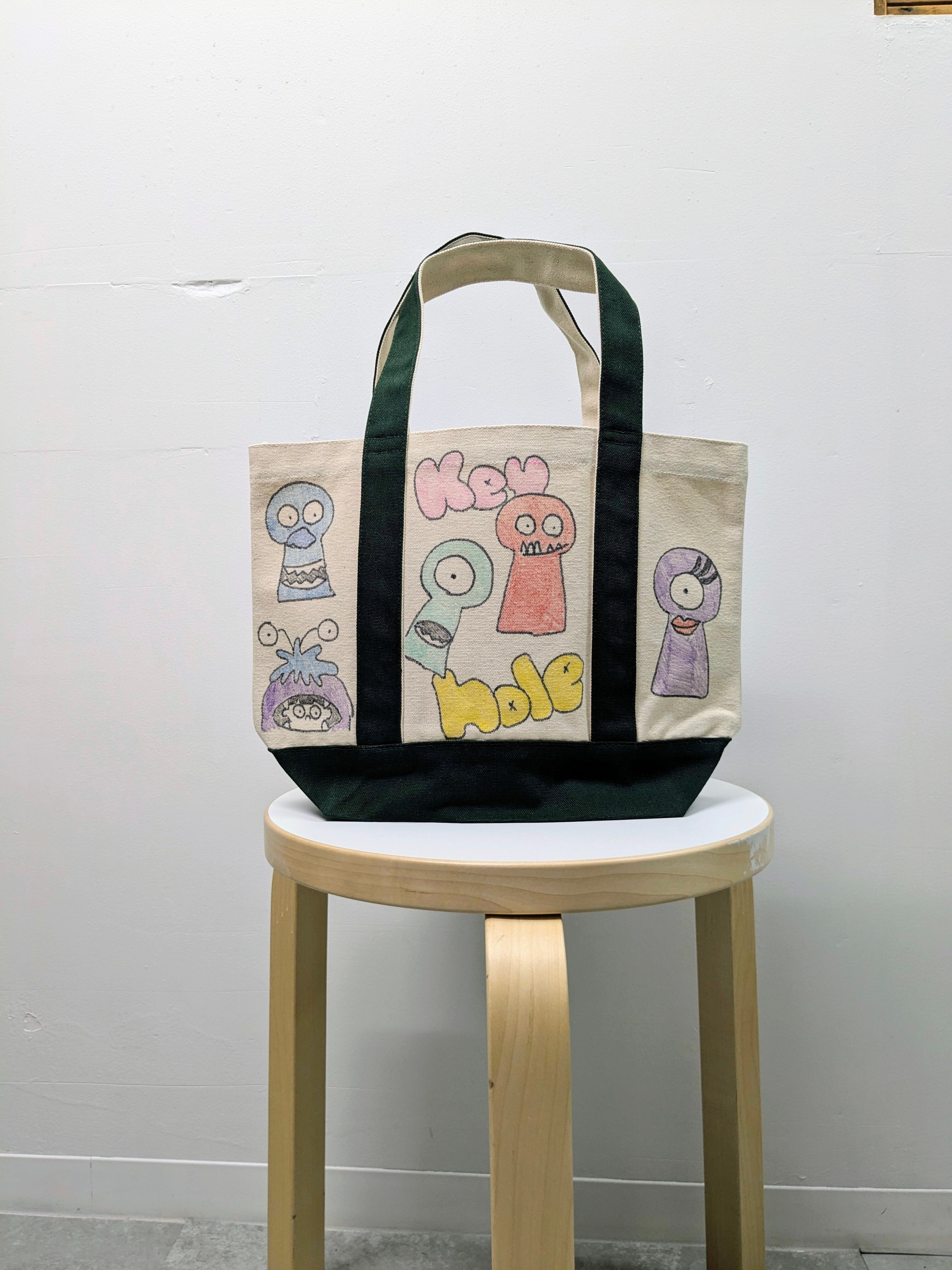キャンバスのトートバッグにイラストを加えています。メモリアルの要素があり、どこか見たことあるキャラクターがいたりと、とにかく可愛いアイテム。全て手作業になるので、唯一無二の一点物となります。