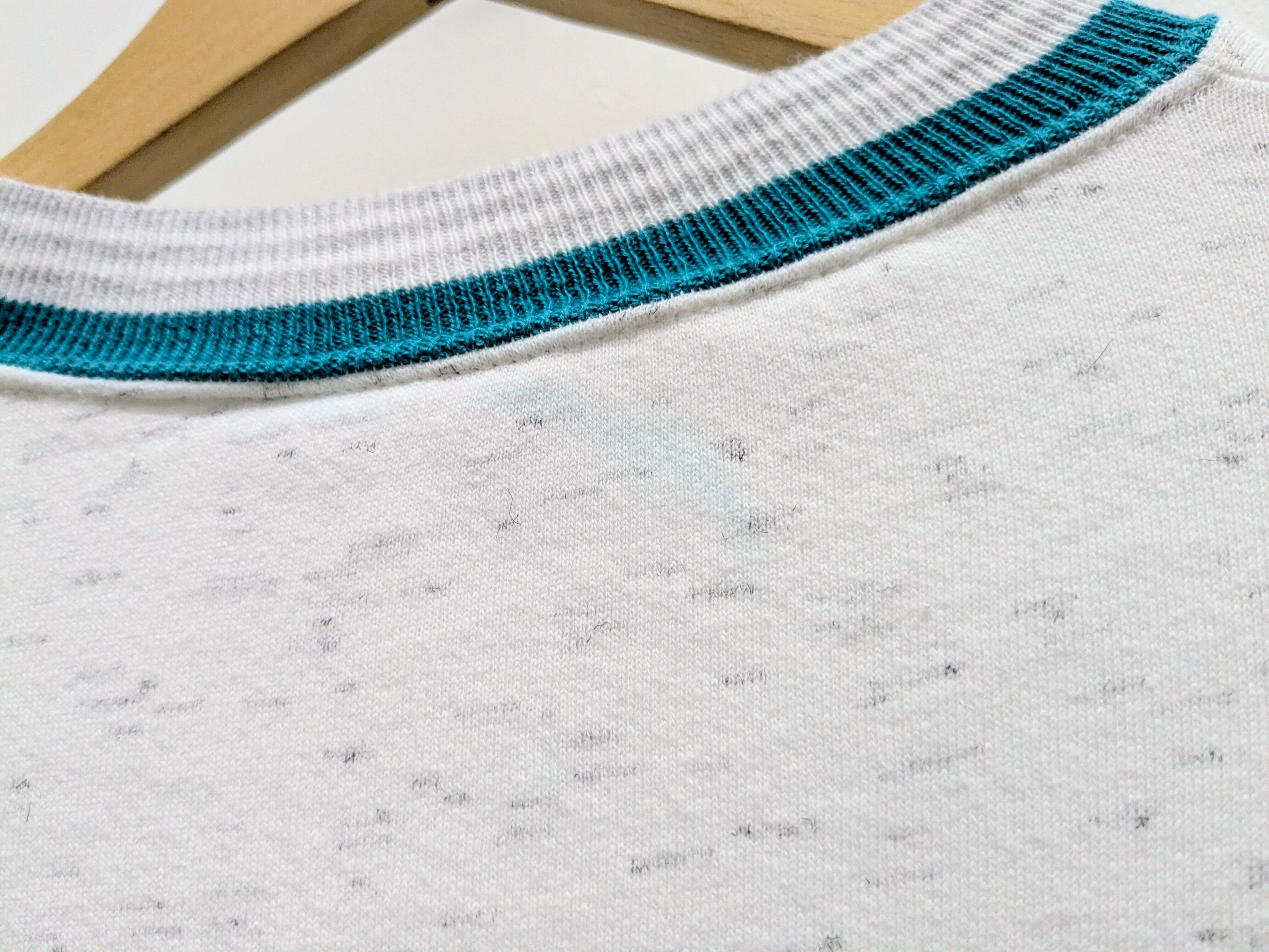 杢調のボディに、カラー配色のあるリブを使用しています。のっぺりしないボディにパキッと差し色で目を引くアイテム。短丈ワイドのシルエットもちょうどよく、全体的に気の利いた一着。移染あり。